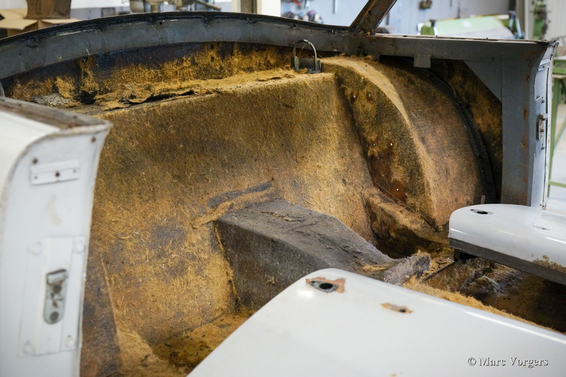 De restauratie begon in 2020 toen de auto volledig werd gestript ter voorbereiding van de plaatwerk restauratie. In vergelijking met andere projectauto's die u op deze pagina's kunt zien, vertoont deze HK-500 slechts lichte roestschade. Alleen in en rond de kofferbak ziet u verroeste randen. De staat van de auto zoals gevonden in de USA was nog redelijk goed, we hebben geen idee waarom de auto op een gegeven moment langdurig gestald werd. De brandstoftank was nog halfvol, we vonden geen mankementen, het interieur was nog in zeer mooie staat, en de banden waren vernieuwd kort voordat de auto gestald werd en jarenlang vergeten.