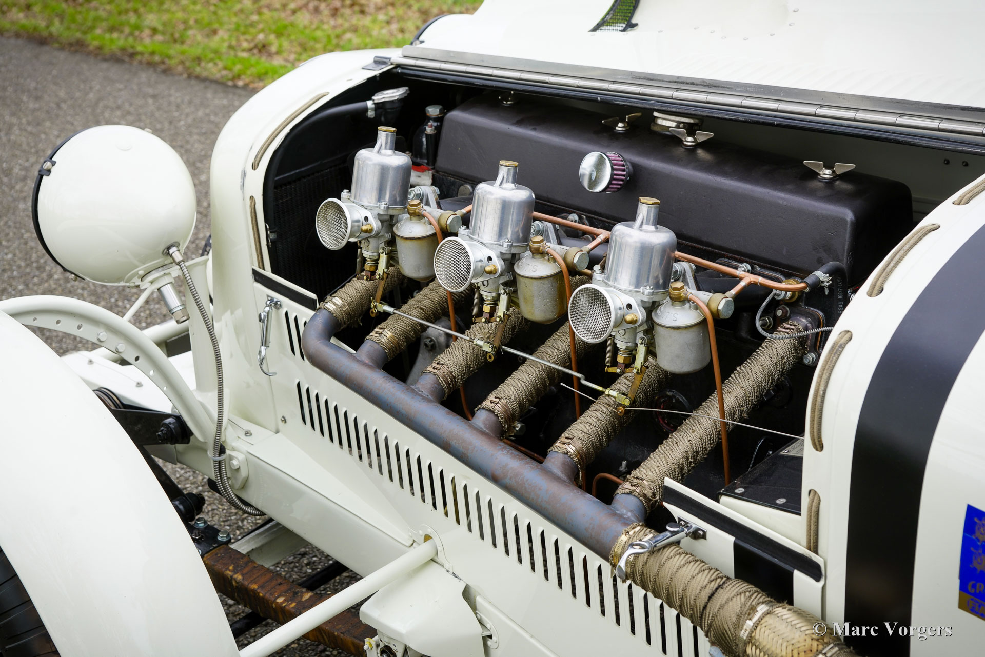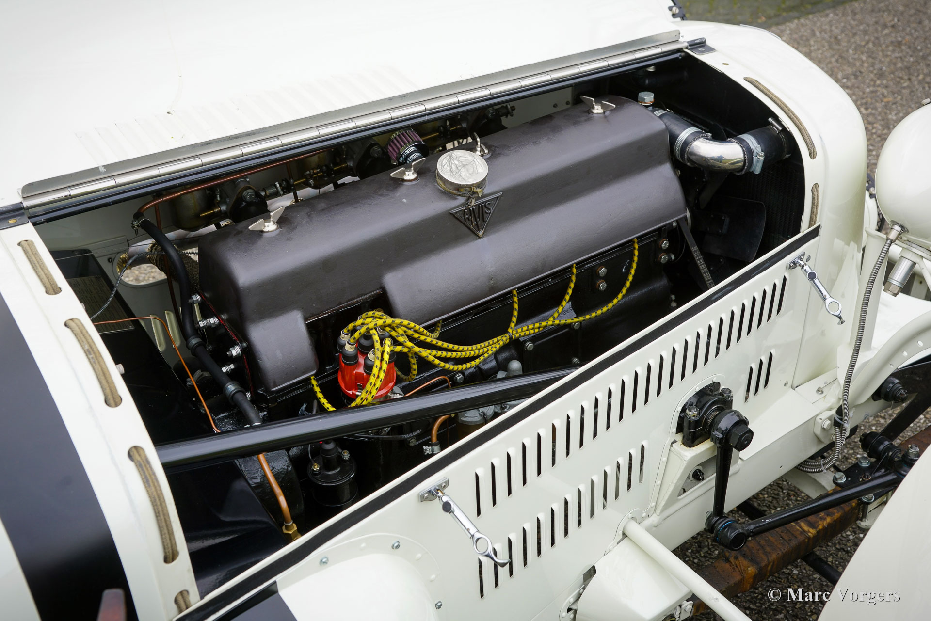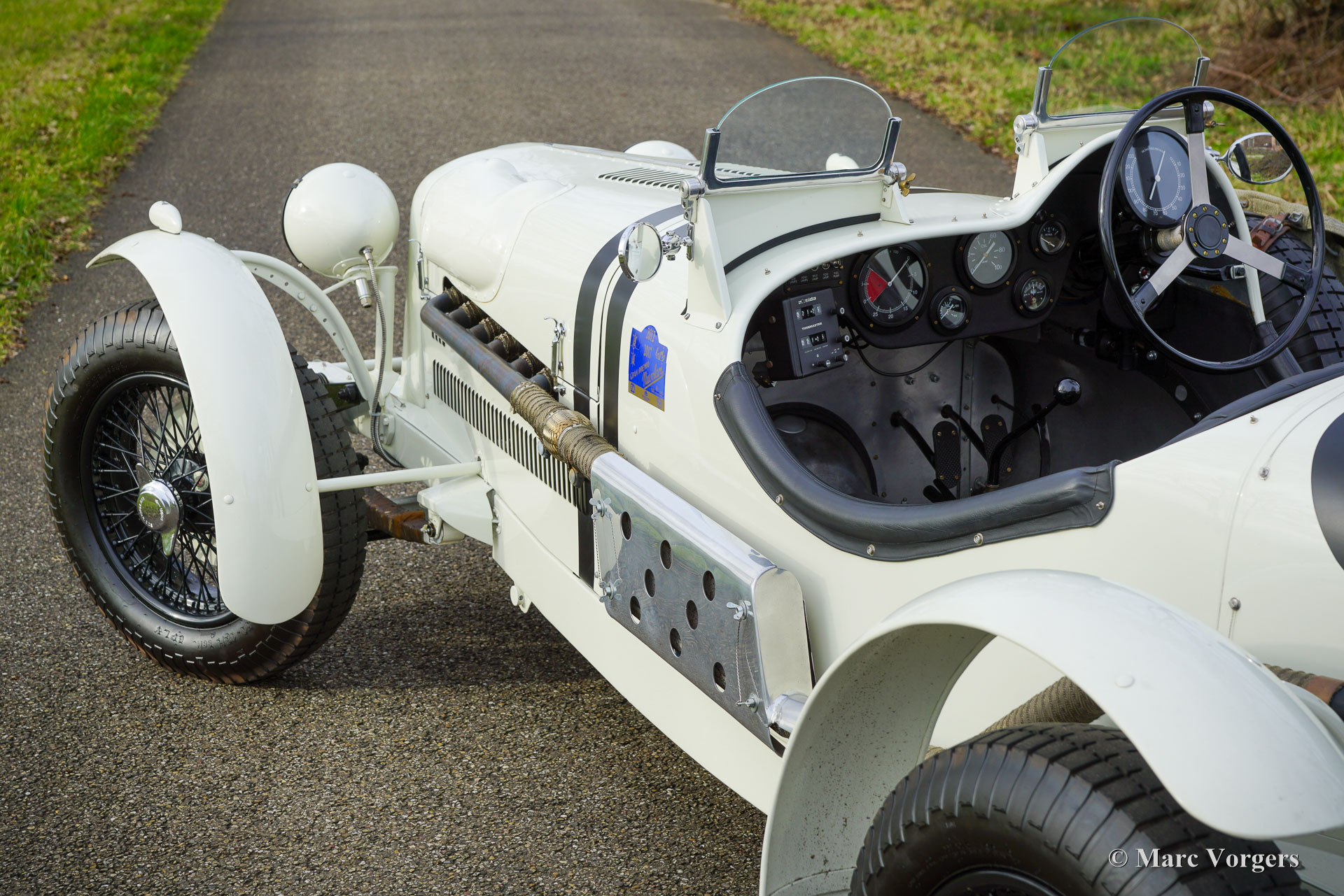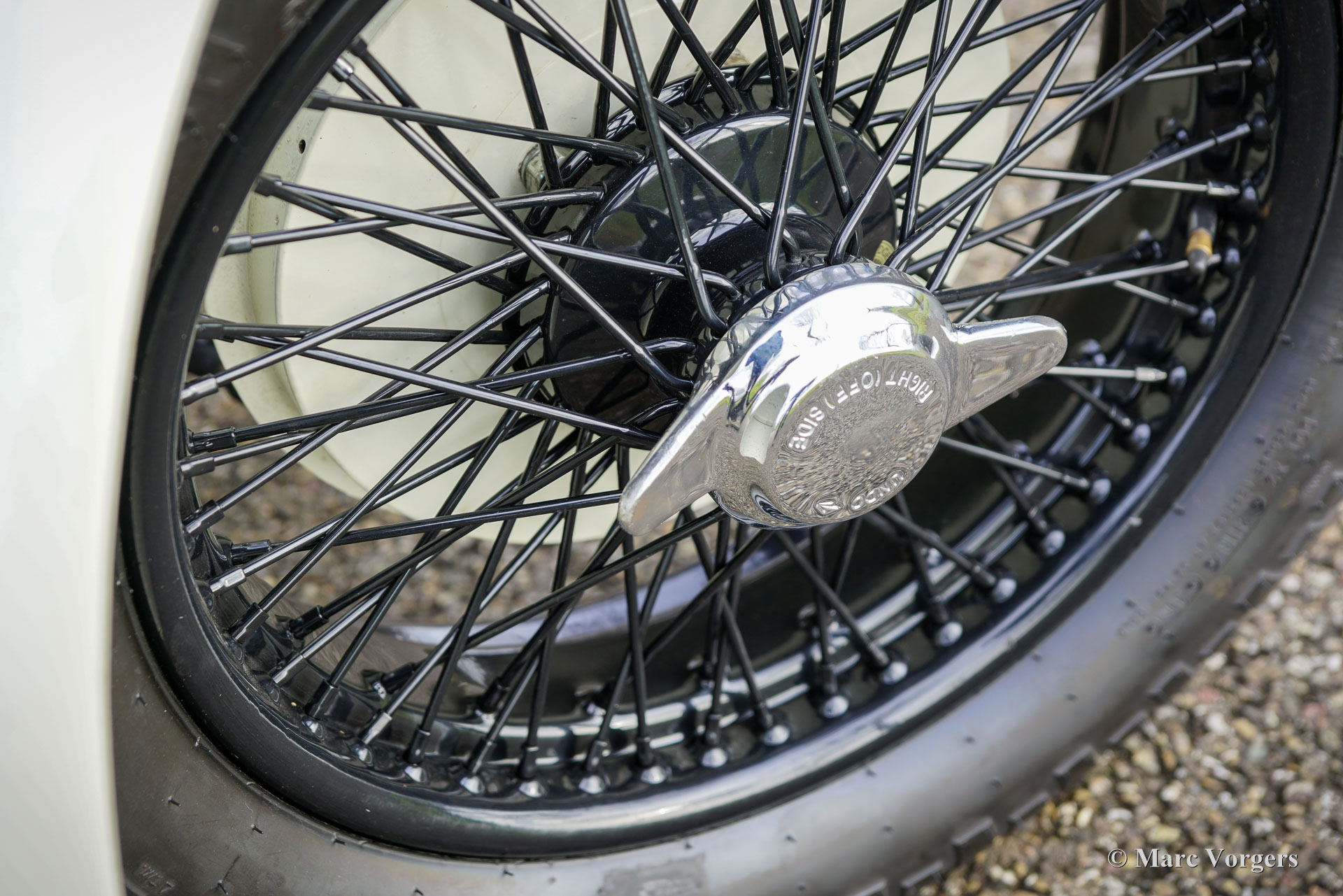 Alvis 3-Liter special, bouwjaar chassis 1950. Kleur gebroken wit (Old English White) met zwarte strepen over de motorkap en zwarte spaakwielen. Zwartlederen stoelen en een zwarte tonneau cover. Deze prachtige Alvis 3-Litre special is gebouwd door Racing Green Engineering (R.G.E.) uit Wales, de auto is voltooid in het jaar 2014. Deze indrukwekkend ogende en rijdende Alvis special is gebouwd op een Alvis TA14 chassis en wordt aangedreven door een 3 liter Alvis TC zescilinder-lijnmotor. In goede Alvis-traditie is de handbediende vierversnellingsbak volledig gesynchroniseerd. Het originele chassis en de technische componenten werden volledig gerestaureerd en gereviseerd tot in de perfectie, en de carrosserie werd met de hand gebouwd uit aluminiumplaat door de RGE-vakmensen volgens de hoogste normen. Het carrosserieontwerp is geïnspireerd op het uiterlijk van vintage Alvis-racewagens uit de jaren dertig. Deze Alvis 3-Litre special verkeert in een sublieme staat en de auto rijdt en stuurt indrukwekkend goed. De motor heeft veel kracht en het uitlaatgeluid is opzwepend! Zoals elke special gebouwd door R.G.E. is deze Alvis is een kwaliteitsproduct van topklasse; slim ontworpen, mooi vormgegeven, en voortreffelijk gebouwd. Het chassis en de mechanische onderdelen voldoen allemaal aan de originele fabrieksspecificaties. De auto kan worden geïmporteerd in en geregistreerd in elk land ter wereld. De vorige eigenaar heeft 10 jaar van de auto genoten, hoogtepunt was de deelname aan de Gran Premio Nuvolari (Editione Moderna) in Italië. Er is een kostbare vintage Halda Twinmaster analoge rallymeter gemonteerd zodat de nieuwe eigenaar de auto kan gebruiken tijdens historische toer- en regelmatigheidsevenementen. De auto wordt geleverd met een volledige historie. Dit is een unieke Alvis special gebouwd door een gerenommeerde specialist. Een fantastische vondst voor de ‘Pre-War’ sportwagenliefhebber die graag in ‘Pre-War’ stijl rijdt maar dan met groot bedieningsgemak en wat meer rijcomfort!