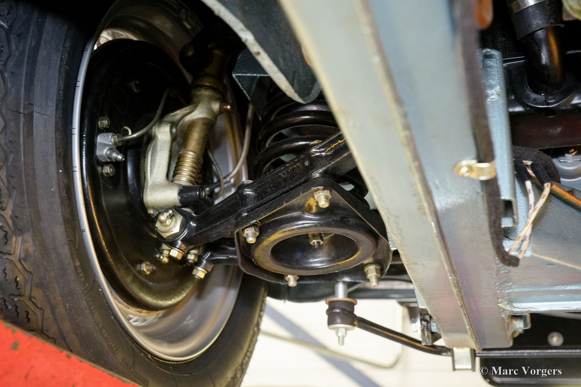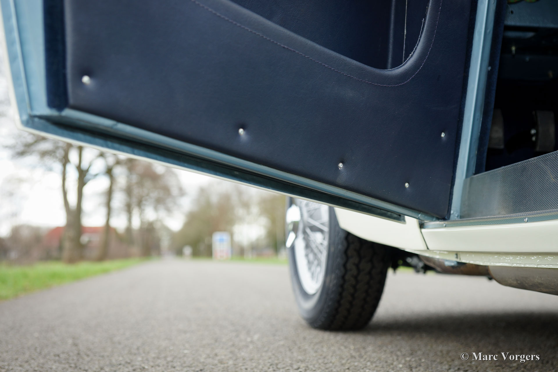Austin Healey 100/4 (BN-1), jaar 1955. Kleur ice blue metallic boven crème wit. Blauw lederen interieur en blauw tapijt. Deze fantastische Austin Healey 100/4 werd uitvoerig gerestaureerd, de automobiel verkeert in sublieme topstaat, concours! Een fotoreportage van de restauratie is aanwezig. Deze geweldige Healey 100-‘four’ is uitgerust met overdrive en gelakte spaakwielen.