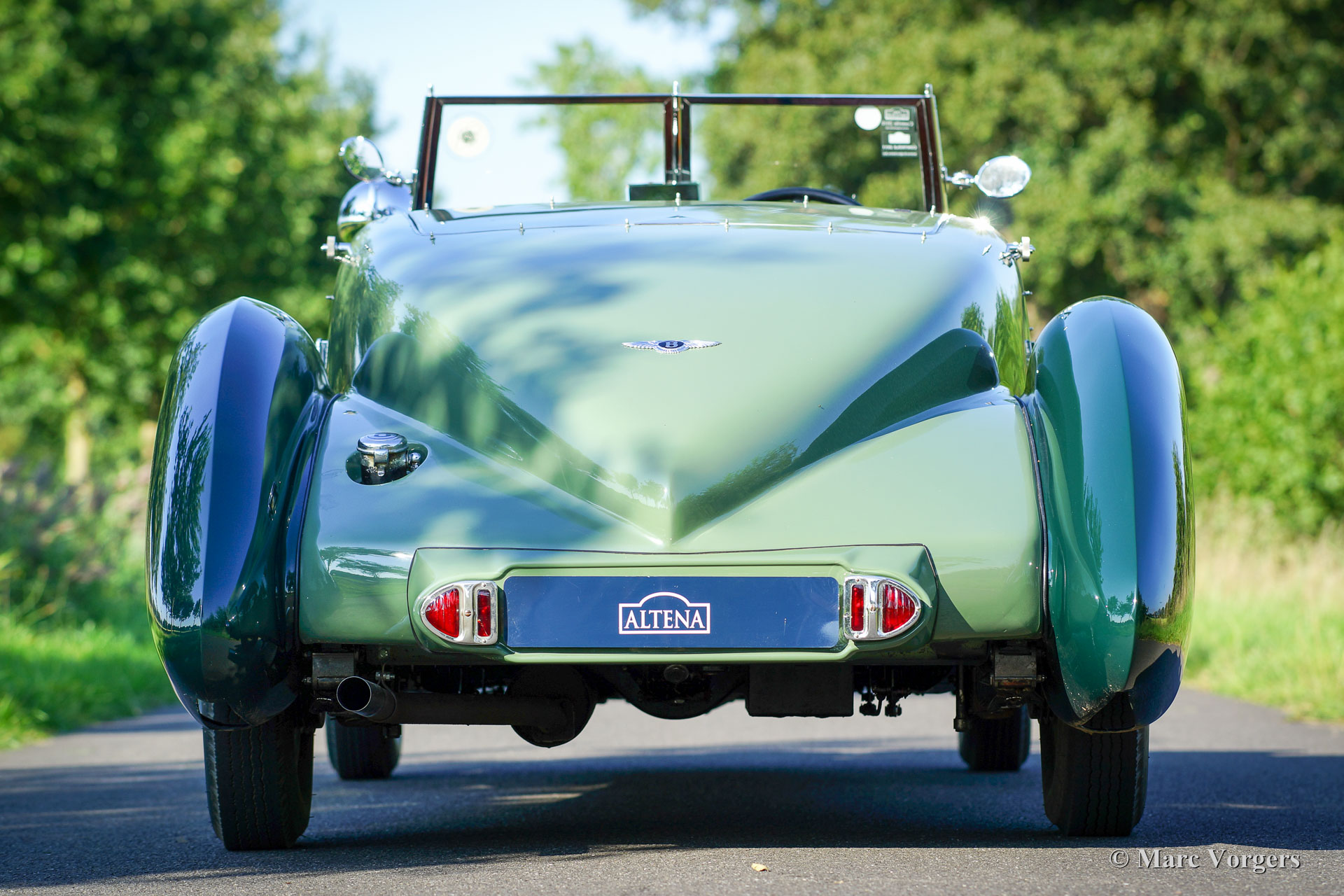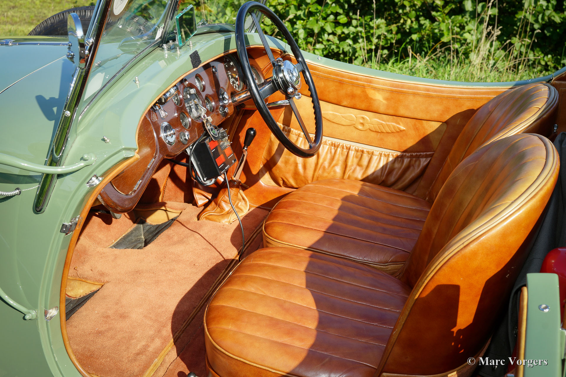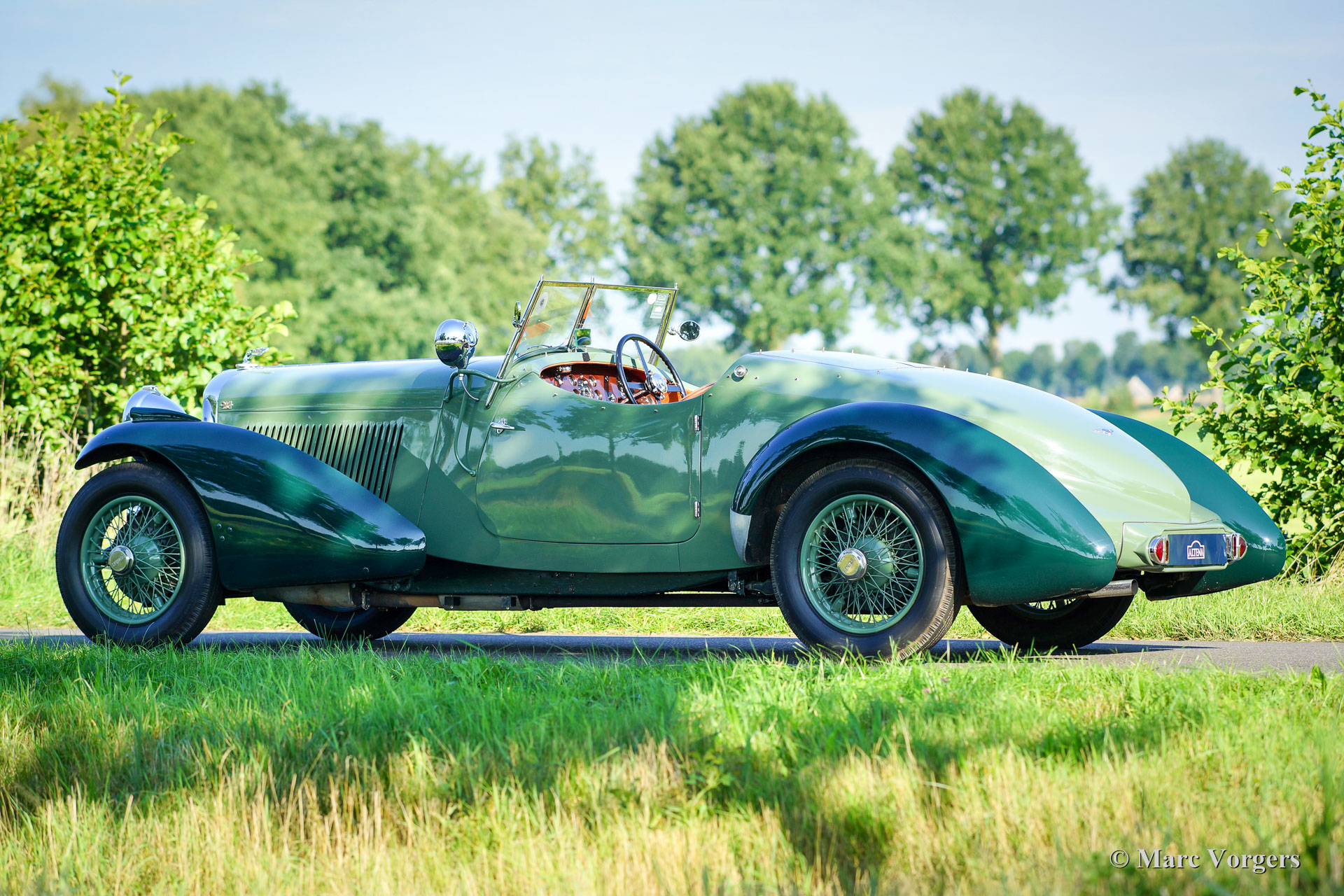 Bentley 3½ Litre Sports, bouwjaar 1934. Kleur ‘two-tone’ lichtgroen/donkergroen with a cognac-kleurig lederen interior bijpassend tapijt. Chassis number B111BL. Deze ‘Derby’ Bentley verliet de fabriek met een open tourer carrosserie op 3 augustus 1934. De automobiel werd verscheept naar de eerste eigenaar in Zuid Afrika. In de jaren 1940 kwam de Bentley terug in Engeland. In de late jaren 1980, vroege jaren 1990 werd de auto voorzien van de huidige en zeer fraaie tweezits ‘sport’ carrosserie. Van deze periode zijn er veel facturen van de restauratie aanwezig. Deze Bentley 3½ Litre Sports verkeert in excellente staat en de auto rijdt geweldig! De jaren 1930 Bentley slogan ‘The Silent Sports Car’ is nog altijd onverminderd van toepassing. De Bentley voelt zeer solide en de auto kan met verve worden bedwongen door ervaren rijders. Deze Bentley ‘sports’ is een tijdloze schoonheid in de stoere mannelijke variant van het woord. Een zeer begeerlijke en unieke Bentley.