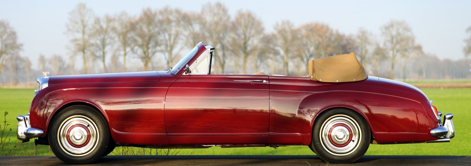 Bentley S1 Continental Drophead Coupe, bouwjaar 1959. ‘Matching numbers’. Kleur donker rood met een beige lederen interieur, Wilton tapijt en een beige (tan) mohair kap. Deze schitterende Bentley S1 Continental DHC werd jarenlang zorgvuldig onderhouden in de werkplaats van Altena Classic Service.