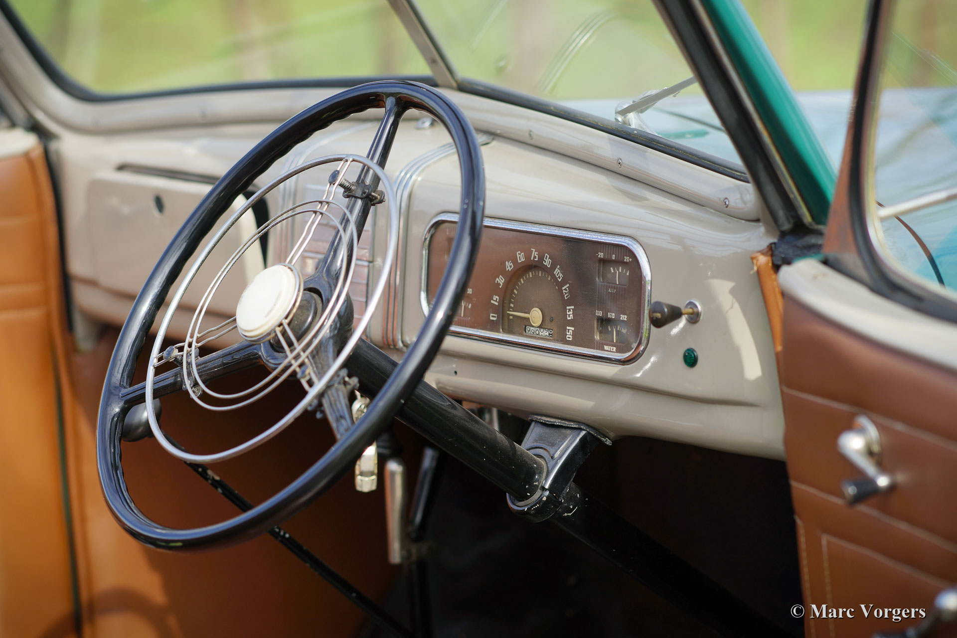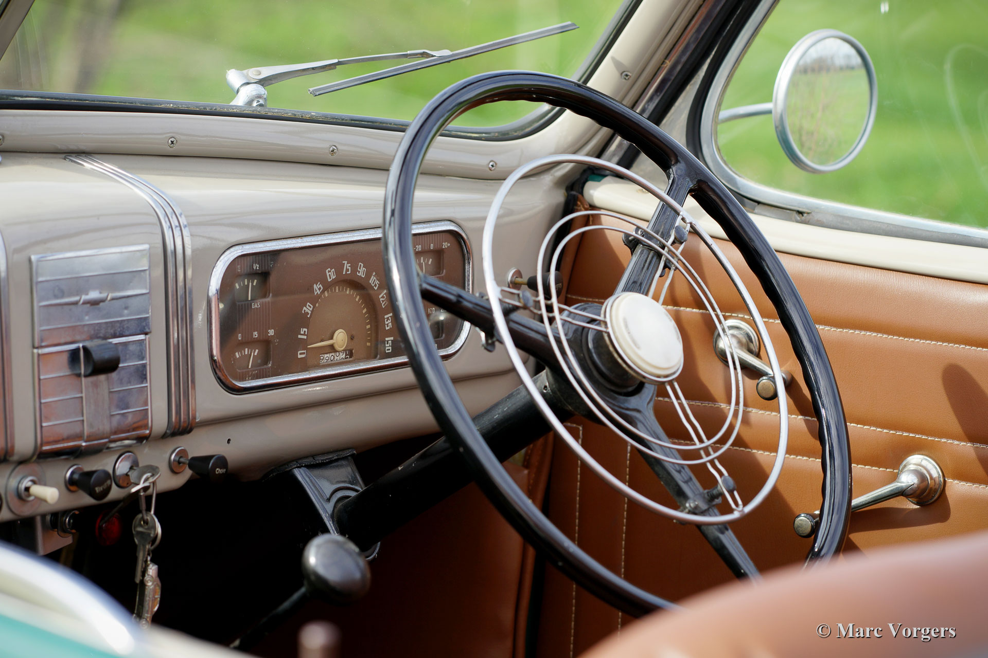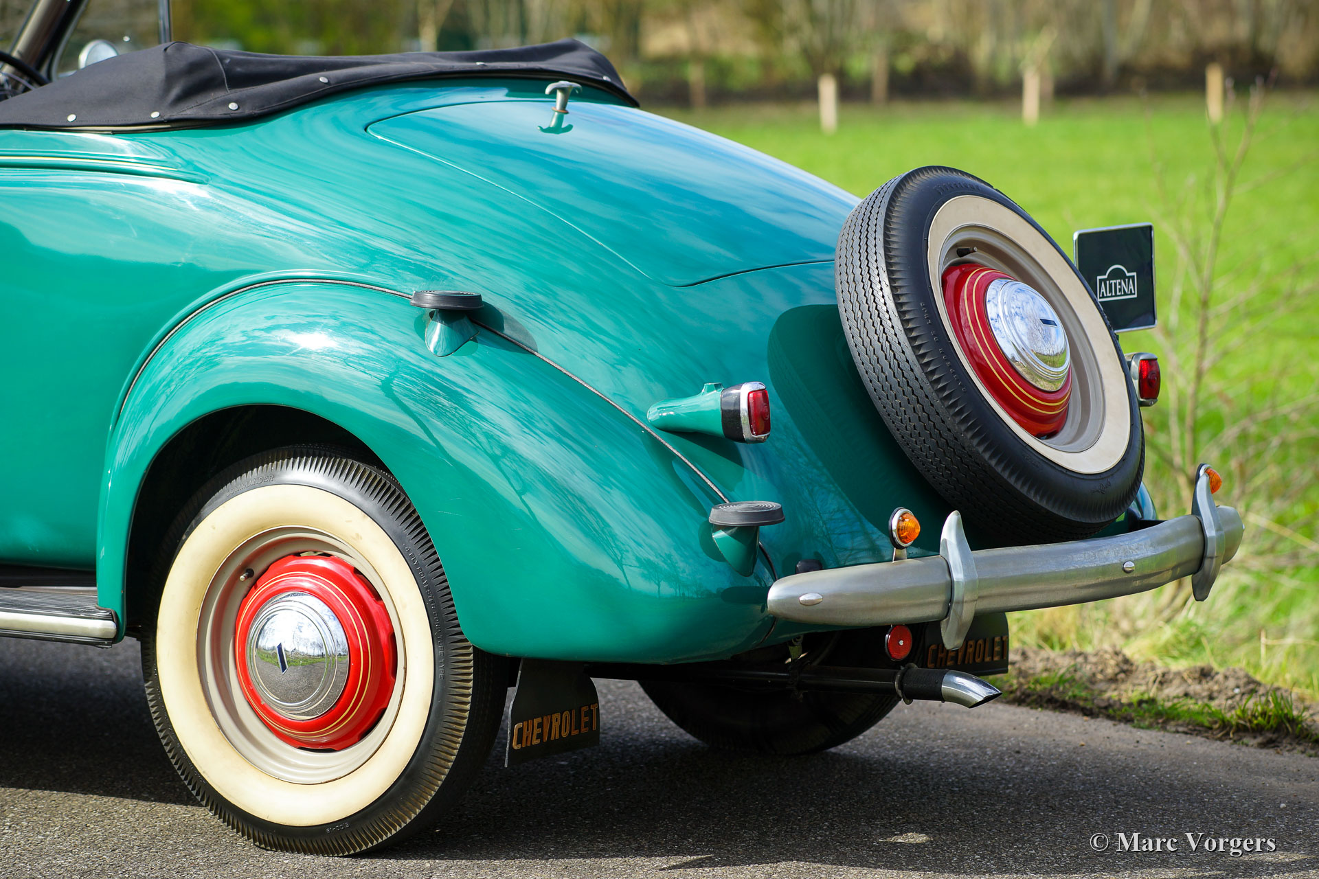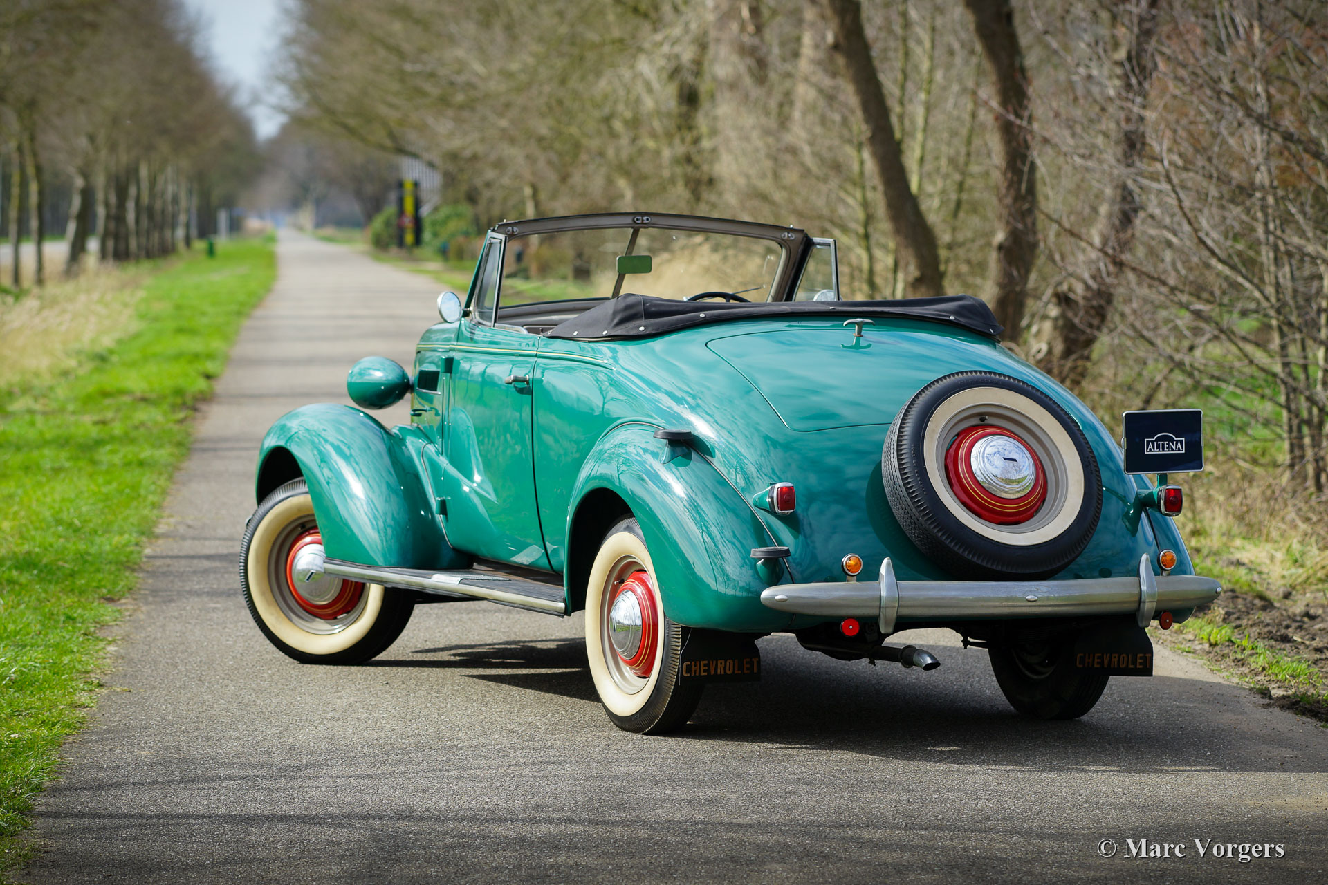 Chevrolet Master Roadster, jaar 1937. Kleur groen gecombineerd met een naturel bruin lederen interieur. Lichtgrijze soft-top met een ‘uitritsbare’ achterruit en een zwarte kapafdekking. Deze fantastische Chevrolet Master roadster verkeert in een zeer goede en zeer originele staat, een echte tijdcapsule! De auto vertoont een fraai ‘vintage’ patina. De originele details zijn een genot voor het oog; bekijk de dashboardmeters, het stuur, de lampen, de wielen, spatlappen ... Gewoon geweldig! Een bijzonderheid is de ‘dickey-seat’ achterin waar twee extra passagiers een zitplaats kunnen vinden! Deze Chevrolet Master roadster rijdt uitstekend, de zescilindermotor loopt prachtig en de drieversnellingsbak schakelt perfect. Deze fraaie Chevrolet Master wordt compleet geleverd met het originele instructieboek.