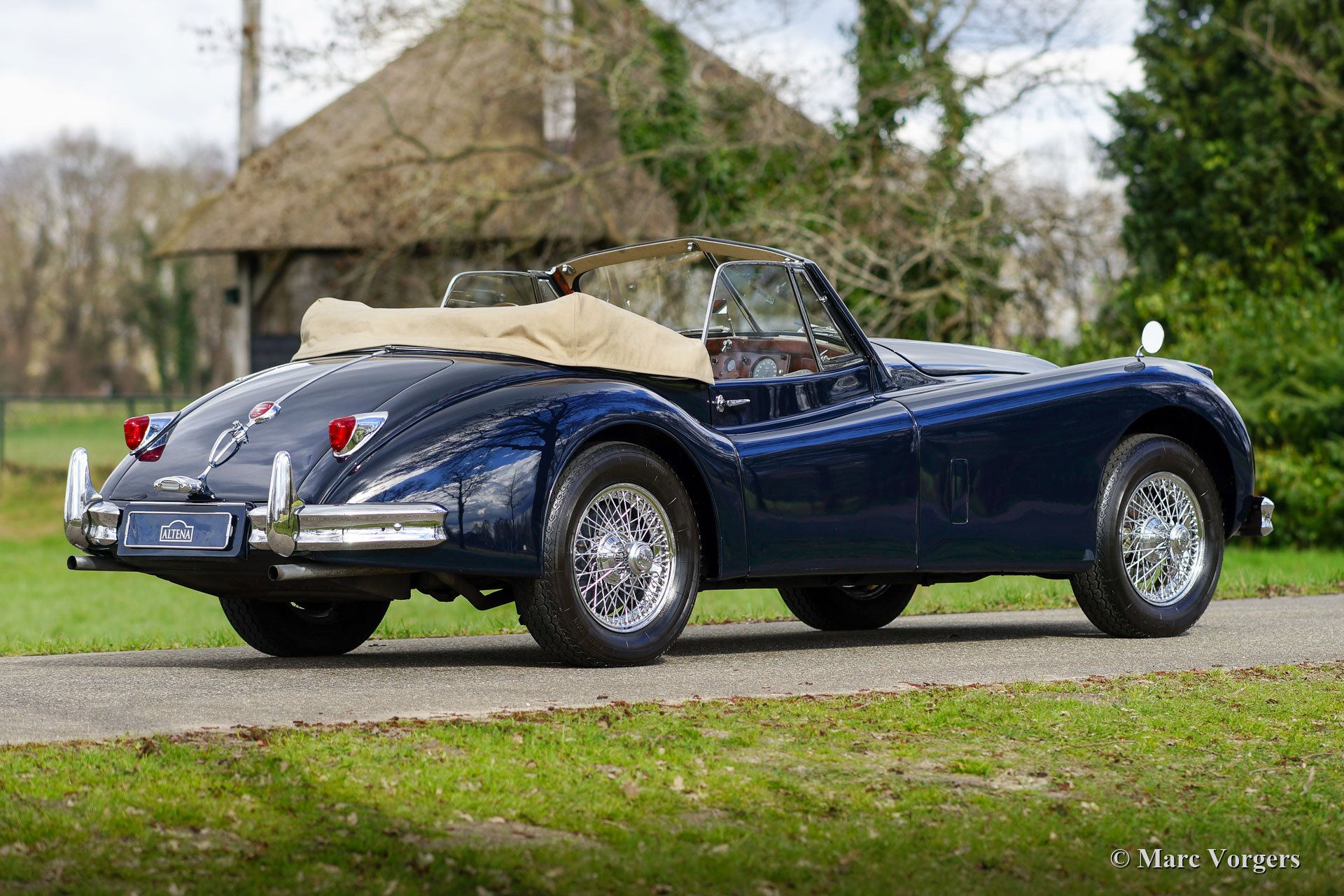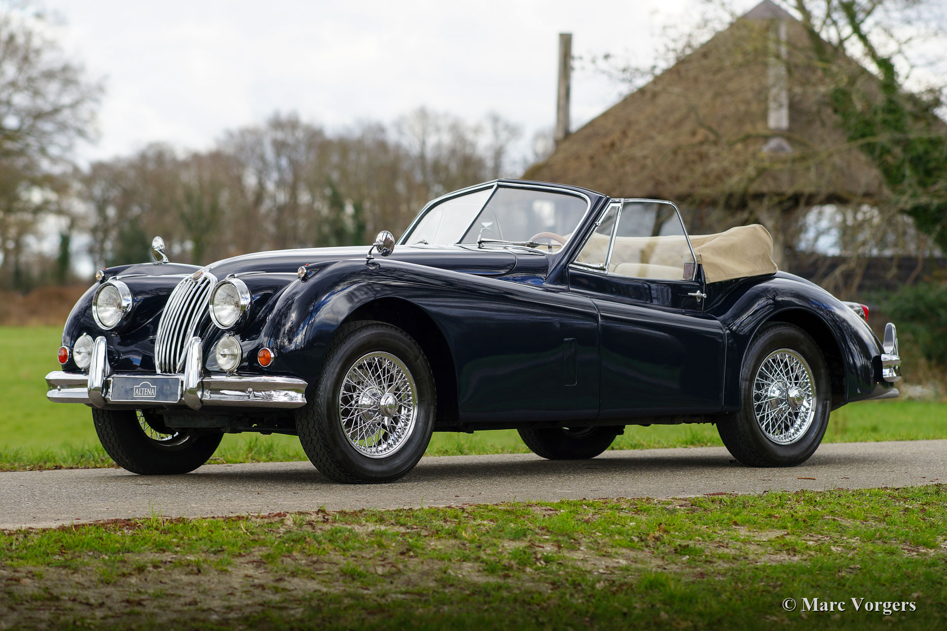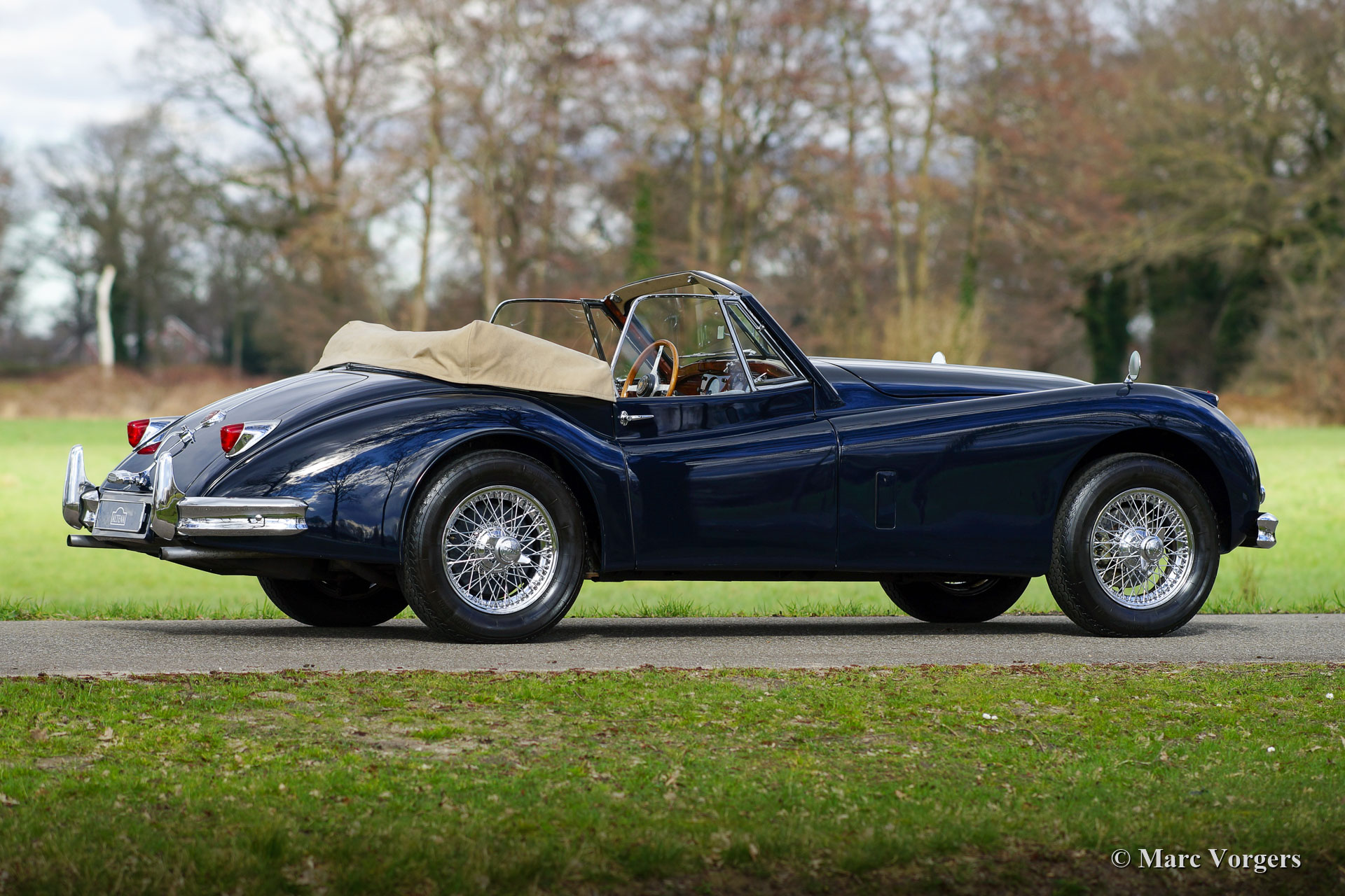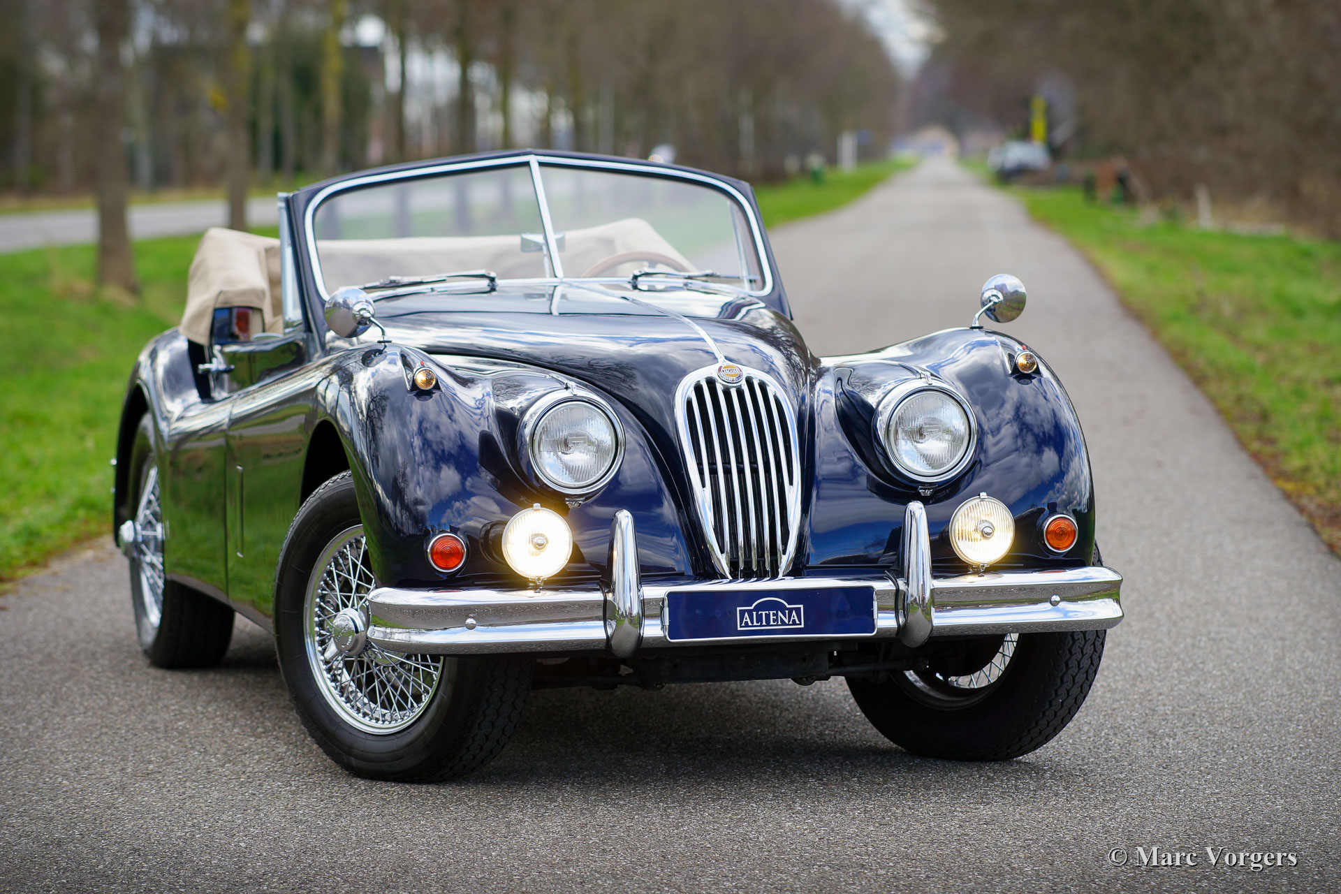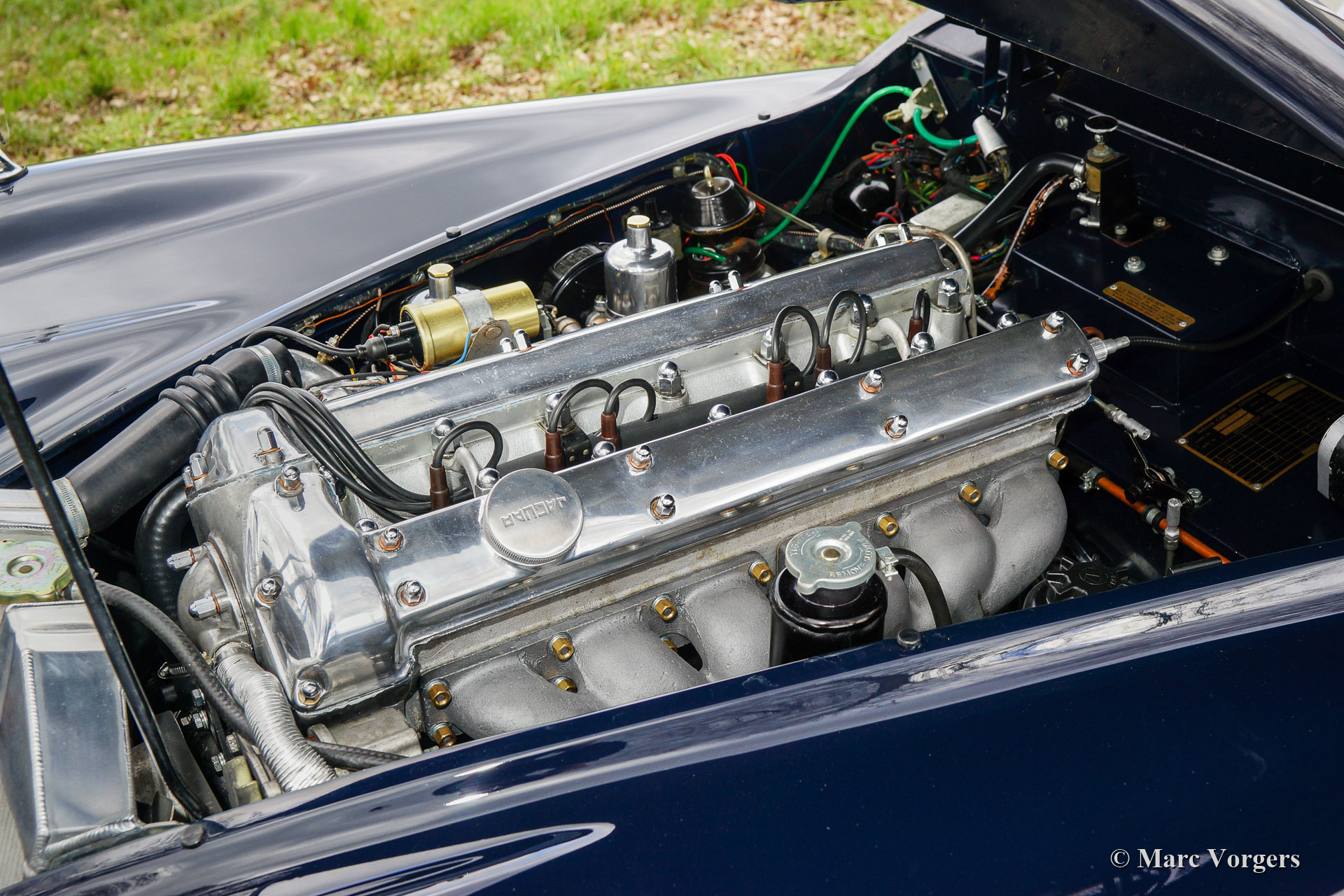 Jaguar XK 140 SE DHC, jaar 1956. Dit is een fabrieksorigineel SE (Special Equipment) model met 190 pk. Kleur donkerblauw gecombineerd met een beige lederen interieur en beige wollen tapijt. Donkerblauwe mohair kap (vernieuwd in 2012) en een beige kapafdekking. Deze prachtige Jaguar XK 140 SE DHC (Drop Head Coupé) is nieuw verkocht in de Verenigede Staten. In het jaar 2000 is de auto in Nederland geïmporteerd en vervolgens in de periode 2000 - 2004 volledig en perfect professioneel ‘body off’ gerestaureerd. Een prachtig fotoboek is aanwezig waarin de restauratie wordt gepresenteerd. Kosten noch moeite zijn gespaard om perfectie te bereiken. Het plaatwerk is gerestaureerd vanaf het blanke metaal, al het chroom is opnieuw verchroomd, het interieur is nieuw bekleed en alle mechanische onderdelen zijn gerestaureerd, gereviseerd en/ of vernieuwd. De originele versnellingsbak met 4 versnellingen is vervangen door een Getrag met 5 versnellingen en de trommelremmen voor zijn vervangen door schijfremmen om de rijervaring en de veiligheid te verbeteren. Het 12-voltsysteem werd aangepast naar wisselstroom met de montage van een wisselstroomdynamo en de koeling werd opgewaardeerd door de montage van een aluminium radiator met hoge capaciteit. Sinds het jaar 2000 kende de auto twee Nederlandse eigenaren die met volle teugen van de auto hebben genoten. De auto wordt geleverd met een uitgebreide (service) historie. De Jaguar is voorzien van chromen spaakwielen met Vredestein 185HR-16 Sprint Classic banden, een alarmsysteem, een MotoLita stuur met houten rand en mistlampen aan de voorzijde die deel uitmaken van het SE pakket. Deze Jaguar XK 140 SE DHC verkeert in een uitzonderlijk goede conditie en de auto fantastisch!