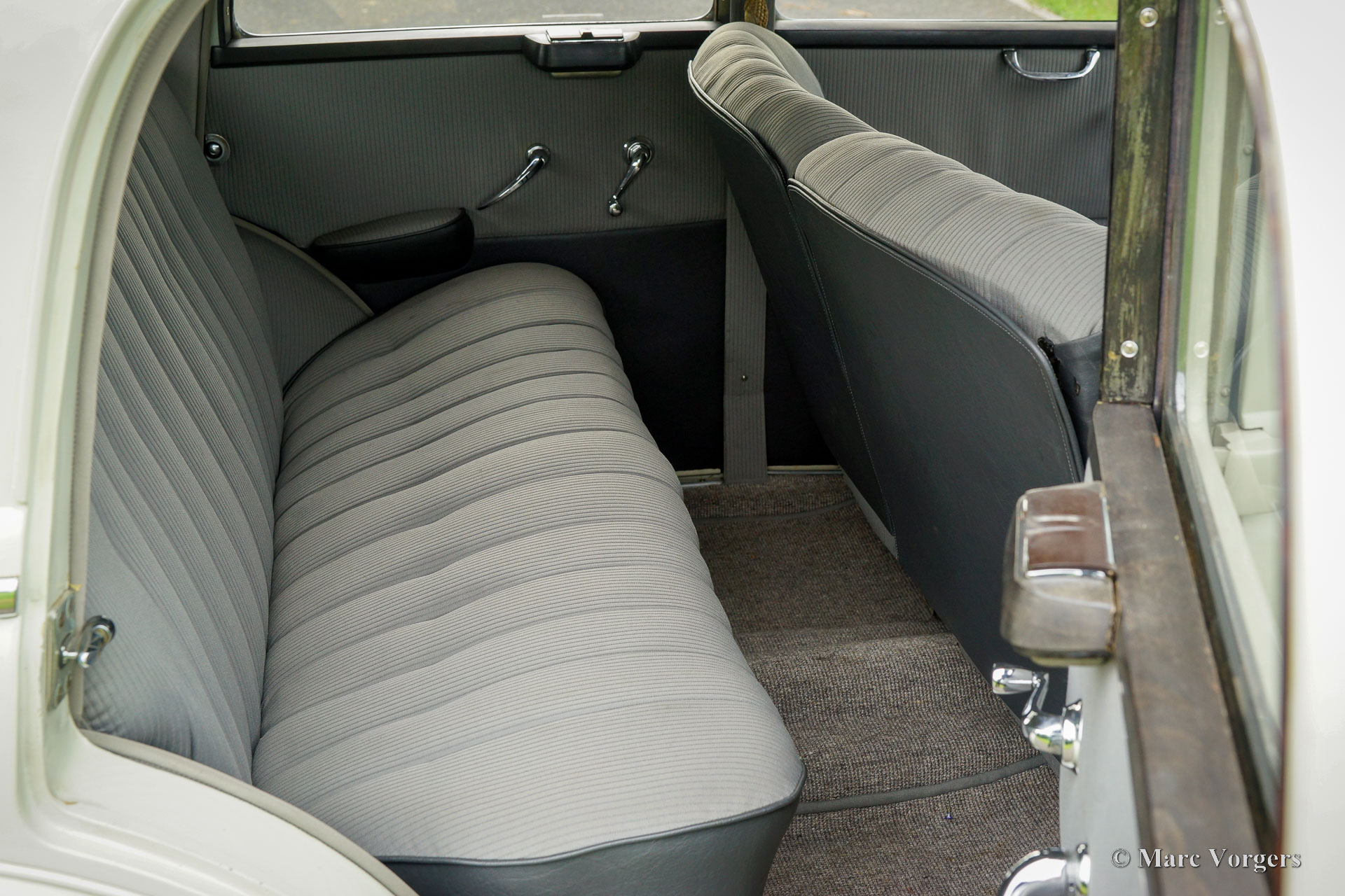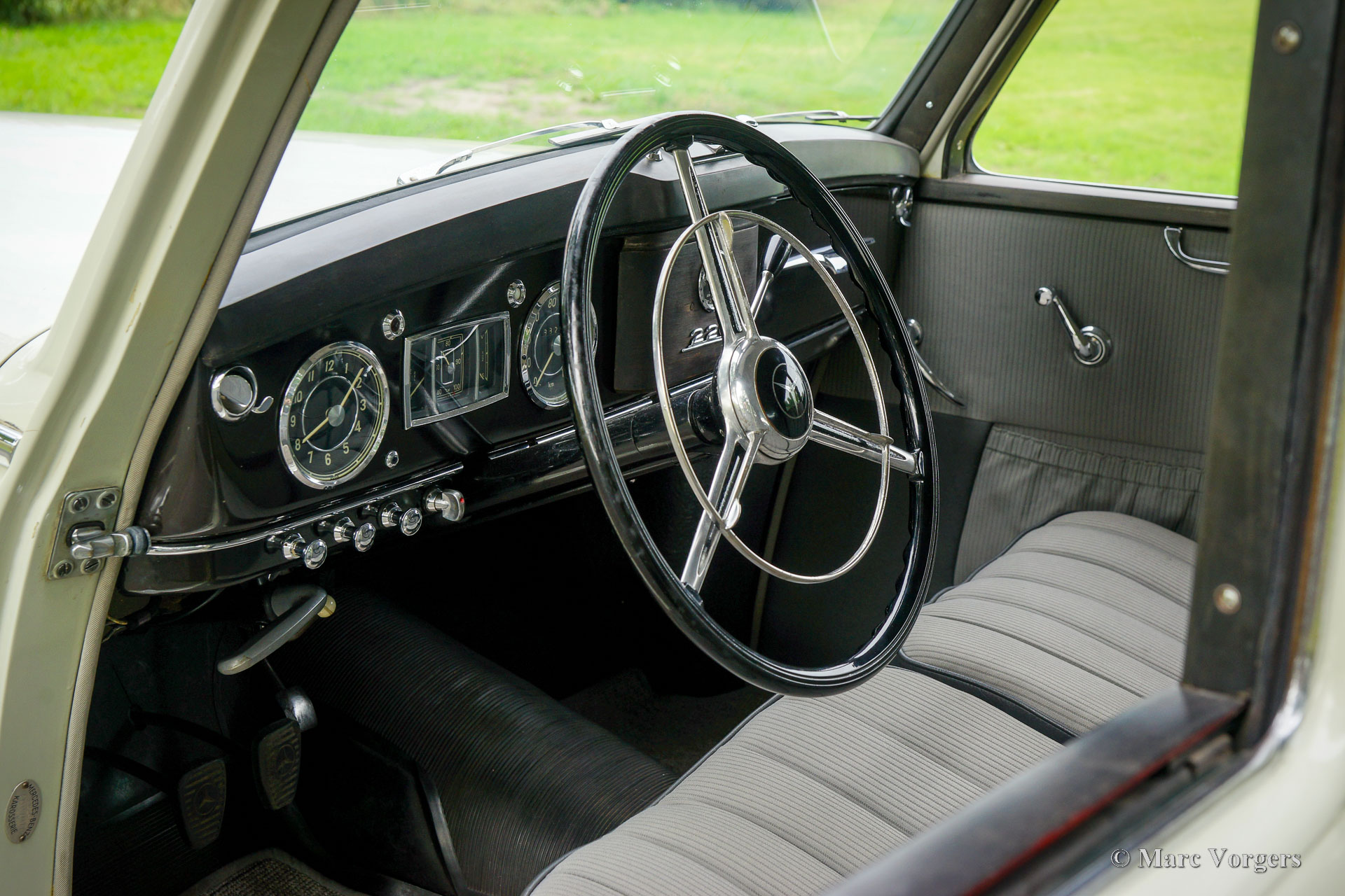 Mercedes-Benz 220 (W187), jaar 1953. Kleur crèmewit gecombineerd met een tweekleurig grijs stoffen/kunstlederen interieur en lichtgrijs tapijt. Deze prachtige Mercedes-Benz 220 is nieuw verkocht in Nederland, de auto is nog voorzien van het originele kenteken PX-15-31. Deze fantastische tijdcapsule verkeert in een zeer goede, zeer mooie, en zeer originele conditie. De automobiel maakte deel uit van een collectie en werd door de jaren heen minutieus onderhouden en door een vakman. De carrosserie is in het verleden voorzien van nieuwe lak in de originele kleur, de motor is in 2016 gereviseerd. In datzelfde jaar is het interieur opnieuw bekleed met de juiste materialen in de correcte kleuren. De zescilinder lijnmotor loopt prachtig en alles werkt feilloos. Deze Mercedes-Benz oogt als een volledig originele klassieker in uitstekend verzorgde staat! De automobiel rijdt heerlijk, deze W187 is een waar pareltje voor de Mercedes-Benz liefhebber/ verzamelaar.