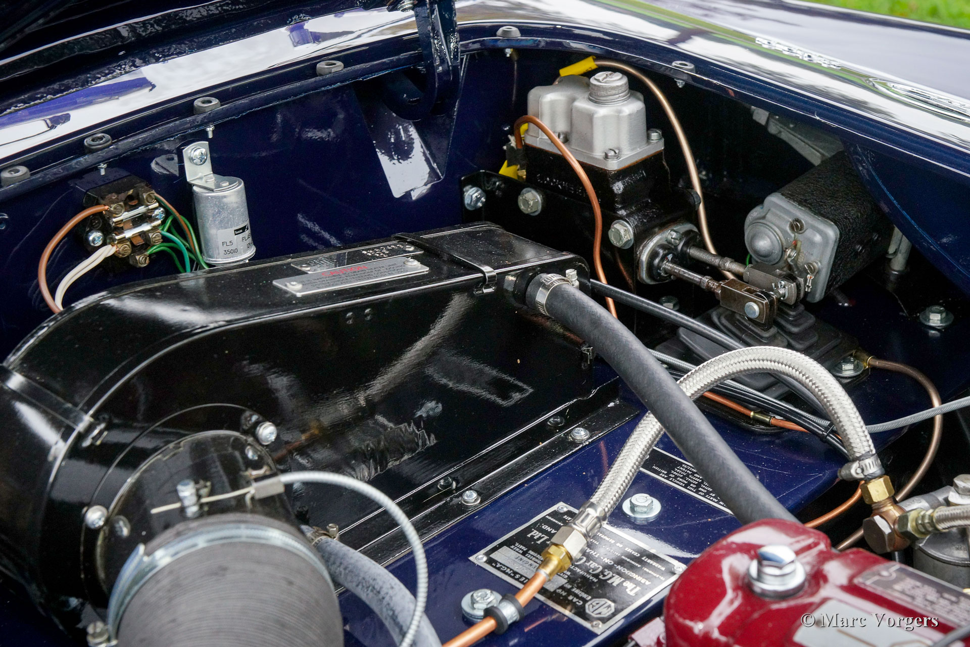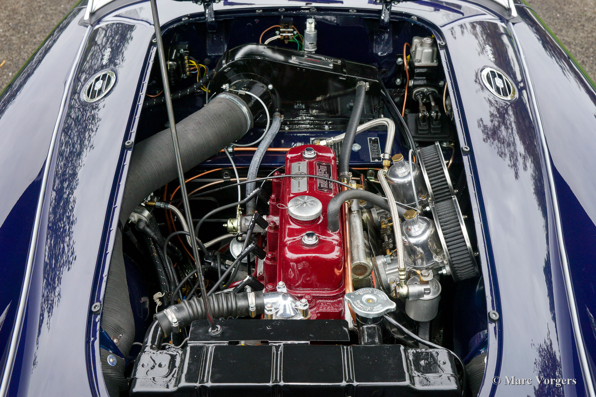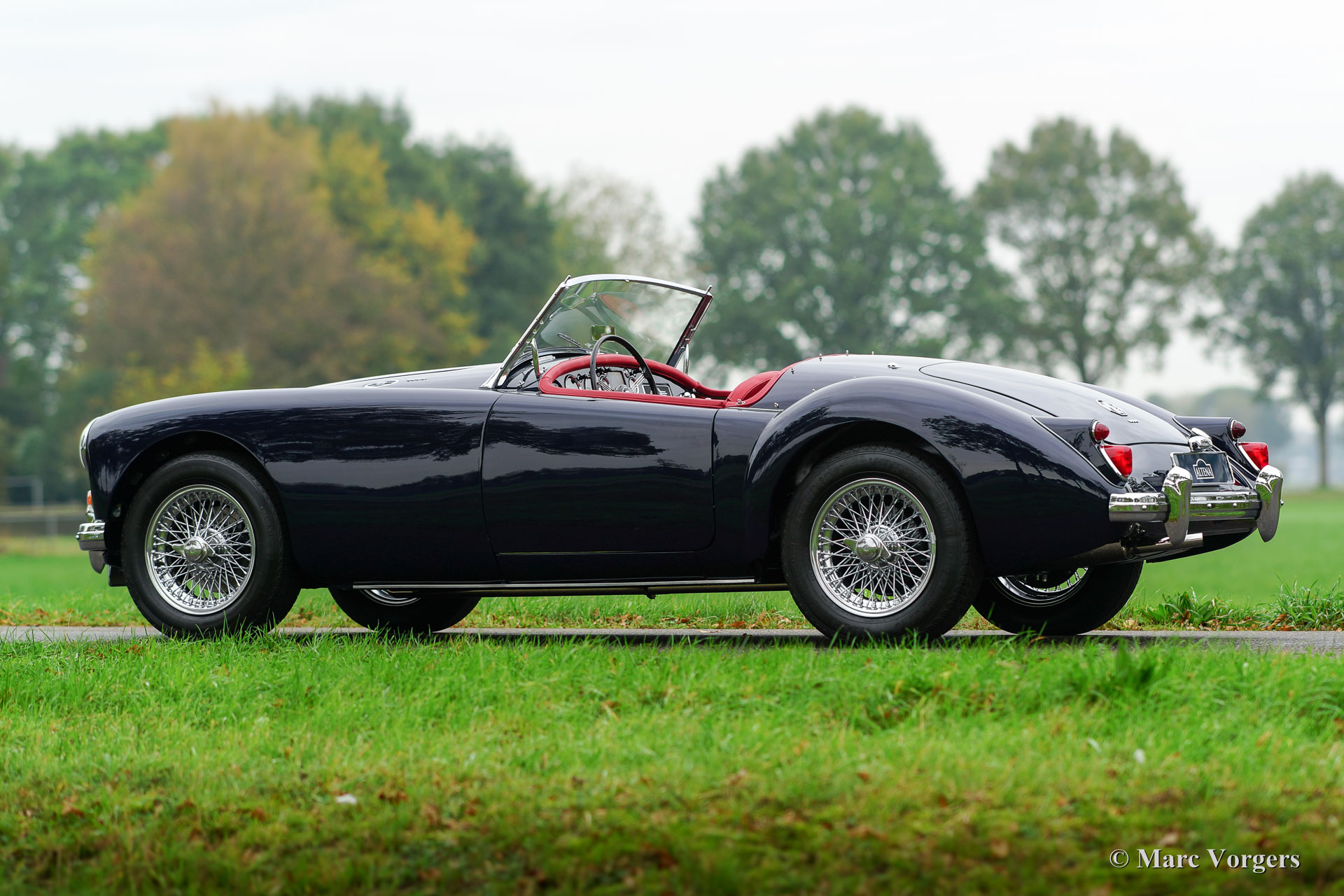 MG MGA 1600 roadster, jaar 1960. Kleur donkerblauw met een rood leren interieur en donkerblauw tapijt. Rode soft-top, tonneau-cover en aluminium zijruiten. Deze beeldschone MGA 1600 roadster is uitvoerig en ‘body-off’ gerestaureerd door een MG-specialist, de auto verkeert in perfecte concoursstaat! Werkelijk alles is onder handen genomen; motor en versnellingsbak zijn gereviseerd, een nieuwe kabelboom en nieuw remsysteem zijn gemonteerd (schijfremmen vóór), en zelfs alle dashboardmeters zijn gereviseerd. De carrosserie toont perfecte passingen, subliem lakwerk en perfecte chroomdelen. Deze MGA is uitgerust met het fraaie originele stuurwiel en er is een rvs uitlaat gemonteerd. Een voortreffelijk rijdend top-exemplaar.