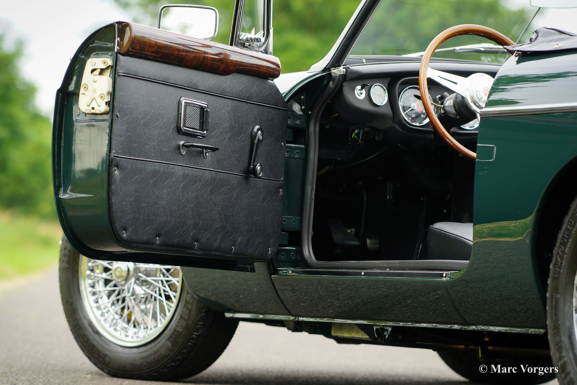 MG MGC roadster, bouwjaar 1968. Kleur donker ‘British Racing Green’ met een zwart lederen interieur, zwart tapijt, een zwarte ‘soft top’ en een zwarte hood cover. Deze geweldige MGC werd enige jaren geleden uitvoerig ‘body off’ gerestaureerd. De automobiel verkeert in sublieme topstaat en de auto rijdt uitstekend. De MGC is de zescilinder uitvoering van de MGB. De auto heeft dezelfde praktische kenmerken als de MGB maar die zijn bij de MGC te genieten onder de roffel van een krachtige zescilinder lijnmotor. Deze MGC is een originele Europese uitvoering. De auto is voorzien van een RVS uitlaat en chroom spaakwielen.