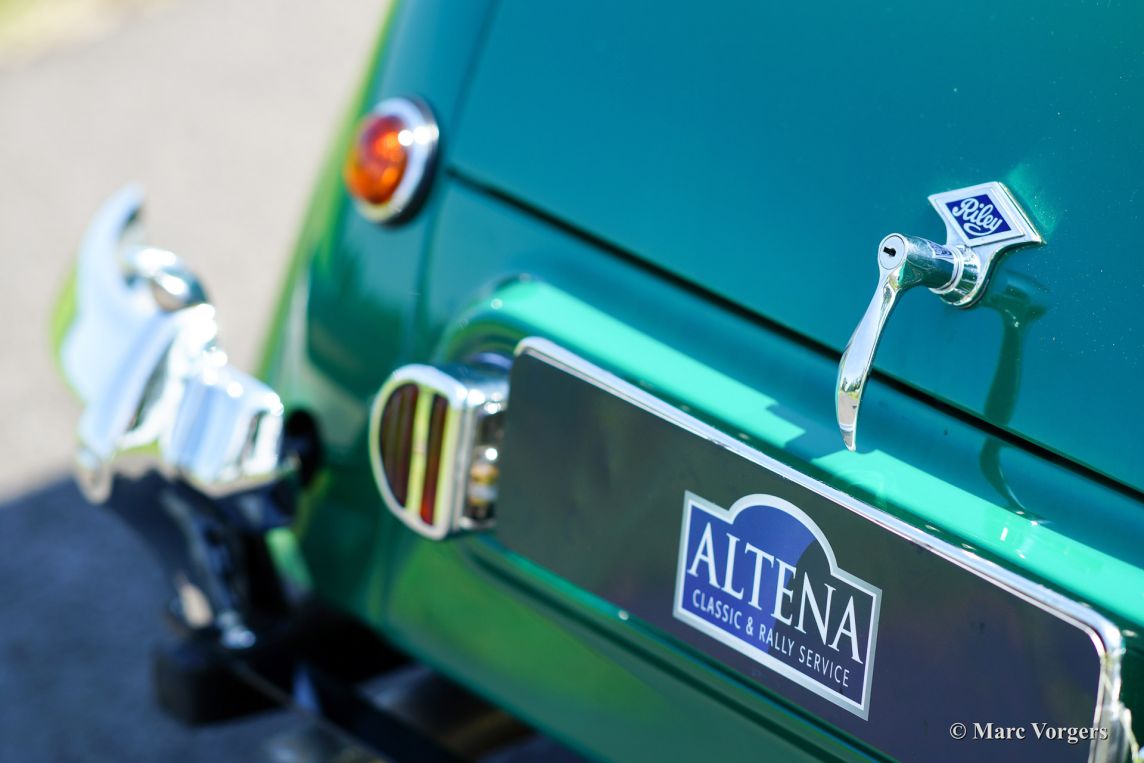 Riley RMD Drophead Coupe, bouwjaar 1951. Chassisnummer 60F72XX. Kleur 'two-tone', groen/lichtgroen. Groen lederen interieur met groen tapijt. Beige cabrioletkap en hood cover. Deze geweldige Riley is een van de slechts 502 ooit gebouwde RMD Drophead Coupe modellen. De automobiel werd in het verleden uitvoerig gerestaureerd. Deze linksgestuurde Riley RMD DHC verkeert in sublieme topstaat en de auto is een genot om te rijden! Een geweldige vierpersoons cabriolet met een bijzonder fraai houten dashboard, een 'period' radio, een eenvoudig te bedienen cabrioletkap en 'frameloze' op- en neerdraaibare zijruiten. Zeldzaam, prachtig gerestaureerd en exclusief. Zowaar nog binnen het bereik van de ware liefhebber.