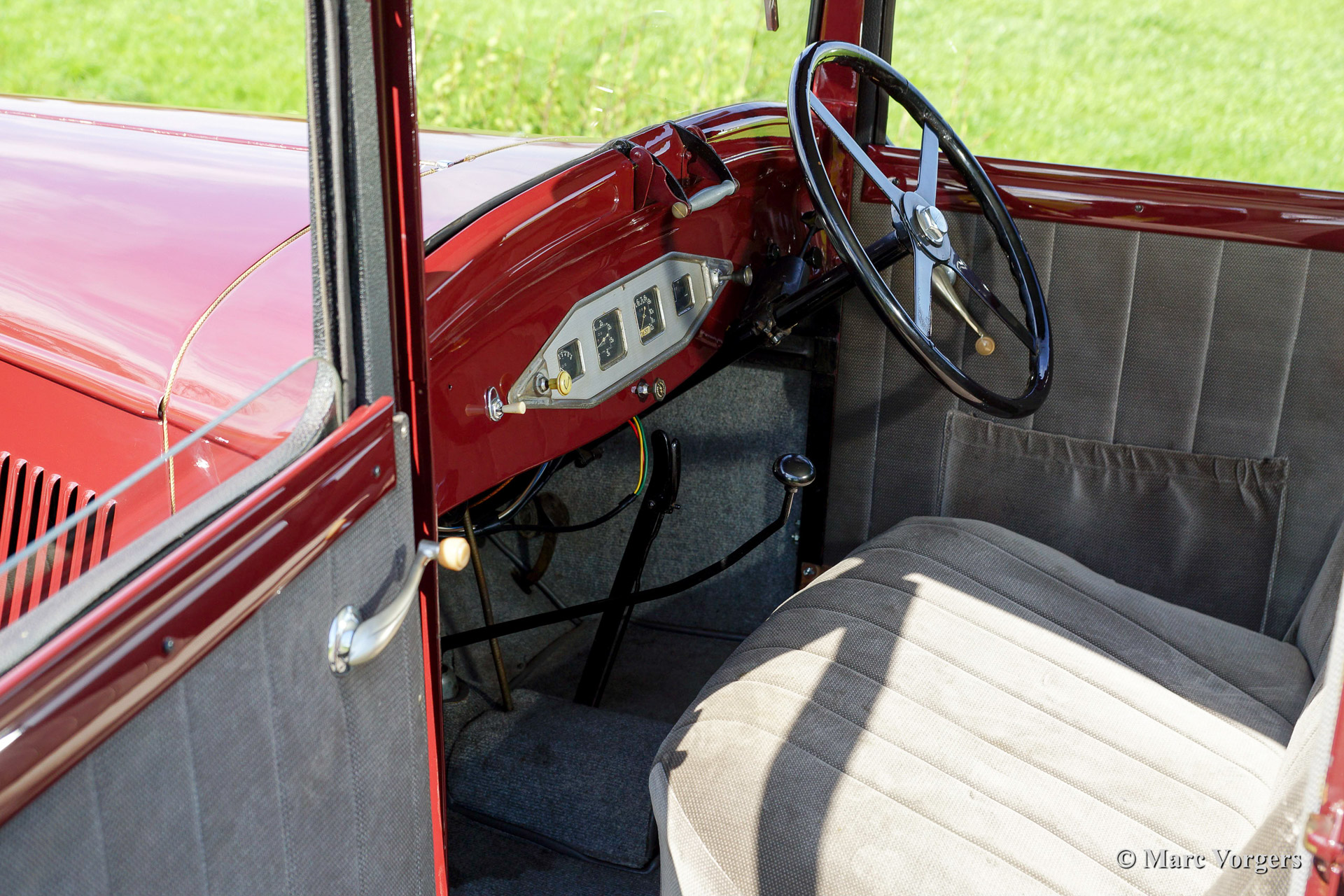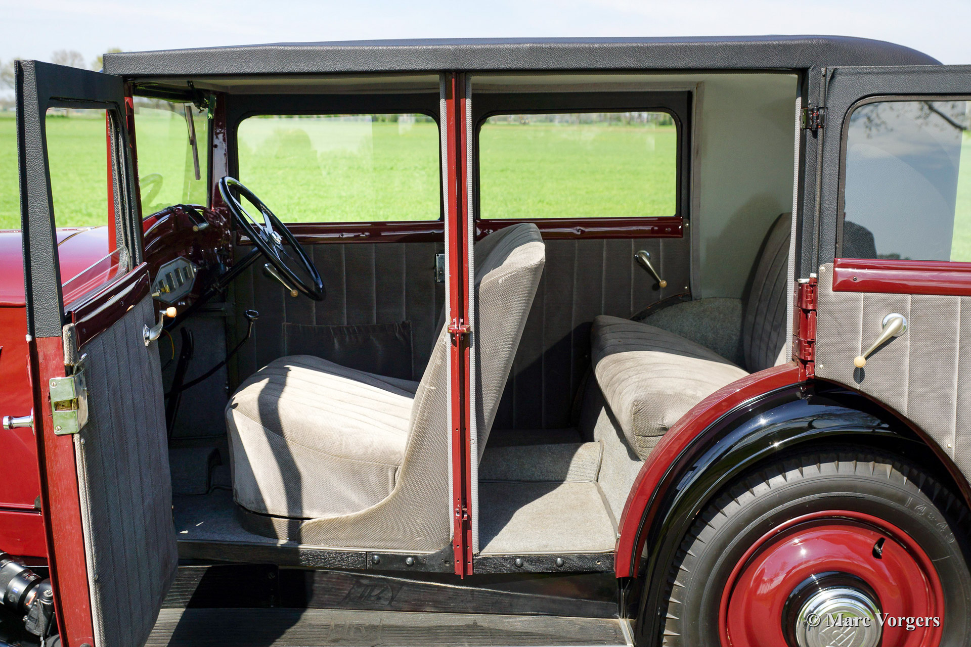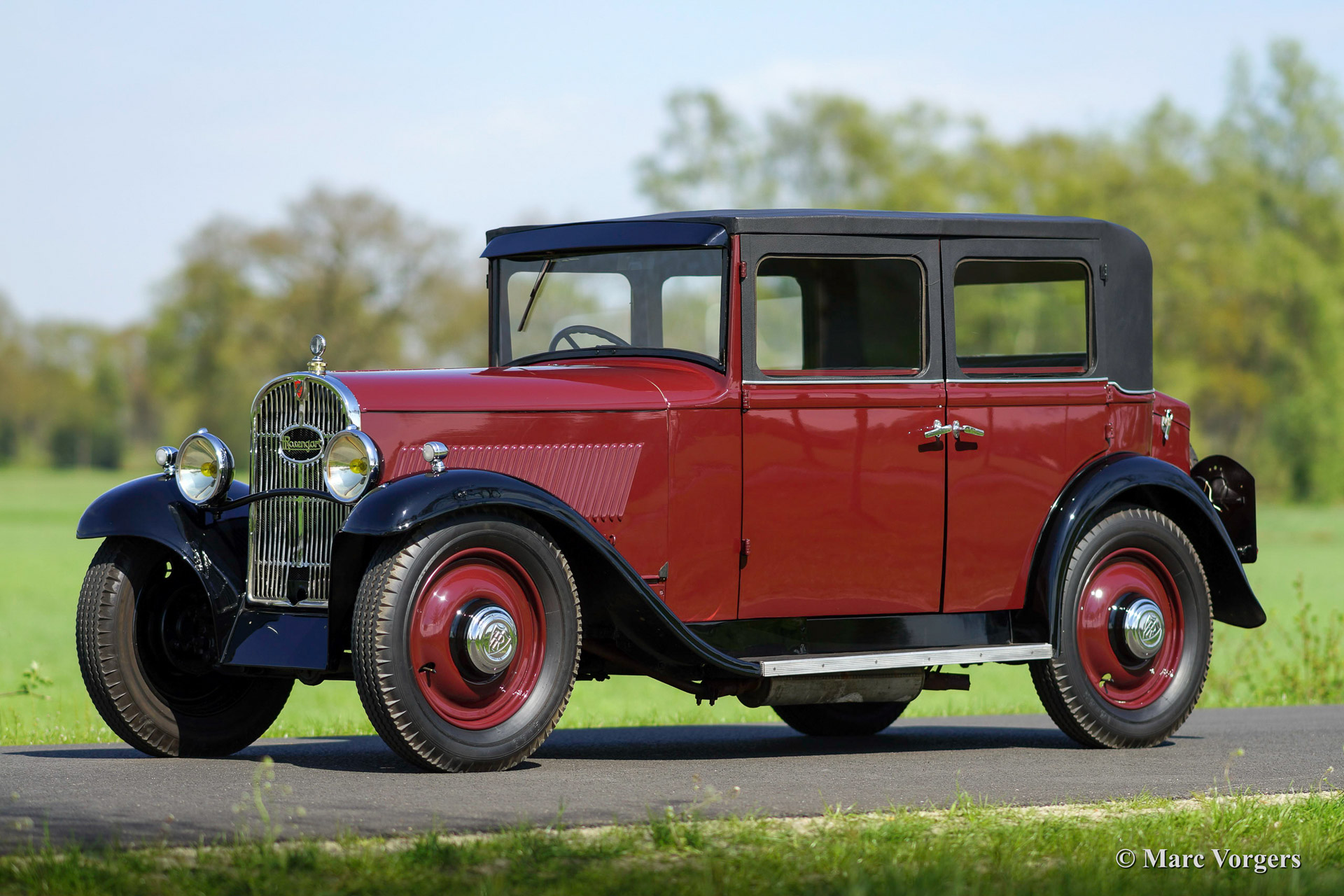Rosengart LR6 saloon, jaar van eerste registratie 1937. Kleur donkerrode carrosserie met zwarte spatborden en donker rode stalen wielen. Grijs stoffen interieur. Deze in Frankrijk gebouwde Rosengart LR6 is een zeer zeldzame auto. Er zijn maximaal 350 van deze zescilinder modellen gebouwd in de vroege jaren 1930. De LR6 was te koop als saloon en als commerciële uitvoering. Veel van deze zescilinder LR 6 modellen zijn in de jaren na de 2e wereldoorlog 'gestript' en omgebouwd naar tweezitter 'special' modellen. Bewaard gebleven originele Rosengart LR 6 saloon modellen zijn dus uitermate zeldzaam. Een LR6 in deze excellente staat is heel moeilijk te vinden, deze auto is wellicht de enige originele Rosengart LR 6 in de Benelux!