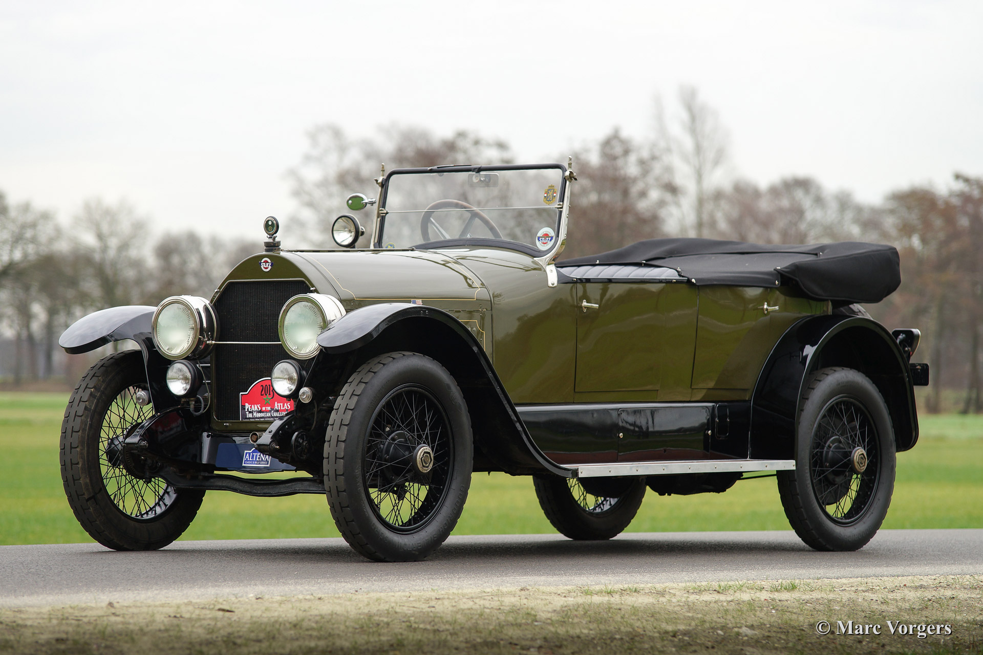 Stutz Series K DH open tourer, bouwjaar 1921. Kleur 'two tone' groen/zwart met een zwart lederen interieur. Zwarte soft top en zwarte spaakwielen. Deze indrukwekkende Stutz Series K open tourer werd uitvoerig gerestaureerd in Zweden in de vroege jaren 1980. In 2013 nam de automobiel deel aan de 2500 kilometer lange 'Peaks of the Atlas' en in 2012 was de auto winnaar van de '100 Miles of Amsterdam'.