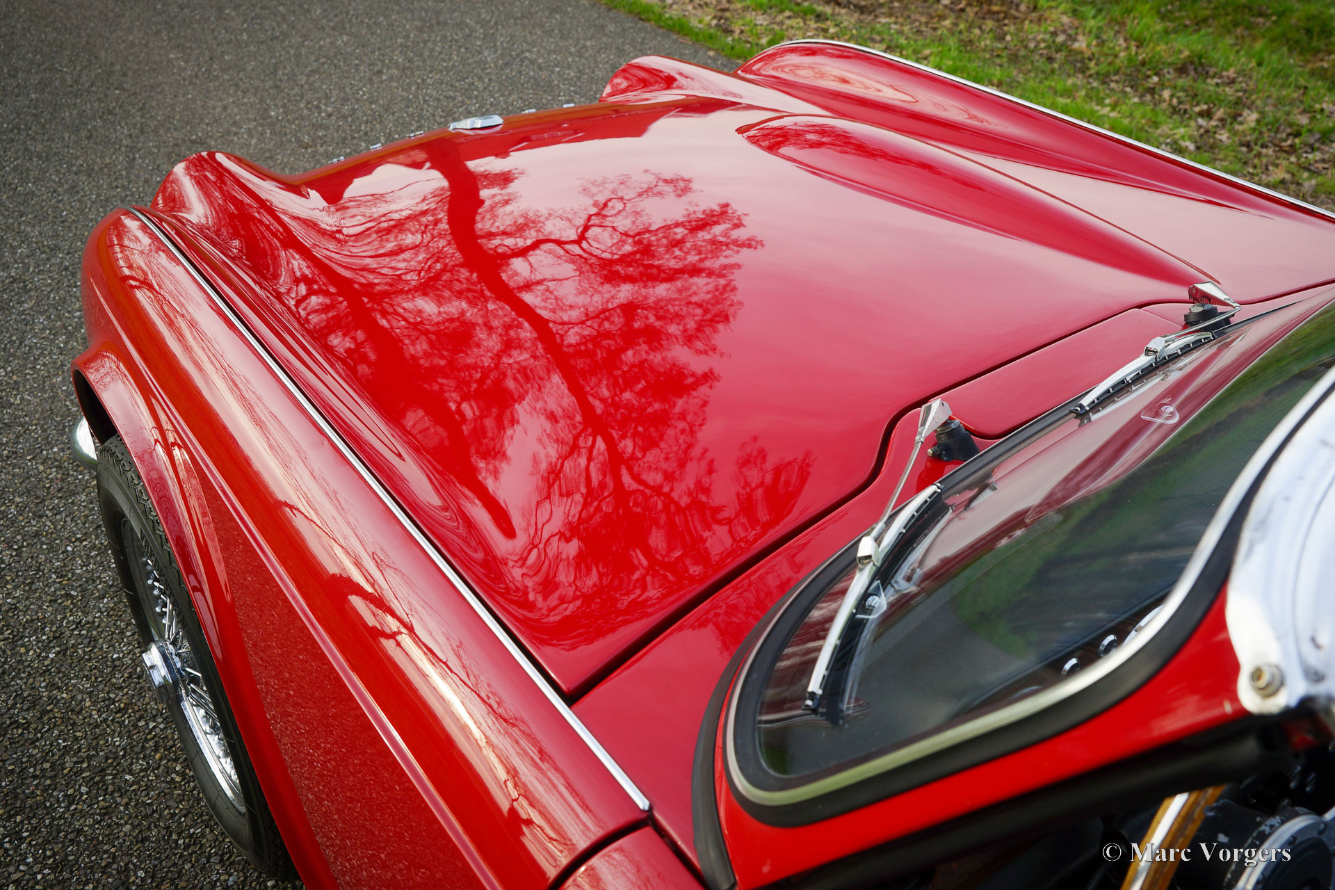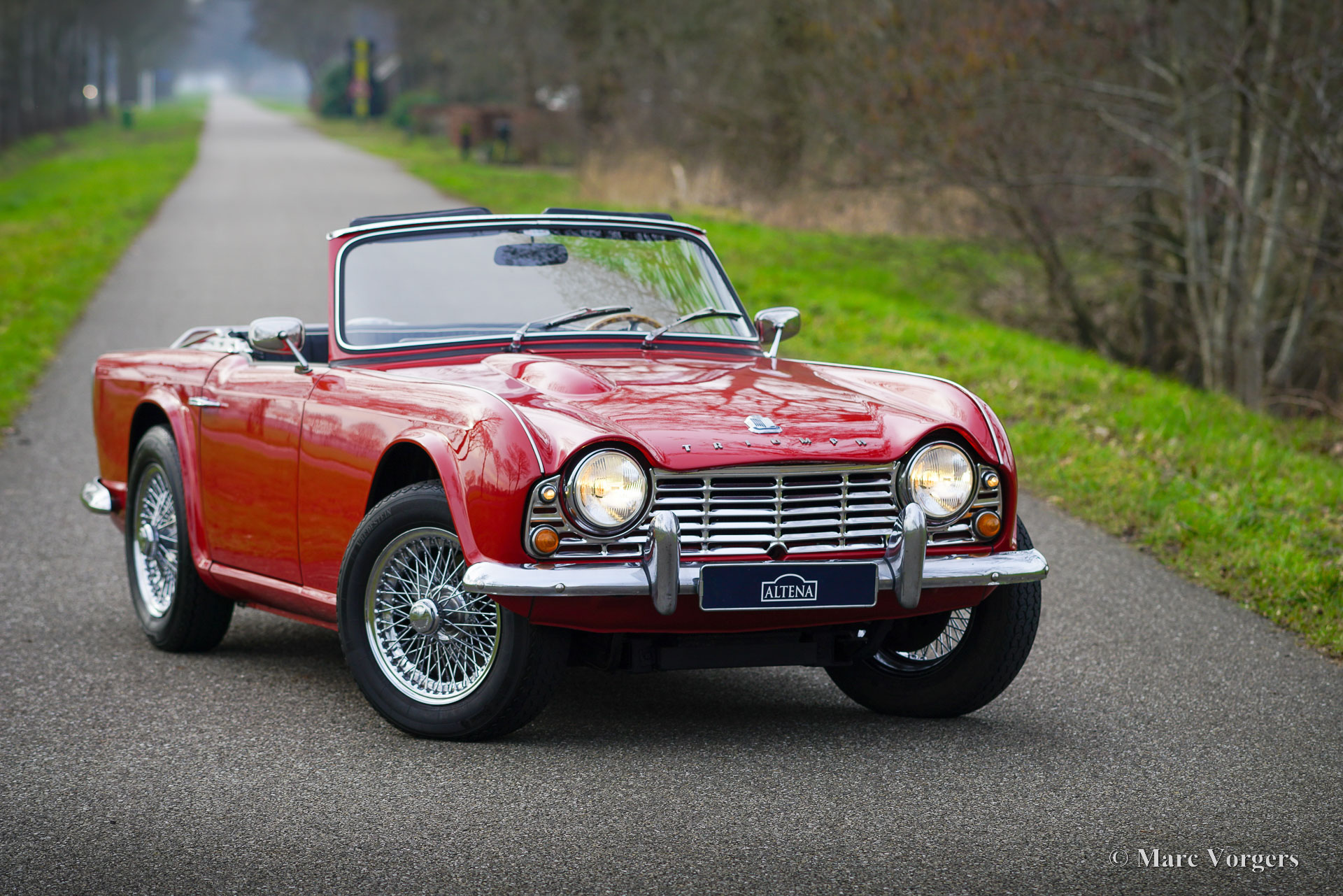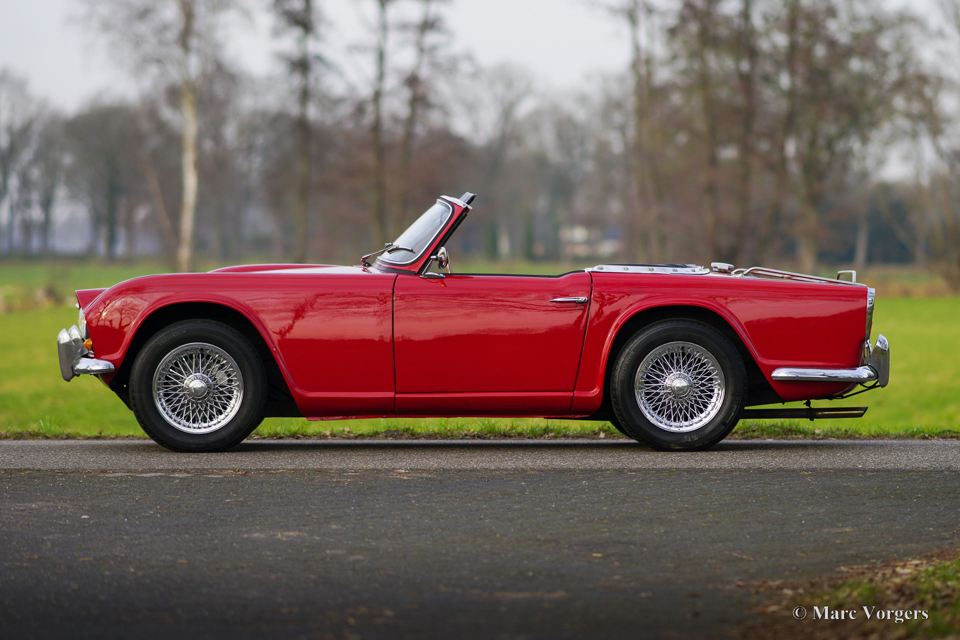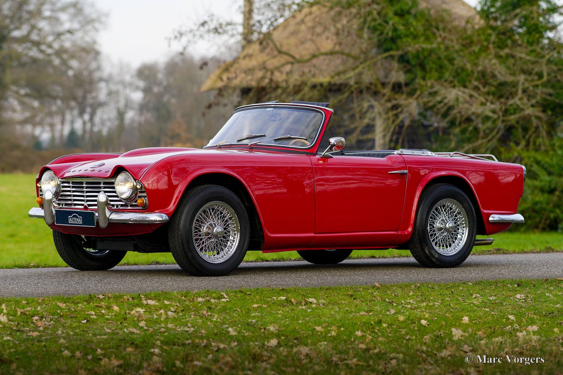 Triumph TR 4, jaar 1964. Kleur rood gecombineerd met een zwart kunstleren interieur afgewerkt met witte biezen en zwart tapijt. Zwarte soft top. Deze prachtige Triumph TR 4 is nieuw verkocht in de USA. De automobiel is in 1990 in Nederland geïmporteerd. Van 1990 tot 2023 heeft de auto slechts één eigenaar gekend! Dat is vrij uniek en garandeert dat de auto veel liefde en zorg heeft gekregen. De auto is in het jaar 2015 perfect opnieuw gespoten. Door de jaren heen is deze TR 4 zeer goed onderhouden, de auto verkeert van binnen en van buiten in zeer goede tot excellente staat! De automobiel is voorzien van chromen spaakwielen met Vredestein 165/15 banden, een aluminium cilinderkop, een MotoLita stuur met houten rand (het originele stuur is ook aanwezig), S.U.-carburateurs en een roestvrijstalen bagagerek. De auto wordt geleverd met een compleet historiedossier en (service)facturen. Deze Triumph TR 4 rijdt en stuurt voortreffelijk en zal de nieuwe eigenaar veel rijplezier bezorgen. De auto is klaar om te genieten van een vroeg voorjaar en een heerlijke zomer in je eigen Triumph met de kap omlaag!