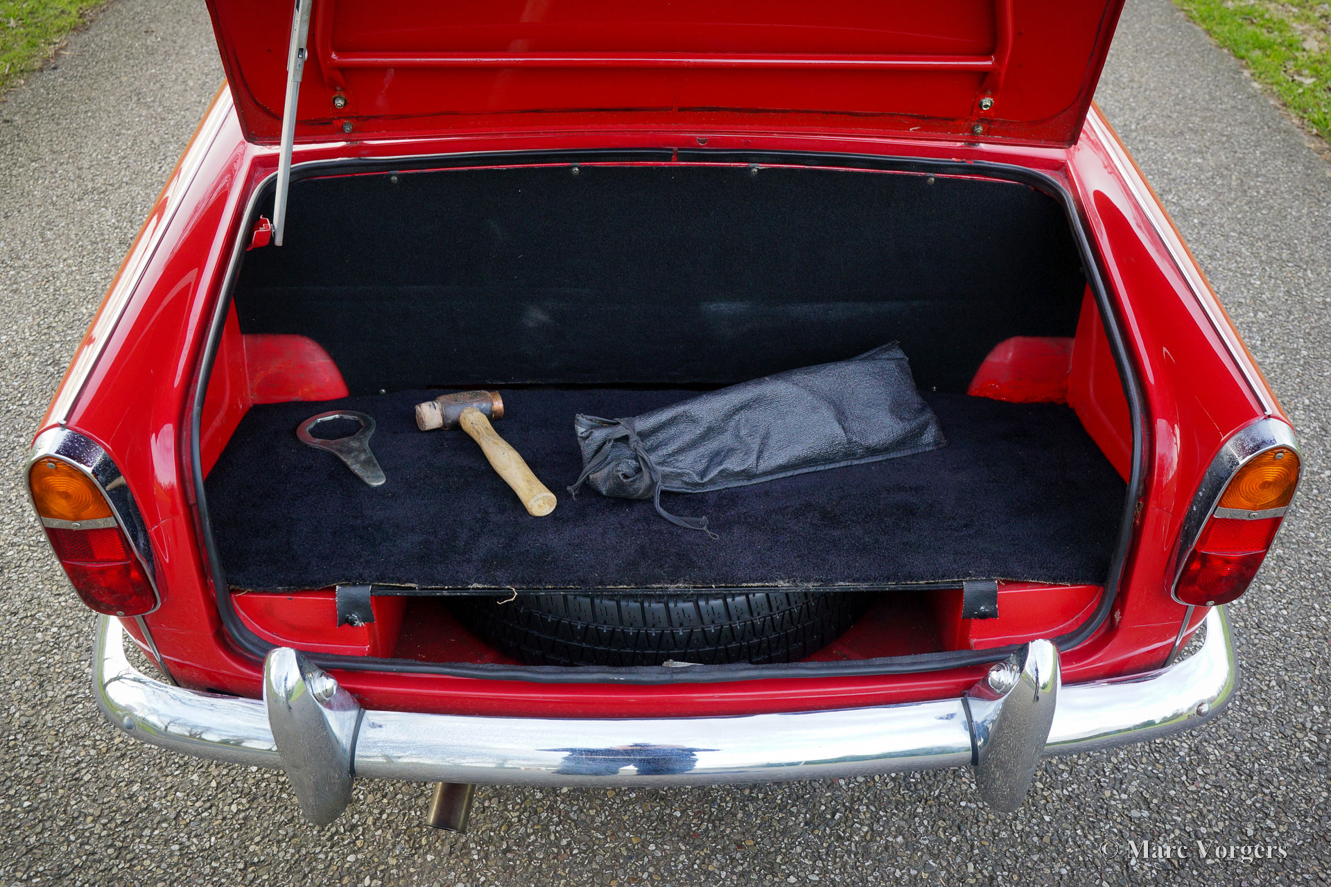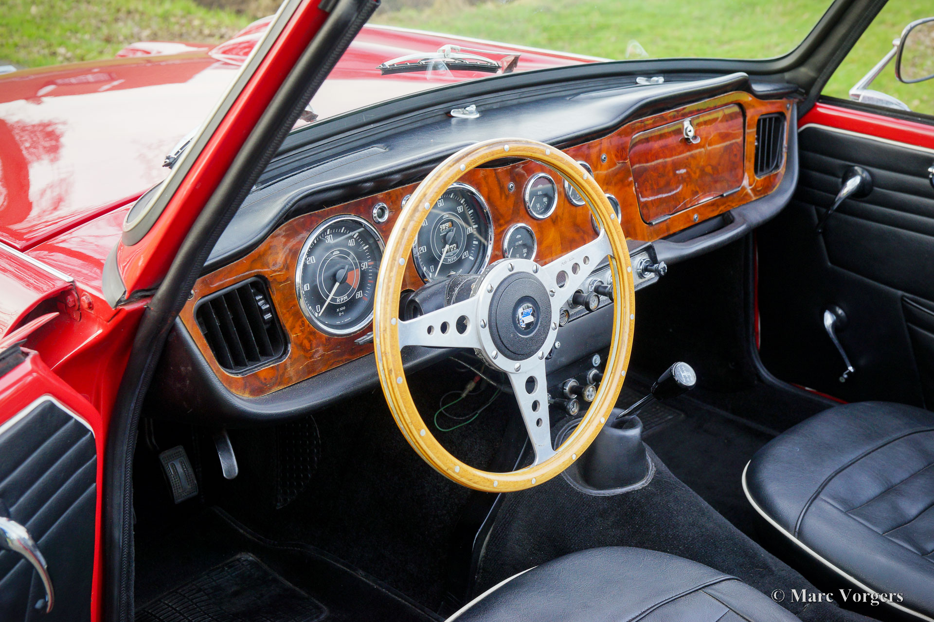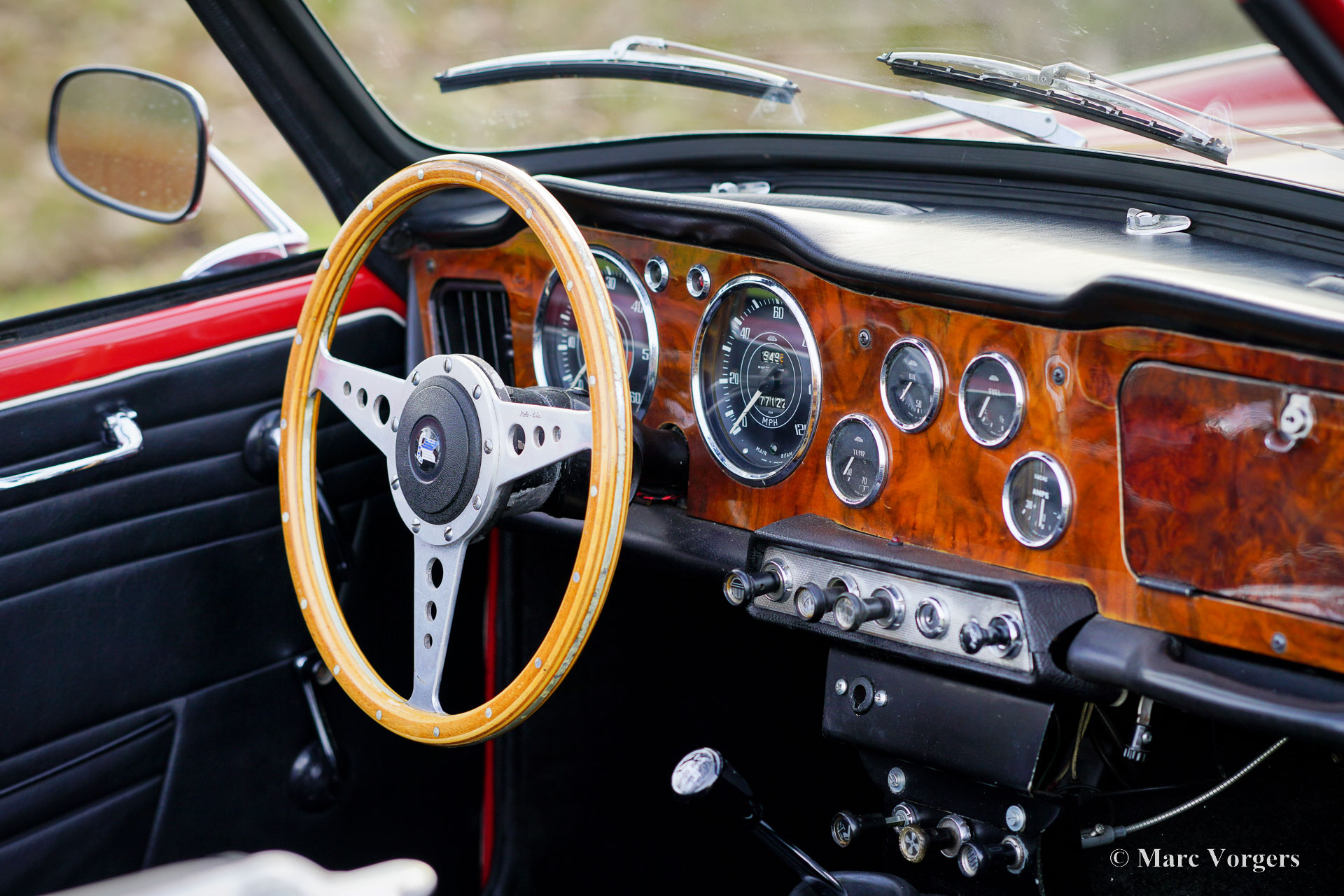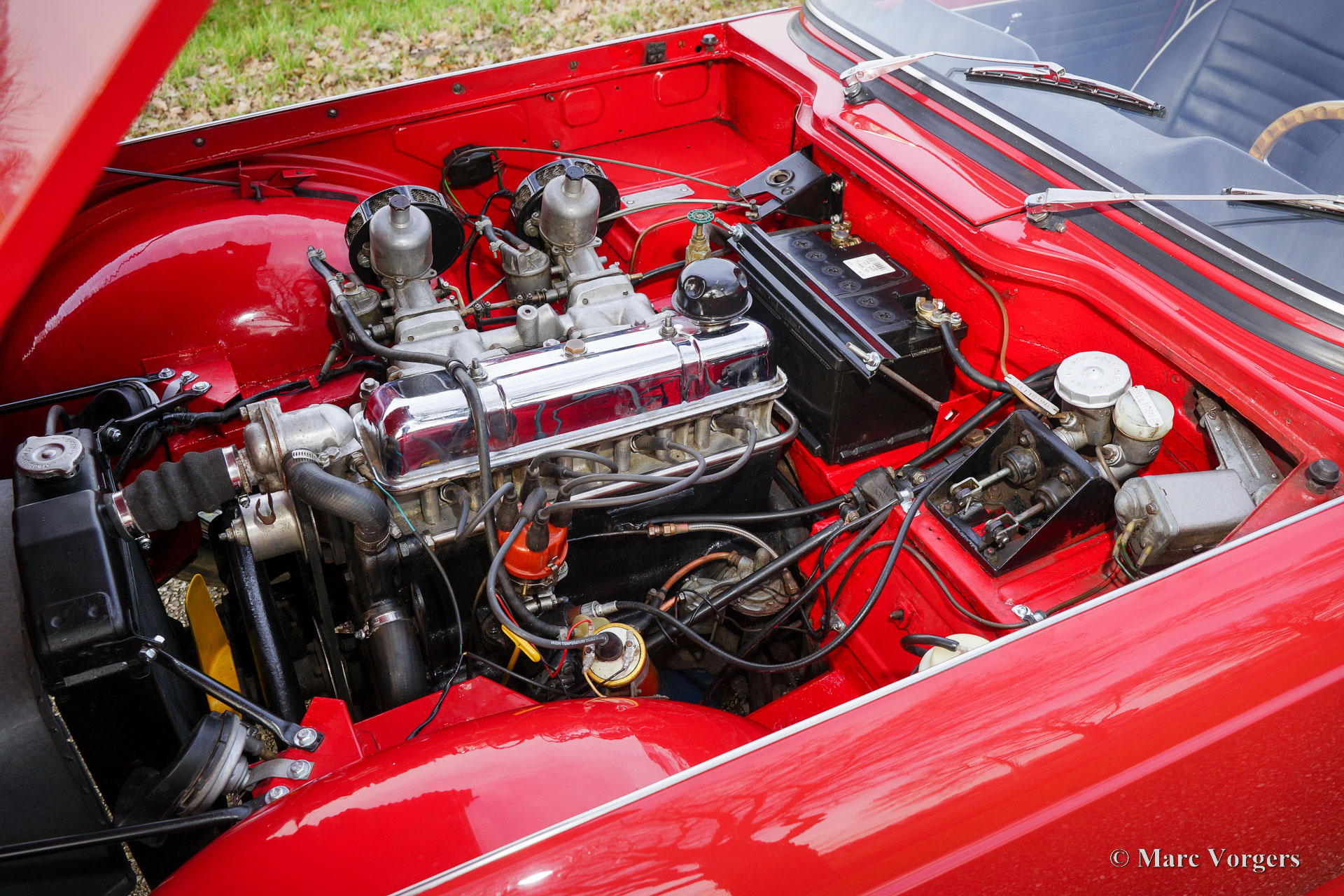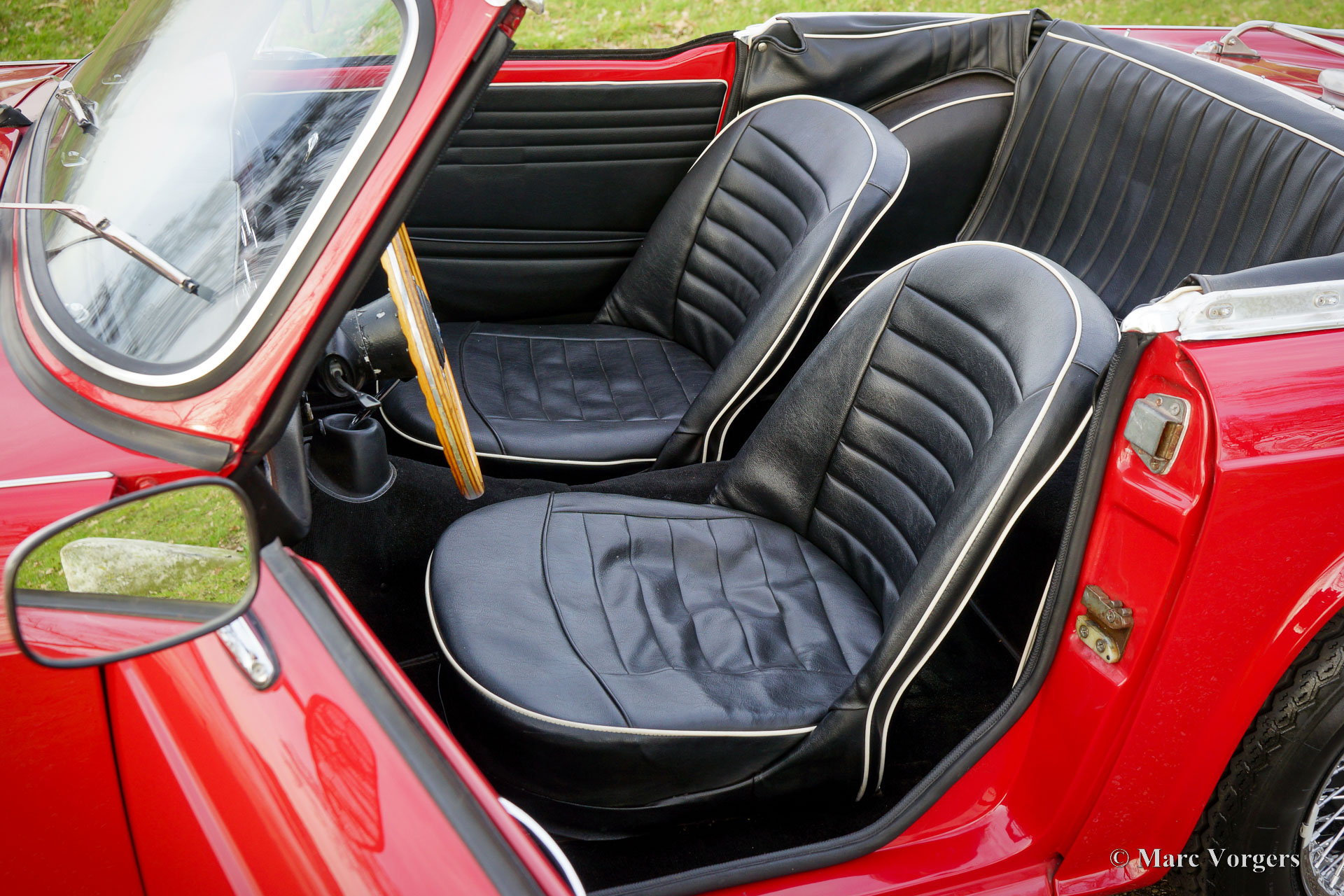 Triumph TR 4, jaar 1964. Kleur rood gecombineerd met een zwart kunstleren interieur afgewerkt met witte biezen en zwart tapijt. Zwarte soft top. Deze prachtige Triumph TR 4 is nieuw verkocht in de USA. De automobiel is in 1990 in Nederland geïmporteerd. Van 1990 tot 2023 heeft de auto slechts één eigenaar gekend! Dat is vrij uniek en garandeert dat de auto veel liefde en zorg heeft gekregen. De auto is in het jaar 2015 perfect opnieuw gespoten. Door de jaren heen is deze TR 4 zeer goed onderhouden, de auto verkeert van binnen en van buiten in zeer goede tot excellente staat! De automobiel is voorzien van chromen spaakwielen met Vredestein 165/15 banden, een aluminium cilinderkop, een MotoLita stuur met houten rand (het originele stuur is ook aanwezig), S.U.-carburateurs en een roestvrijstalen bagagerek. De auto wordt geleverd met een compleet historiedossier en (service)facturen. Deze Triumph TR 4 rijdt en stuurt voortreffelijk en zal de nieuwe eigenaar veel rijplezier bezorgen. De auto is klaar om te genieten van een vroeg voorjaar en een heerlijke zomer in je eigen Triumph met de kap omlaag!