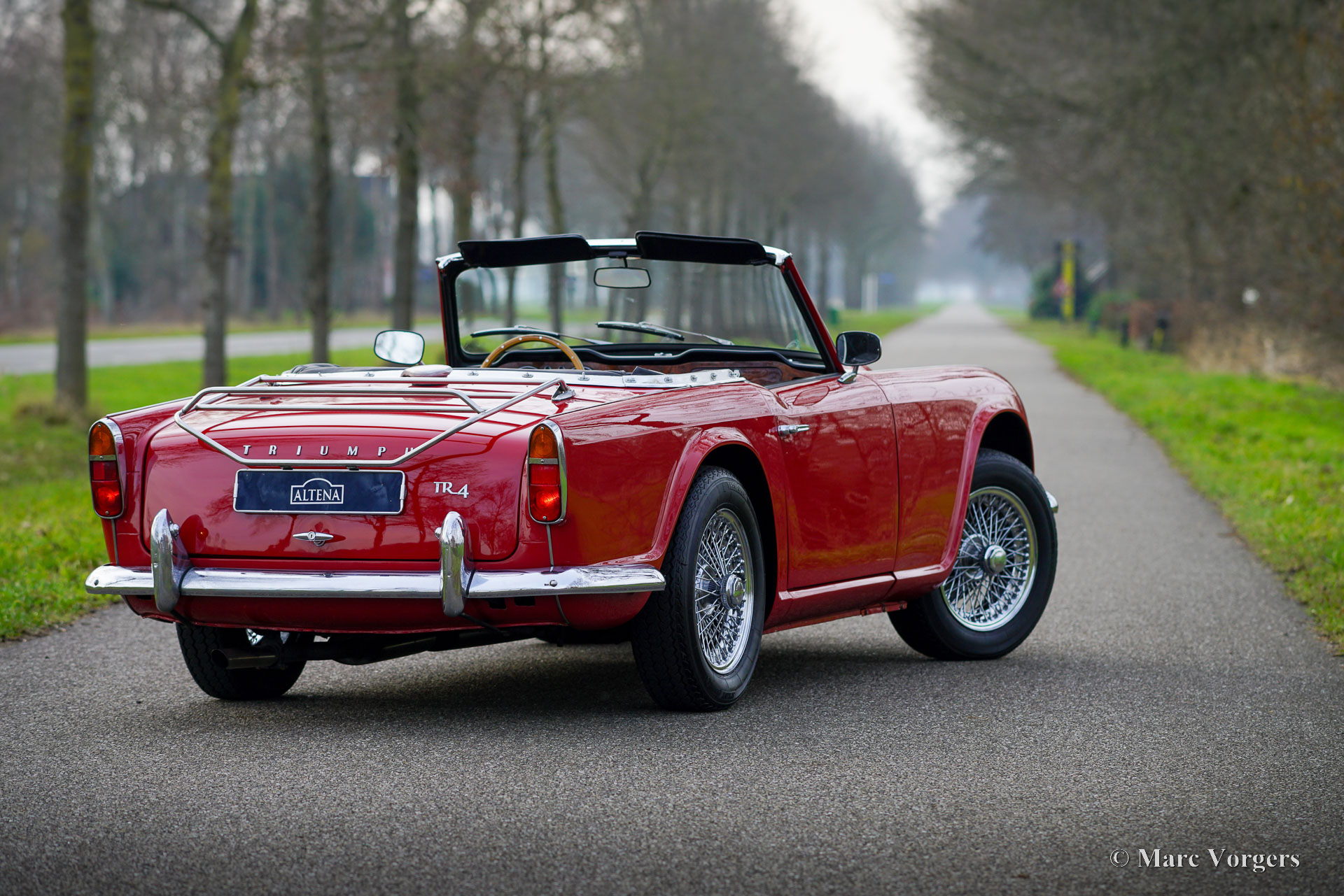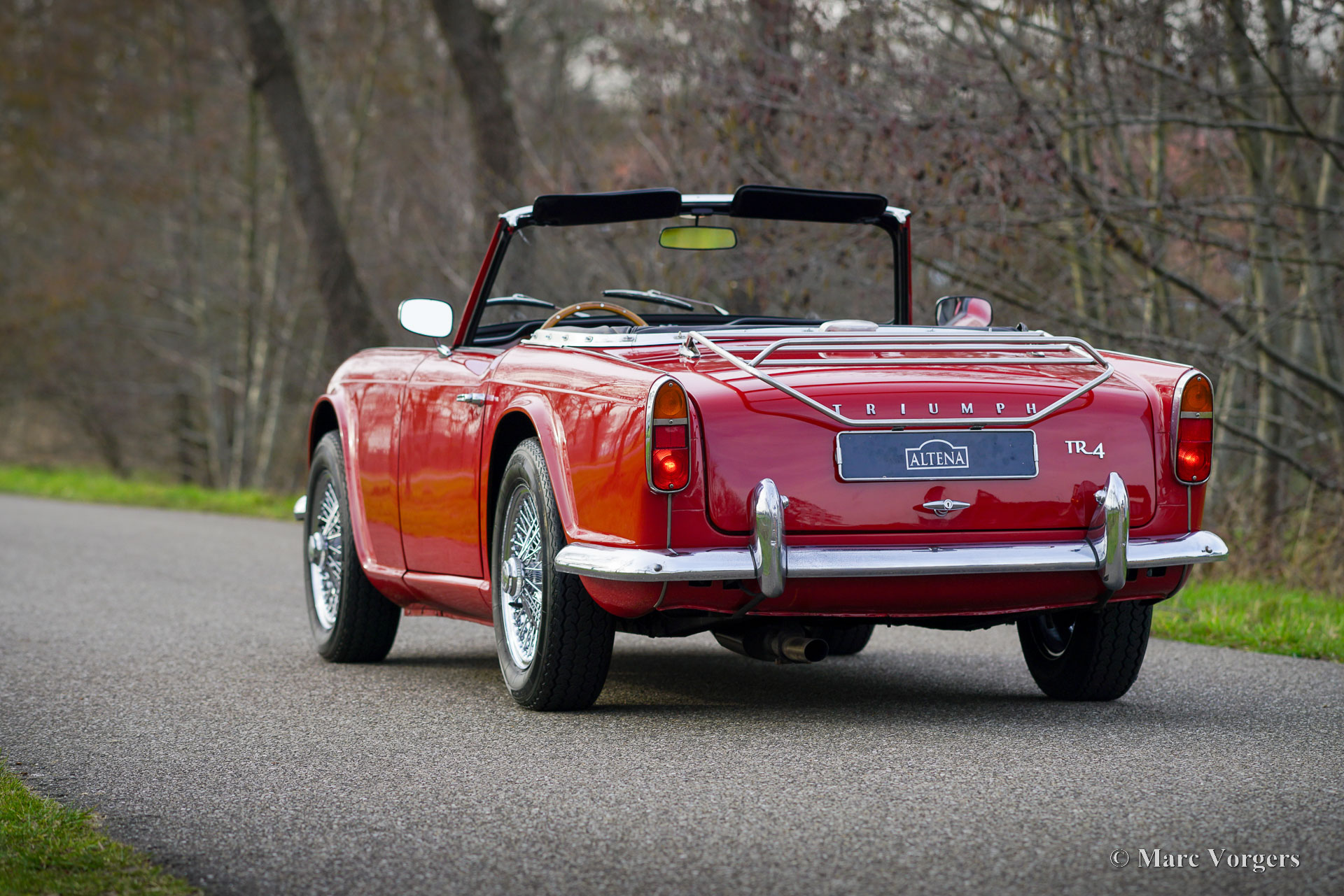 De Triumph TR 4 is de opvolger van de Triumph TR 3. Deze door Michelotti vormgegeven Triumph kwam in 1961 op de markt. De Triumph TR 4is een rasechte roadster zoals deze allen in Engeland gemaakt konden worden, recht door zee, puur en zeer sportief! De TR 4 beschikt over een stevig chassis, onafhankelijke voorwielophanging en een starre as achter. (De IRS versies beschikken over onafhankelijke wielophanging achter). Op de voorwielen zijn schijfremmen gemonteerd en op de achterwielen trommelremmen. Op de motorkap is een fraaie "powerbulge" te zien die plaats biedt aan de twee carburateurs. De TR 4 beschikt over een zeer fraai en overzichtelijk houten dashboard met grote, duidelijk afleesbare klokken dat klassieke sportiviteit ademt. Als accessoire is voor de TR 4 de zeer fraaie "Surrey-top" verkrijgbaar. Deze "Surrey-top" inspireerde Porsche tot het bouwen van haar "Targa" uitvoeringen.