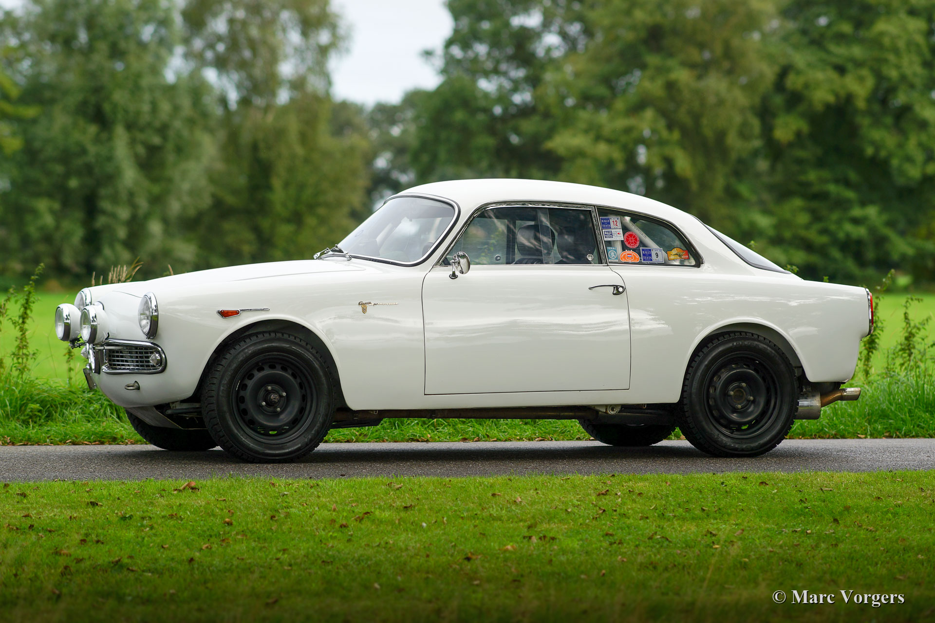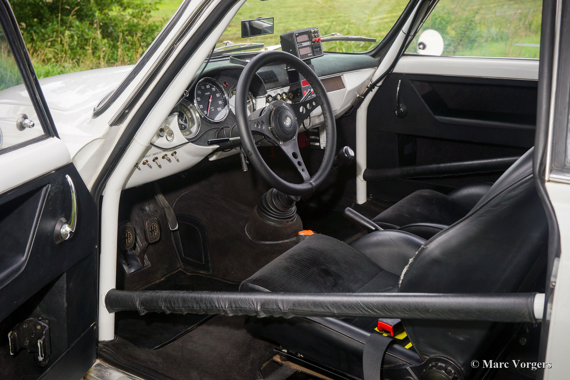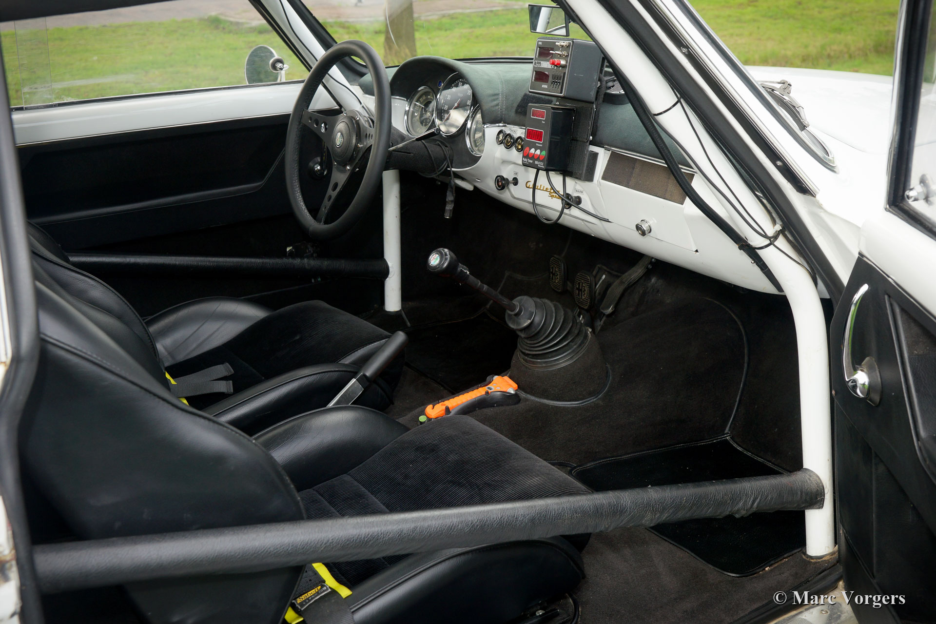 Alfa Romeo Giulietta Sprint Veloce, jaar 1959. Kleur wit (Bianco Sardenia), zwarte wielen en een zwart rally interieur met een donkergrijs alcantara bekleed dashboard. Deze prachtige Alfa Romeo Giulietta Sprint Veloce werd gebouwd op 30 juli 1959. Op 1 augustus werd de auto afgeleverd bij de eerste eigenaar in Brescia, Italië. Vervolgens werd de Alfa Romeo naar Nederland geëxporteerd, waar de auto werd uitvoerig werd gerestaureerd, gereviseerd en geprepareerd voor historische (lange afstand) rallyevenementen. In het jaar 2010 vond deze fantastische Giulietta Sprint Veloce een nieuwe eigenaar in Zweden. De auto is nog altijd geregistreerd in Zweden. Deze prachtige rallyauto is voorzien van een volledige rolkooi, oliecarter en benzinetank-beschermplaten, een aluminium radiator, een speciale roestvrijstalen uitlaat, een oliekoeler, extra benzinepomp, sperdifferentieel, sleepoog aan de voor- en achterzijde, speciale rallystoelen, vierpunts veiligheidsgordels, Tripmaster, extra interieurlampen en extra verstralers en mistlampen de voorzijde. De auto wordt compleet geleverd met een FIVA-identiteitskaart. Onlangs heeft de auto met succes deelgenomen aan een langeafstandsevenement door Afrika. Natuurlijk is de auto nadien weer volledig nagezien en geserviced. De auto wordt geleverd met veel originele onderdelen: motor, ophanging, benzinetank, achteras en uitlaat. Dit is een indrukwekkende en fraaie historische rallyauto!