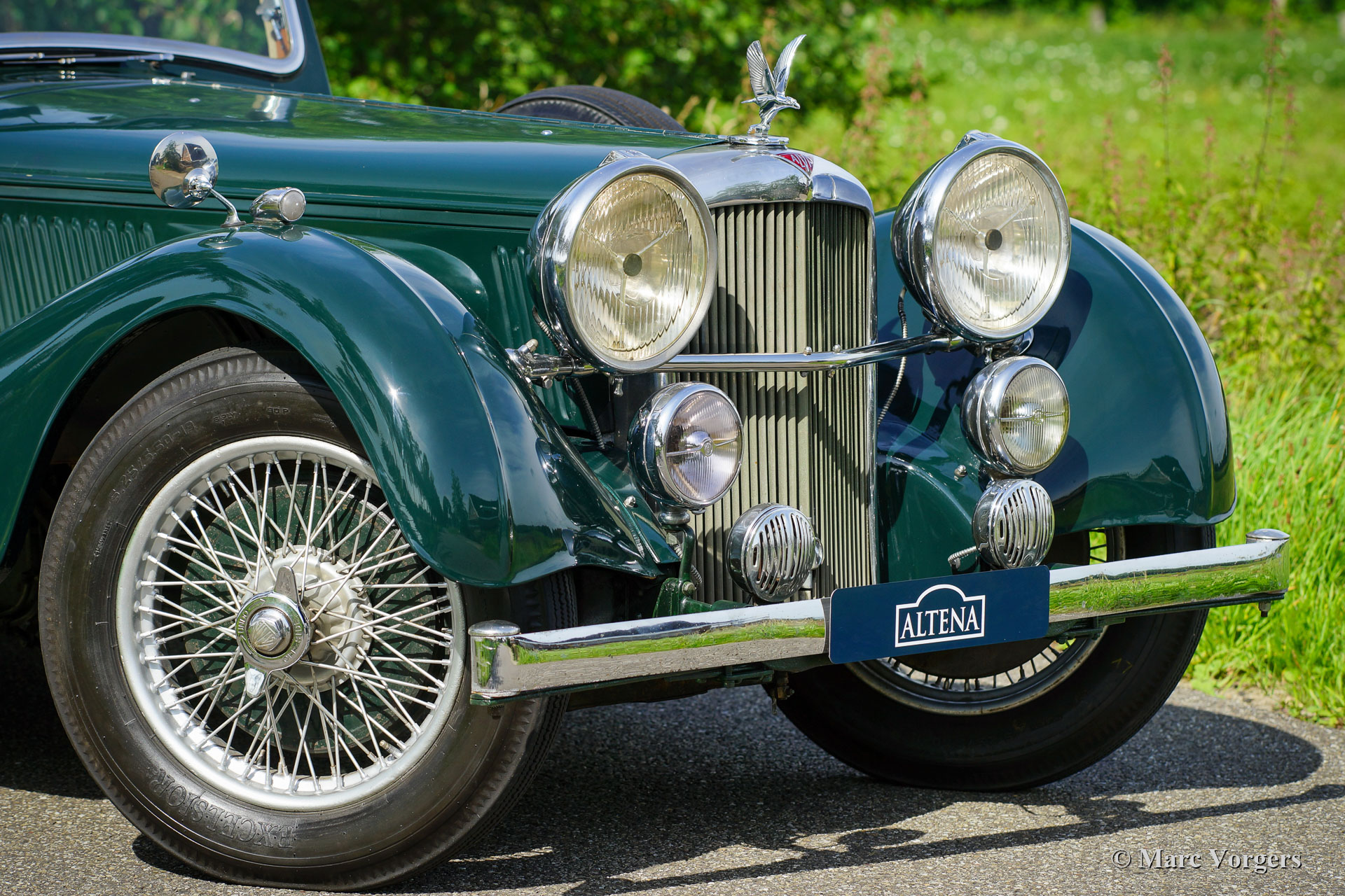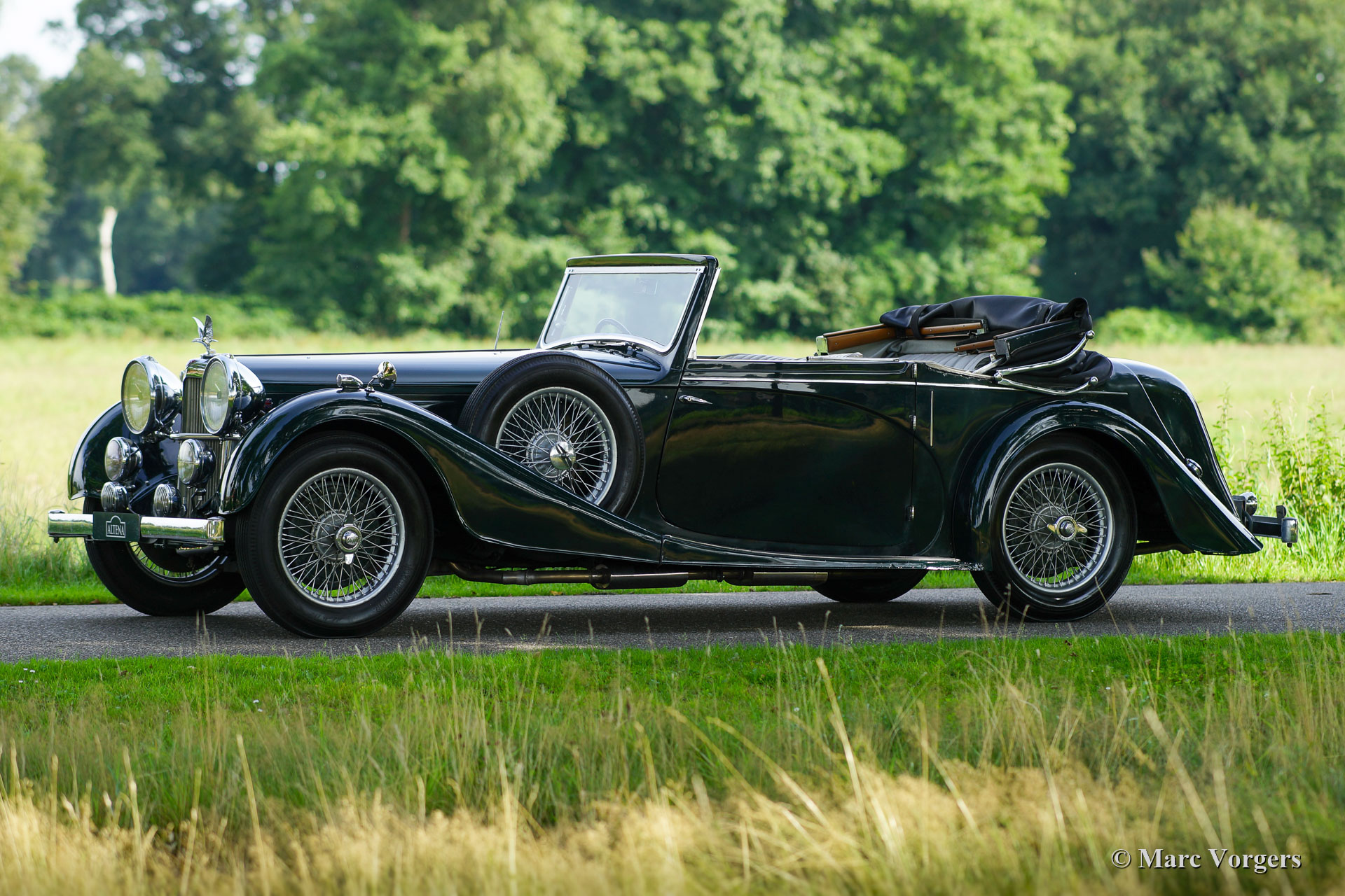 Alvis Speed 25 SC Charlesworth Drop Head Coupe, jaar 1938. Kleur groen gecombineerd met een magnolia (lichtbeige) lederen interieur en beige tapijt. Zwarte vinyl kap met drie standen. Deze stijlvolle Alvis Speed 25 SC werd nieuw verkocht in het Verenigd Koninkrijk. De laatste Britse eigenaar heeft ruim 25 jaar van de auto genoten voordat de auto een nieuw thuis vond in Nederland. De Alvis wordt geleverd met een compleet historiebestand, alle vorige eigenaren zijn bekend. Deze Alvis Speed 25 SC verkeert in een super originele conditie en de auto vertoont duidelijke gebruiks- en ouderdomssporen (patina) die bijdragen aan het vooroorlogse karakter. De Alvis is door de jaren heen goed onderhouden door Alvis liefhebbers en specialisten. Documenten en facturen van service en reparaties zijn aanwezig. Met deze Alvis Speed 25 SC werden regelmatig langere ritten gereden; dat wordt duidelijk tijdens het rijden met deze indrukwekkende Alvis. Mechanisch werkt alles perfect. De zescilinder-lijnmotor loopt uitstekend en alle bedieningselementen werken soepel, dit is een geweldige rijdersauto. De Charlesworth carrosserie is voorzien van een kap met 3 standen die zowel gesloten, halfopen als volledig geopend kan worden gebruikt. De Alvis is momenteel geregistreerd in Nederland, deze super originele automobiel kan geëxporteerd worden naar elk land over de hele wereld. De Alvis wordt compleet geleverd met een schaarse originele verkoopbrochure uit 1938.