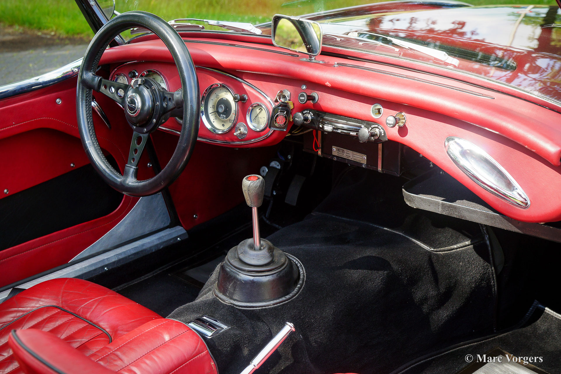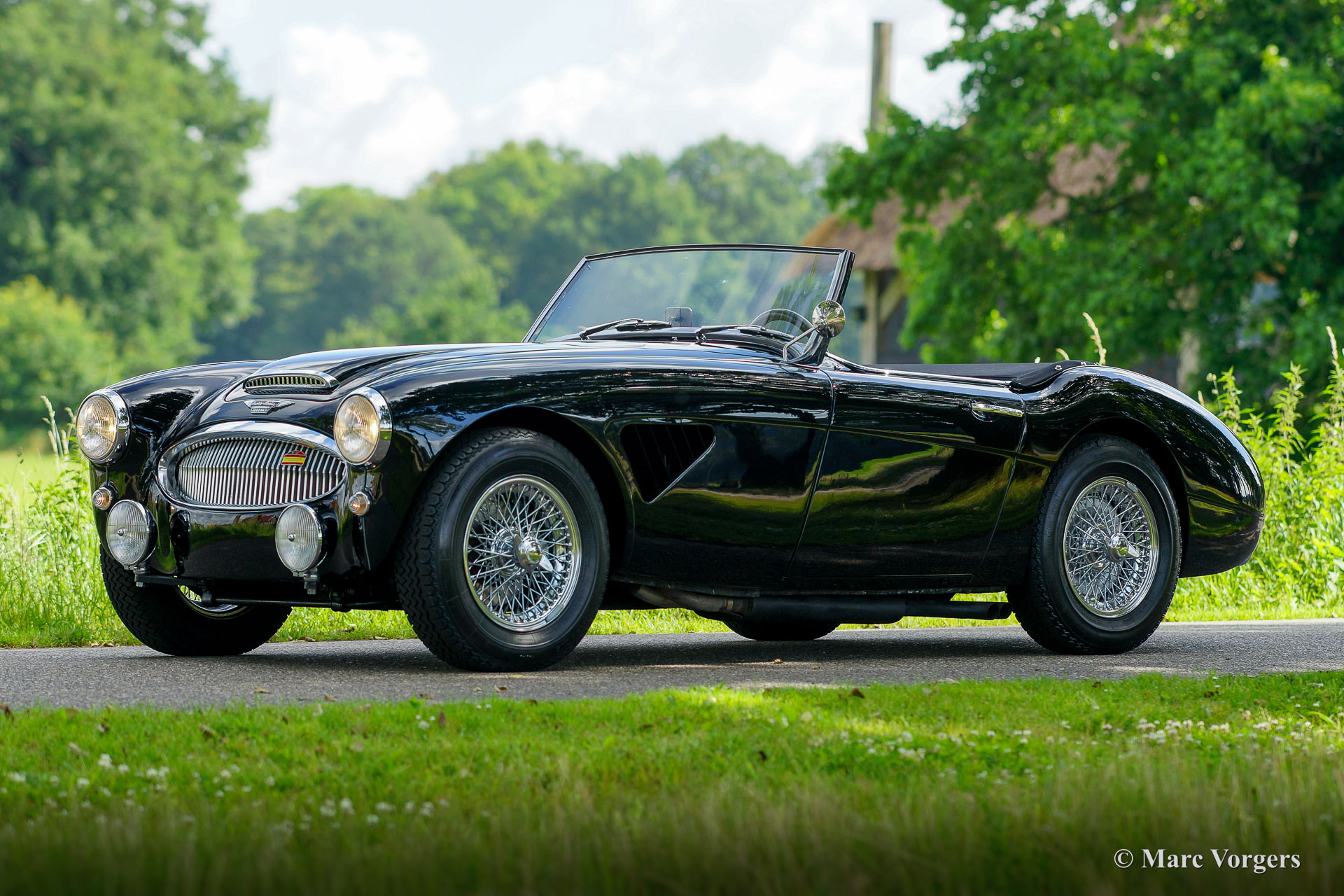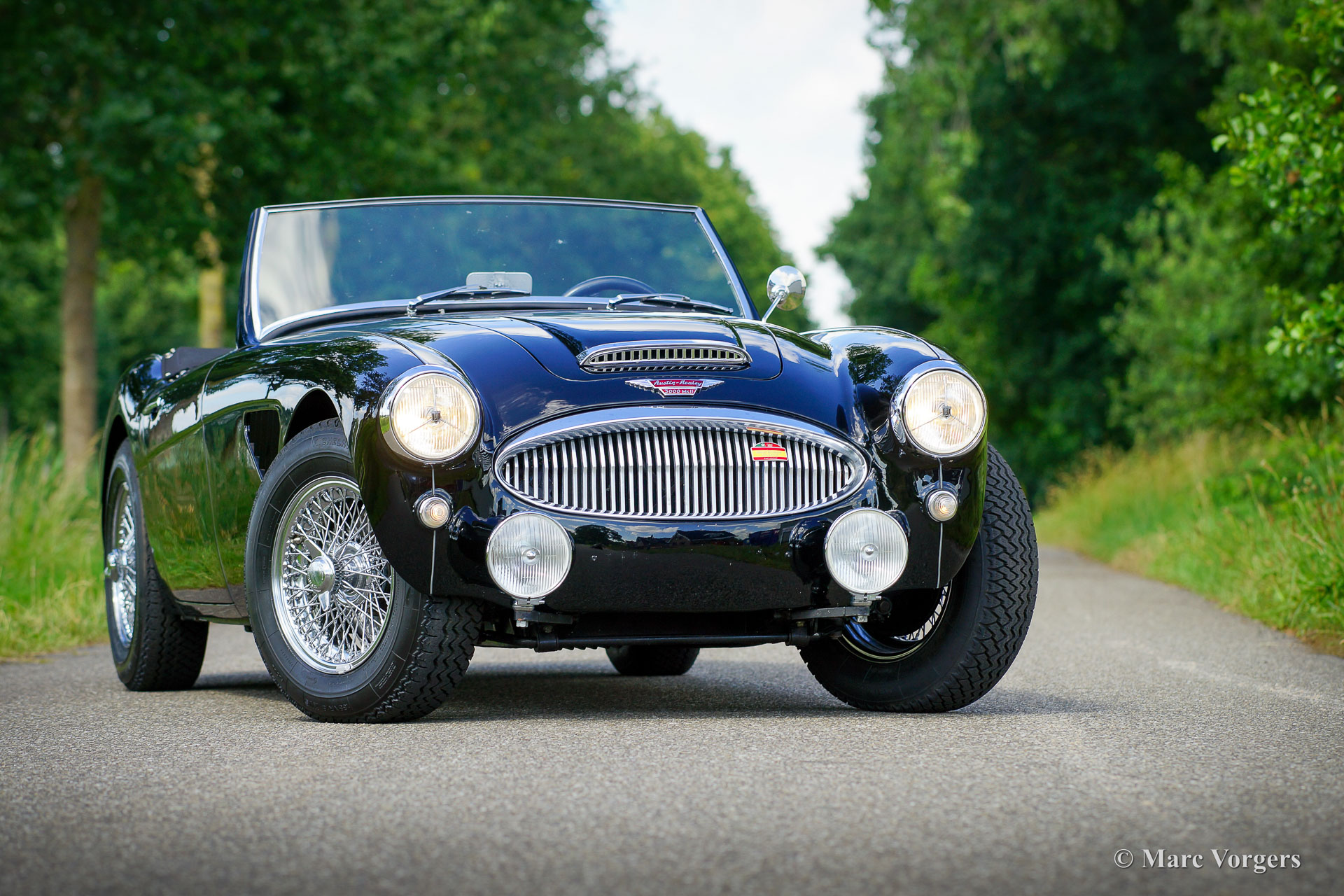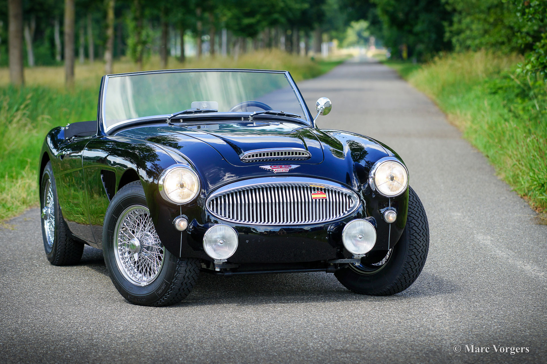 Austin Healey 3000 Mk II, jaar 1959. Kleur zwart gecombineerd met een donkerrood lederen interieur afgewerkt met zwarte biezen en zwart tapijt. Zwarte mohair soft-top, tonneau cover en hood-cover. Zijruiten met aluminium frames. Deze prachtige ‘Big Healey’ is in de periode 2013-2014 uitvoerig gerestaureerd, gereviseerd en getuned door Denis Welch in het Verenigd Koninkrijk. De restauratie is uitgevoerd in opdracht van de huidige eigenaar. De firma Denis Welch is een gerenommeerde Austin Healey-specialist, ook bekend om hun Austin Healey-rallyconversies. Deze prachtige Austin Healey 3000 Mk II is prachtig gerestaureerd, een fotoreportage en facturen van de restauratie zijn aanwezig. De restauratie- en revisiekosten overschreden de € 100.000. De krachtige 3-liter motor kreeg speciale upgrades en is voorzien van twee S.U. HD8 carburateurs, 123 elektronische ontsteking, een wisselstroomdynamo, Denis Welch aluminium kleppendeksel en nog veel meer. Sinds voltooiing van de restauratie heeft de auto 13.000 kilometer gereden en is de auto onderhouden door een Austin Healey specialist. Deze fraaie ‘Big Healey’ is voorzien van chromen spaakwielen, chromen ‘knock-on’ wielmoeren, grote Lucas SFT700 mistlampen/ breedstraler vóór, chromen ‘bumperettes’ achter, een zij-uitlaat, speciale louvres voor extra motorkoeling in de spatborden, een 5-versnellingsbak en een MotoLita sportstuur met lederen rand. Deze Austin Healey is een bijzonder fraai en sportief exemplaar. Een kwaliteitsexemplaar voor de Austin Healey-liefhebber!