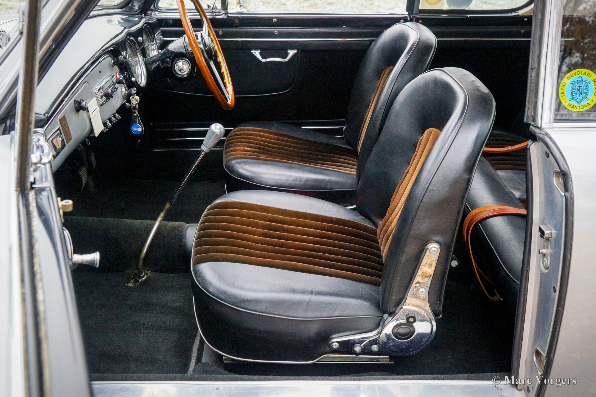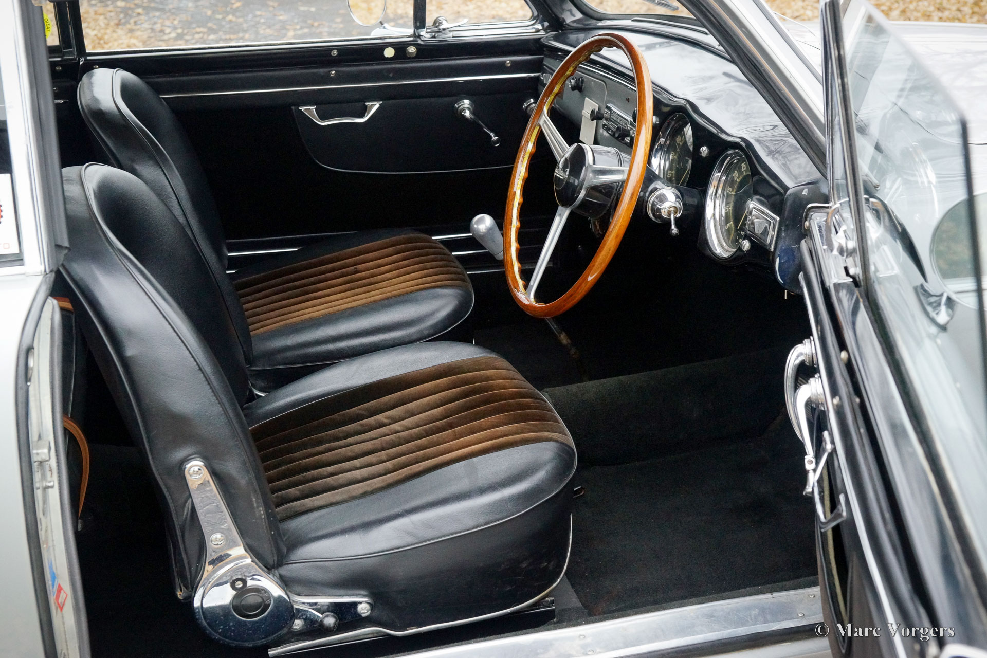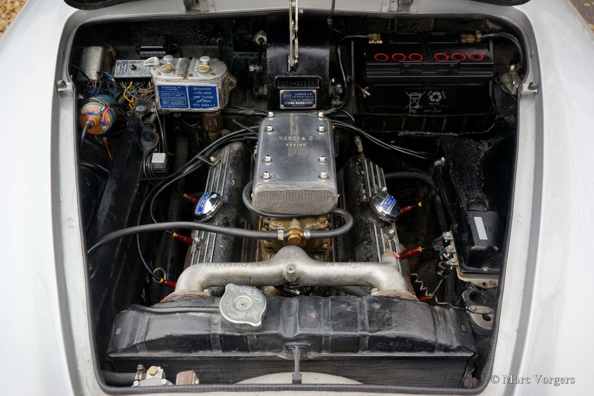Lancia Aurelia B20 GT Serie 6, 1958. Kleur zilver metallic gecombineerd met een zwart interieur. Deze fantastische rechtsgestuurde Lancia Aurelia B20 GT werd nieuw verkocht in Brussel, België, en de auto is altijd in Belgisch bezit geweest. De laatste eigenaar heeft vijftien jaar lang plezier gehad van deze prachtige automobiel. De auto is onderhouden door een Belgische Lancia specialist, de afgelopen jaren zijn onder andere de versnellingsbak en de cilinderkop gereviseerd. Deze fraaie Lancia is voorzien van een fantastisch fabriek origineel schuifdak en een uiterst speciale Nardi ‘tuning-kit’ bestaande uit een paar speciale carburateurs en een speciaal luchtfilter! Deze kit voegt extra vermogen, en nog sportievere soundtrack toe aan de lichtmetalen V6-motor. De eigenaar heeft deze sportieve Lancia gereden tijdens verschillende historische toer(rally)evenementen zoals de hedendaagse Gran Premio Nuvolari in Italië. Deze Lancia Aurelia verkeert in een goede staat, met normale gebruiks- en ouderdomssporen (patina), en de auto rijdt voortreffelijk. De Lancia Aurelia is een belangrijke en baanbrekende historische automobiel. De Aurelia heeft een zelfdragende carrosserie zonder afzonderlijk chassis en een ‘transaxle’ versnellingsbak (met geïntegreerde koppeling) bij de achteras om een ideale gewichtsverdeling te verkrijgen. De Aurelia staat bekend om zijn uitstekende wegligging, vanaf serie 4 werd een De Dion achteras gemonteerd, die deze eigenschappen naar een nog hoger niveau van perfectie tilde. De prachtige auto wordt geleverd met een compleet dossier en een FIVA-identiteitskaart. De originele bumpers worden bij de auto geleverd. Deze sportieve Lancia Aurelia B20 GT is uw toegangsbewijs voor vele toonaangevende internationale oldtimer-evenementen!