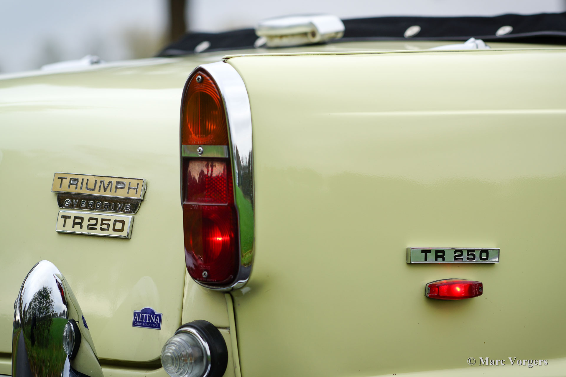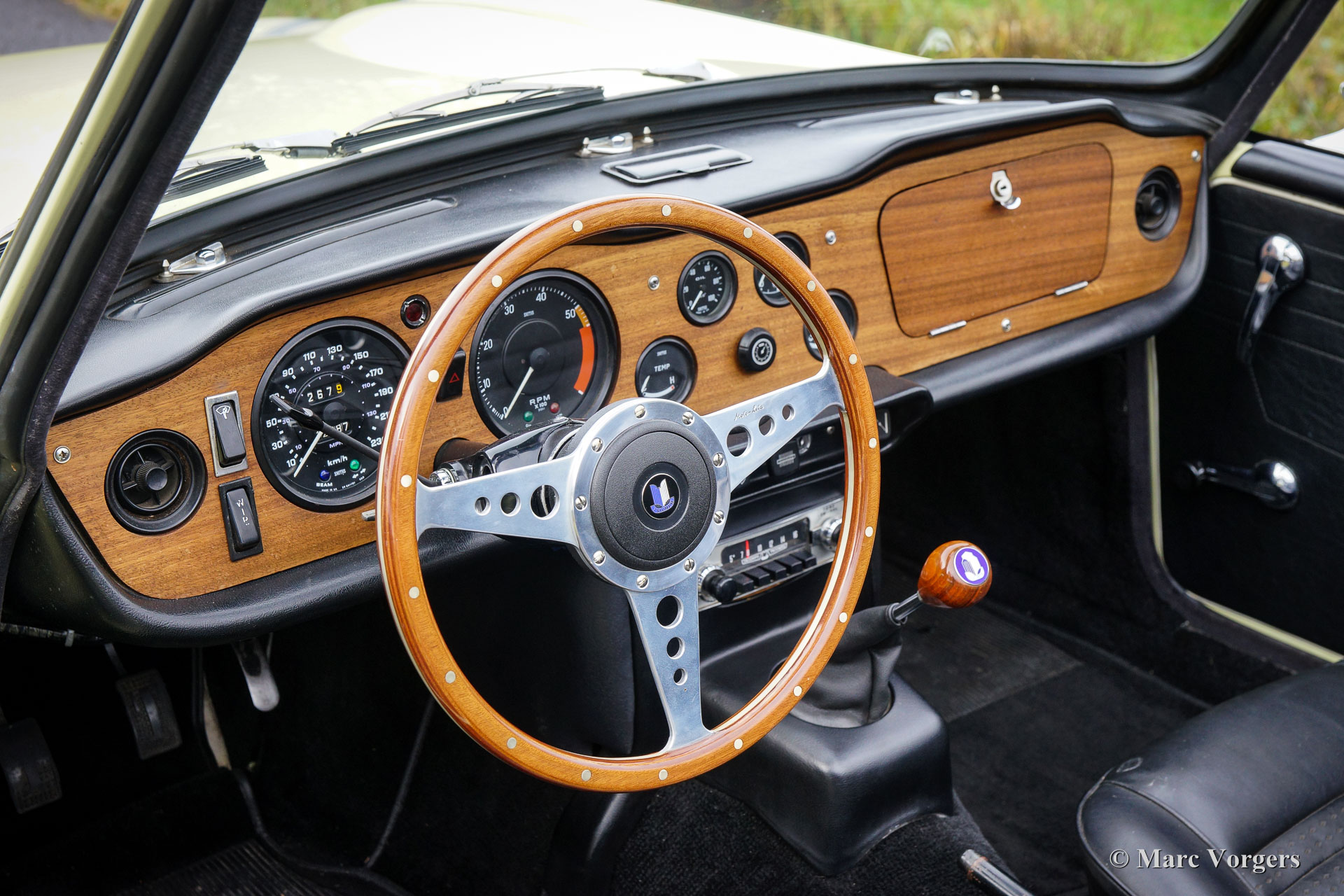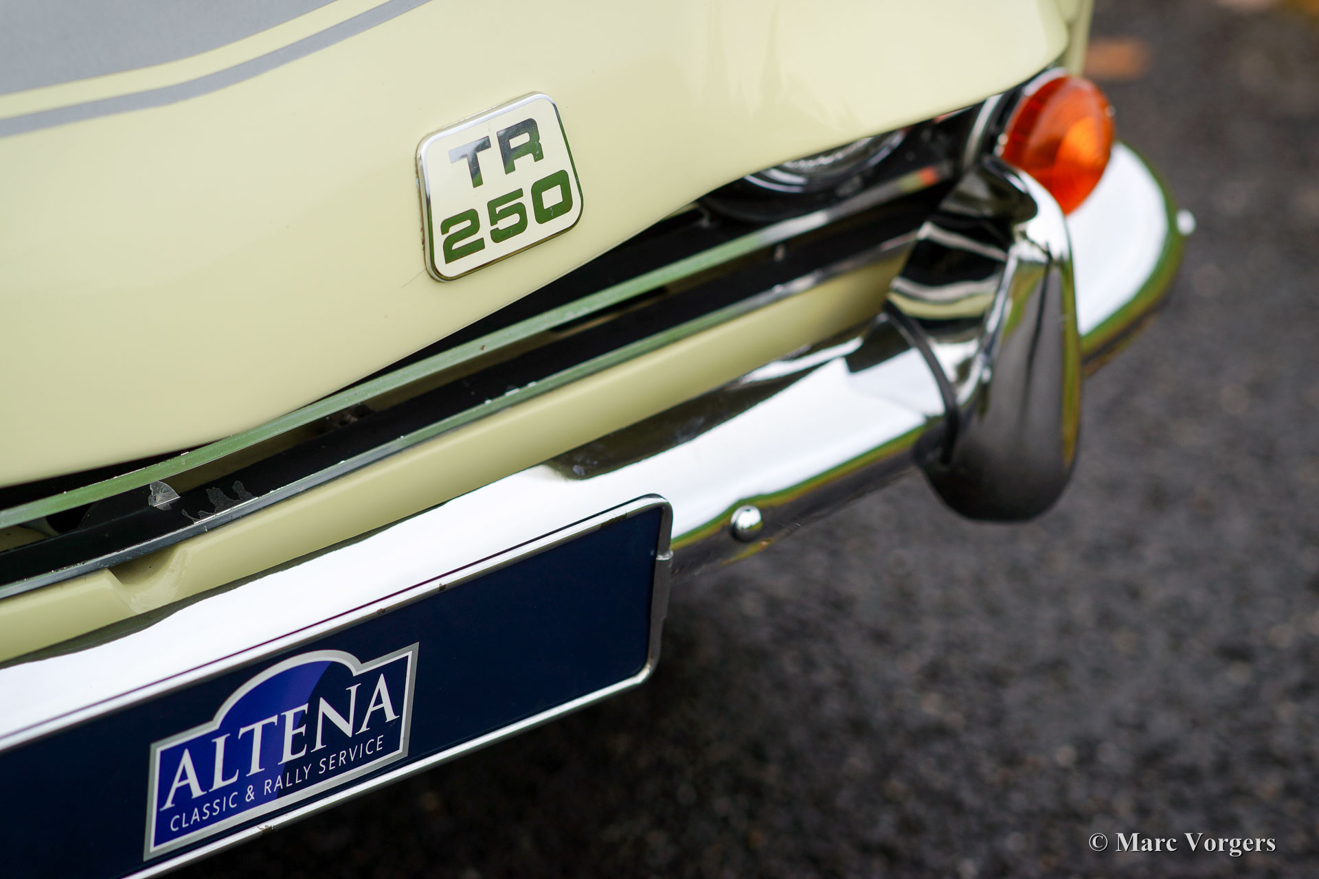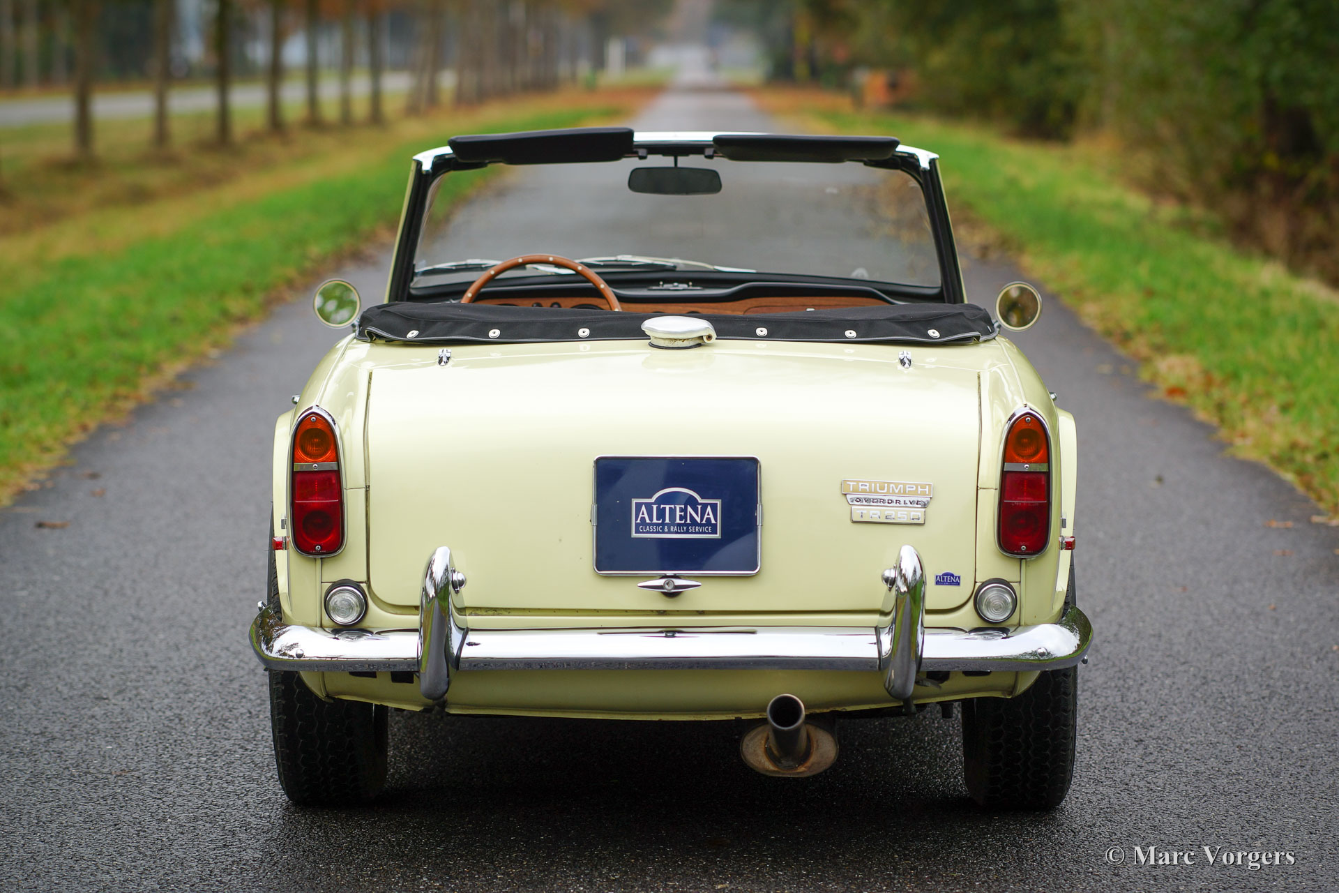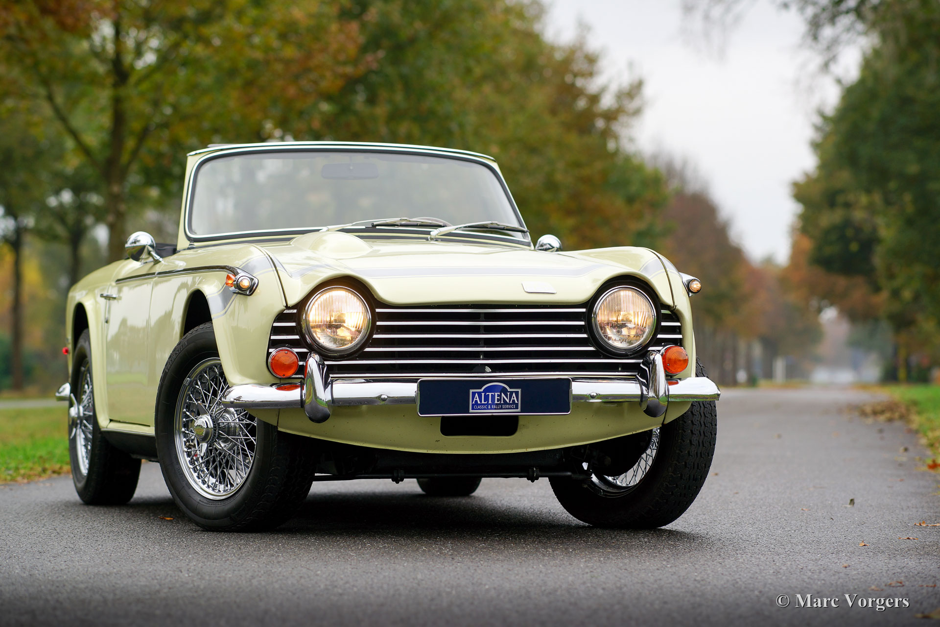 Triumph TR 250, jaar 1968. Kleur pastelgeel (Primrose Yellow) met zilver metallic motorkap ‘striping’. Een zwart kunstlederen interieur en een nieuwe zwarte soft top. Deze prachtige en relatief schaarse Triumph TR 250 verkeert in zeer goede staat en de auto rijdt perfect! De auto is voorzien van overdrive, chroom spaakwielen, sportuitlaat, K&N luchtfilters, een klassieke autoradio en een prachtig Moto-lita sportstuur met houten rand. Een prachtige en praktische Engelse roadster met een voortreffelijke zescilinder motor!