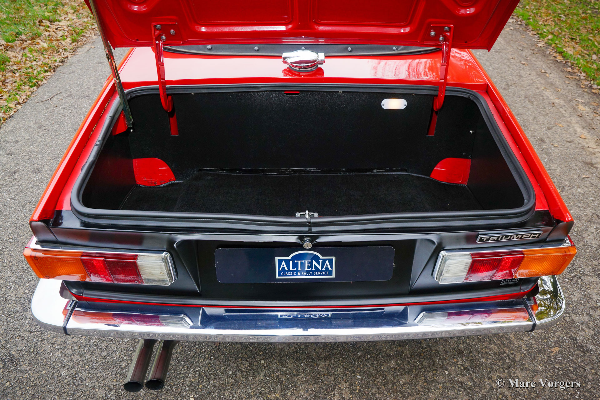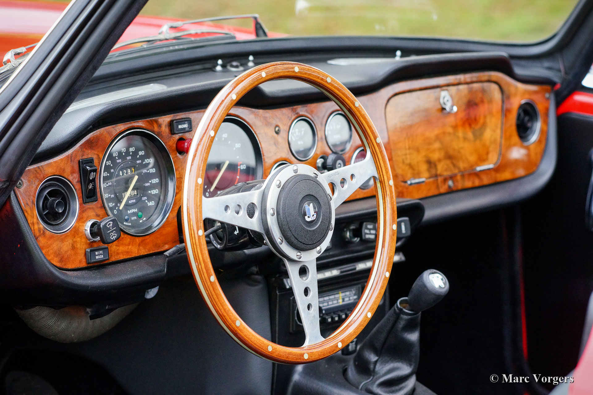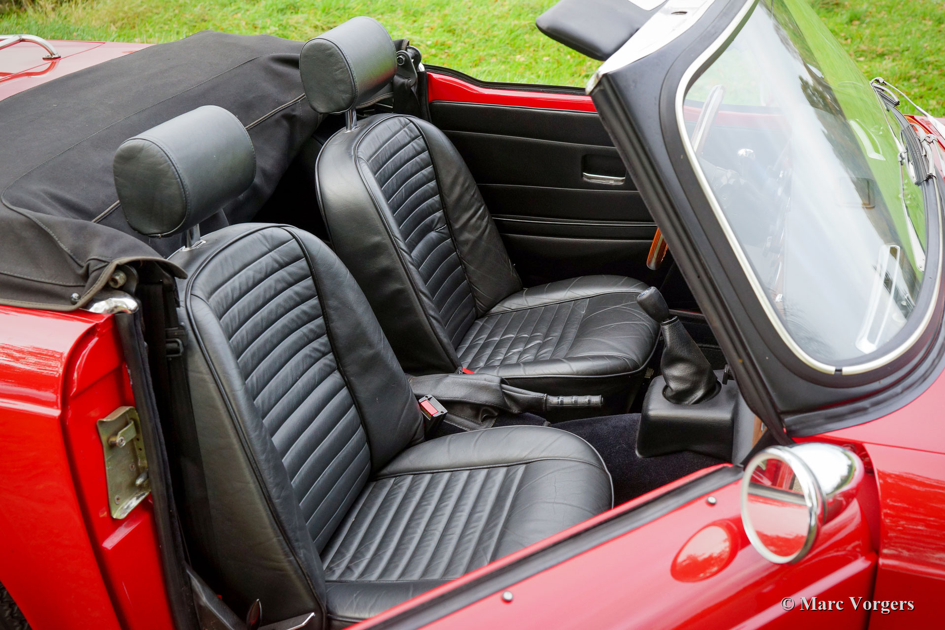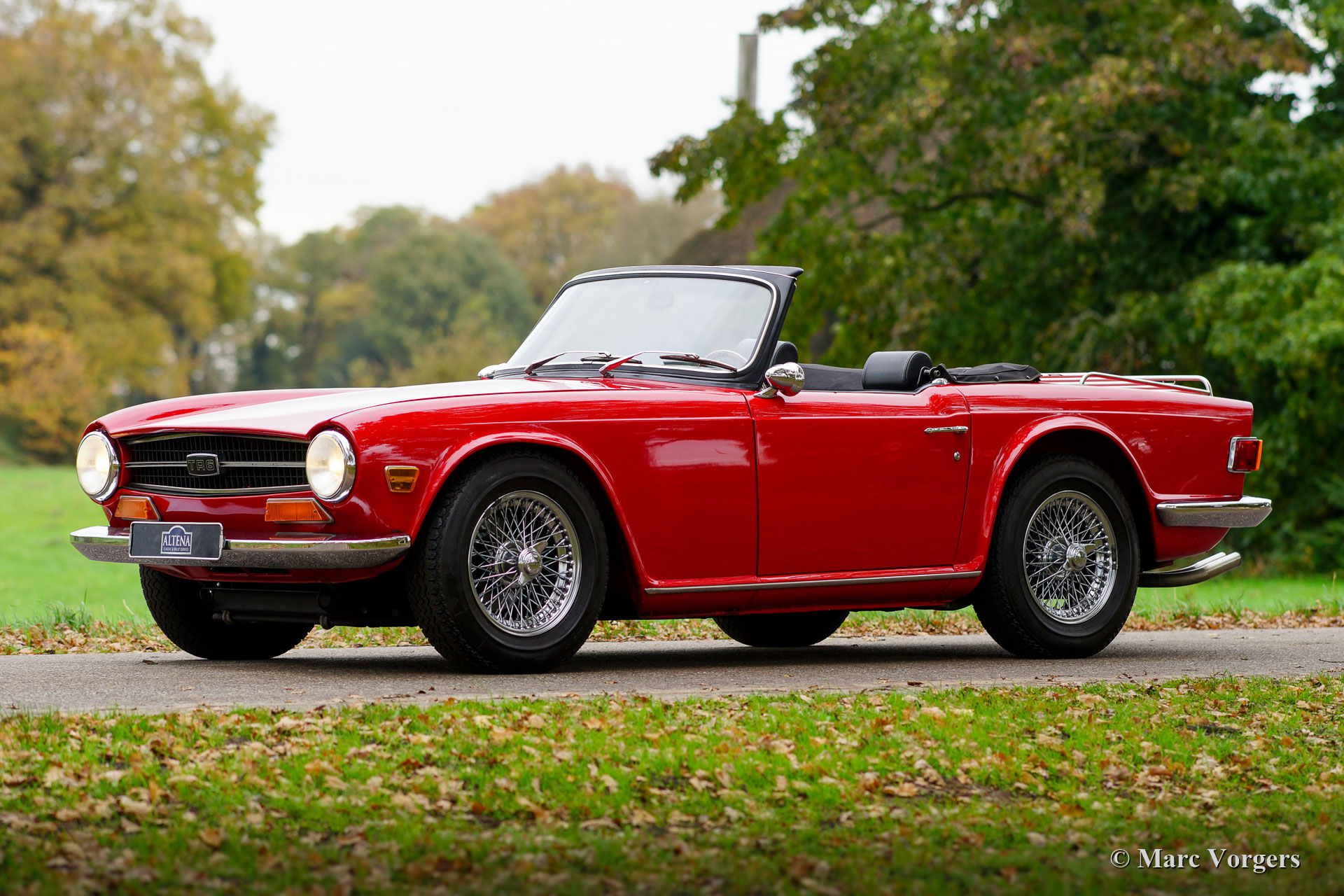 Triumph TR 6, jaar 1973. Kleur rood met een zwartlederen interieur en zwart tapijt. Zwarte mohair soft-top en kapafdekking. Deze fantastische Triumph TR 6 is eind jaren negentig in Nederland uitvoerig gerestaureerd. De auto is sindsdien perfect gekoesterd en onderhouden; deze TR 6 verkeert in een excellente conditie en de auto rijdt perfect. De zescilinder-lijnmotor loopt en klinkt geweldig! De carrosserie vertoont een mooie paneelpassingen en uitstekend lakwerk, de chroomdelen zijn schitterend, het interieur is in een fantastische conditie en de soft-top is als nieuw! De auto is voorzien van prachtige chromen spaakwielen met 185/15 Michelin banden en ‘knock-off’ wielmoeren. Verder is de auto voorzien van een notenhouten dashboard, een MotoLita stuur met houten rand, een aluminium kleppendeksel, een RVS-bagagerek en een RVS sportuitlaat. Deze TR 6 is compleet met een origineel instructieboekje. Deze mooie en kwalitatief hoogwaardige Triumph TR 6 klaar voor ieder nieuw avontuur in handen van een nieuwe eigenaar!