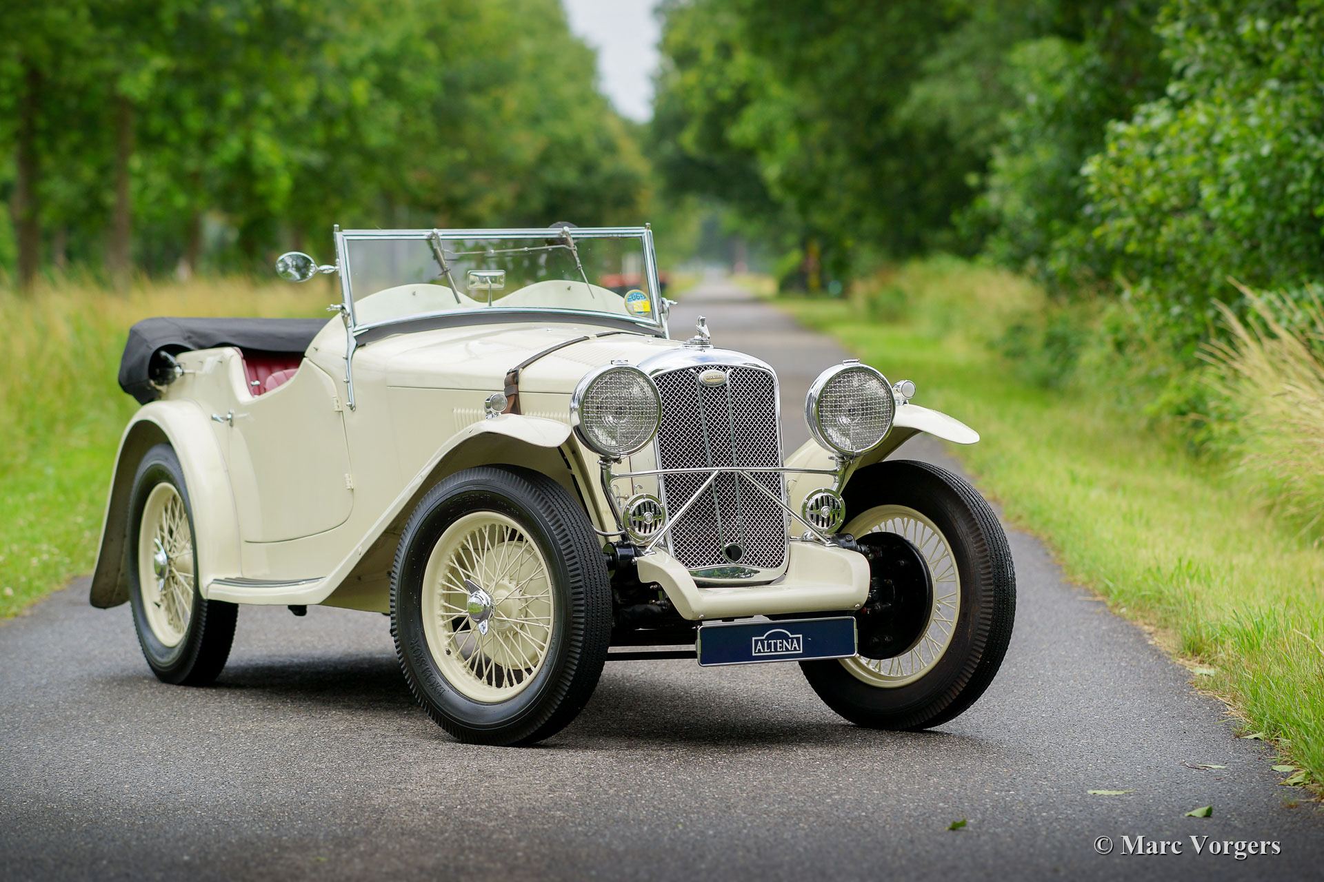 Wolseley Hornet 'Daytona' Special, jaar 1935. Kleur crème wit (Oud Engels wit) gecombineerd met een roodleren interieur en rood tapijt. Zwarte mohair kap. Deze prachtige Wolseley Hornet begon het leven als gesloten saloon; in het jaar 2009 werd de auto uitgebreid gerestaureerd in Duitsland door een merk-pecialist. Tijdens de restauratie werd de saloon-carrosserie vervangen door een oude 'Daytona' carrosserie vant Eustace Watkins (Londen, Verenigd Koninkrijk) die ook volledig werd gerestaureerd. De Hornet wordt aangedreven door de originele (gereviseerde) en zeer soepel lopende originele 1271 cc-zescilinder lijnmotor, gekoppeld aan een handgeschakelde versnellingsbak met vier versnellingen. Deze prachtige special verkeert in sublieme topstaat en de auto geeft je de speciale vooroorlogse rijervaring in overvloed! De voorruit kan worden neergeklapt, iets wat eigenaren in de jaren 1930 regelmatig deden voor een paar rondjes op het beroemde Brooklands-circuit in Engeland. Dit is een zeldzame zescilinder Wolseley Hornet en een subliem gebouwde special!
