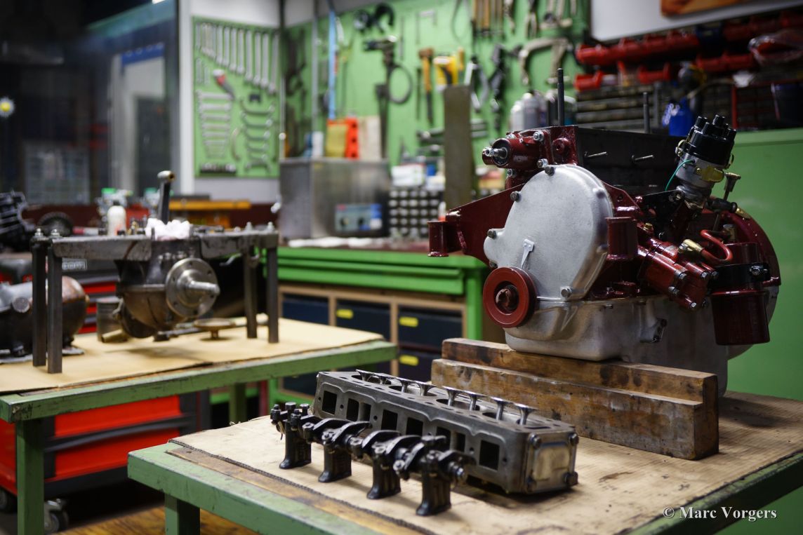 Als derde zie je een vooroorlogs zescilinder Meadows 4.5 liter motorblok van een Invica. Het motorblok wordt volledig gereviseerd. Het indrukwekkende onderblok is zichtbaar en op de foto’s wordt de cilinderkop gevlakt.
