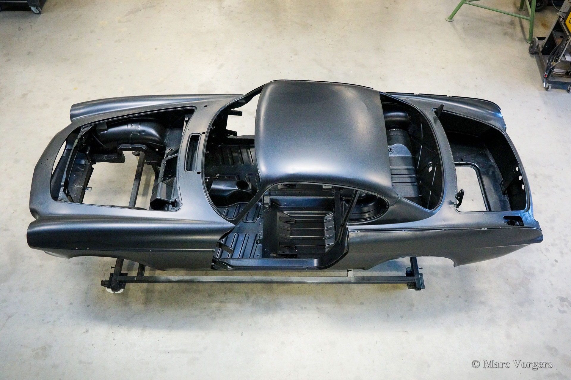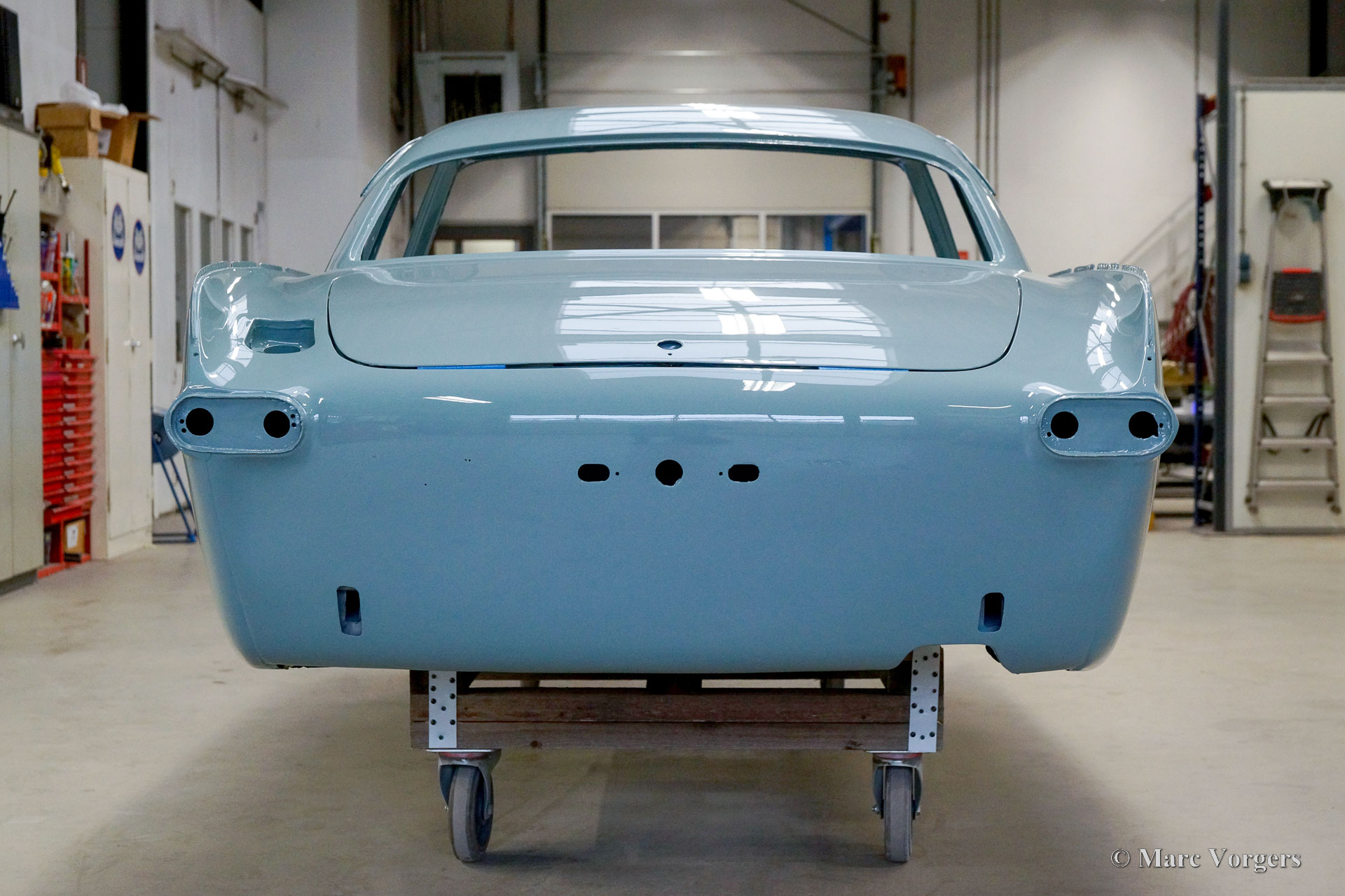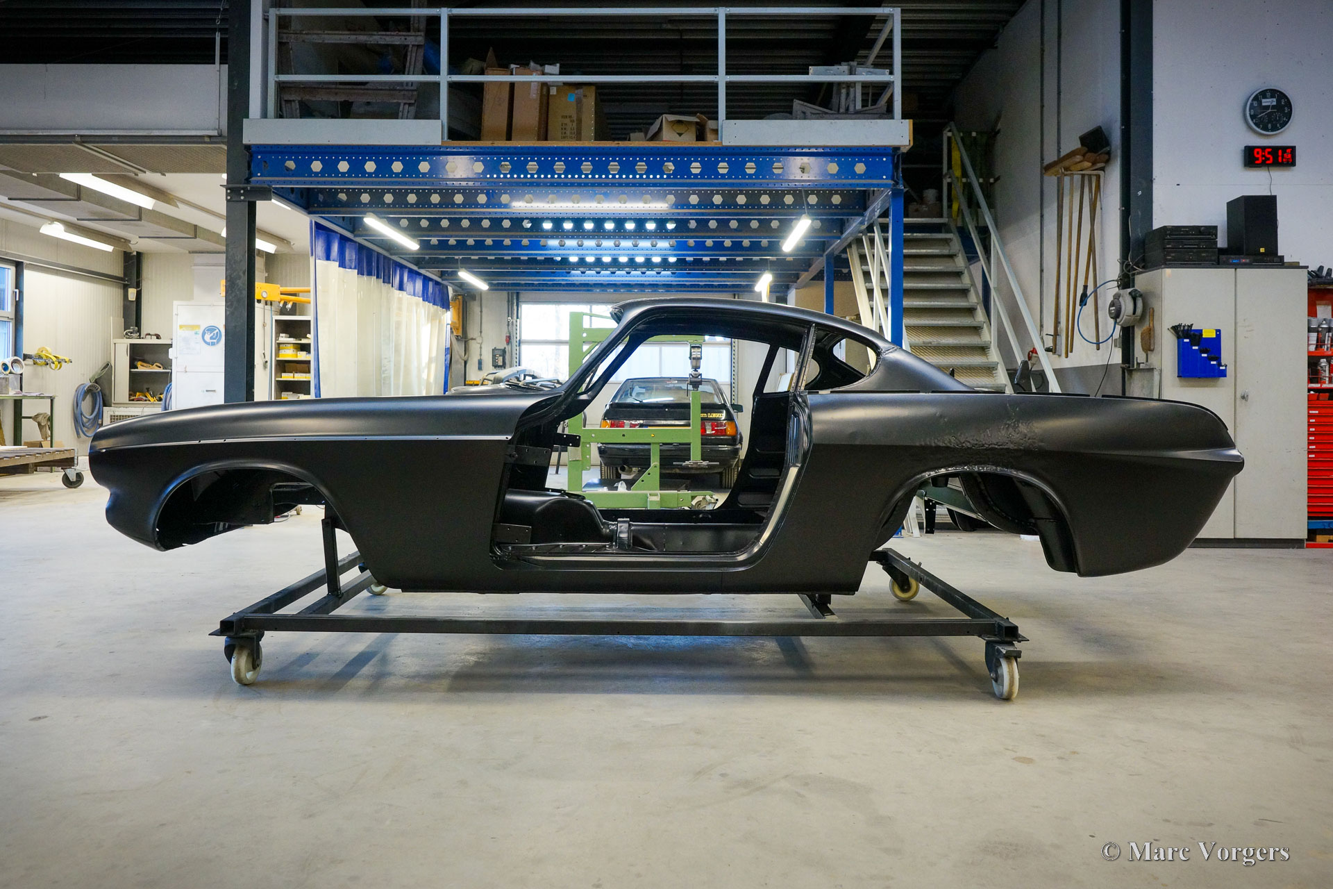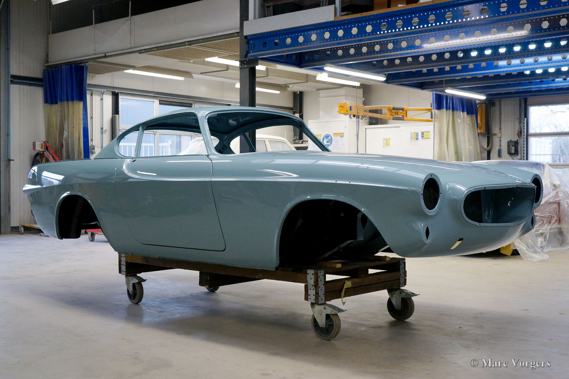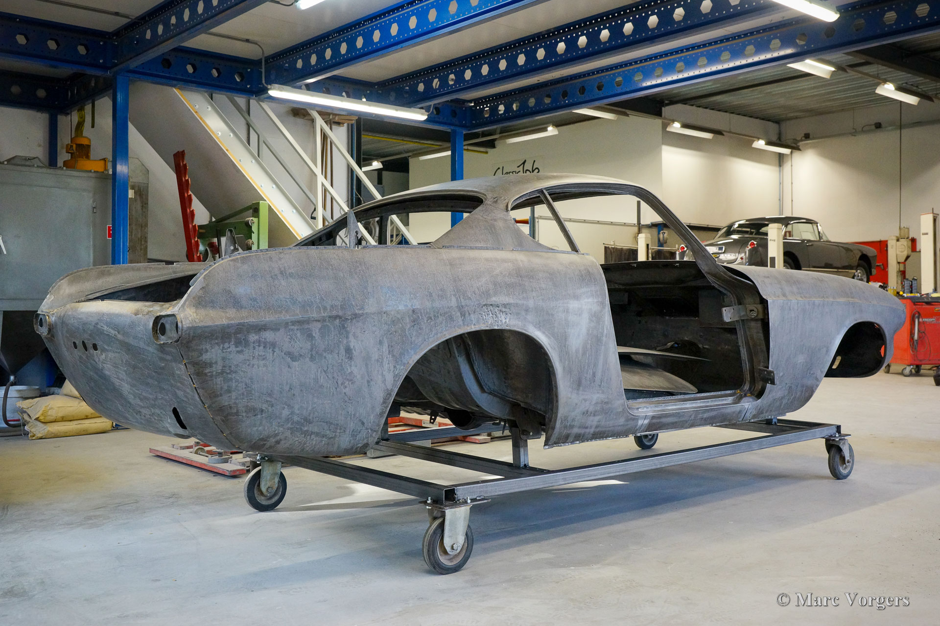 De carrosserie van deze Volvo 1800 S is door Classic Job naar beter dan nieuwstaat gerestaureerd. De carrosserie is door de klant gedemonteerd aangeleverd. Er is begonnen met het verwijderen van alle lijmresten en de oude bodembescherming. Vervolgens is de carrosserie in een verfafbijtbad volledig ontlakt. De carrosserie bleek in een mooie en roestvrije staat te verkeren. Aansluitend zijn de plaatwerk werkzaamheden uitgevoerd. Beide achterspatborden vertoonden slecht gerepareerde kleine aanrijdingsschades die gerepareerd moesten worden. Het achterpaneel tussen de achterlichten is vervangen vanwege een eerdere slechte reparatie. Nadat het plaatwerk was voltooid is de carrosserie voorzien van een KTL-coating waarbij de carrosserie volledig is ondergedompeld in een speciaal bad waardoor op elk metalen oppervlak van binnen en buiten en in elke naad een zwarte corrosie werende coating is achtergebleven. Daarna is de carrosserie verder strakgemaakt, gegrond en voorzien van een perfect nieuw laksysteem. De Volvo 1800 S wordt door de eigenaar afgebouwd.