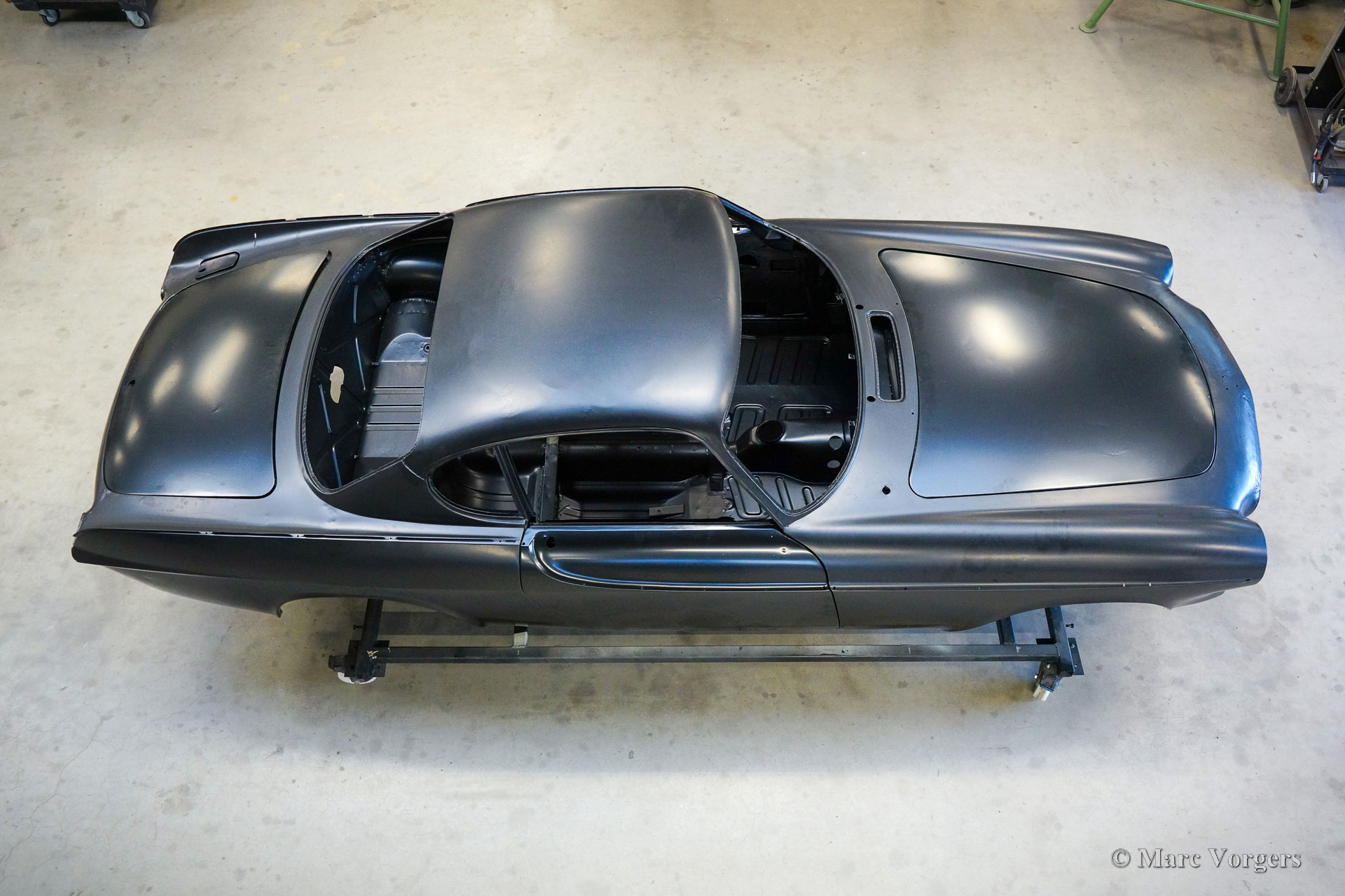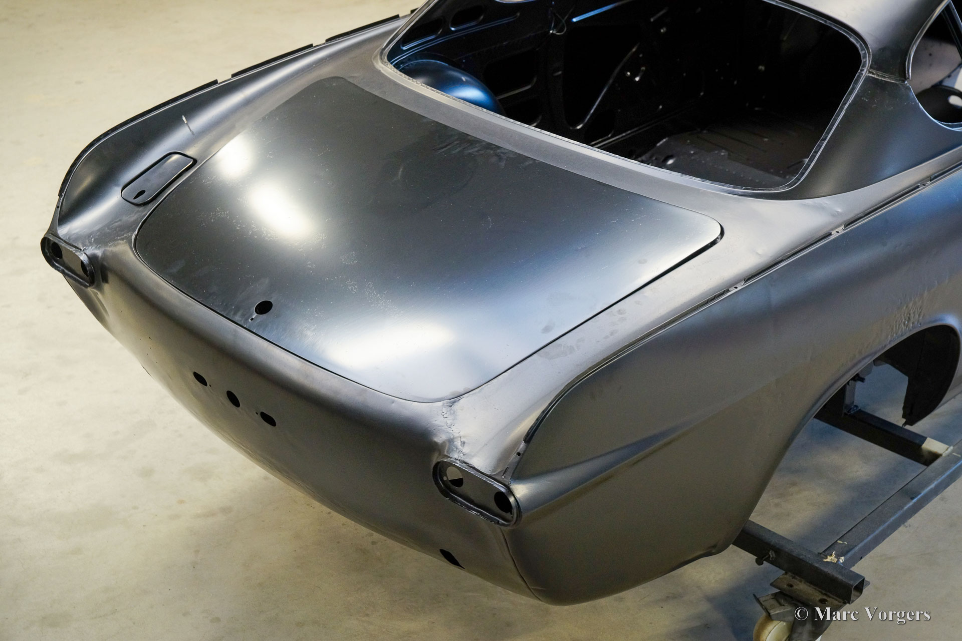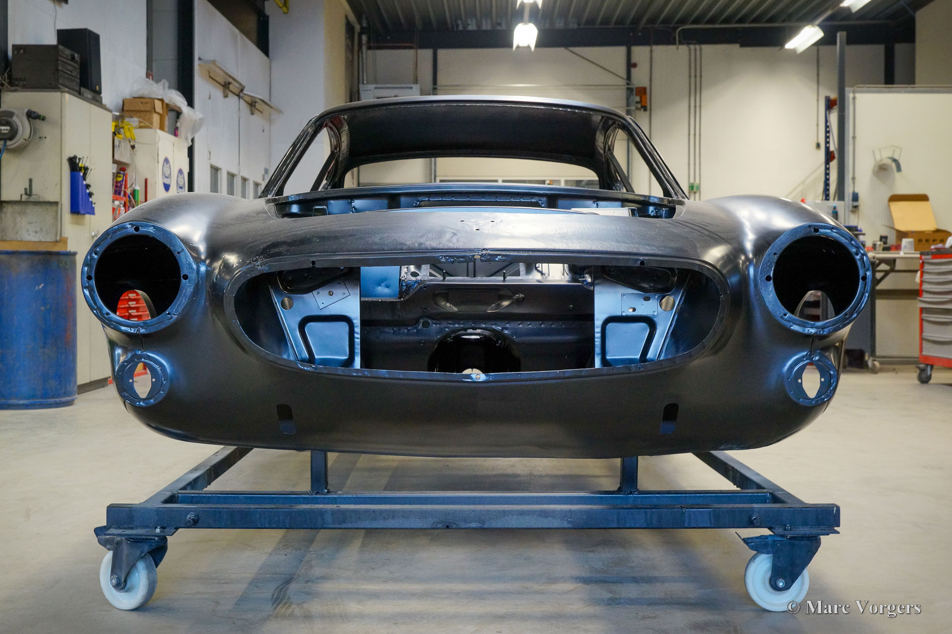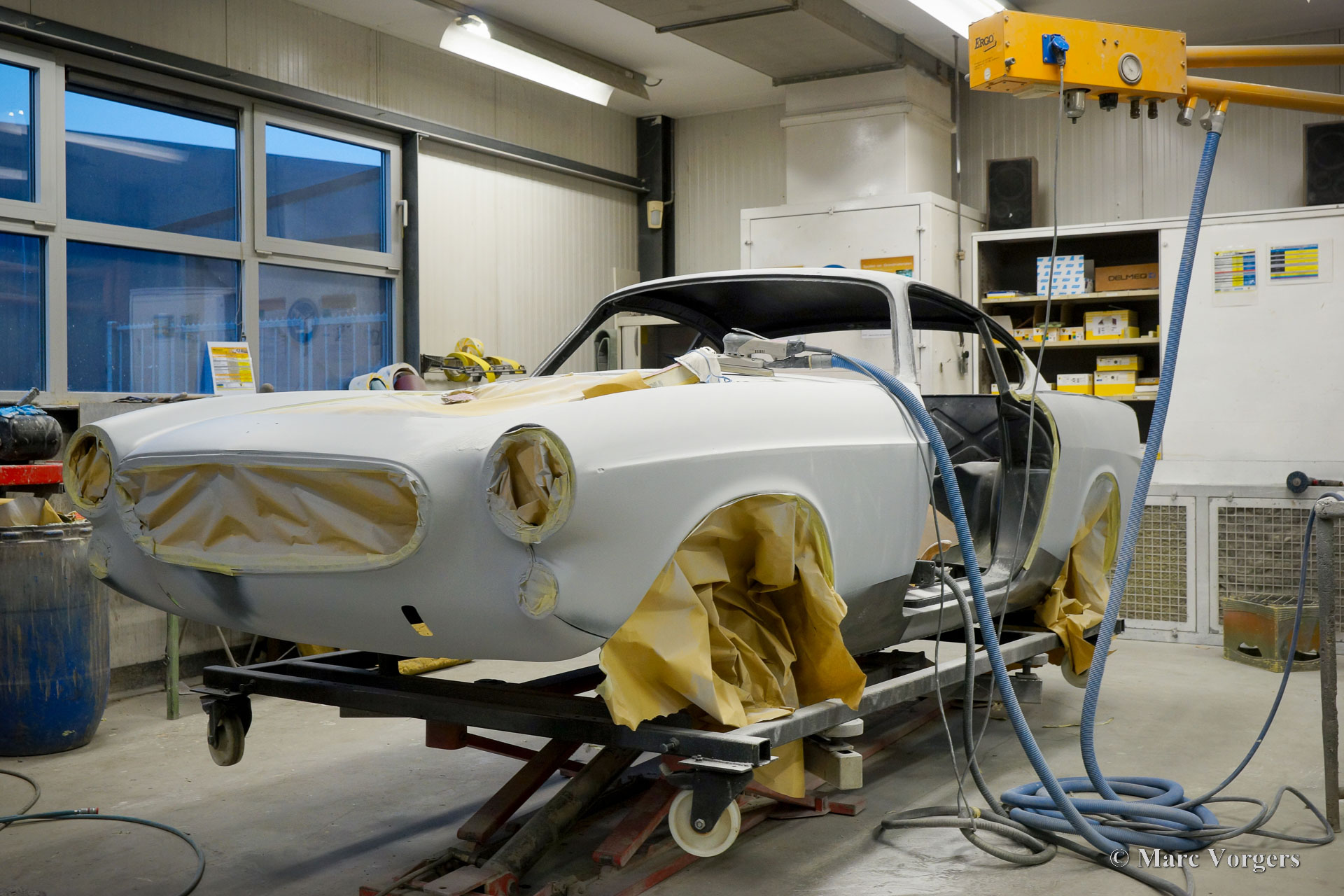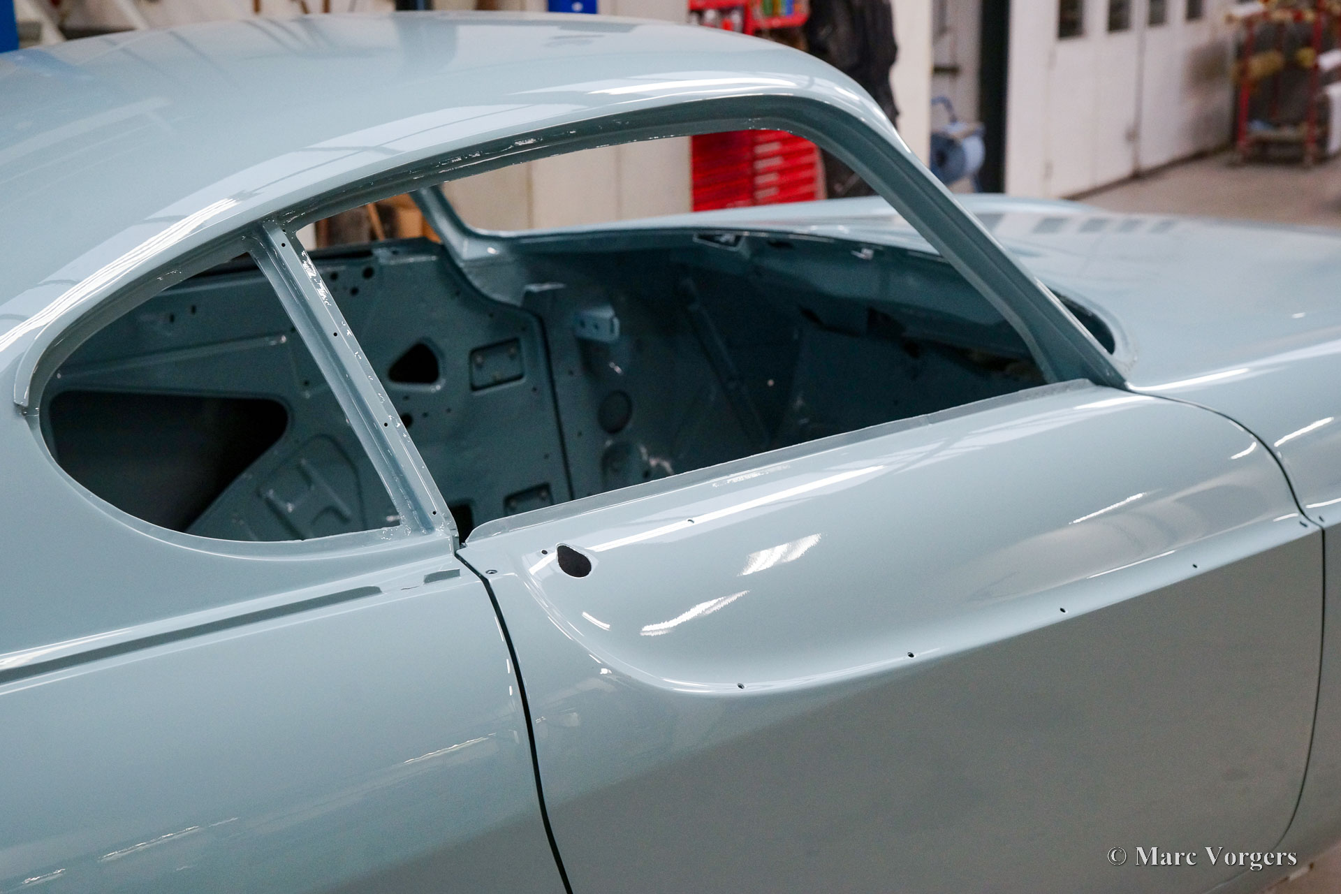 De carrosserie van deze Volvo 1800 S is door Classic Job naar beter dan nieuwstaat gerestaureerd. De carrosserie is door de klant gedemonteerd aangeleverd. Er is begonnen met het verwijderen van alle lijmresten en de oude bodembescherming. Vervolgens is de carrosserie in een verfafbijtbad volledig ontlakt. De carrosserie bleek in een mooie en roestvrije staat te verkeren. Aansluitend zijn de plaatwerk werkzaamheden uitgevoerd. Beide achterspatborden vertoonden slecht gerepareerde kleine aanrijdingsschades die gerepareerd moesten worden. Het achterpaneel tussen de achterlichten is vervangen vanwege een eerdere slechte reparatie. Nadat het plaatwerk was voltooid is de carrosserie voorzien van een KTL-coating waarbij de carrosserie volledig is ondergedompeld in een speciaal bad waardoor op elk metalen oppervlak van binnen en buiten en in elke naad een zwarte corrosie werende coating is achtergebleven. Daarna is de carrosserie verder strakgemaakt, gegrond en voorzien van een perfect nieuw laksysteem. De Volvo 1800 S wordt door de eigenaar afgebouwd.