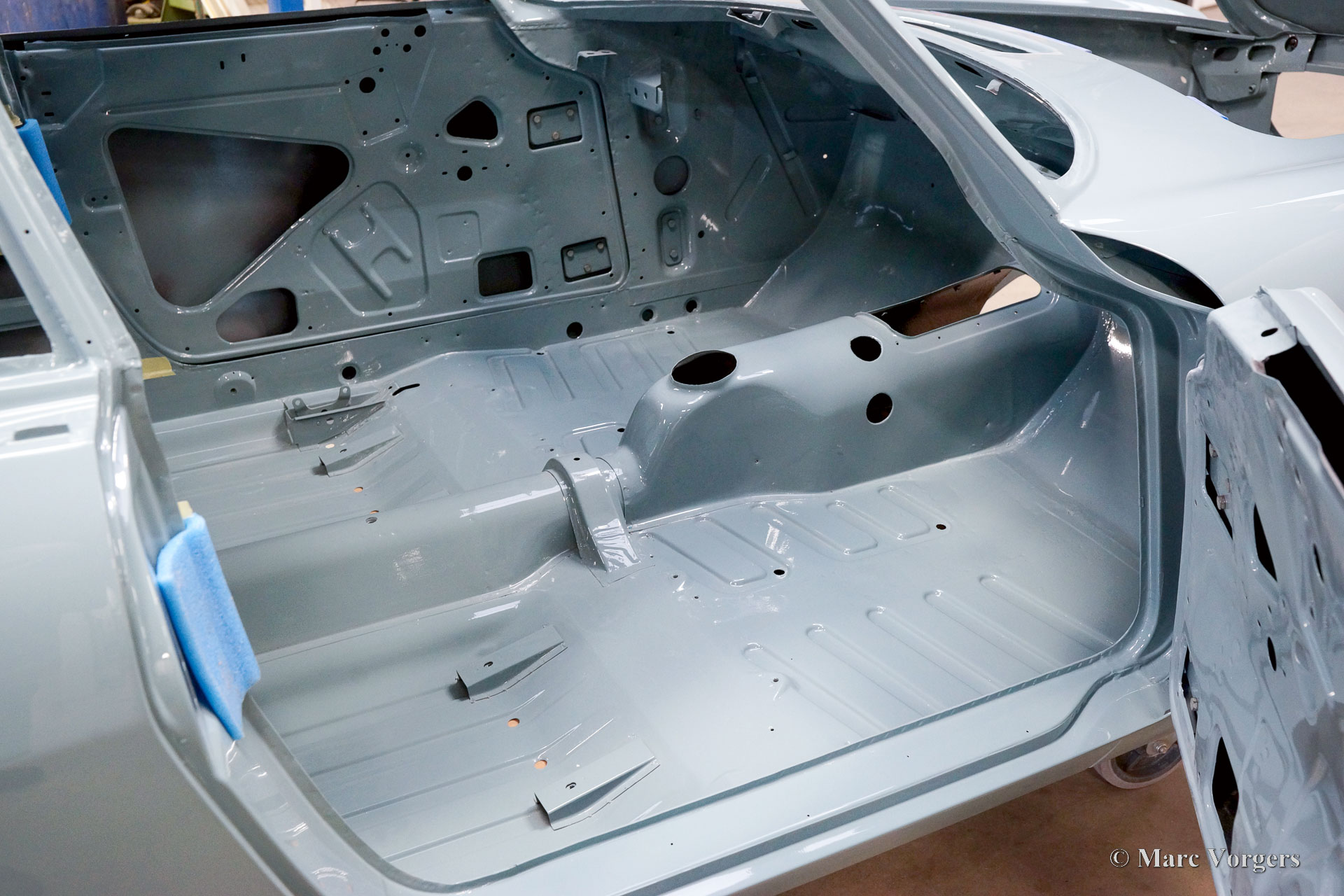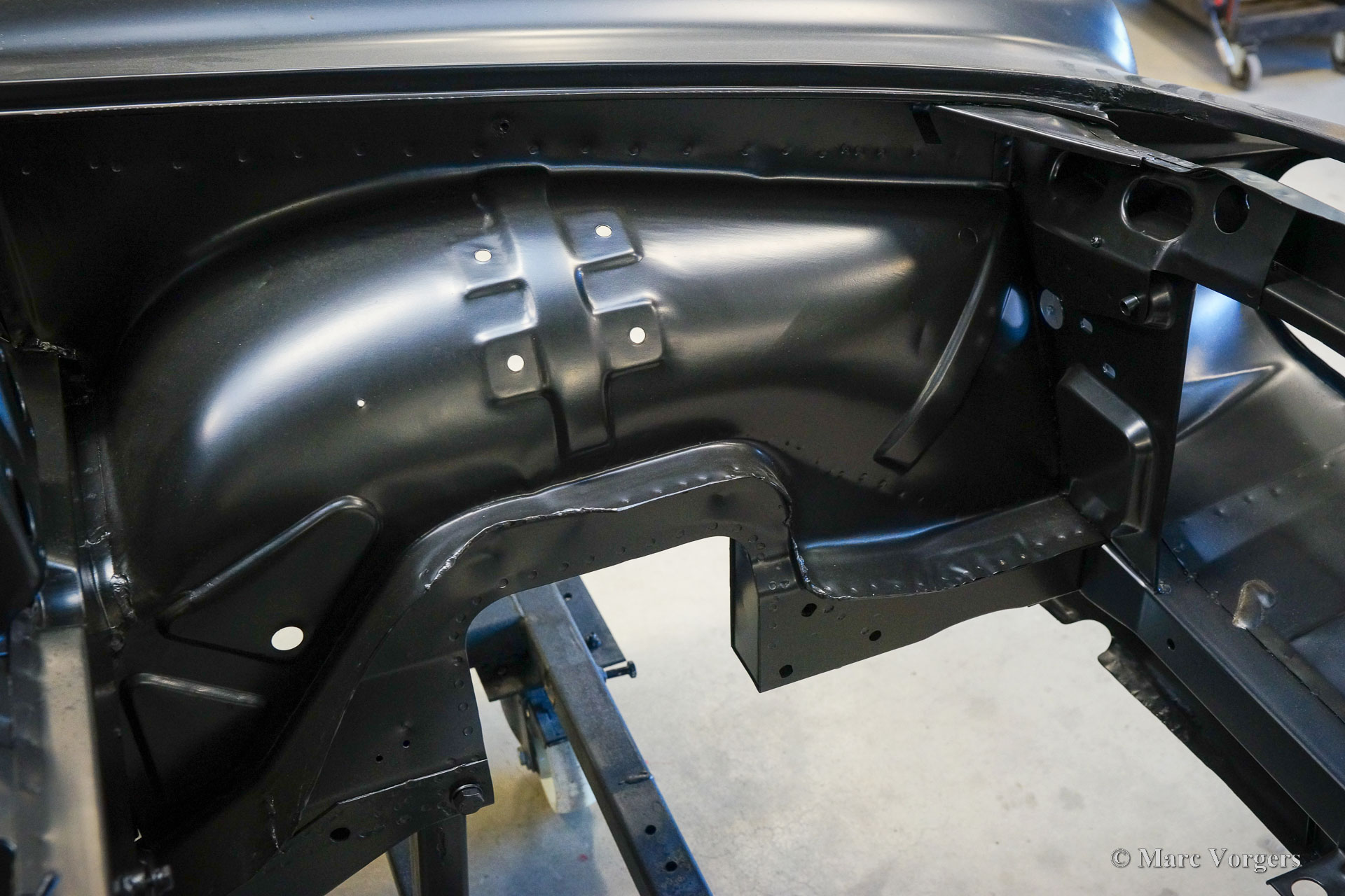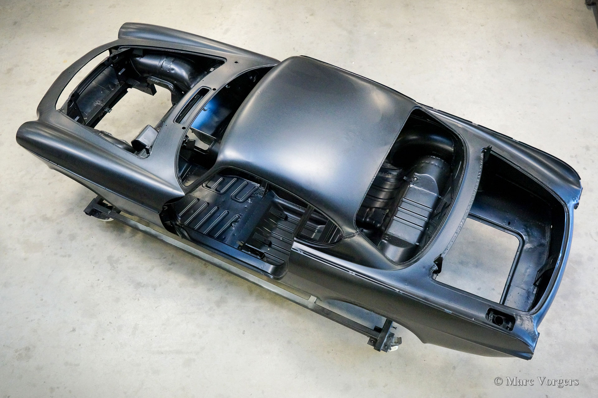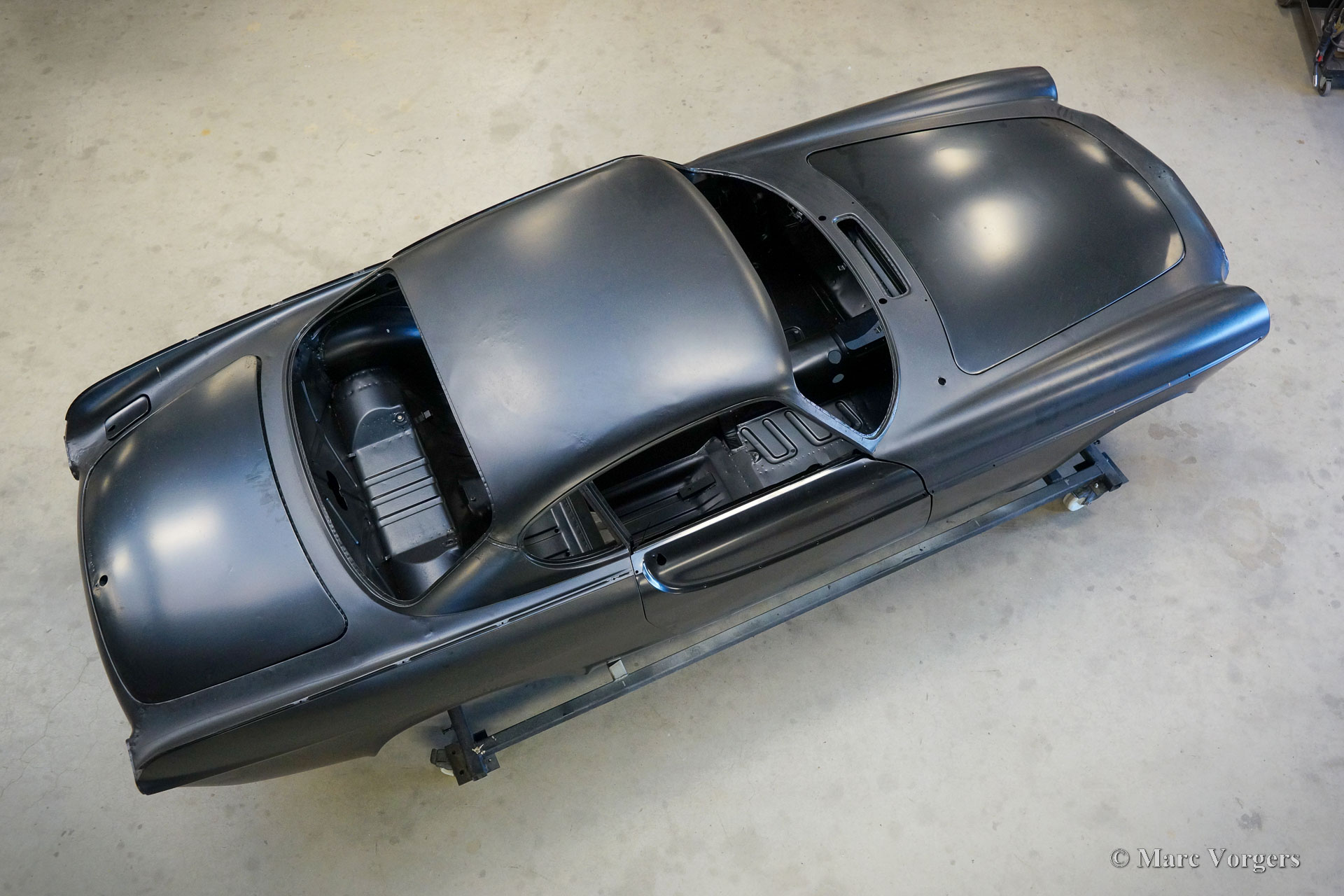 De carrosserie van deze Volvo 1800 S is door Classic Job naar beter dan nieuwstaat gerestaureerd. De carrosserie is door de klant gedemonteerd aangeleverd. Er is begonnen met het verwijderen van alle lijmresten en de oude bodembescherming. Vervolgens is de carrosserie in een verfafbijtbad volledig ontlakt. De carrosserie bleek in een mooie en roestvrije staat te verkeren. Aansluitend zijn de plaatwerk werkzaamheden uitgevoerd. Beide achterspatborden vertoonden slecht gerepareerde kleine aanrijdingsschades die gerepareerd moesten worden. Het achterpaneel tussen de achterlichten is vervangen vanwege een eerdere slechte reparatie. Nadat het plaatwerk was voltooid is de carrosserie voorzien van een KTL-coating waarbij de carrosserie volledig is ondergedompeld in een speciaal bad waardoor op elk metalen oppervlak van binnen en buiten en in elke naad een zwarte corrosie werende coating is achtergebleven. Daarna is de carrosserie verder strakgemaakt, gegrond en voorzien van een perfect nieuw laksysteem. De Volvo 1800 S wordt door de eigenaar afgebouwd.