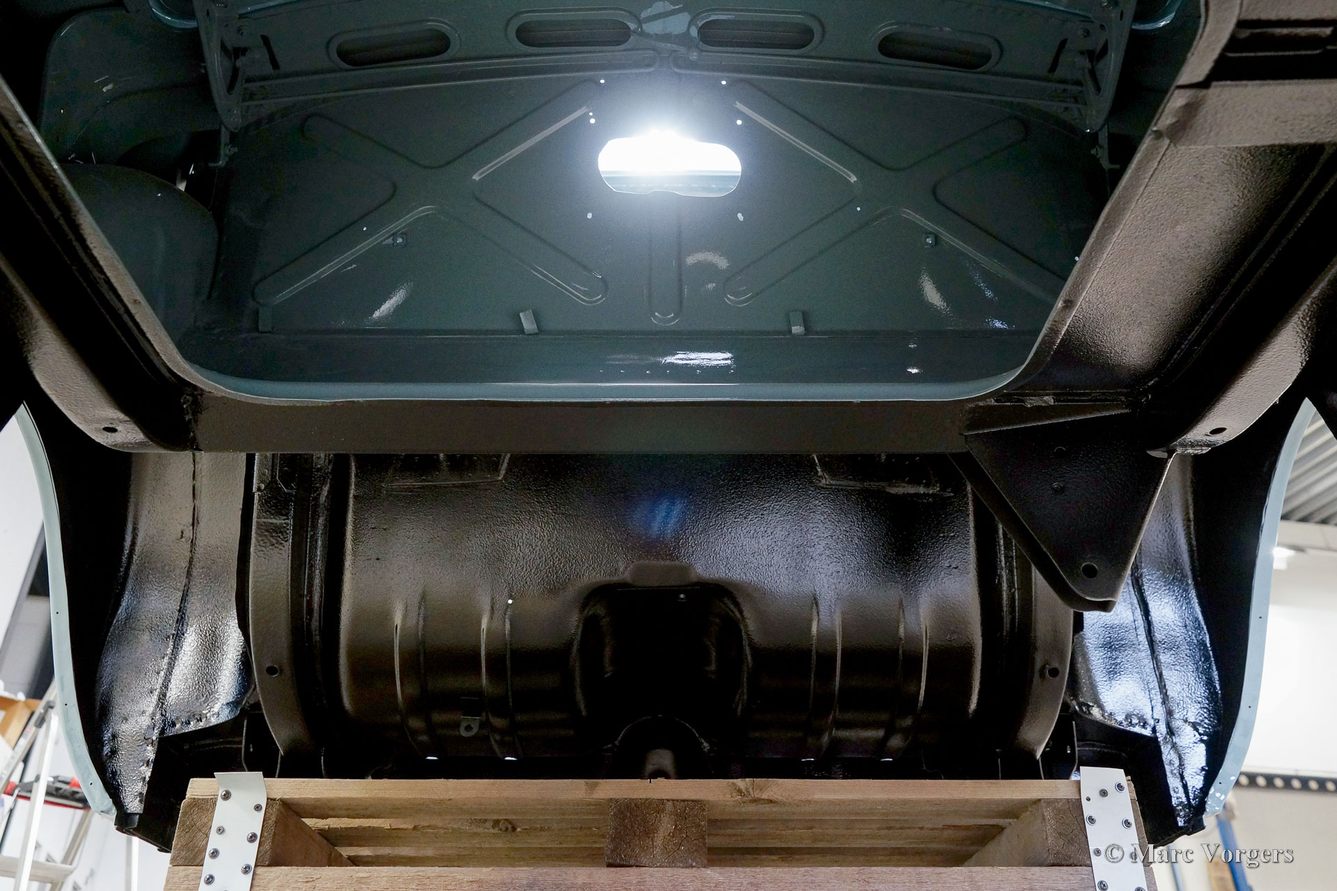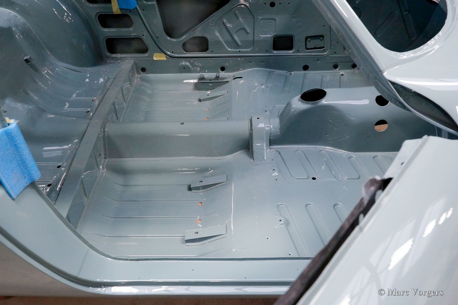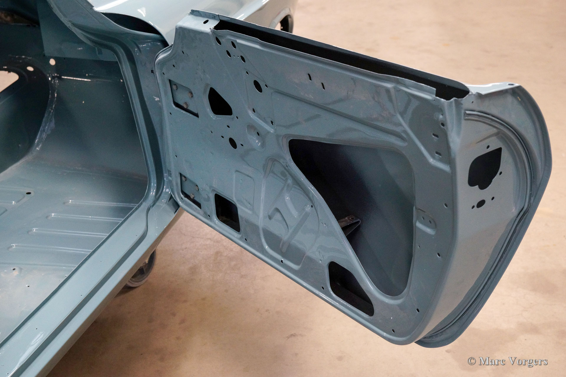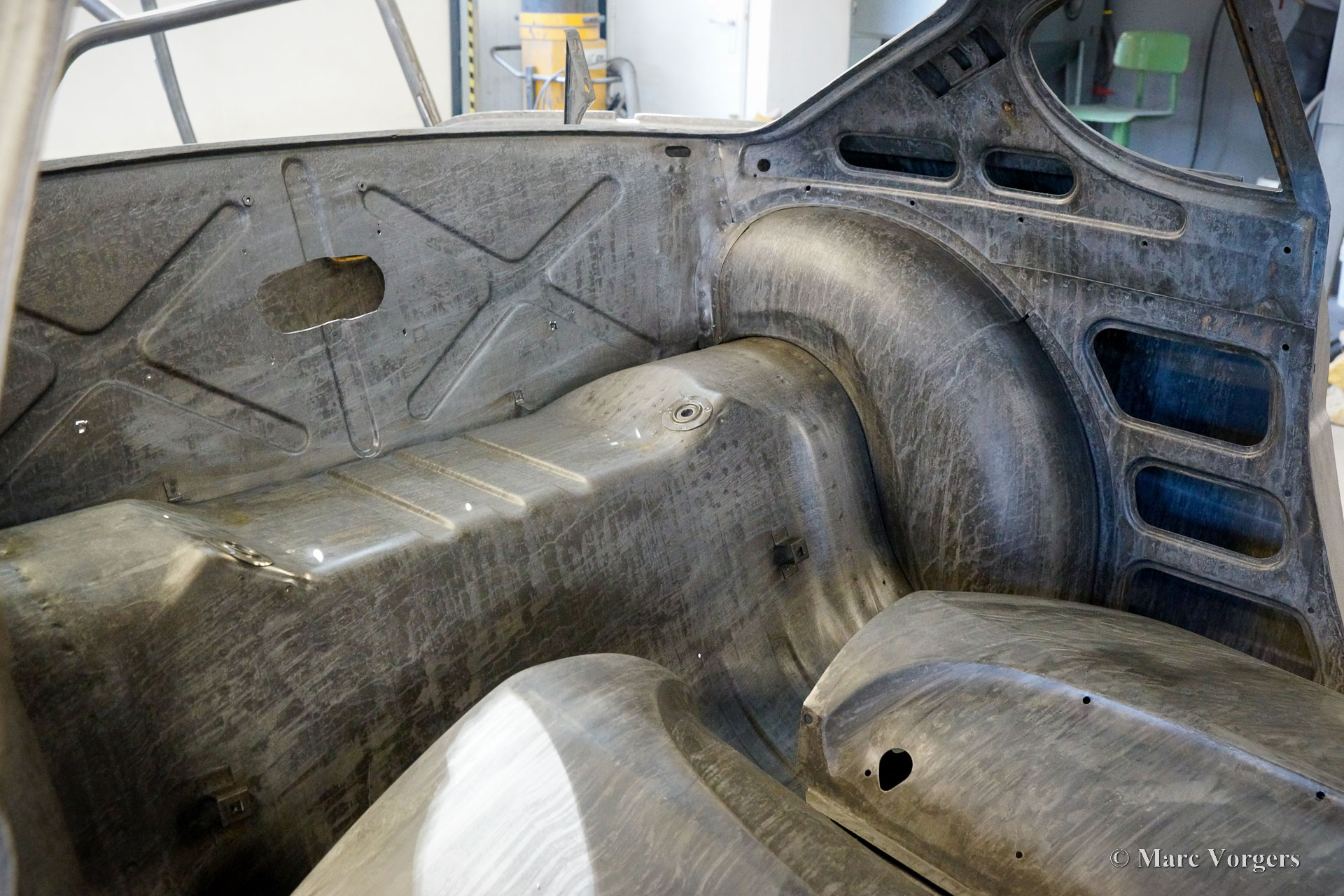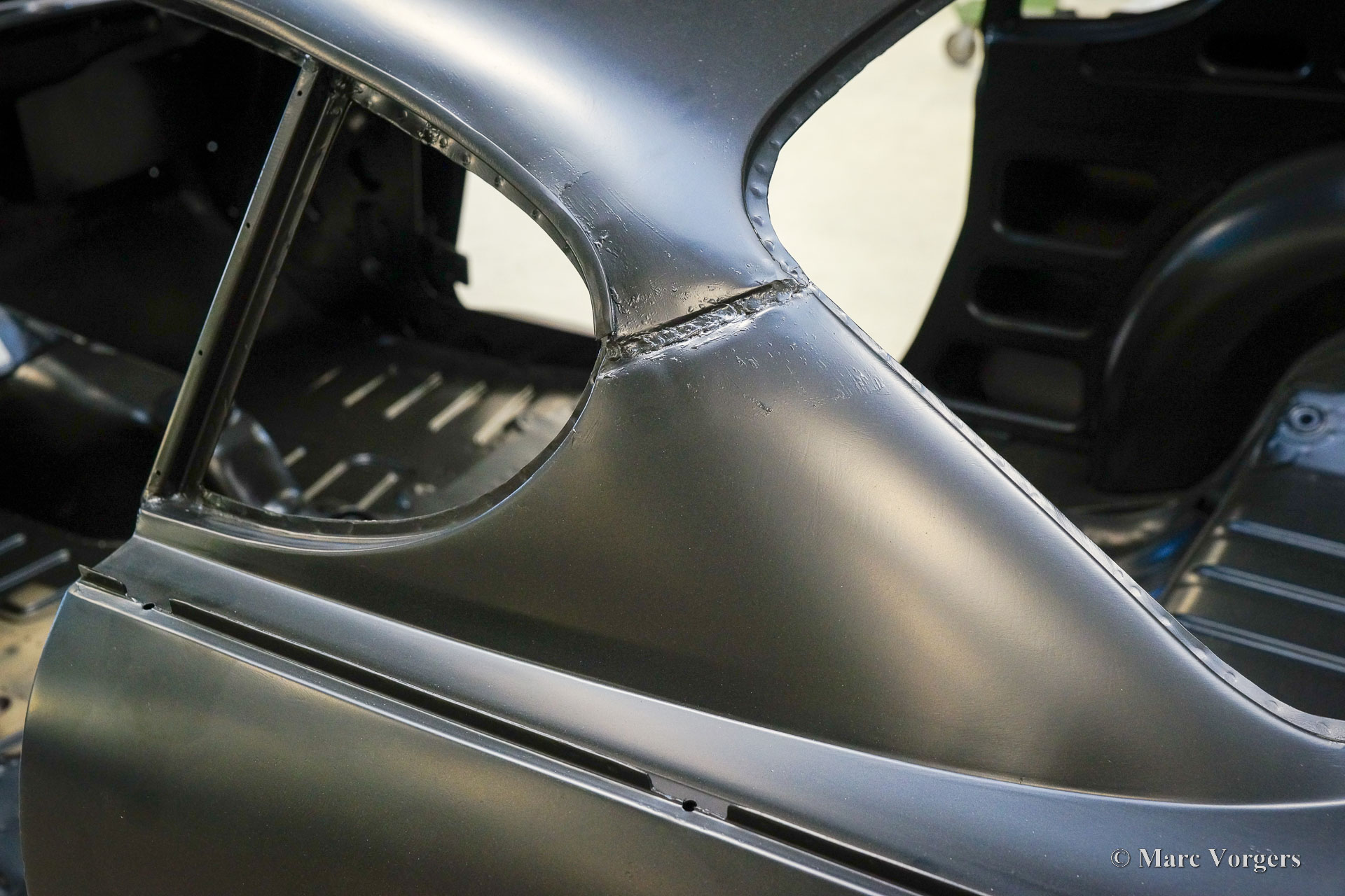 De carrosserie van deze Volvo 1800 S is door Classic Job naar beter dan nieuwstaat gerestaureerd. De carrosserie is door de klant gedemonteerd aangeleverd. Er is begonnen met het verwijderen van alle lijmresten en de oude bodembescherming. Vervolgens is de carrosserie in een verfafbijtbad volledig ontlakt. De carrosserie bleek in een mooie en roestvrije staat te verkeren. Aansluitend zijn de plaatwerk werkzaamheden uitgevoerd. Beide achterspatborden vertoonden slecht gerepareerde kleine aanrijdingsschades die gerepareerd moesten worden. Het achterpaneel tussen de achterlichten is vervangen vanwege een eerdere slechte reparatie. Nadat het plaatwerk was voltooid is de carrosserie voorzien van een KTL-coating waarbij de carrosserie volledig is ondergedompeld in een speciaal bad waardoor op elk metalen oppervlak van binnen en buiten en in elke naad een zwarte corrosie werende coating is achtergebleven. Daarna is de carrosserie verder strakgemaakt, gegrond en voorzien van een perfect nieuw laksysteem. De Volvo 1800 S wordt door de eigenaar afgebouwd.