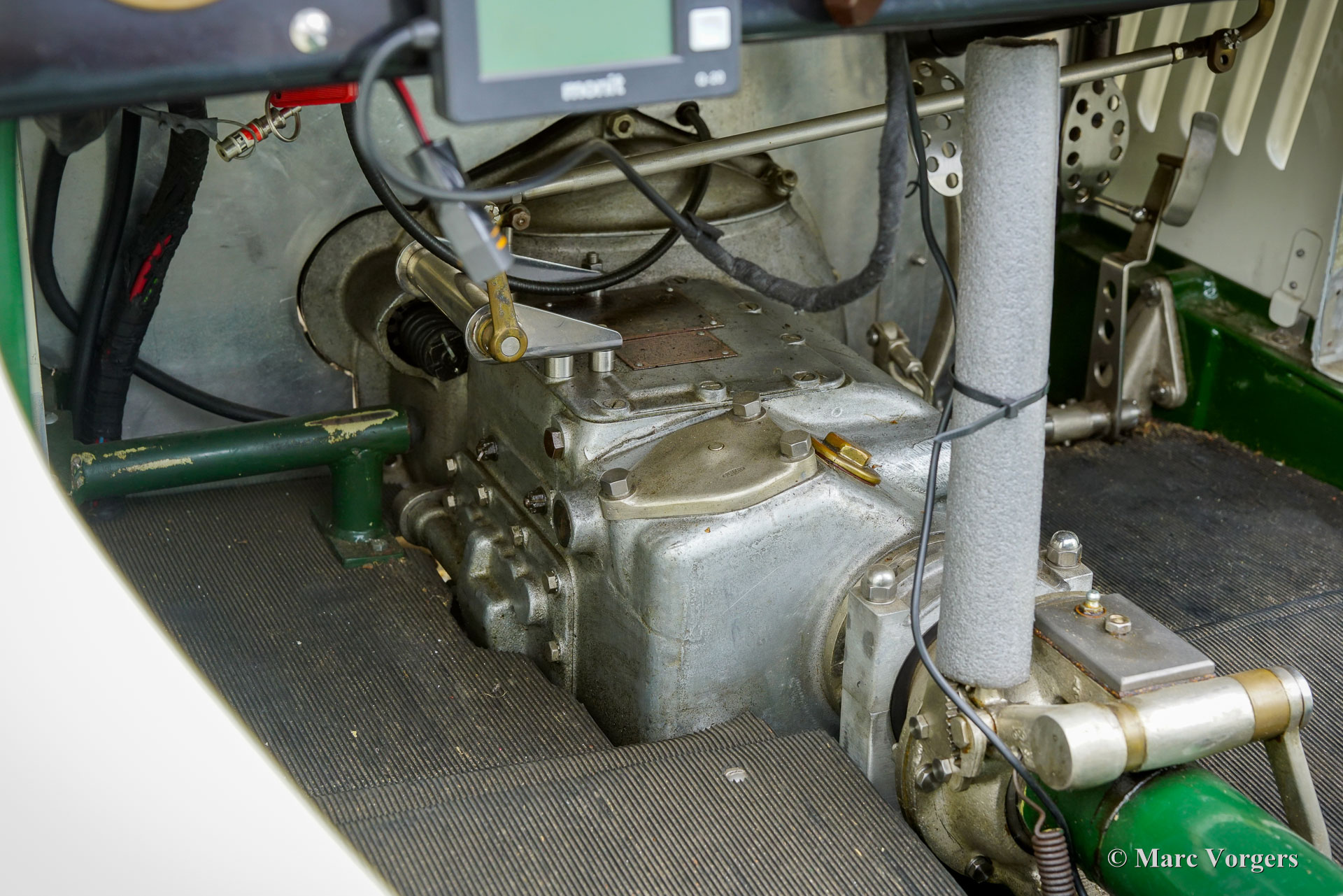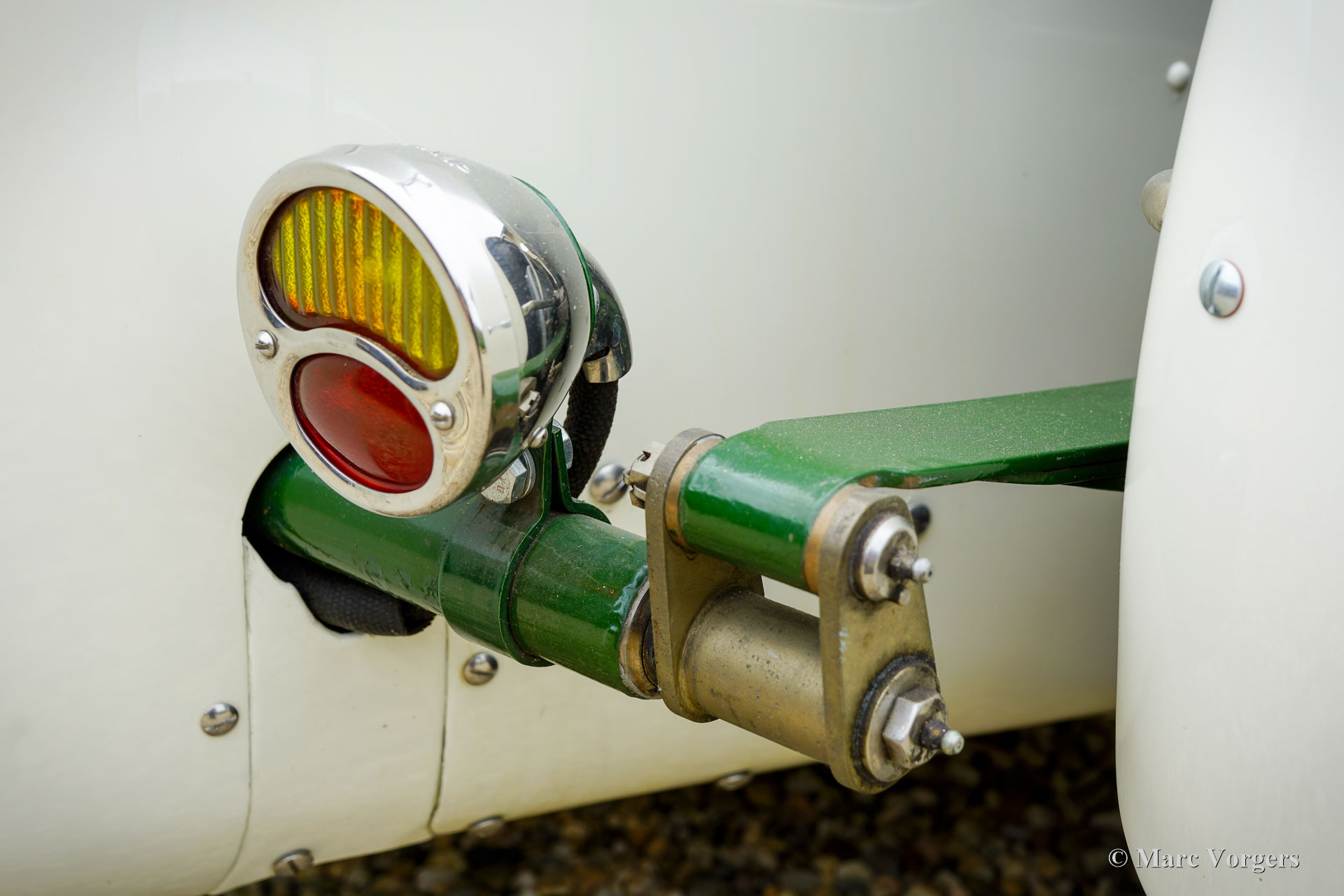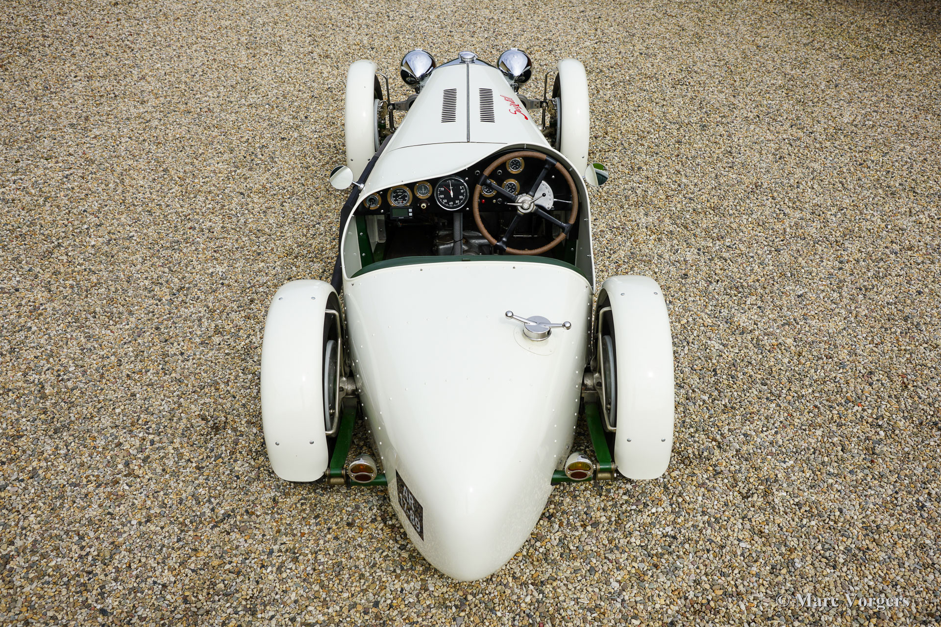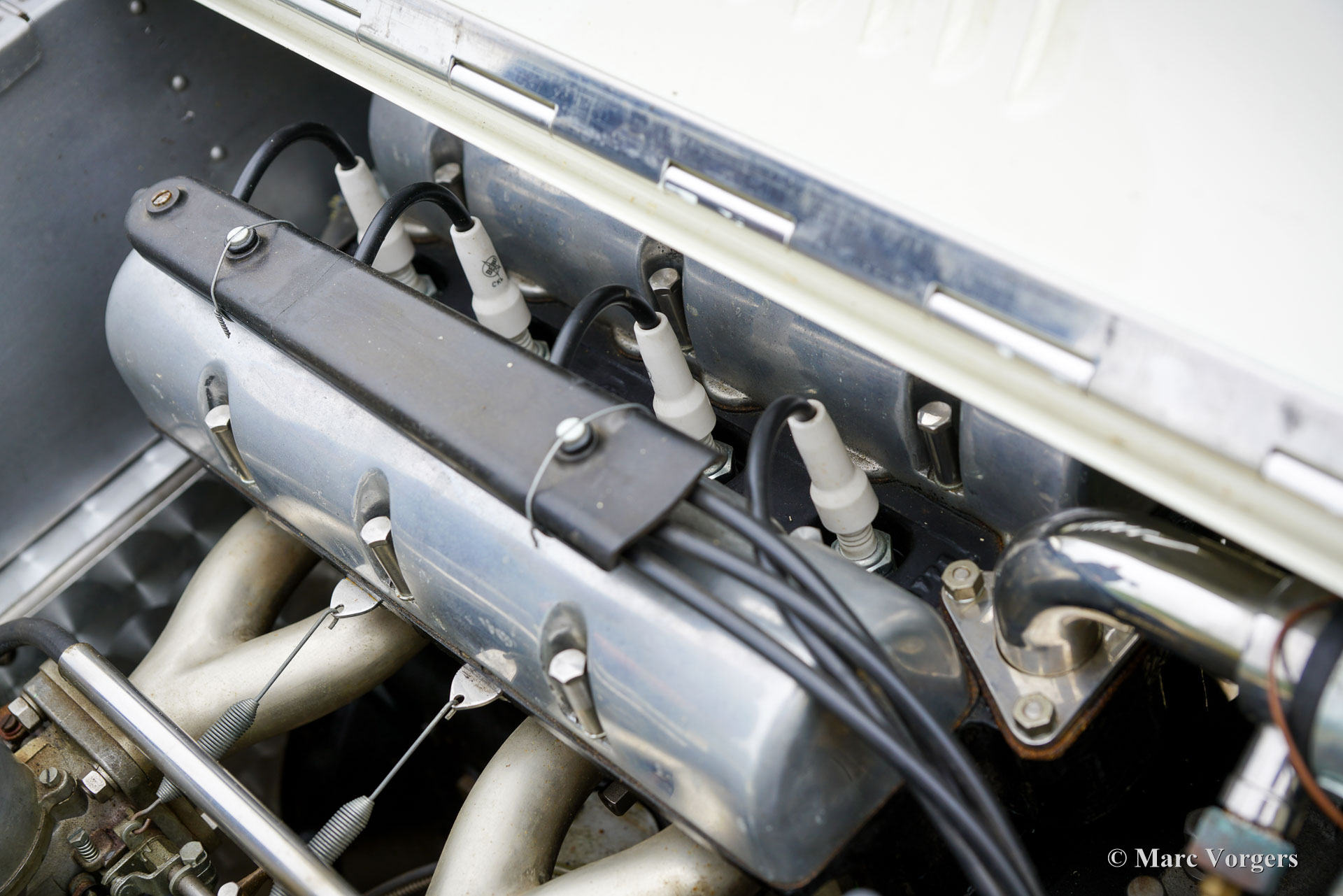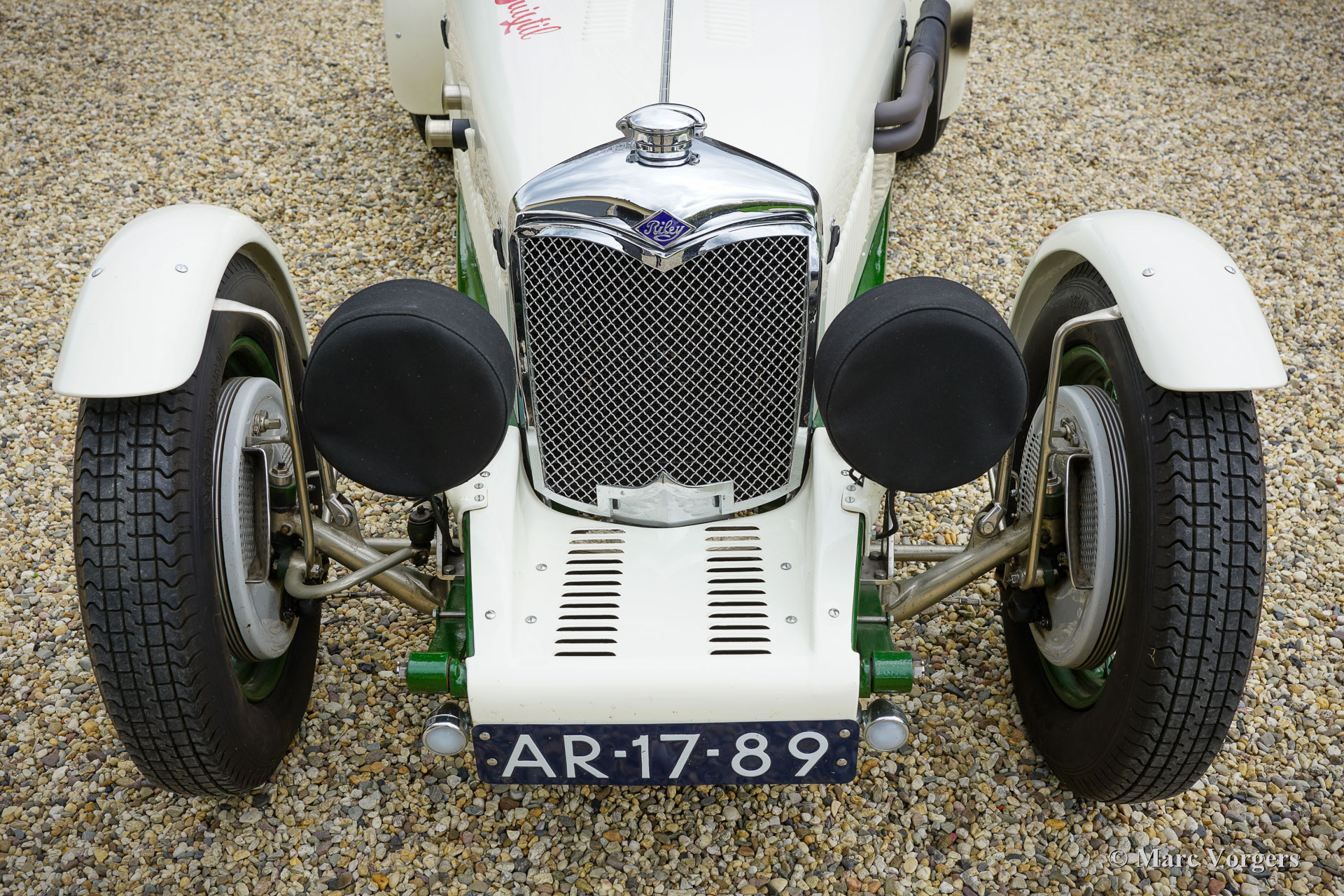 Riley TT Sprite replica, chassisjaar 1935. Eerste registratie 27 maart 1935. Carrosseriekleur wit gecombineerd met een groen chassis, groene spaakwielen en groene lederen bekleding in het interieur. Het originele Riley 12/4 (9PK) chassis, waarop deze prachtige TT Sprite replica is gebaseerd, verliet de Riley fabriek voorzien van een ‘Falcon’ sedan carrosserie. De Riley bracht een groot deel van zijn leven door met verschillende eigenaren in Devon, VK. In november 1978 werd de auto gekocht door het Nederlandse klassieke automuseum en dealer 'Automuseum Bergeyk' en via de douane van Felixstowe naar Nederland geëxporteerd. Eind jaren 1990 werden er plannen gemaakt om een Riley TT Sprite special te creëren op basis van het 12/4 chassis. In 1935/36 was de originele TT Sprite een racewagen die speciaal gebouwd was om deel te nemen aan de Ulster TT, die jaarlijks gehouden werd op het eiland Man, dat nog steeds bekendstaat om de spannende motorraces die op hetzelfde stratencircuit plaatsvinden. De originele Riley TT Sprite was gebaseerd op een chassis vergelijkbaar met dat van de 12/4 en voorzien van dezelfde 1496 cc viercilindermotor. Vandaar de keuze om chassis 22T1331 om te bouwen naar de specificaties van de TT Sprite. Er werden technische tekeningen gemaakt voor de uitvoering van de carrosserie en het chassis. Er werden detailtekeningen gemaakt voor de productie van het dashboard, de speciale ophanging, de versnellingspook, de koplamp- en spatbordbeugels, en andere speciale onderdelen die op de racewagen te vinden waren. Het technische werk en het tekenwerk werden gedaan door de Nederlander Kees de Cock (chassis en mechanische componenten) en de Engelsman John Pitney (carrosserie). De daadwerkelijke bouw werd gedaan door de heer J. Lensveld. Originele technische tekeningen van 18 december 1998 (chassisspecificaties/modificaties/lassen), 1 januari 1999 (definitieve technische tekeningen) en 2003 (detailtekeningen) zijn aanwezig in het blauwe boek van het historiebestand. In het andere boek is een volledig fotoverslag van de bouw opgenomen. Beginnend met de blauwe ‘Falcon’ sedan, met foto's van alle betrokken personen, de bouw van de houten mallen voor de aluminium carrosserie, de fabricage van de carrosserie en de voltooiing van het chassis en de motor. Met het oog op perfectie duurde de bouw vele jaren. De motor is gebouwd en ‘getuned’ volgens de racespecificaties van de TT Sprite, en de versnellingsbak is een degelijk, zeldzaam en origineel Riley ‘preselector’ exemplaar! De auto werd verkocht aan een Nederlandse autoverzamelaar en in april 2011 geregistreerd voor gebruik op de openbare weg. Vanaf dat moment werd de auto onderhouden door Classic Job. De huidige eigenaar koestert deze Riley TT Sprite replica sinds juli 2021. De auto verkeert in een uitstekende staat en rijdt indrukwekkend. Dit is een zorgvuldig gebouwde Riley TT Sprite replica die zelfs de meest veeleisende Riley-kenners zullen waarderen. Deze auto is een geweldige vondst voor Riley-liefhebbers, zowel op de openbare weg als tijdens regelmatigheid ritten en toertochten. Met aanpassingen om te voldoen aan de geldende FIA-regels, kan de auto zelfs worden ingezet voor nationale en internationale oldtimerraces (bijvoorbeeld via de Dutch Vintage Sports Car Club in Nederland).