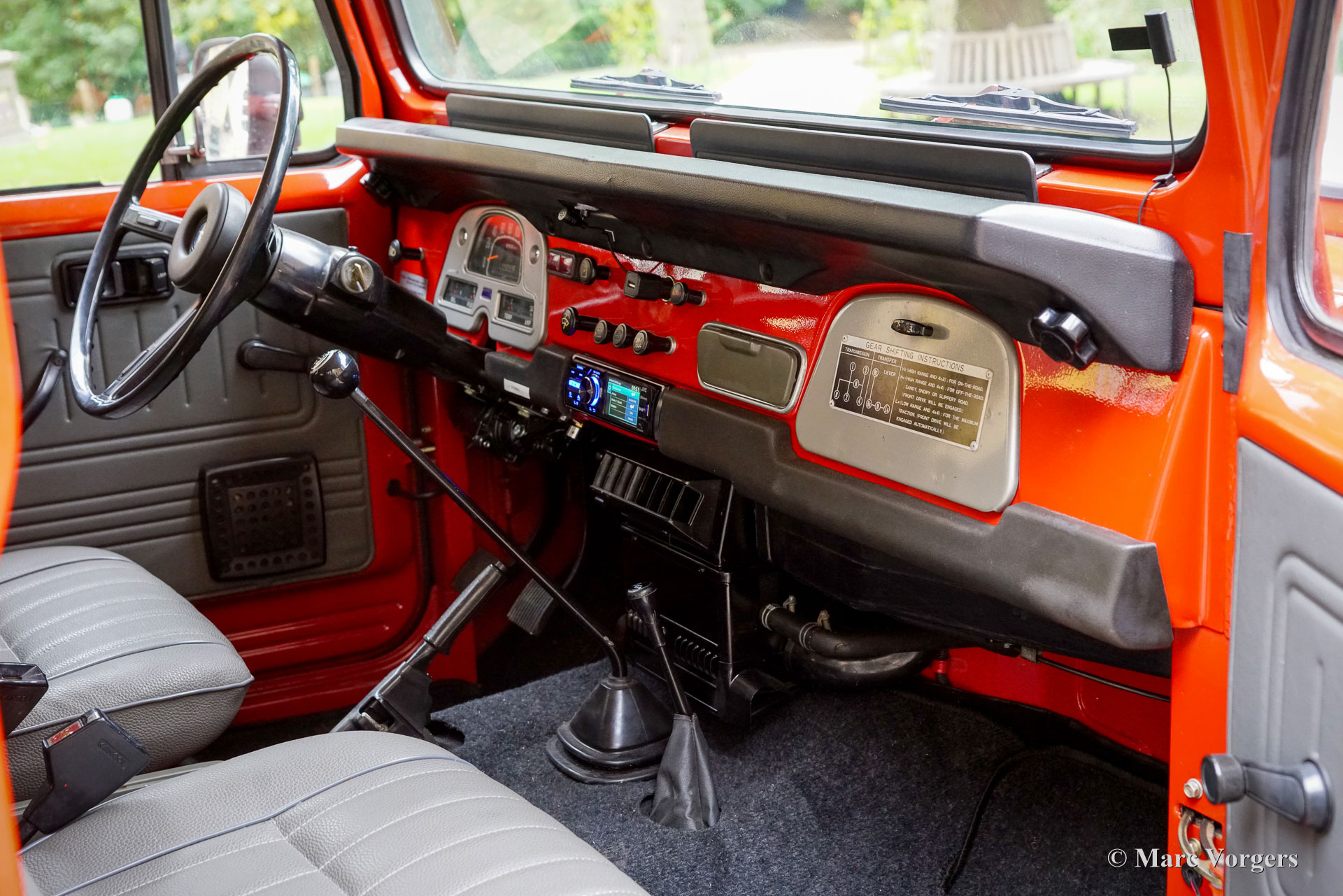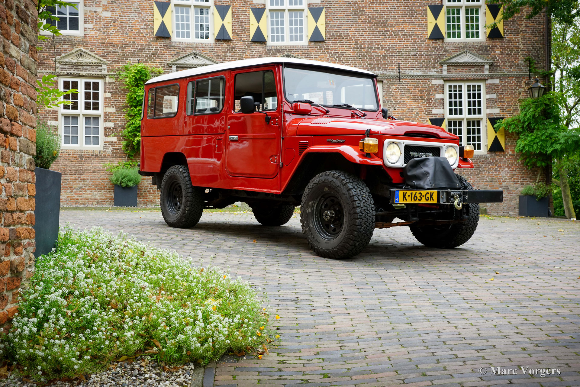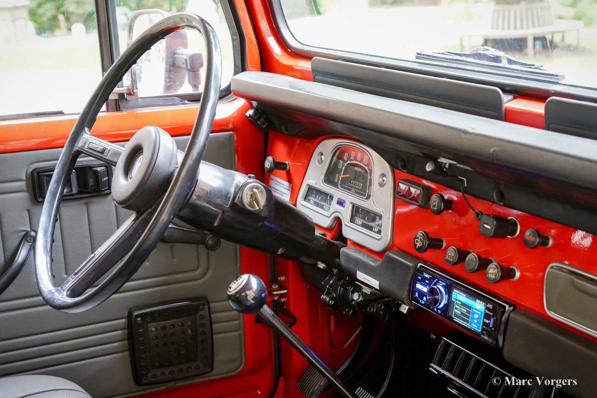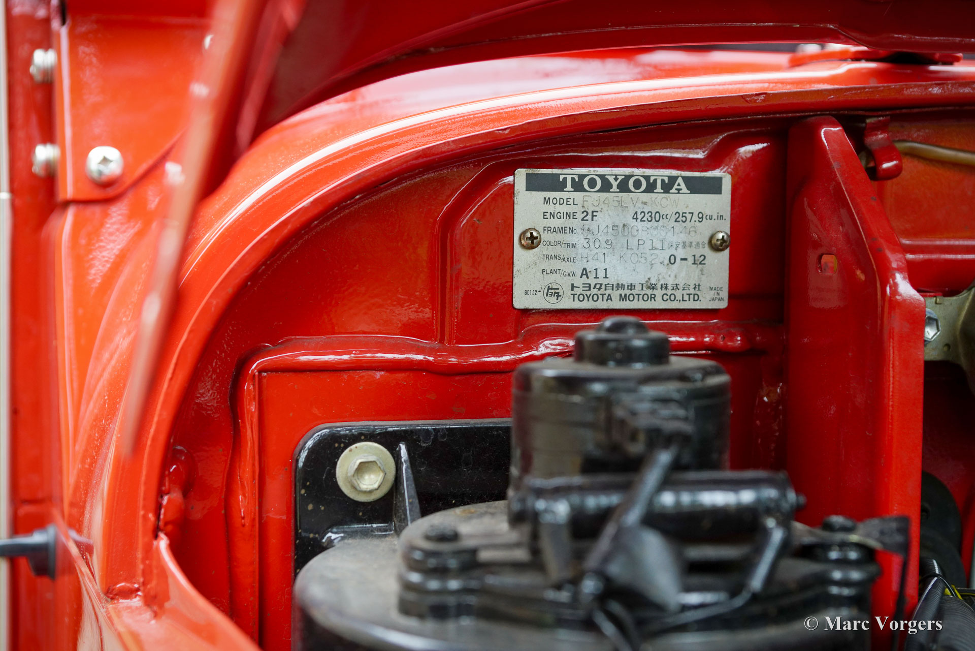 Toyota Land Cruiser FJ45 ‘hard top’, jaar 1980. Chassisnummer FJ4500800146. Kleur rood gecombineerd met een grijs kunstlederen interieur. Deze prachtige en stoere Toyota Land Cruiser FJ45 ‘hard top’ is op 8 december 2020 geïmporteerd naar Nederland. In 2020 heeft de auto een uitgebreide onderhoudsbeurt gehad, waaronder het vernieuwen van de remschoenen, handremset, achterwiellagers, stabilisatorrubbers en koelsysteem slangen. Verder zijn de achterremcilinders gereviseerd, een differentieel lek gerepareerd, klepspeling afgesteld, ontstekingsdelen vernieuwd en afgesteld. In datzelfde jaar is er elektrische stuurbekrachtiging gemonteerd door EZ Power Steering. In 2021 zijn de stuurkogels vernieuwd en zijn de remcilinders aan de voorzijde vernieuwd. De auto is op 18 januari 2024 gekocht door de huidige Nederlandse eigenaar. Deze indrukwekkende Land Cruiser aangedreven door een 4,2 liter zes-in-lijn motor verkeert in een zeer goede en prachtige staat, en de auto rijdt en stuurt zoals het hoort. Zelfs op de snelweg, met snelheden rond de 100 km/u, voelt de auto zich comfortabel en is minder lawaaiig dan verwacht. Het verhaal van de Land Cruiser begon met het prototype van de Toyota ‘Jeep’ BJ in 1951. Het prototype van de BJ bleek een solide en succesvol concept: de auto beklom het zesde controlepunt van de berg Fuji, iets wat geen enkel motorvoertuig eerder had gepresteerd! In 1954 werd de naam Land Cruiser geïntroduceerd en het is het langstlopende Toyotamodel. Deze Toyota Land Cruiser FJ45 ‘hard top’ uit 1980, met de duurzame zescilinder-in-lijn benzinemotor, is een gewild stukje Japans auto-erfgoed. Het model wordt wereldwijd bewonderd om zijn robuuste techniek, zijn uitzonderlijke ‘offroad’-capaciteiten en zijn klassieke, utilitaire uiterlijk. Dit geweldige exemplaar is klaar voor weekendavonturen en/of om te bewaren en te bewonderen in een collectie. De auto is super origineel en kan worden geïmporteerd en geregistreerd in elk land ter wereld. Deze auto is alleen op afspraak beschikbaar voor bezichtiging en een testrit.