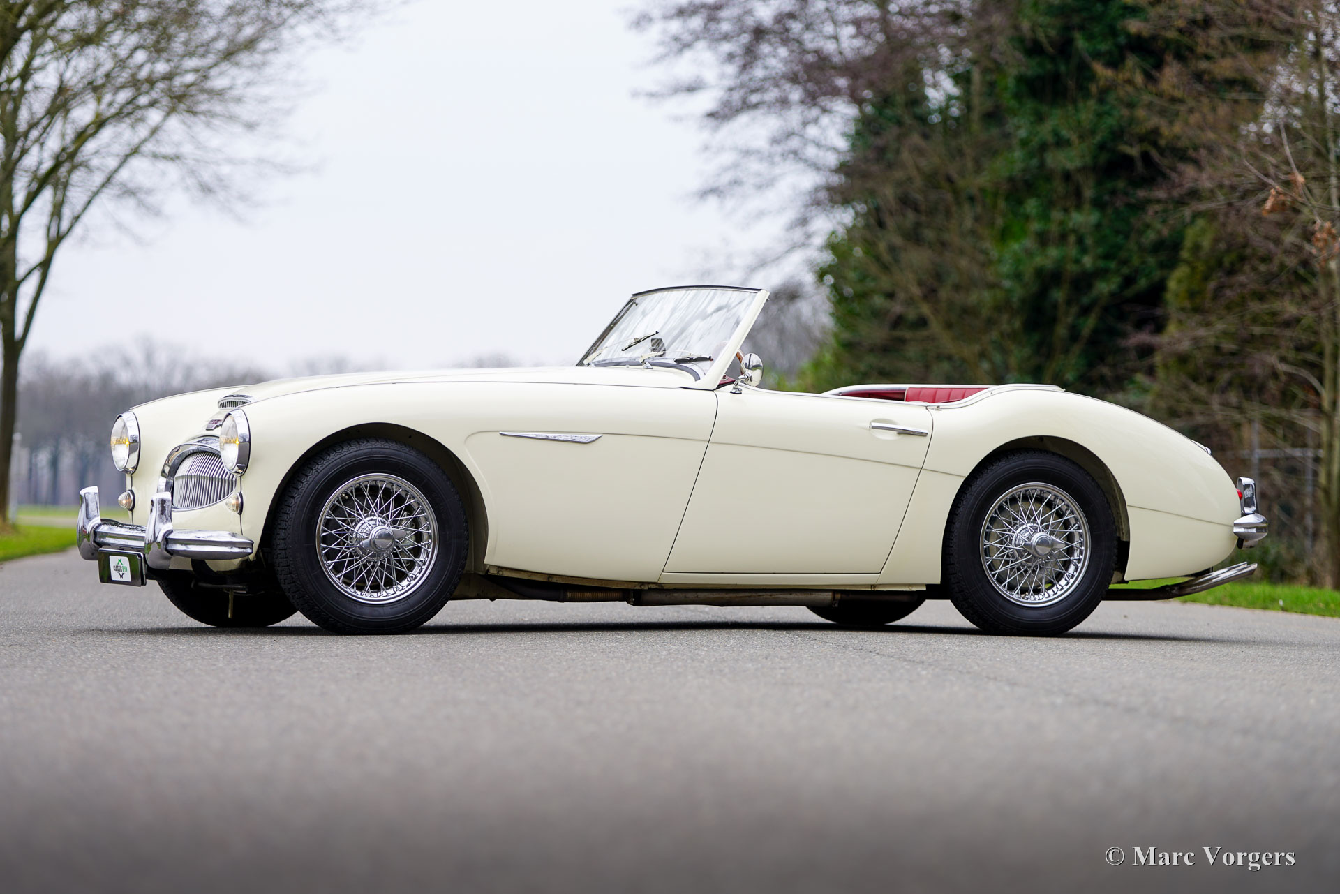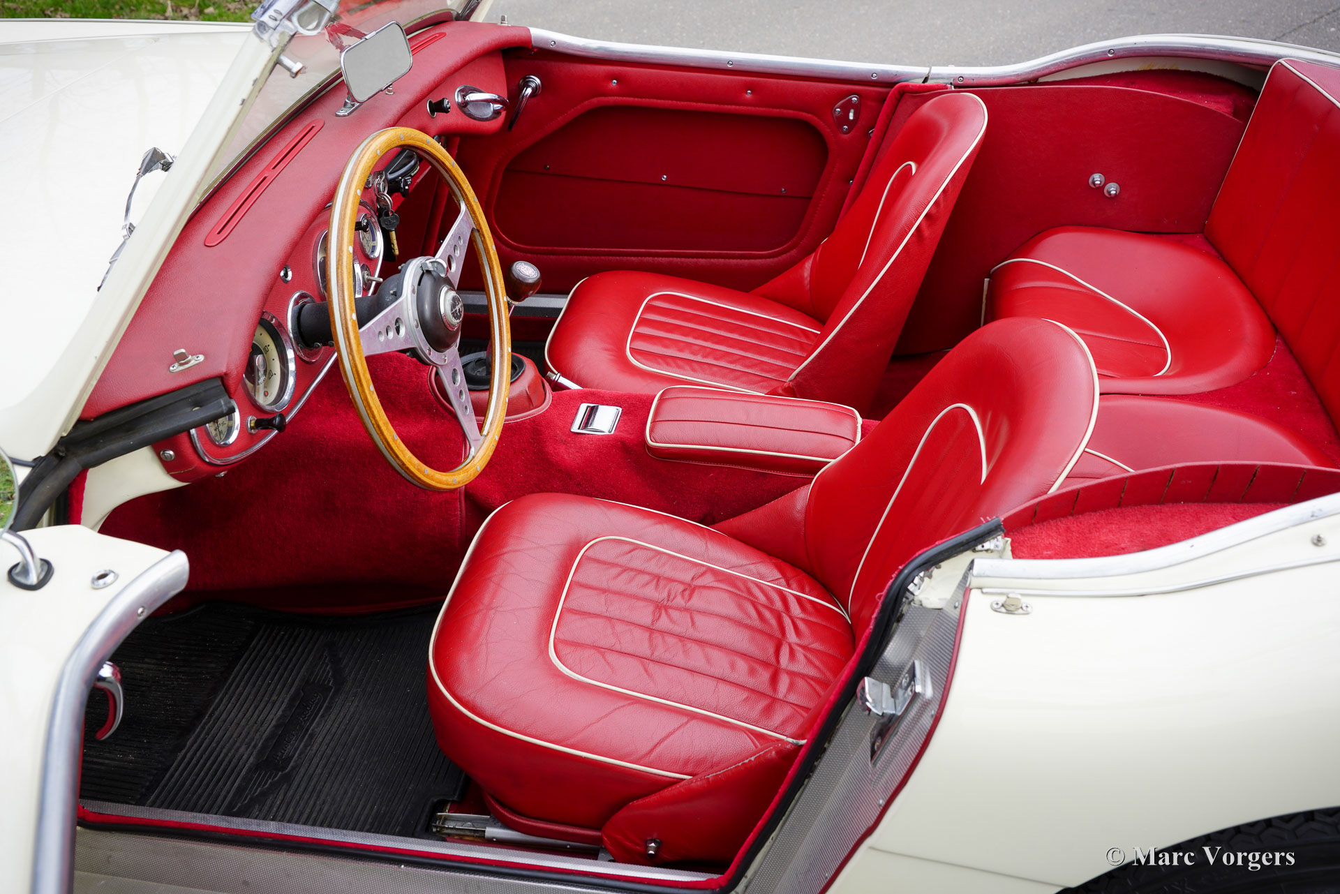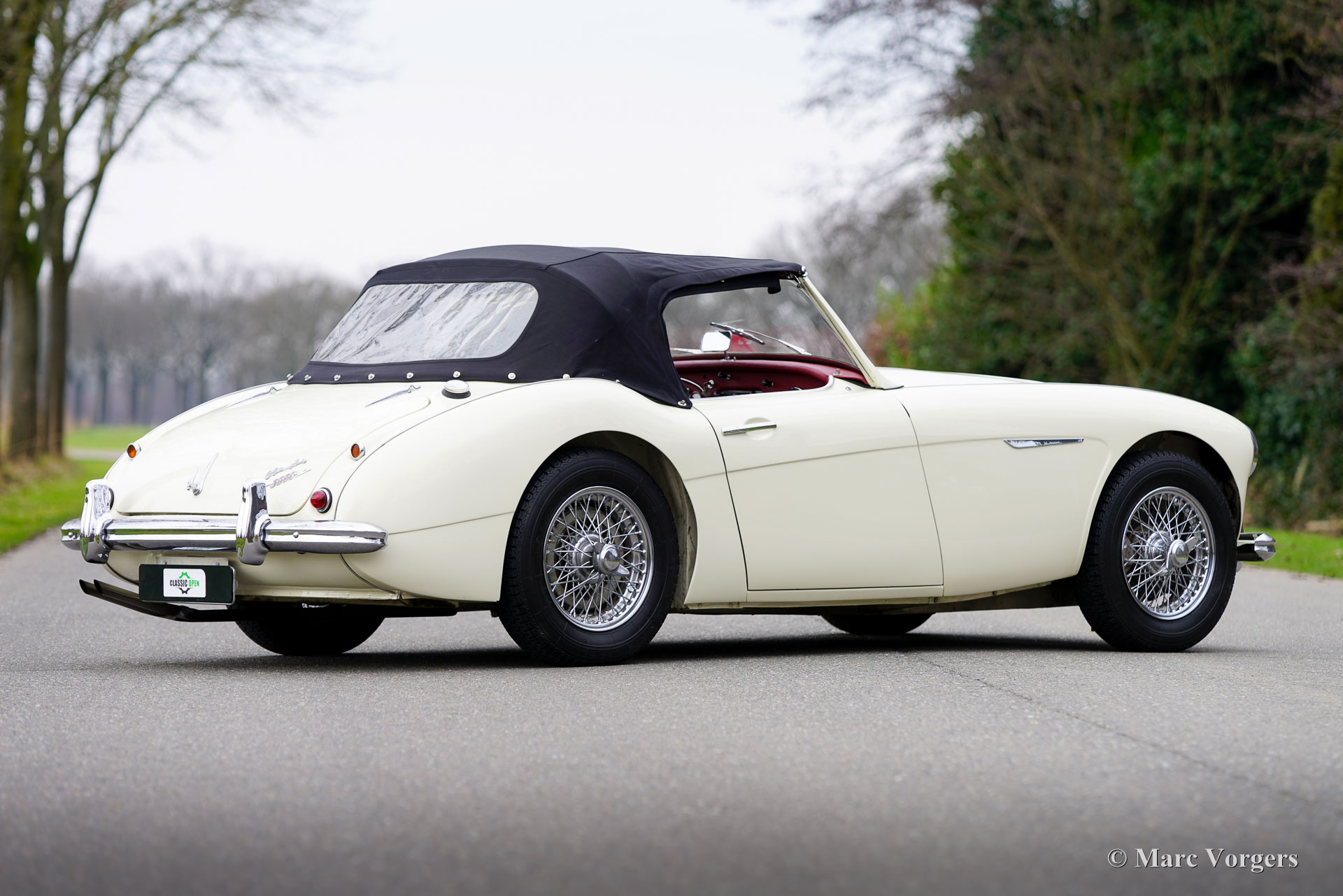 Austin Healey 3000 Mk II (BT7), jaar 1961. Kleur ivoorwit (Ivory White) gecombineerd met een roodlederen interieur afgewerkt met witte biezen, rood tapijt en zwarte rubberen beschermmatten. Zwarte mohair soft-top, een zwarte vinyl tonneau cover en aluminium zijschermen. Deze prachtige Austin Healey 3000 Mk II is een zeldzamere versie met drie carburateurs waarvan er in 1961 en 1962 slechts 5069 zijn gebouwd. De 3-liter zes-in-lijn motor levert een stevige 132 pk en klinkt fantastisch! Dit prachtige Britse icoon is ca. 20 jaar geleden in Nederland uitvoerig gerestaureerd. De auto verkeert in een zeer goede tot excellente conditie en de auto rijdt geweldig! De carrosserie toont een perfecte passing van het plaatwerk, prachtige lak en schitterend chroom. Het interieur vertoont slechts de kleinste tekenen gebruik. Zoals u op de foto's kunt zien, zijn de wielkasten schoon en wit vanbinnen. Deze ‘Big Healey’ toont verbluffende originele details en de auto is uitgerust met chromen spaakwielen, overdrive en K&N sportluchtfilters. Deze geweldige Britse klassieker wordt geleverd met een uitgebreid historiebestand, een Heritage-certificaat en een bestuurdershandboek. Deze Austin Healey 3000 biedt de gespierde en opwindende klassieke Britse rijervaring en is uw toegangsticket voor vele klassieke auto-evenementen en (tour-/regelmatigheid) rally's in binnen- en buitenland.