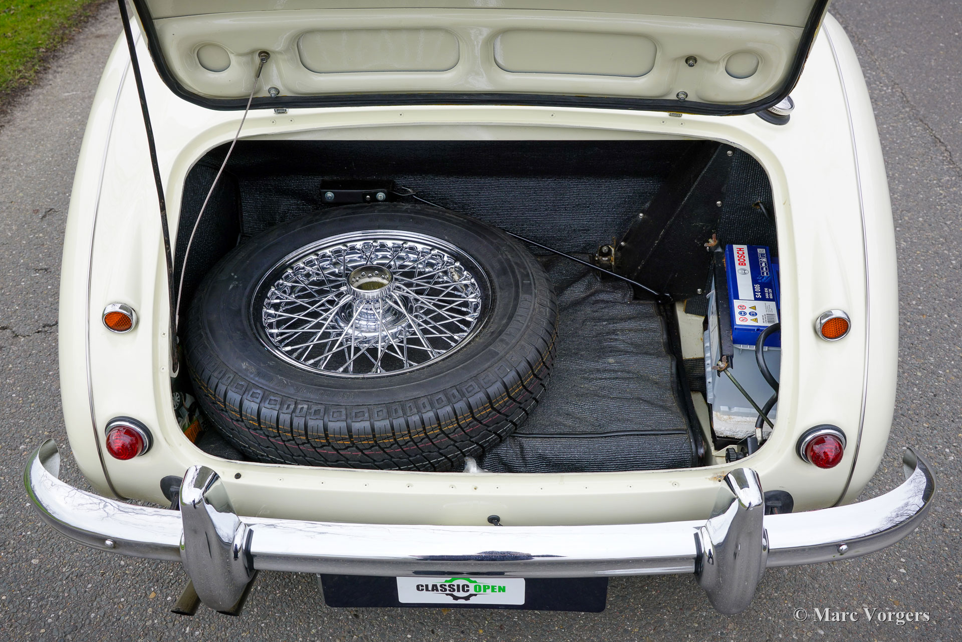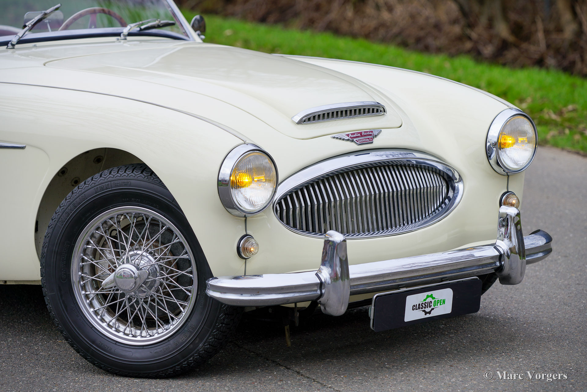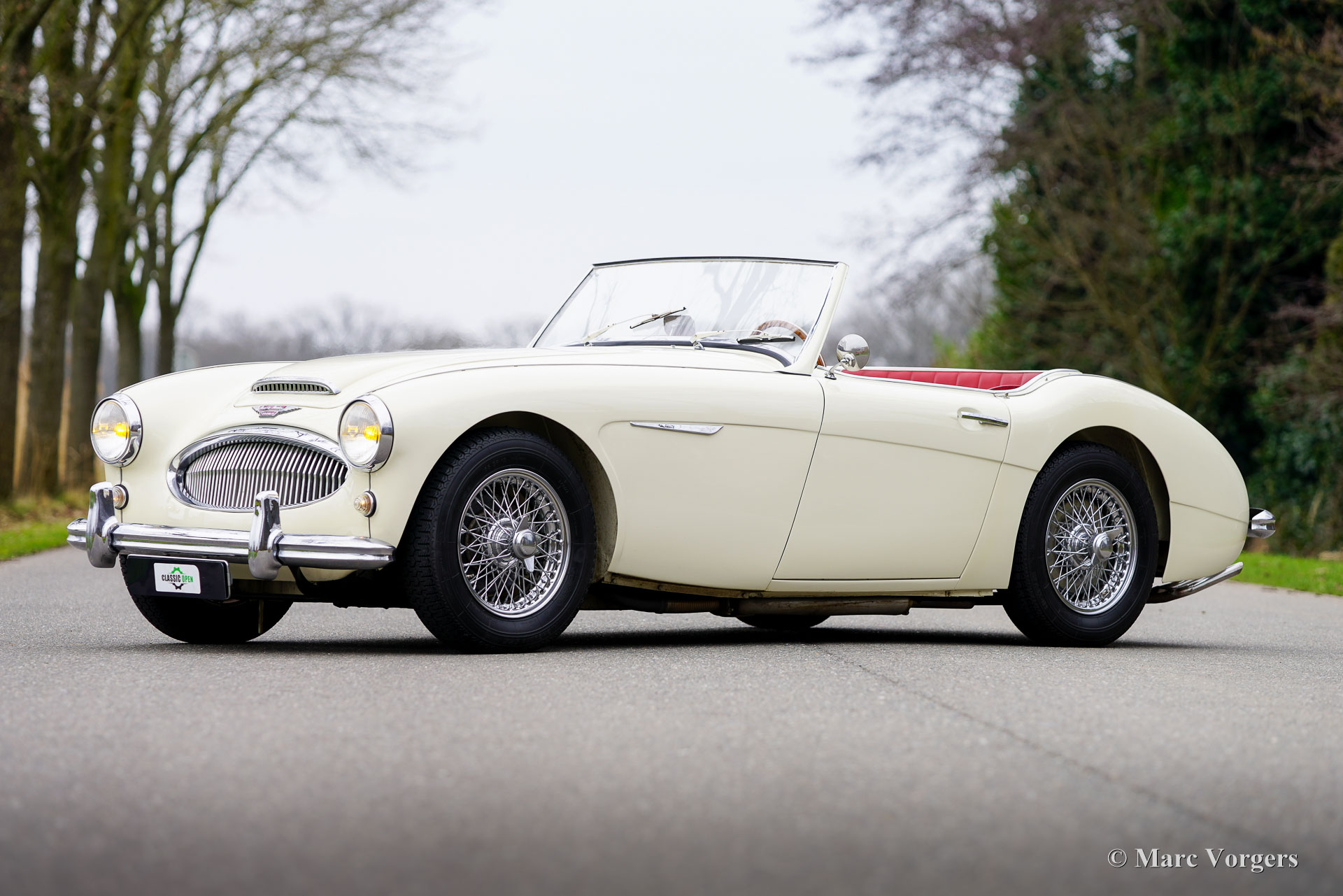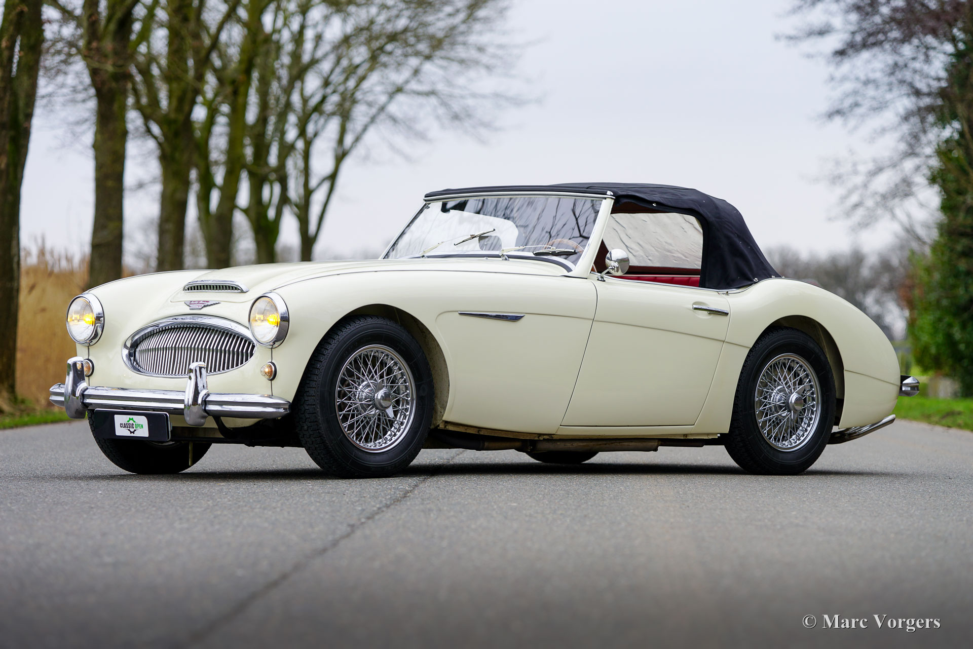 Austin Healey 3000 Mk II (BT7), jaar 1961. Kleur ivoorwit (Ivory White) gecombineerd met een roodlederen interieur afgewerkt met witte biezen, rood tapijt en zwarte rubberen beschermmatten. Zwarte mohair soft-top, een zwarte vinyl tonneau cover en aluminium zijschermen. Deze prachtige Austin Healey 3000 Mk II is een zeldzamere versie met drie carburateurs waarvan er in 1961 en 1962 slechts 5069 zijn gebouwd. De 3-liter zes-in-lijn motor levert een stevige 132 pk en klinkt fantastisch! Dit prachtige Britse icoon is ca. 20 jaar geleden in Nederland uitvoerig gerestaureerd. De auto verkeert in een zeer goede tot excellente conditie en de auto rijdt geweldig! De carrosserie toont een perfecte passing van het plaatwerk, prachtige lak en schitterend chroom. Het interieur vertoont slechts de kleinste tekenen gebruik. Zoals u op de foto's kunt zien, zijn de wielkasten schoon en wit vanbinnen. Deze ‘Big Healey’ toont verbluffende originele details en de auto is uitgerust met chromen spaakwielen, overdrive en K&N sportluchtfilters. Deze geweldige Britse klassieker wordt geleverd met een uitgebreid historiebestand, een Heritage-certificaat en een bestuurdershandboek. Deze Austin Healey 3000 biedt de gespierde en opwindende klassieke Britse rijervaring en is uw toegangsticket voor vele klassieke auto-evenementen en (tour-/regelmatigheid) rally's in binnen- en buitenland.
