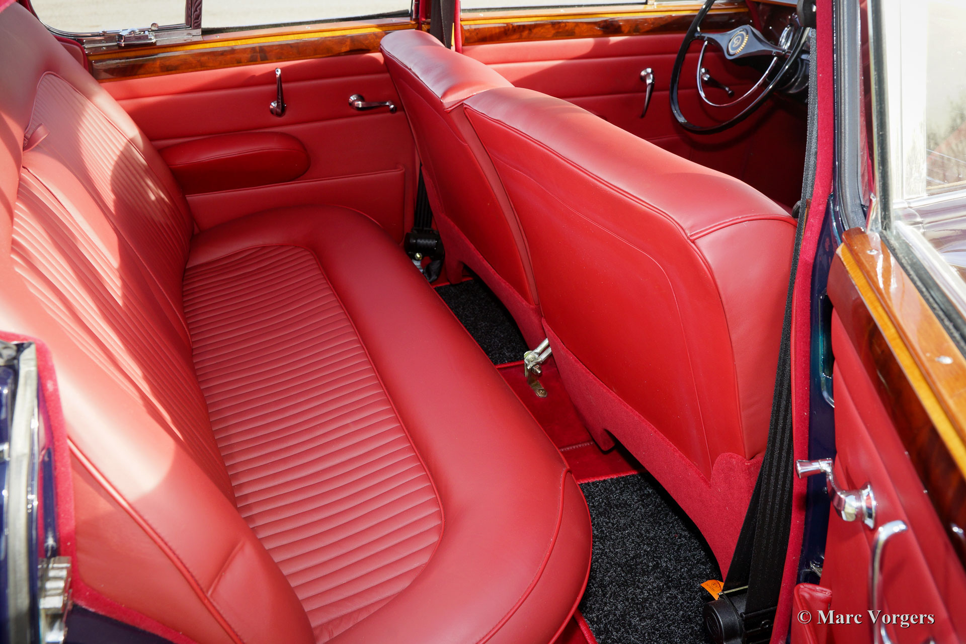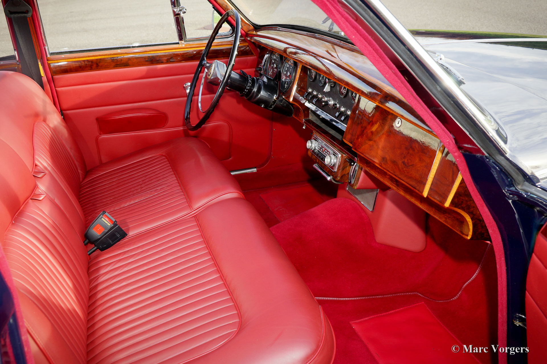 Daimler V8 2.5 Litre saloon, jaar 1965. Kleur donkerblauw met een roodlederen interieur en rood tapijt. Deze geweldige Daimler V8 verkeert in excellente staat. De automobiel werd perfect nieuw gespoten en voorzien van een prachtig nieuw interieur. Het chroom is oogverblindend fraai net als de overige detaillering. De Daimler V8 2.5 Litre is het zustermodel van de Jaguar Mk II uitgerust met een eigen Daimler V8 motor, een eigen grille en luxueuze Daimler detaillering. De automobiel is uitgerust met een perfect schakelende automatische versnellingsbak, stuurbekrachtiging en rembekrachtiging, deze Daimler rijdt zeer comfortabel en de motor produceert en prachtig geluid. De auto is verder voorzien van een elektrische koelventilator en chroom spaakwielen. Een prachtig exemplaar!