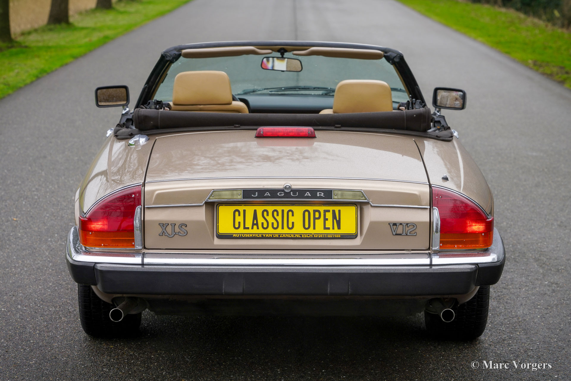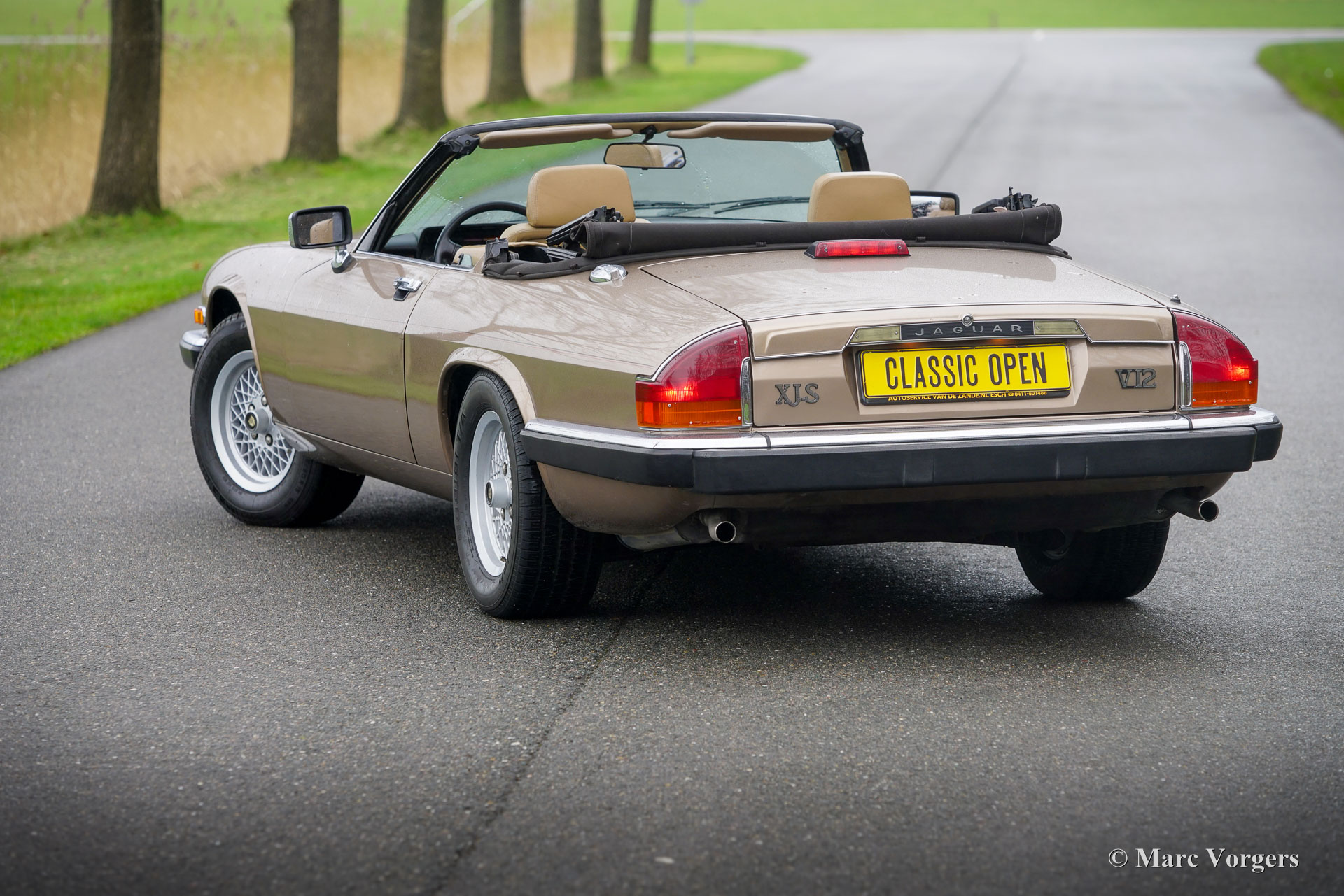 Jaguar XJS V12 Convertible, jaar 1990. Kleur lichtbruin metallic gecombineerd met een beige lederen interieur, bruin tapijt en beige beschermmatten. Donkerbruine mohair cabrioletkap. Deze majestueuze Jaguar XJS Convertible is nieuw verkocht in de VS. Enkele jaren geleden is de auto geïmporteerd in Nederland. Vanaf nieuw heeft de auto slechts 96.000 mijlen gereden. Deze fraaie Jaguar verkeert in een zeer goede staat en is geheel roestvrij! De auto rijdt perfect, de V12-motor loopt soepel en krachtig, de versnellingsbak schakelt zeer goed en de stuurbekrachtiging is een genot. Recentelijk heeft de XJS een uitgebreide onderhoudsbeurt gehad, waarbij onder andere het stuurhuis en de remmen zijn gereviseerd en de kleppen zijn gesteld. Deze Jaguar XJS cabriolet is een zeer originele auto, de auto vertoont lichte sporen van gebruik en het originele interieur is zeer netjes voor zijn leeftijd! De elektrisch-hydraulisch bediende kap werkt feilloos. Deze Jaguar XJS Convertible is een zeer begeerlijke klassieke Gran Turismo met open dak!