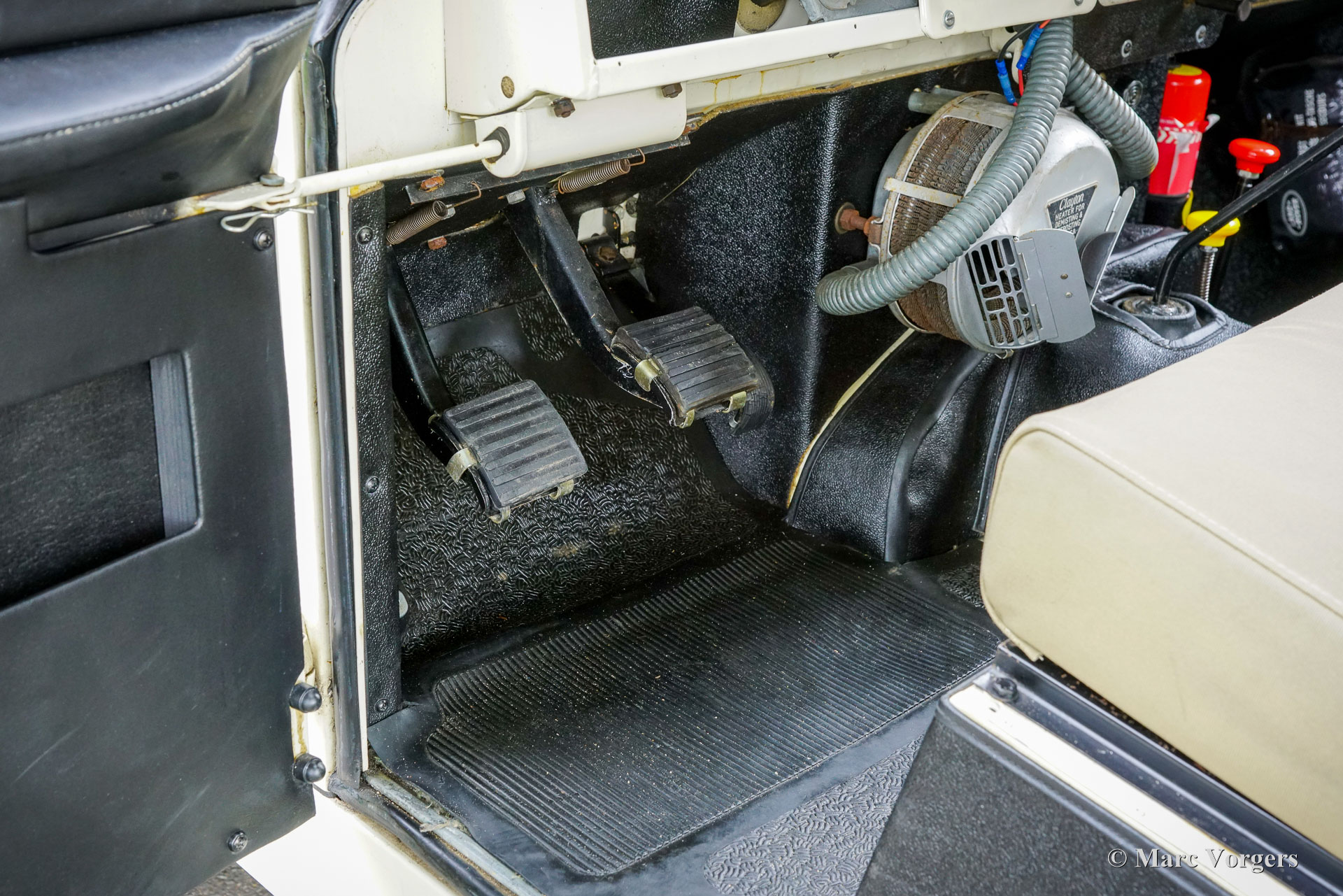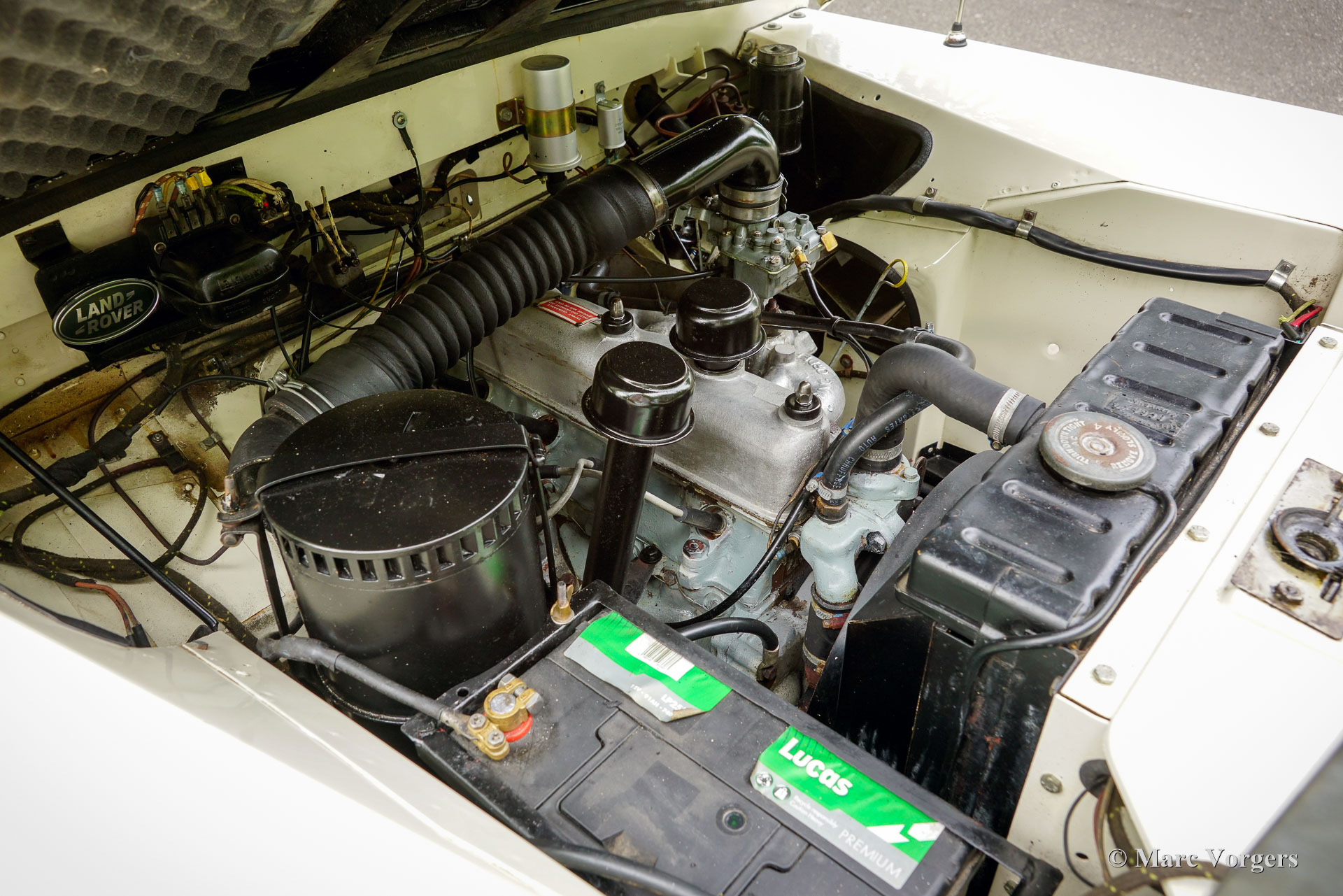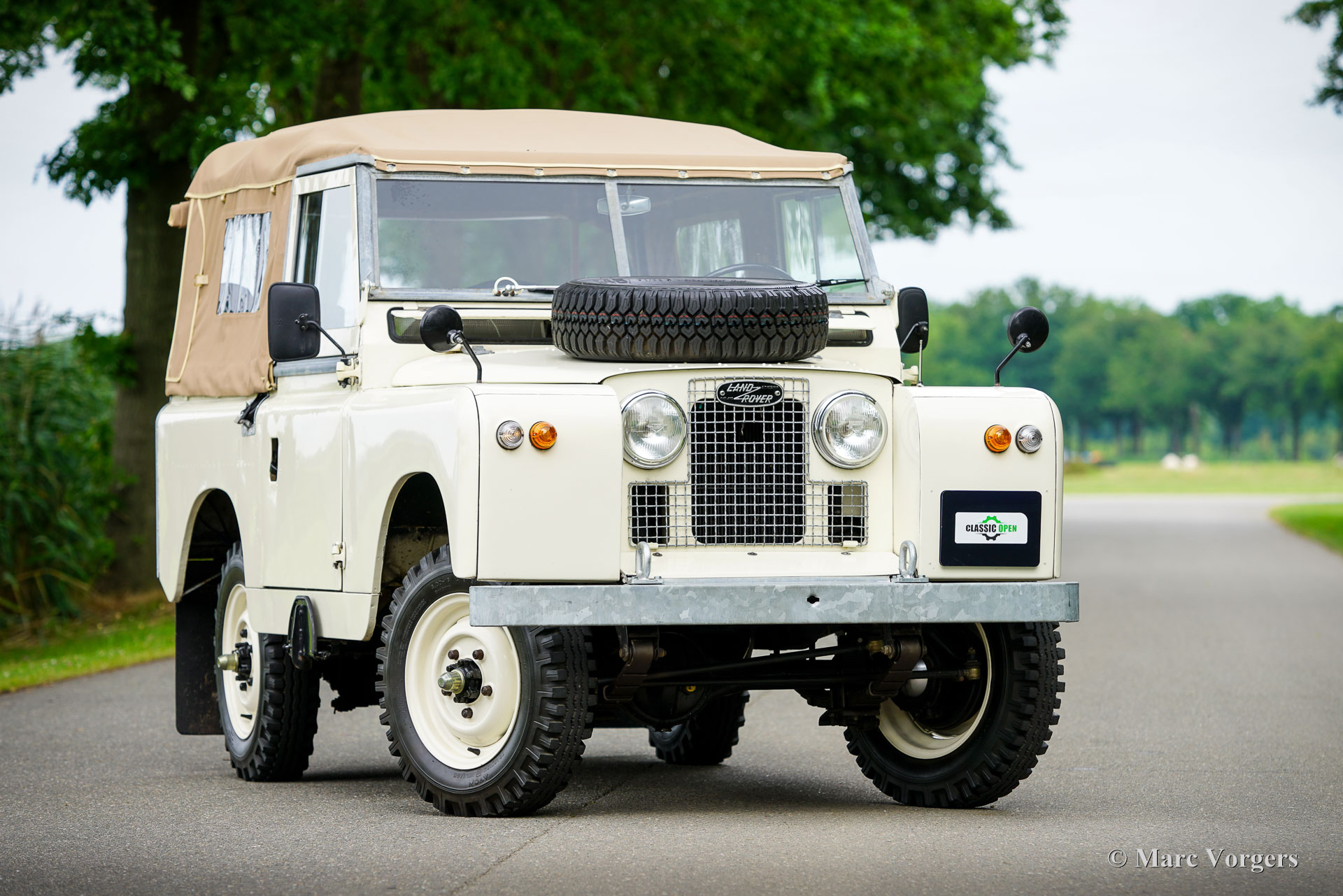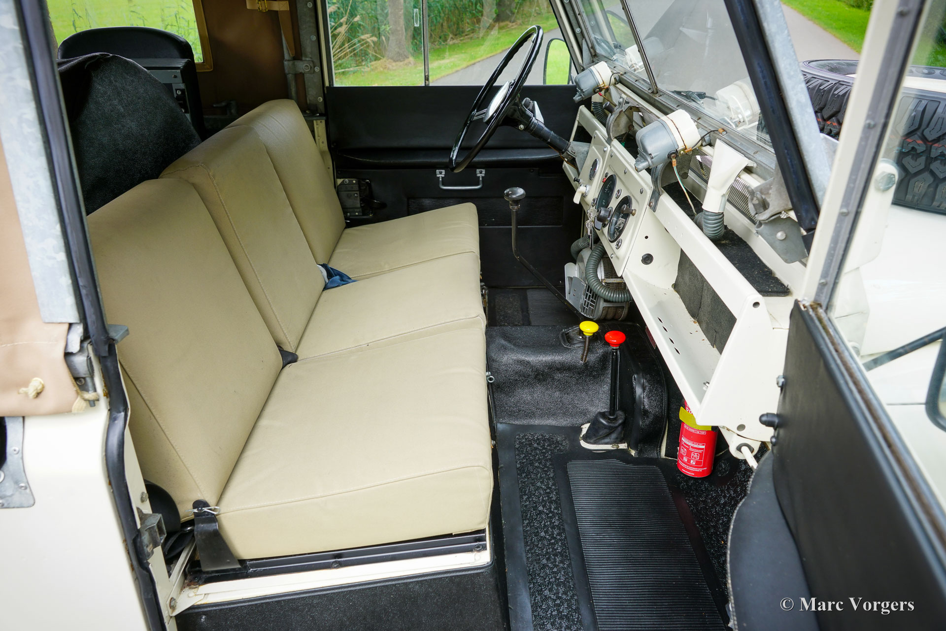 Land Rover 88 serie 2, jaar 1958. Kleur gebroken wit gecombineerd met lichtbeige bekleding voorin, zwart vinyl bekleding achterin, en zwart rubber vloerbedekking. Beige soft-top. Deze prachtige een zeer origineel ogende Land Rover 88 is nieuw verkocht in Nederland. De huidige eigenaar kocht de auto ruim 25 jaar geleden. Na aankoop is de auto uitvoerig gerestaureerd naar de huidige zeer goede en mooie staat. De originele 2 liter motor is vervangen voor een krachtigere 2,25 liter versie uit een serie 3, verder is de auto geheel volgens de serie 2 specificaties. Deze geweldige Land Rover 88 rijdt uitstekend, de krachtige viercilinder benzinemotor loopt soepel en de versnellingsbak met lange pook schakelt zoals het hoort. Het interieur is eenvoudig op het Spartaanse af maar dat hoort bij een functioneel werkpaard als de Land Rover. De terugvallende grille met daarop de twee koplampen is kenmerkend voor de vroege Land Rover modellen. Het reservewiel op de motorkap, de uitklapbare opstapjes bij de deuren en de opstap aan de achterkant geven ook aan dat het om een klassieke Land Rover gaat. Achterin is er bij deze Land Rover nog een reservewiel gemonteerd, deze kan er eenvoudig uitgehaald worden. Deze Land Rover ademt avontuur, het mooie is dat deze auto is voorzien van vier extra zitplaatsen achterin waardoor er met 7 personen volop kan worden genoten van de rit, de auto, en van het gezelschap. Dit is een geweldige Land Rover 88 in zeer goede conditie, een pracht auto voor avonturiers die zich niet altijd op gebaande paden willen begeven.