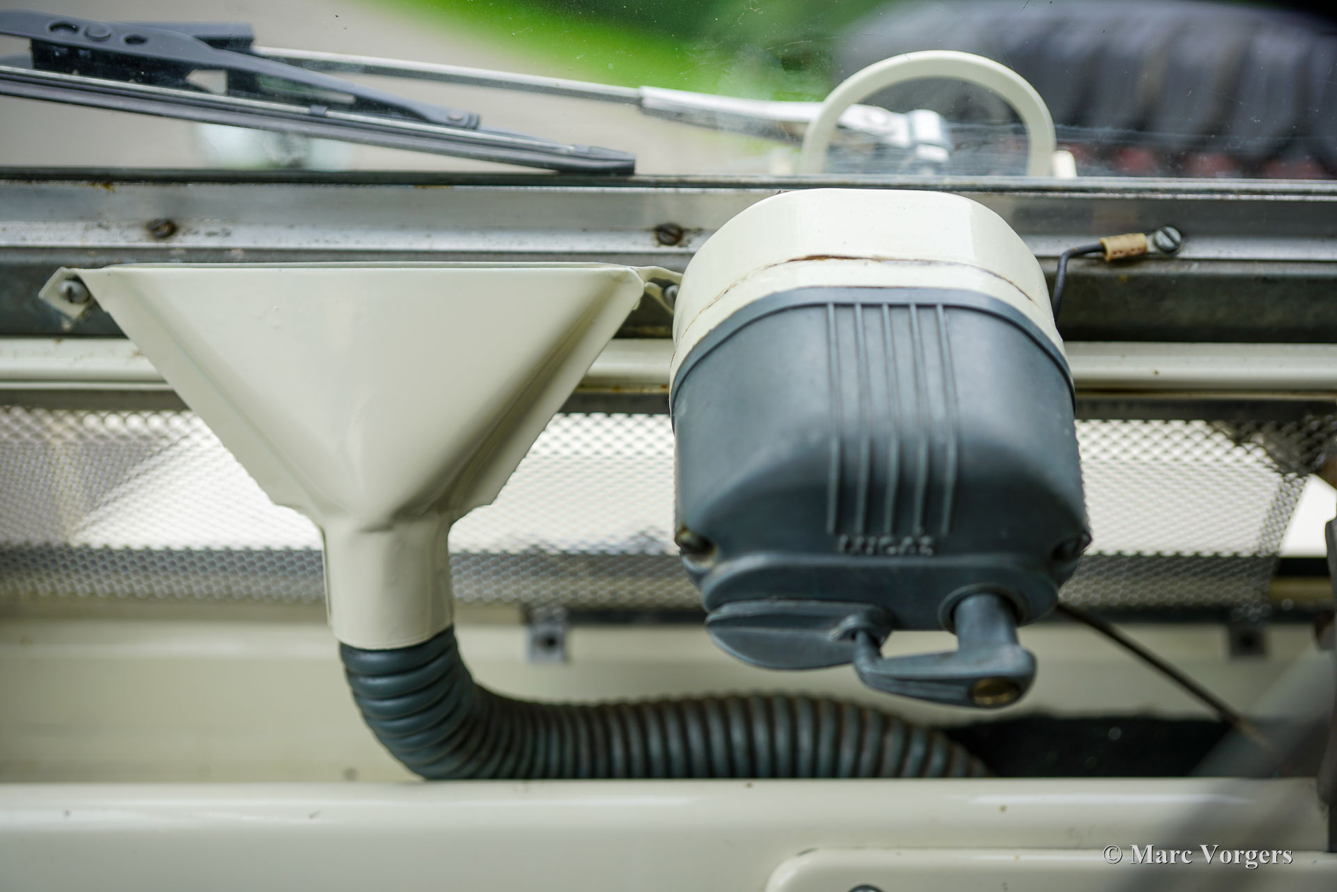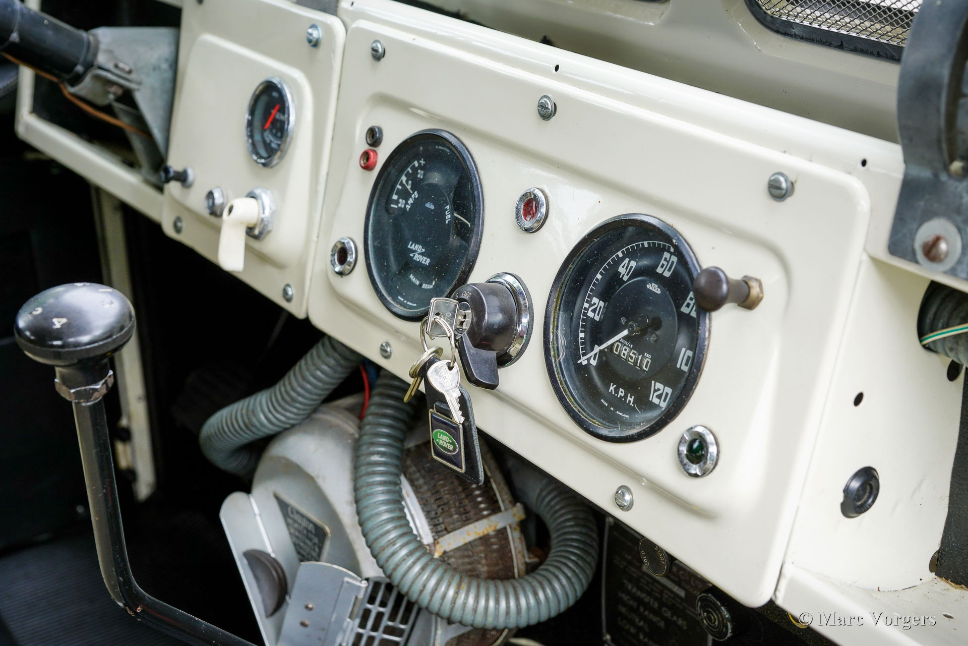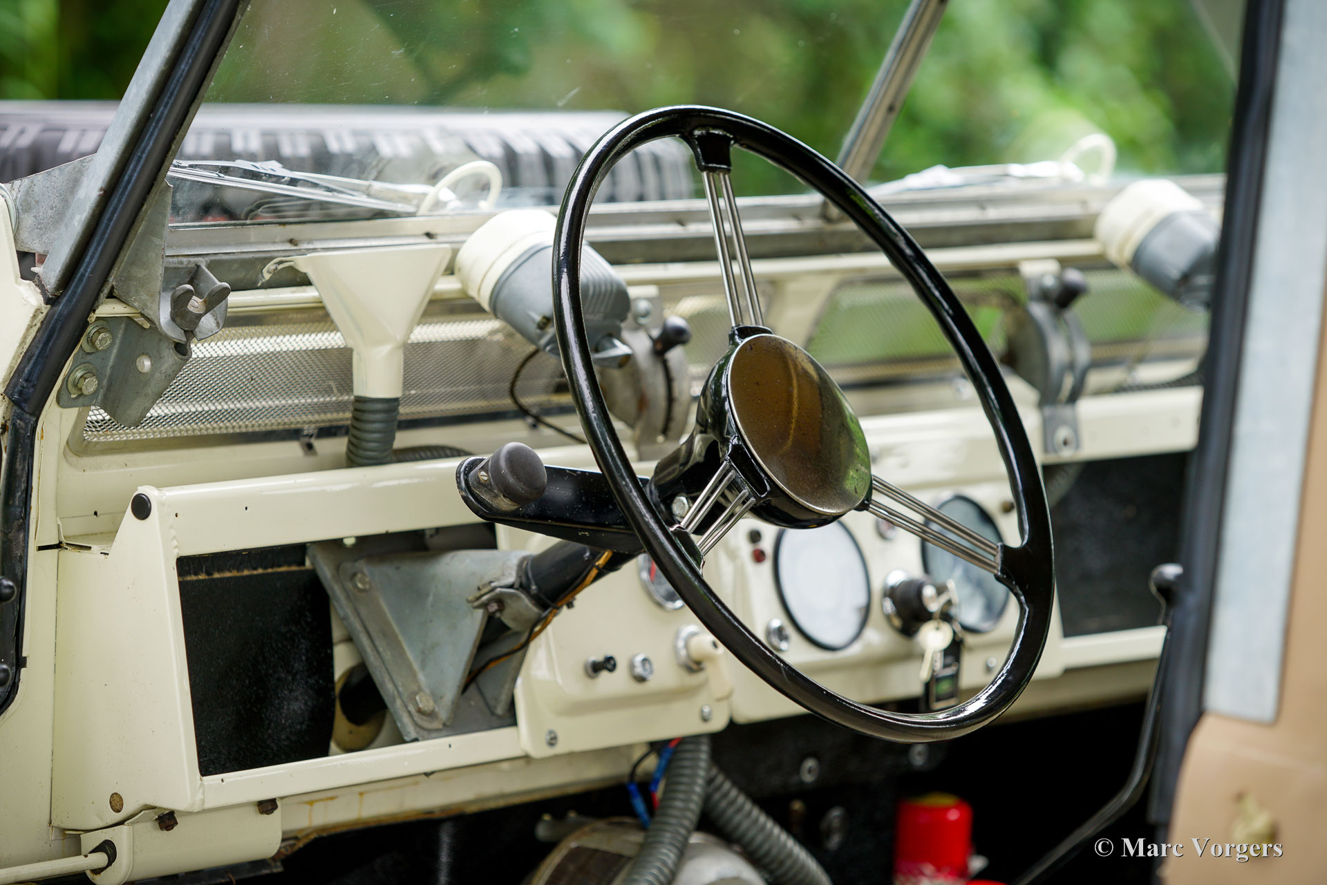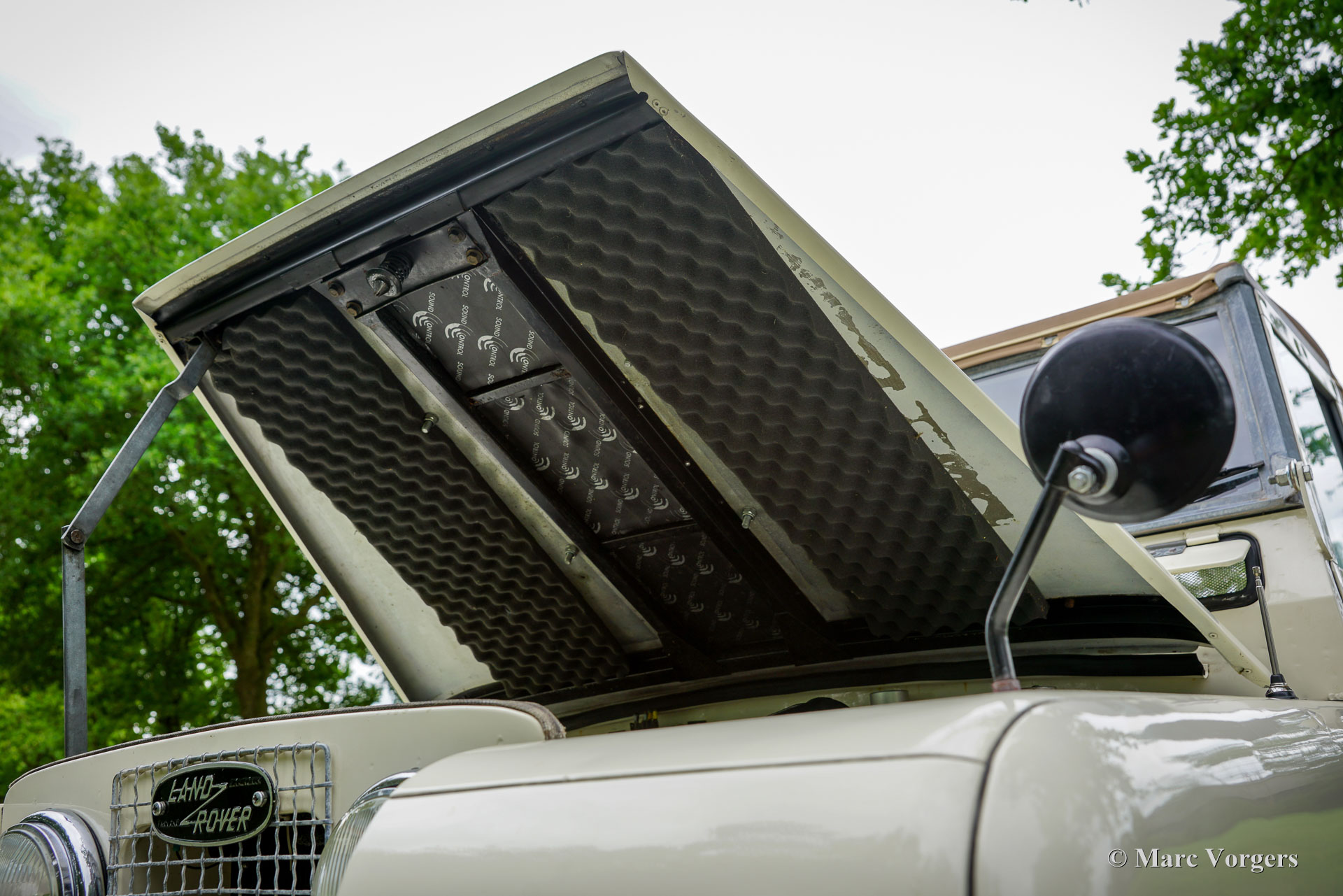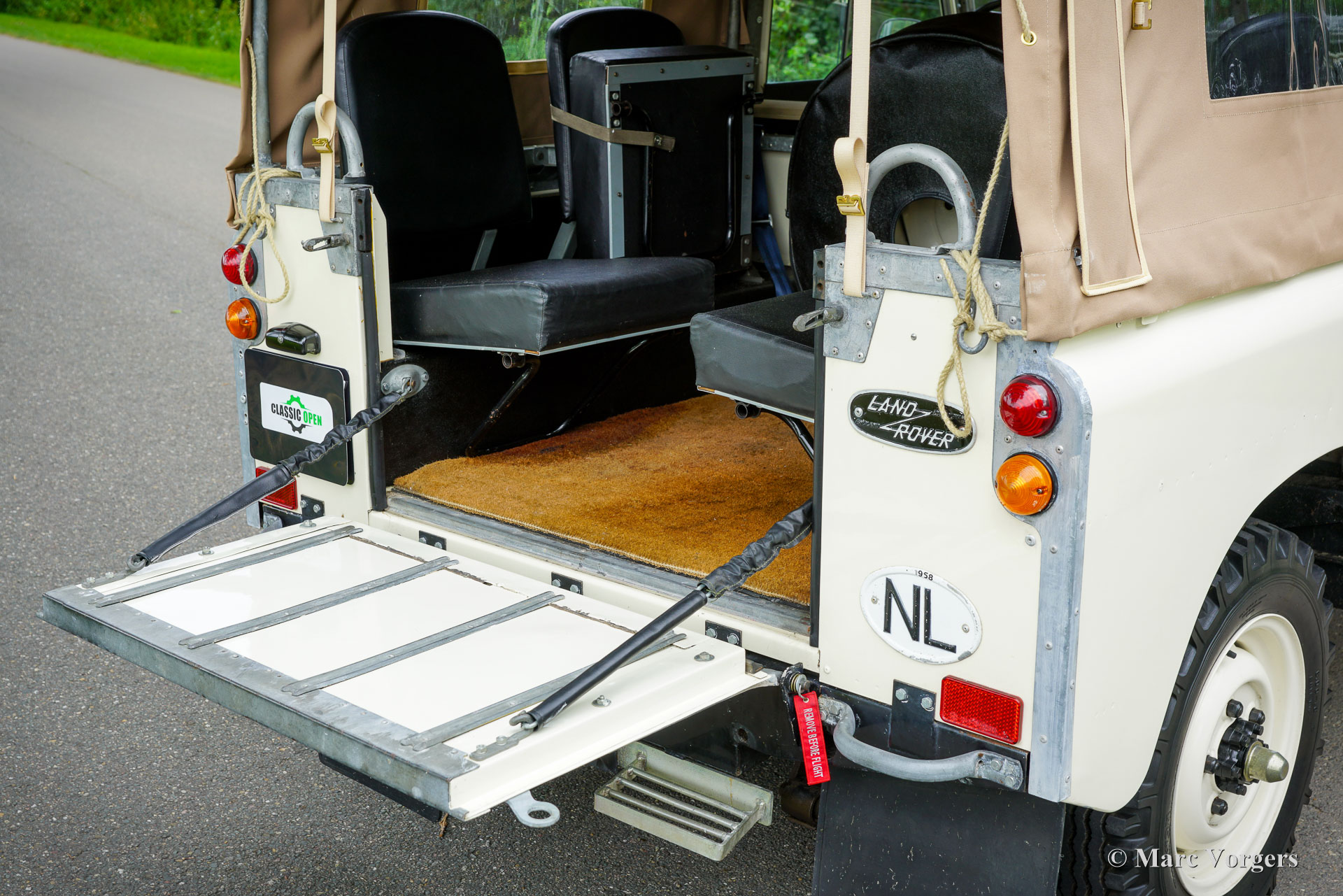 Land Rover 88 serie 2, jaar 1958. Kleur gebroken wit gecombineerd met lichtbeige bekleding voorin, zwart vinyl bekleding achterin, en zwart rubber vloerbedekking. Beige soft-top. Deze prachtige een zeer origineel ogende Land Rover 88 is nieuw verkocht in Nederland. De huidige eigenaar kocht de auto ruim 25 jaar geleden. Na aankoop is de auto uitvoerig gerestaureerd naar de huidige zeer goede en mooie staat. De originele 2 liter motor is vervangen voor een krachtigere 2,25 liter versie uit een serie 3, verder is de auto geheel volgens de serie 2 specificaties. Deze geweldige Land Rover 88 rijdt uitstekend, de krachtige viercilinder benzinemotor loopt soepel en de versnellingsbak met lange pook schakelt zoals het hoort. Het interieur is eenvoudig op het Spartaanse af maar dat hoort bij een functioneel werkpaard als de Land Rover. De terugvallende grille met daarop de twee koplampen is kenmerkend voor de vroege Land Rover modellen. Het reservewiel op de motorkap, de uitklapbare opstapjes bij de deuren en de opstap aan de achterkant geven ook aan dat het om een klassieke Land Rover gaat. Achterin is er bij deze Land Rover nog een reservewiel gemonteerd, deze kan er eenvoudig uitgehaald worden. Deze Land Rover ademt avontuur, het mooie is dat deze auto is voorzien van vier extra zitplaatsen achterin waardoor er met 7 personen volop kan worden genoten van de rit, de auto, en van het gezelschap. Dit is een geweldige Land Rover 88 in zeer goede conditie, een pracht auto voor avonturiers die zich niet altijd op gebaande paden willen begeven.