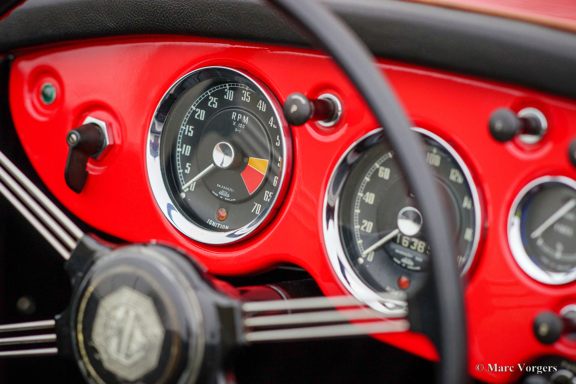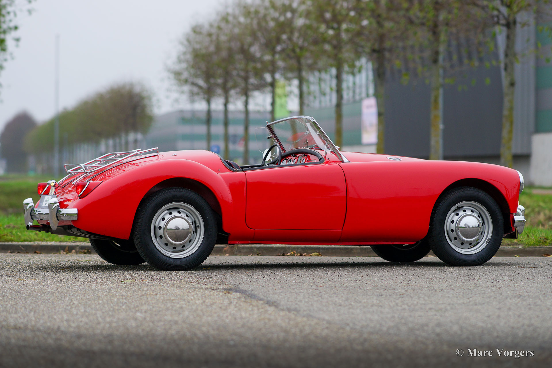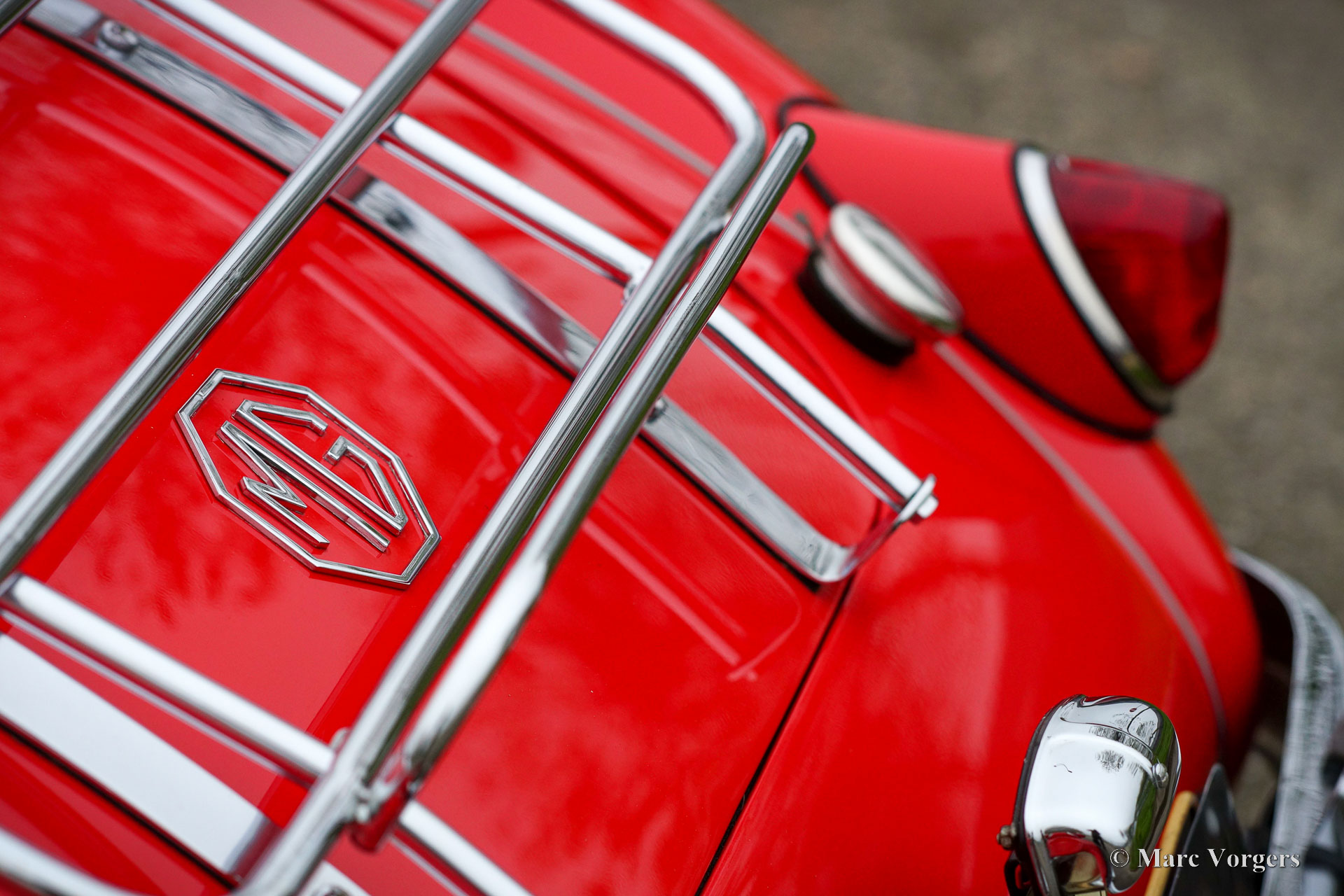 MG MGA 1500 roadster, jaar 1957. Kleur rood (Oriënt red) gecombineerd met een zwart interieur afgewerkt met rode biezen en zwart tapijt. Zwarte vinyl kap, aluminium zijruitframes en een zwarte tonneau cover. Deze prachtige MGA 1500 roadster is nieuw verkocht in Nederland, de auto is nog altijd voorzien van het originele oude Nederlandse kenteken. De laatste eigenaar koestert deze prachtige MGA roadster sinds 1987! Kosten noch moeite zijn gespaard om de auto in sublieme staat te houden! De auto is uitgebreid gerestaureerd en punctueel onderhouden. Een fotoreportage van de restauratie is aanwezig. De geschiedenis is bekend en gedocumenteerd. Deze prachtige MGA roadster toont alle originele details en de auto verkeert in sublieme topstaat! Een mooier en beter rijdend exemplaar is moeilijk te vinden. Waar u ook kijkt, het is duidelijk dat deze MGA met liefde en zorg is onderhouden. Deze fraaie MGA is voorzien van de originele stalen wielen met chromen wieldoppen, het originele stuur en een chromen bagagerek. Deze MGA is een waar pareltje voor de MG-liefhebber!