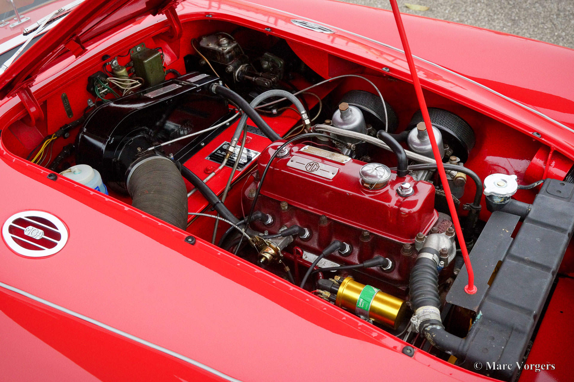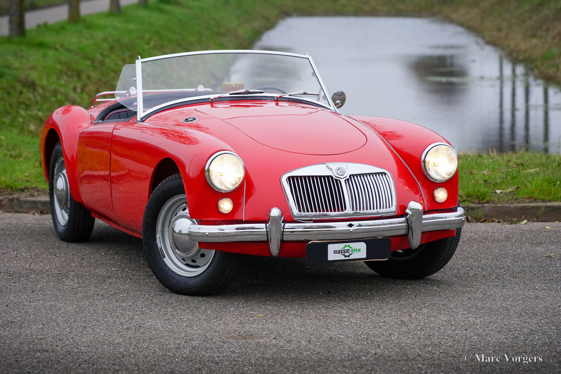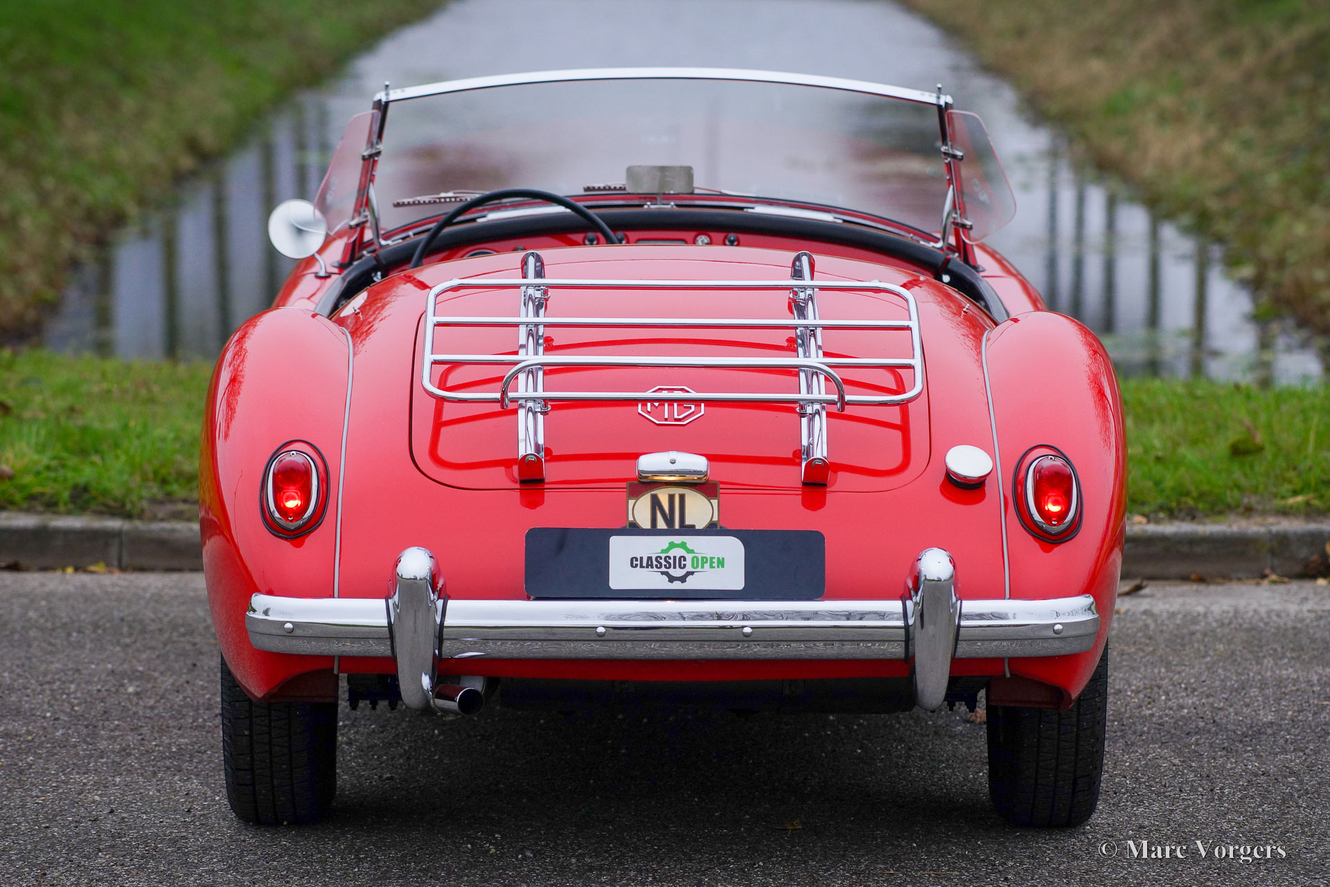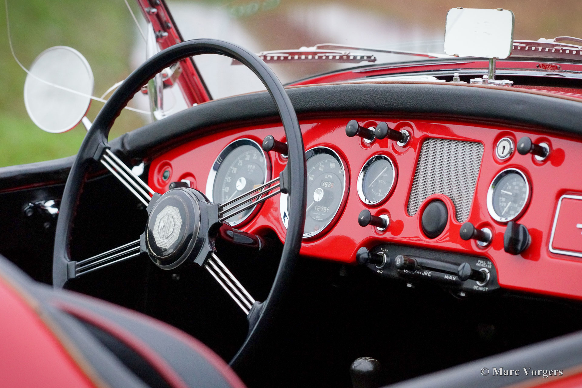 MG MGA 1500 roadster, jaar 1957. Kleur rood (Oriënt red) gecombineerd met een zwart interieur afgewerkt met rode biezen en zwart tapijt. Zwarte vinyl kap, aluminium zijruitframes en een zwarte tonneau cover. Deze prachtige MGA 1500 roadster is nieuw verkocht in Nederland, de auto is nog altijd voorzien van het originele oude Nederlandse kenteken. De laatste eigenaar koestert deze prachtige MGA roadster sinds 1987! Kosten noch moeite zijn gespaard om de auto in sublieme staat te houden! De auto is uitgebreid gerestaureerd en punctueel onderhouden. Een fotoreportage van de restauratie is aanwezig. De geschiedenis is bekend en gedocumenteerd. Deze prachtige MGA roadster toont alle originele details en de auto verkeert in sublieme topstaat! Een mooier en beter rijdend exemplaar is moeilijk te vinden. Waar u ook kijkt, het is duidelijk dat deze MGA met liefde en zorg is onderhouden. Deze fraaie MGA is voorzien van de originele stalen wielen met chromen wieldoppen, het originele stuur en een chromen bagagerek. Deze MGA is een waar pareltje voor de MG-liefhebber!