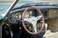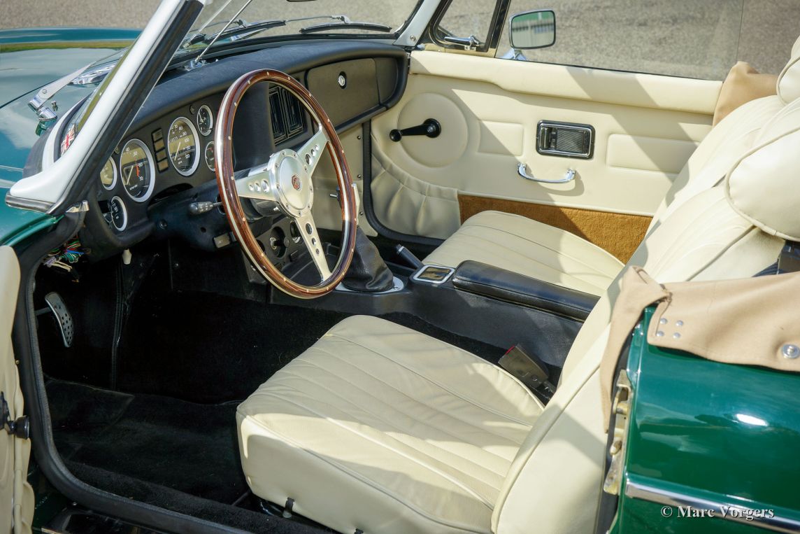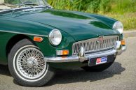 MG MGB roadster, jaar 1977. Kleur British Racing Green gecombineerd met een lichtbeige leren interieur en zwart tapijt. Beige canvas soft-top en hood-cover. Deze MGB werd nieuw verkocht met rubber bumpers. Dit definitieve MGB-model bevat alle verbeteringen die in de loop der jaren aan de MGB zijn doorgevoerd. Deze prachtige MGB is enkele jaren geleden uitvoerig gerestaureerd, de auto verkeert in excellente conditie! De restauratie van de auto en de revisie van de motor zijn gedocumenteerd met vele facturen. Tijdens de restauratie is de auto uitgerust met prachtige chromen bumpers. Deze MGB rijdt uitstekend; sportief en comfortabel. Deze MGB roadster is voorzien van zilverkleurige spaakwielen, overdrive, een verchroomd kofferrek, twee op de portieren gemonteerde achteruitkijkspiegels, een stuurwiel met een houten rand, elektronische ontsteking, rembekrachtiging, tonneau-cover en veiligheidsgordels. Een prachtig exemplaar!