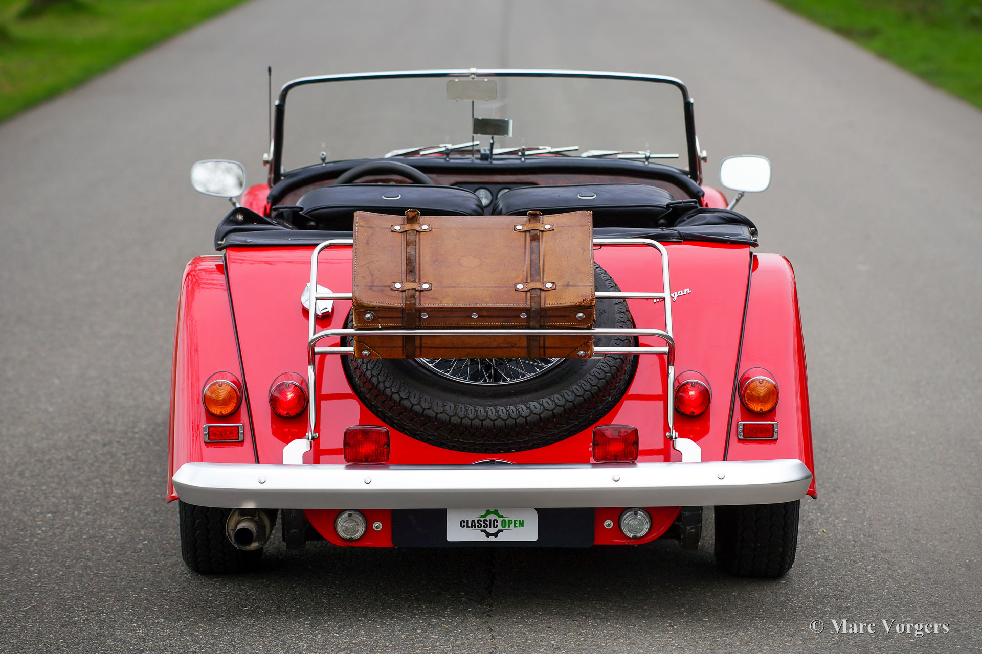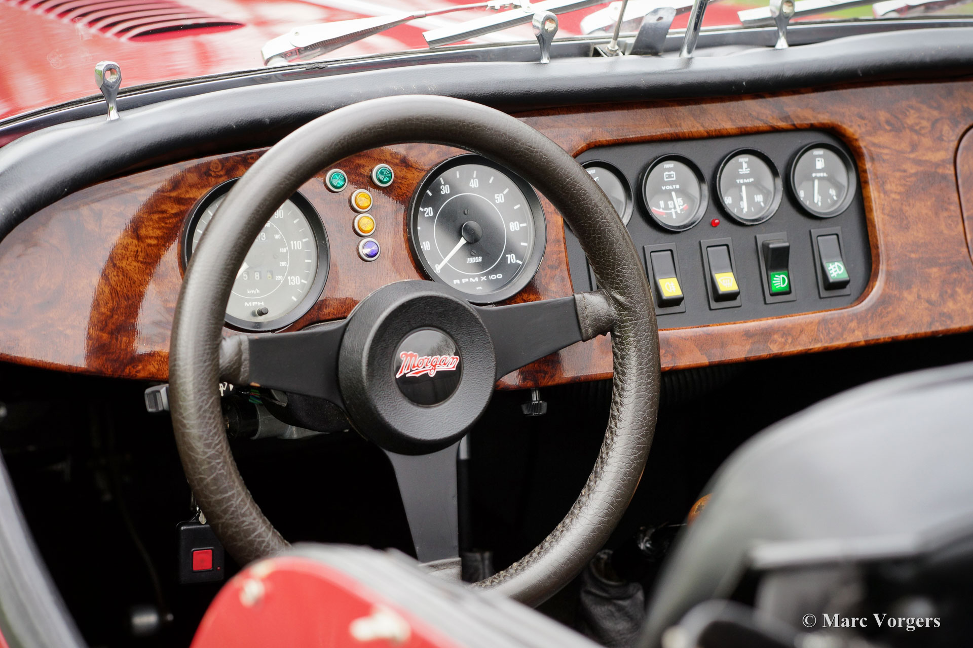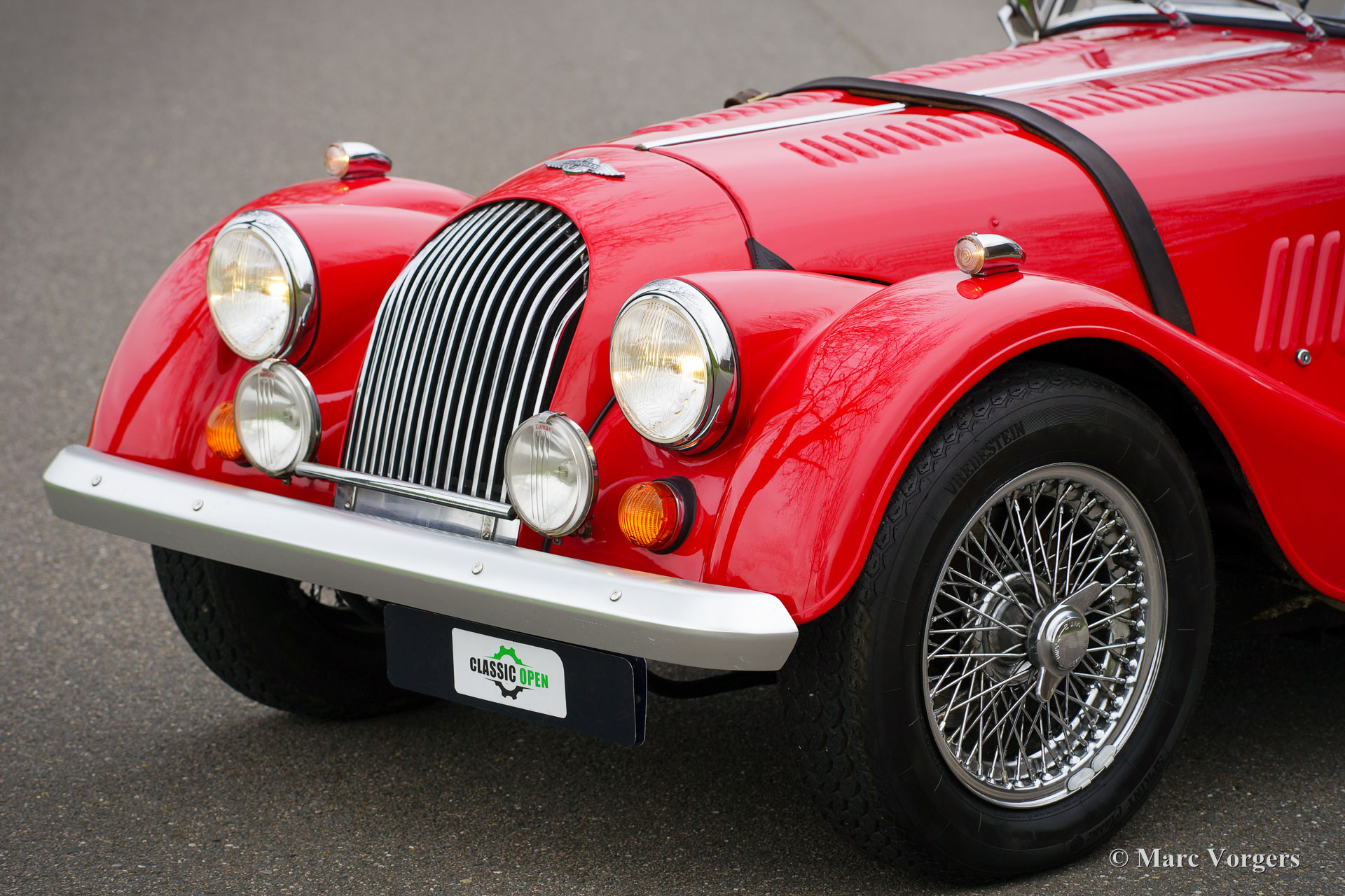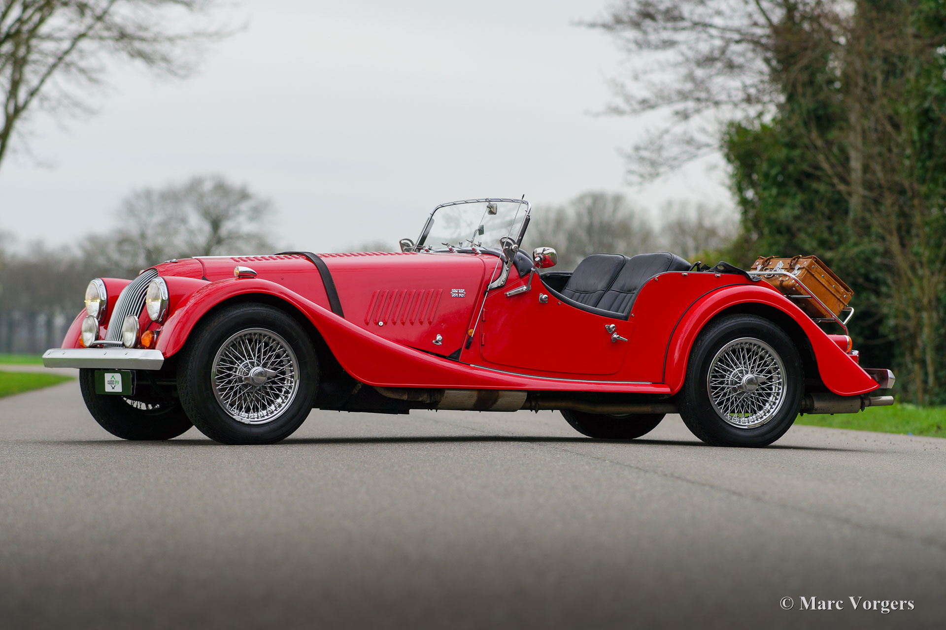 Morgan 4/4, jaar 1989. Kleur rood gecombineerd met een zwartlederen interieur en zwart tapijt. Zwarte soft-top. Deze prachtige Morgan 4/4 is in 1997 uit Engeland geïmporteerd en kort daarna omgebouwd naar linkse besturing. Deze Morgan verkeert in een zeer goede staat en de auto rijdt voortreffelijk. De auto biedt de fantastische open Britse sportwagen rijervaring met een fantastisch uitzicht over een lange motorkap met koelsleuven. De auto is voorzien van prachtige opties zoals chromen spaakwielen met 165-15 banden, twee op de portieren gemonteerde chromen achteruitkijkspiegels, een paar Lumax verstralers aan de voorzijde, een chromen bagagerek, een notenhouten dashboard met bijpassende pookknop, een lederen riem over de motorkap en een afsluitbare benzinevuldop. De voorruit kan neergeklapt worden, beugels zijn aanwezig om de twee aerodynamische “Brooklands” race ruiten te monteren. Deze fraaie Morgan 4/4 is voorzien van de 1600 cc Ford (CVH) viercilinder motor, een handgeschakelde vijfversnellingsbak en schijfremmen aan de voorwielen. Dit is een fantastische Morgan 4/4 in een zeer goede staat die de nieuwe eigenaar vele jaren klassiek rijplezier zal bezorgen!