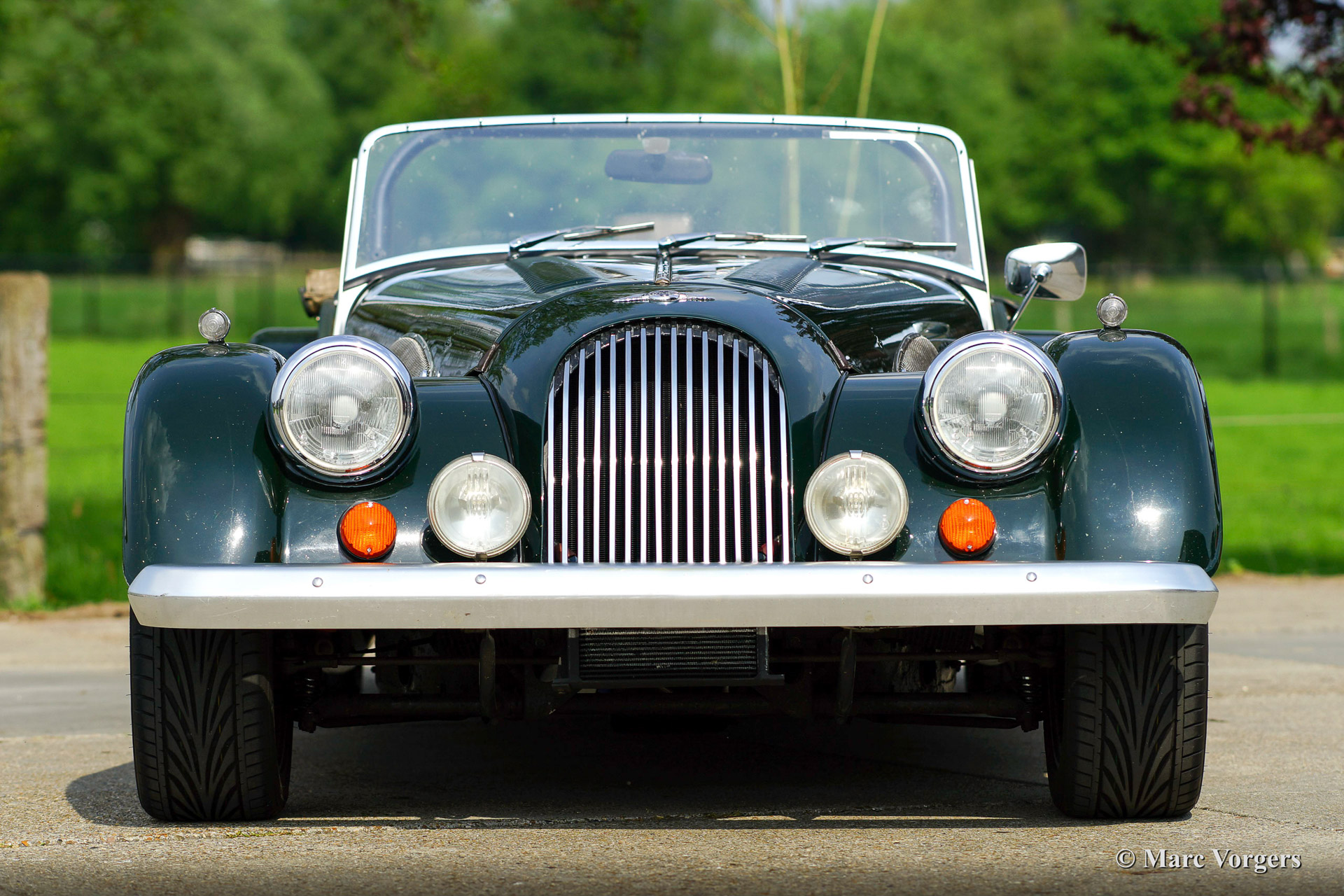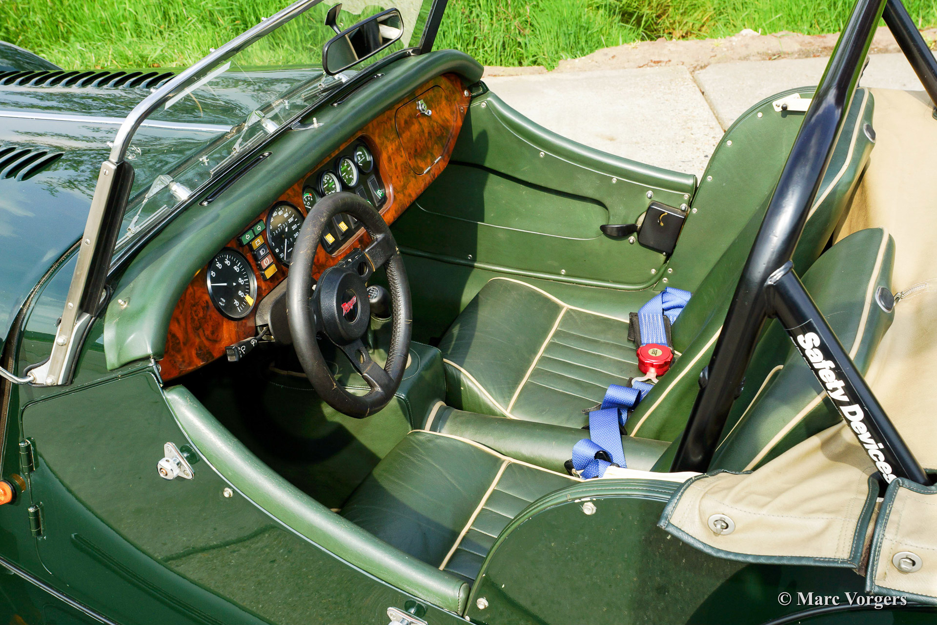 Morgan +8, bouwjaar 1987. Kleur donker 'British Racing Green' met een groen lederen interieur afgebiest met crème 'piping'. Crème vinyl tonneau cover. Deze indrukwekkende Morgan werd nieuw geleverd in Nederland. De auto is afkomstig van de eerste eigenaar die 46.000 onvergetelijke kilometers met de auto heeft afgelegd. De auto is in excellente originele staat! In de vroege jaren 1990, toen de auto 1200 kilometer gereden had, heeft de eigenaar de auto op sublieme wijze laten tunen door Colin Musgrove Racing in Engeland. De cilinderinhoud van de Rover 3.9 Litre V8 werd vergroot naar 4.5 liter. De motor werd voorzien van speciale Cosworth zuigers, een gesmede 'Crane' krukas, een sport nokkenas, grotere kleppen, een lichter vliegwiel, een dubbel uitgevoerd 'Plenum' inlaatspruitstuk en een speciaal 'free flow' uitlaatsysteem. Het motorblok werd tevens uitvoerig verstevigd. Met 295 (!) gemeten pk's aan de achterwielen accelereert deze +8 van 0-100 km/h in 4.2 seconden: super car niveau! Uiteraard werden het onderstel en de remmen aangepast naar het toegenomen vermogen. De achterwielophanging is voorzien van een Panhard stang, 'anti-tramp' stangen en de auto heeft Koni schokdempers rondom. De originele remmen zijn vervangen door geventileerde schijfremmen rondom en de extra stopkracht wordt opgewekt door AP race remzadels. Voor extra veiligheid zijn er een stevige rolbeugel en vierpunts gordels gemonteerd. Ondanks de uitvoerige tuning en het enorme vermogen heeft de bruikbaarheid op de openbare weg niet geleden. De wegligging is geweldig en het comfort nog altijd prima. Dit is een van de snelste Morgan +8's voor de openbare weg.