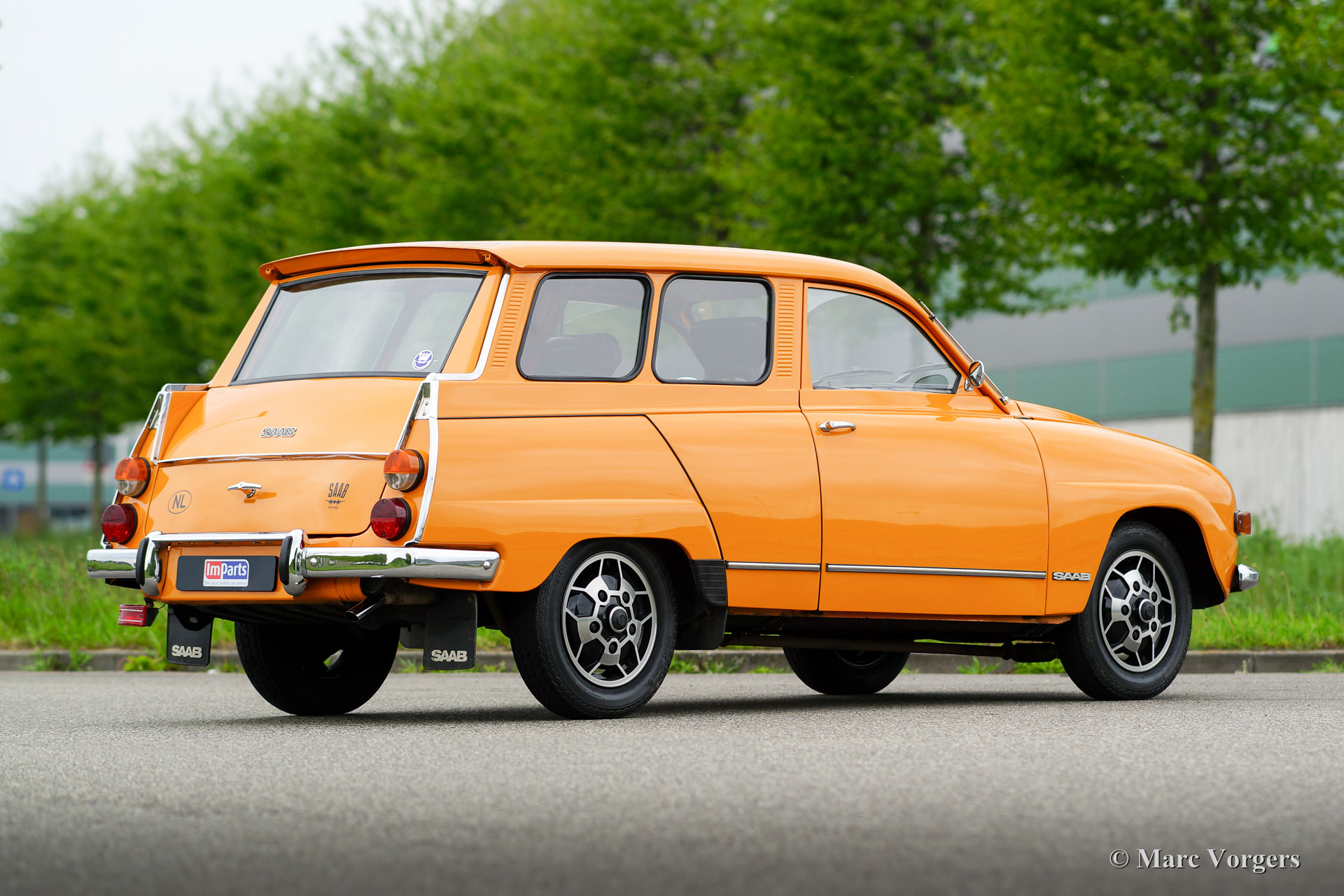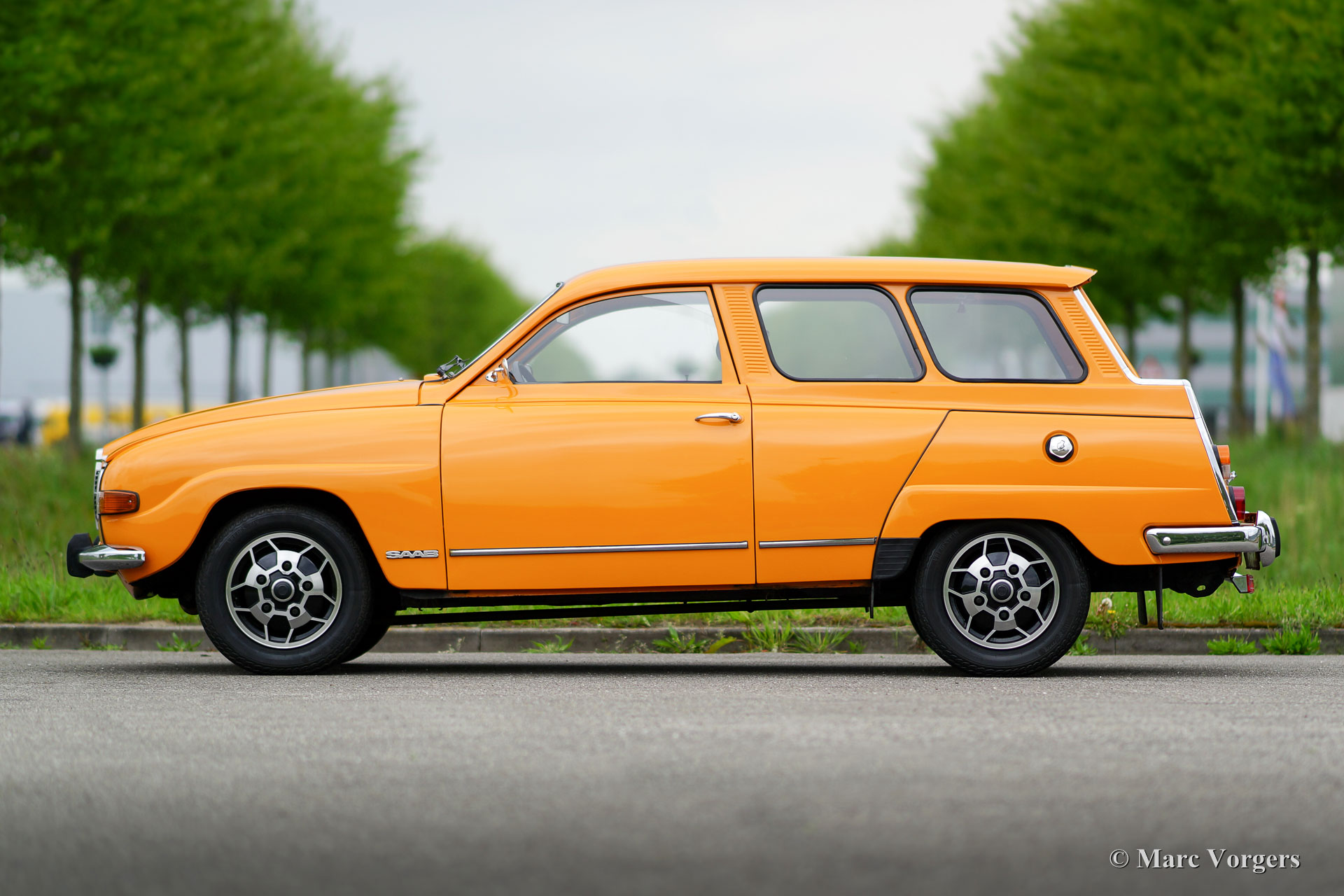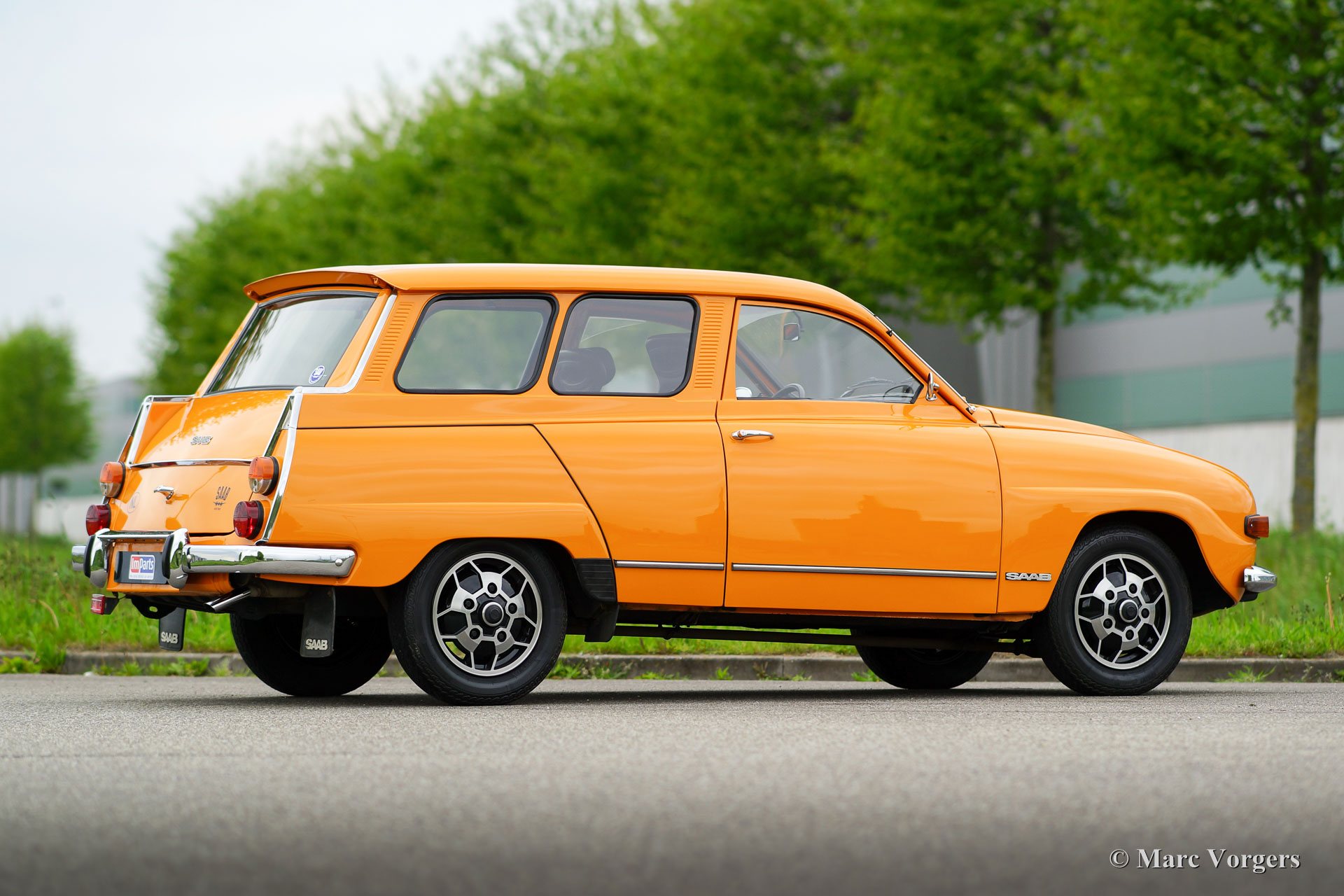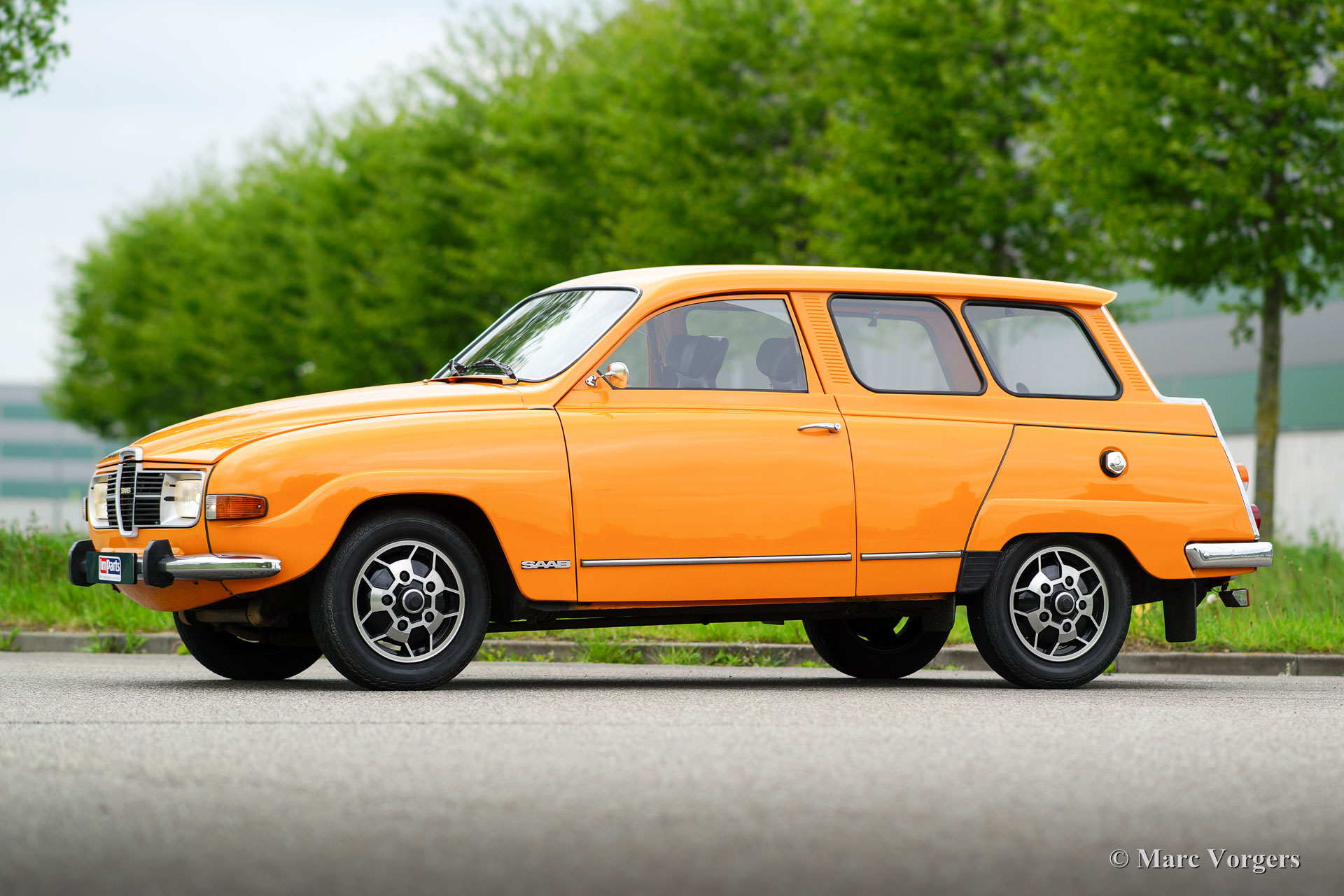 Saab 95 V4 station wagon, jaar 1975. Kleur oranje met een bruin kunstleren interieur en bruin stoffen zitvlakken. Bruin tapijt en beige matten. Deze bijzonder fraaie en typisch jaren-1970 Saab 95 is uitvoerig gerestaureerd naar originele specificaties. De Saab verkeert in sublieme topstaat en de auto rijdt geweldig. De Zweden hadden en hebben veiligheid hoog in het vaandel dus de auto is voorzien van rolgordels, zeer effectieve hoofdsteunen en het stuurwiel/dashboard afgewerkt met zachte kunststof. Driedeurs station wagons zie je zelden en bijzonder is dat de auto een neerklapbare derde bank heeft in de kofferbak, het is dus een 7-persoons auto! De auto wordt aangedreven door de bekende Ford V4 motor en de auto is voorzien van prachtige originele lichtmetalen wielen. Een zelden geziene beauty!