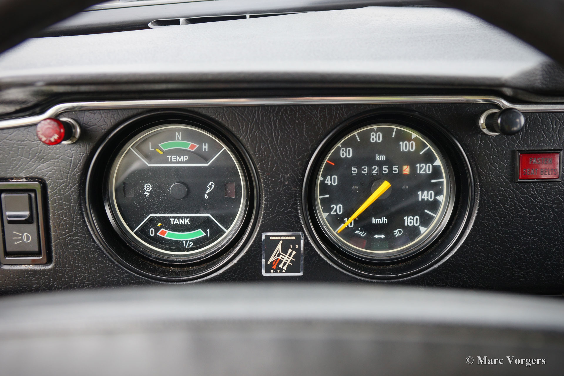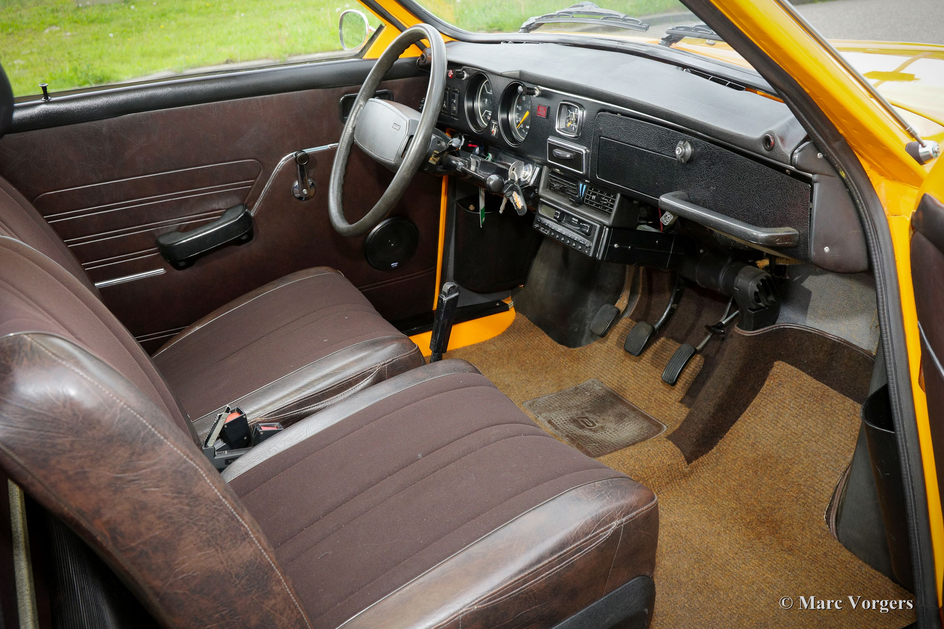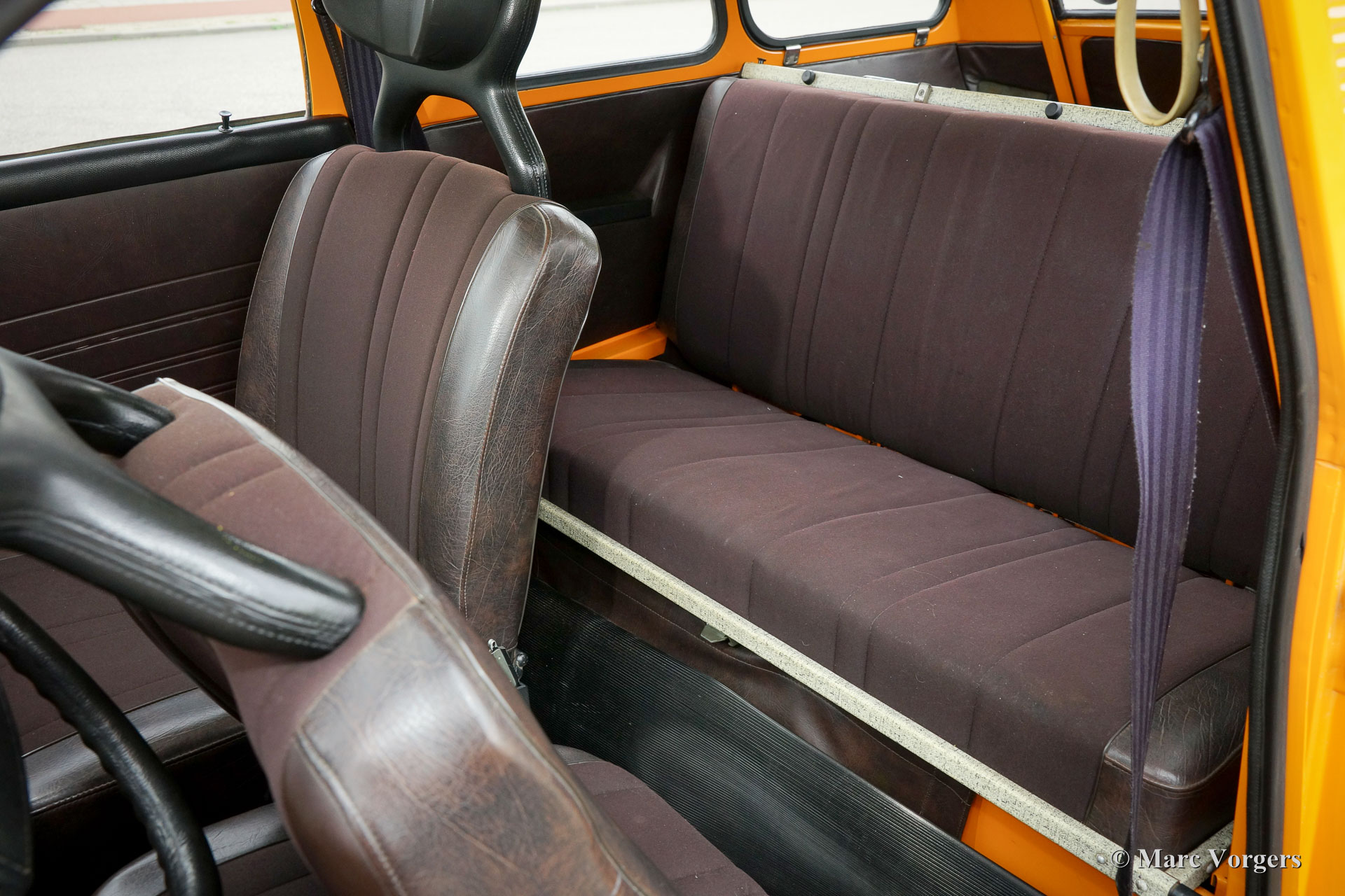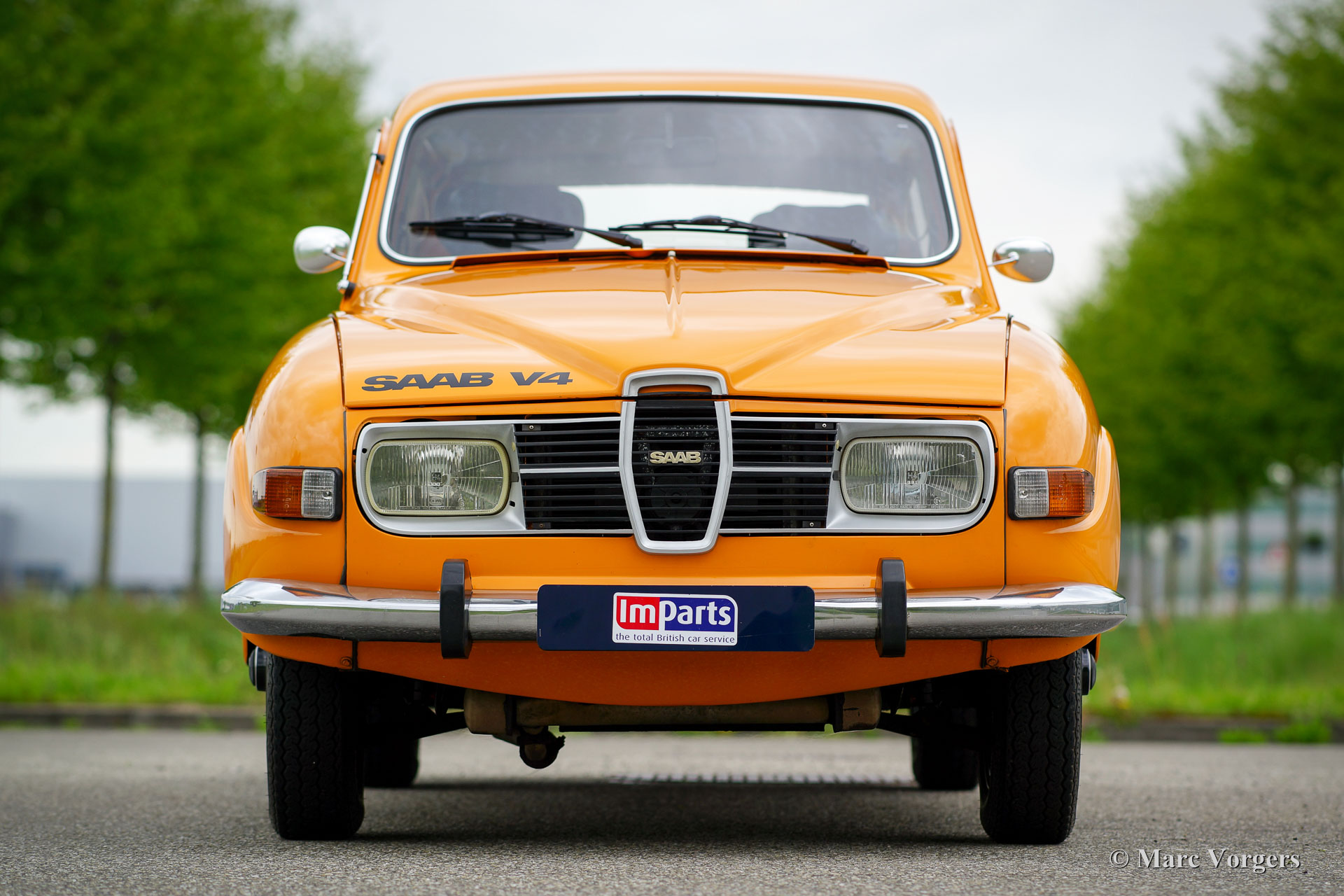 Saab 95 V4 station wagon, jaar 1975. Kleur oranje met een bruin kunstleren interieur en bruin stoffen zitvlakken. Bruin tapijt en beige matten. Deze bijzonder fraaie en typisch jaren-1970 Saab 95 is uitvoerig gerestaureerd naar originele specificaties. De Saab verkeert in sublieme topstaat en de auto rijdt geweldig. De Zweden hadden en hebben veiligheid hoog in het vaandel dus de auto is voorzien van rolgordels, zeer effectieve hoofdsteunen en het stuurwiel/dashboard afgewerkt met zachte kunststof. Driedeurs station wagons zie je zelden en bijzonder is dat de auto een neerklapbare derde bank heeft in de kofferbak, het is dus een 7-persoons auto! De auto wordt aangedreven door de bekende Ford V4 motor en de auto is voorzien van prachtige originele lichtmetalen wielen. Een zelden geziene beauty!