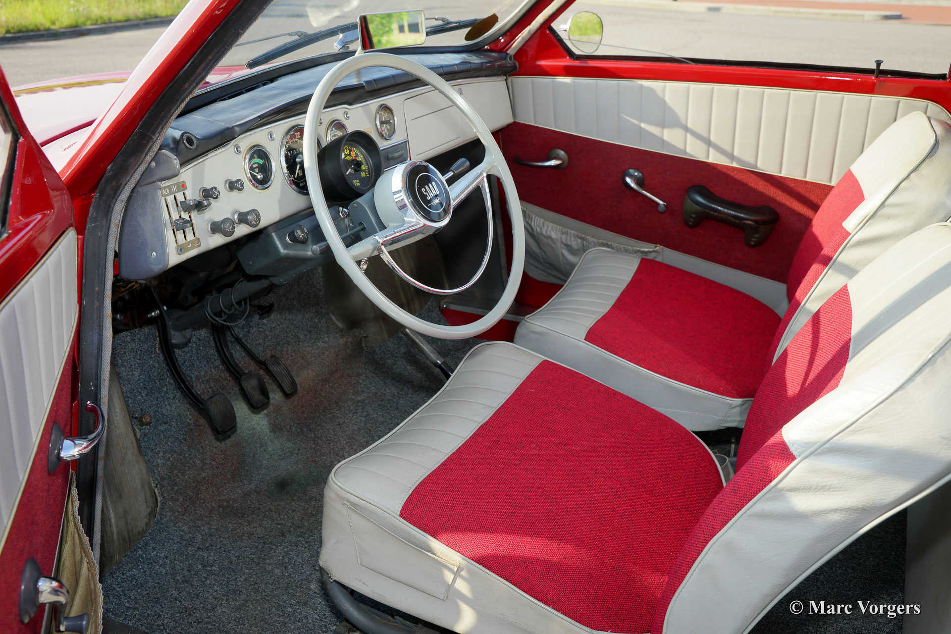 Saab 96, bouwjaar 1964. Kleur rood met een grijs / rood stoffen interieur en grijs tapijt. Deze geweldige Saab 96 2-takt werd in het jaar 2008 uitvoerig gerestaureerd door een bekende Nederlandse Saab specialist. Het originele interieur is daarbij behouden gebleven. Sinds de restauratie heeft de Saab ca. 2000 kilometer gereden. De auto verkeert in excellente staat en het originele interieur is in zeer goede staat met enige gebruikssporen. Een Saab 96 in deze uitstekende conditie treft u niet vaak aan. De rijbelevenis is zeer bijzonder door bijzondere vormgeving, de wegligging en het heerlijke ‘ringedingeding’ motorgeluid van de 841 cc driecilinder tweetakt motor! De Saab 96 is van 1960 tot en met 1980 in productie geweest, de 841 cc. Tweetakt tot 1965.