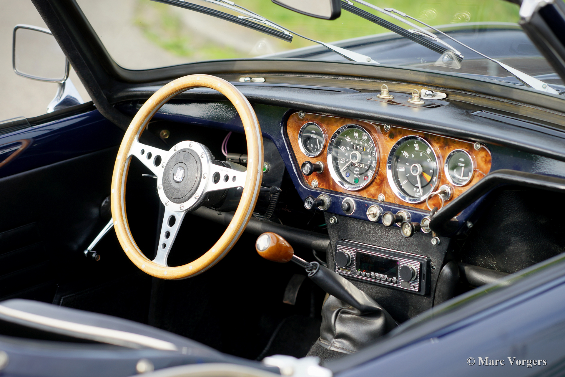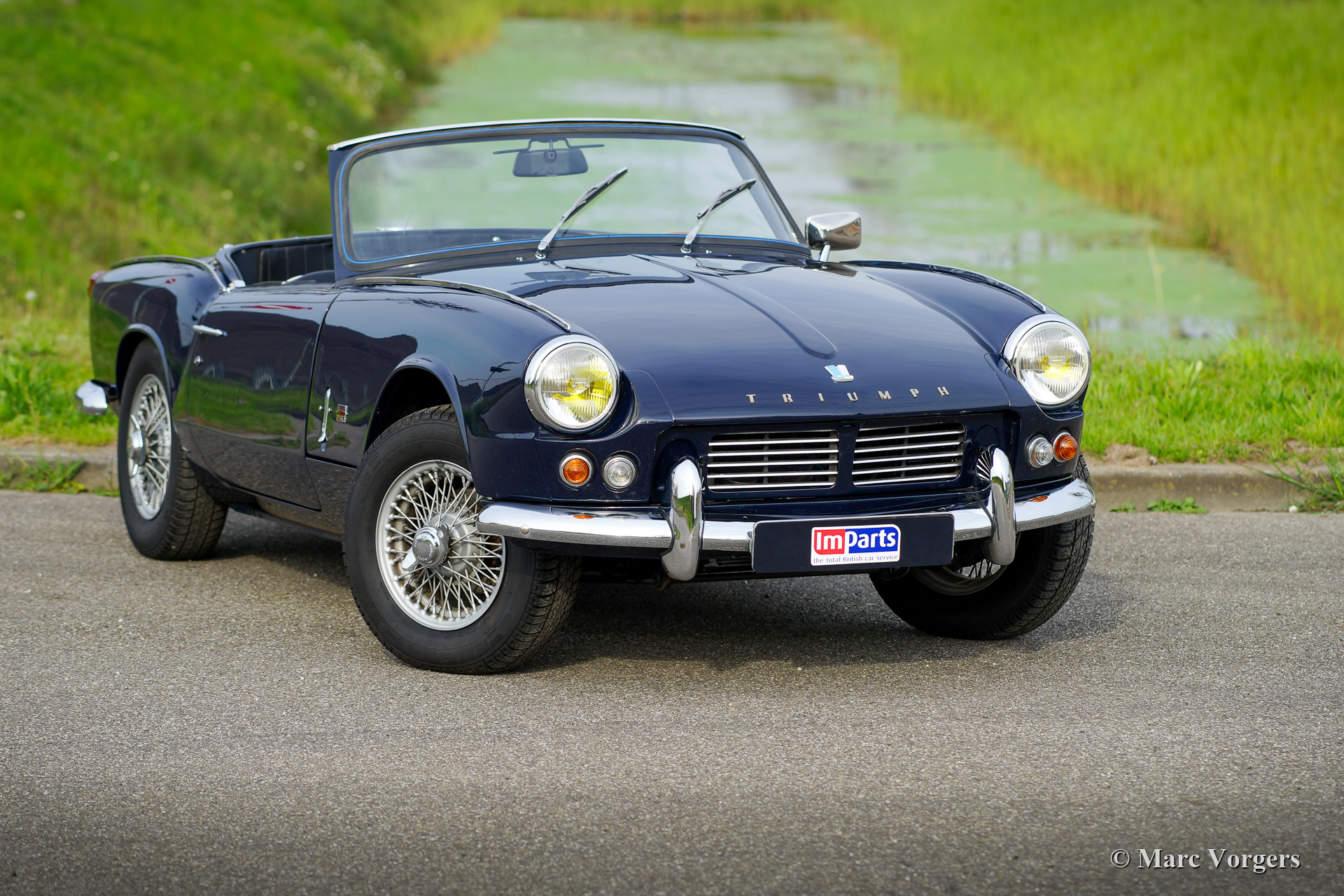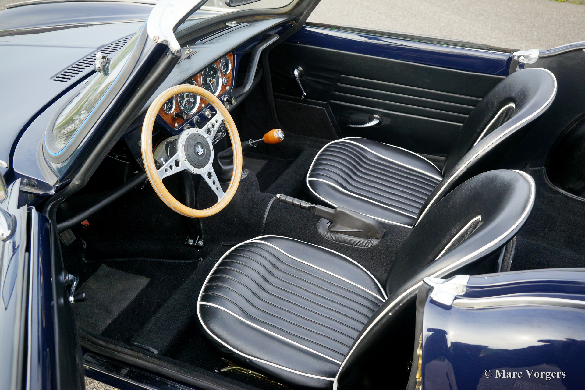 Triumph Spitfire Mk II, jaar 1966. Kleur donkerblauw gecombineerd met een zwartlederen interieur afgewerkt met witte biezen en zwart tapijt. Zwarte vinyl soft-top. Deze prachtige Triumph Spitfire is nieuw verkocht in Nederland. De auto is in het verleden “body-off” gerestaureerd, de auto verkeert in een zeer goede conditie. De Triumph Spitfire biedt veel klassieke, sportieve, en open rijbeleving voor een laag budget met een prachtig uiterlijk! De auto is voorzien van een 1147 cc viercilindermotor met twee S.U.-carburateurs. De motor levert een vermogen van 67 pk wat ruim voldoende is om de sportieve ambities van deze 725 kilogram lichte auto waar te maken. Deze fraaie Spitfire Mk II is voorzien van zilvergelakte spaakwielen en een RVS sportuitlaat die een geweldig motorgeluid laat horen!