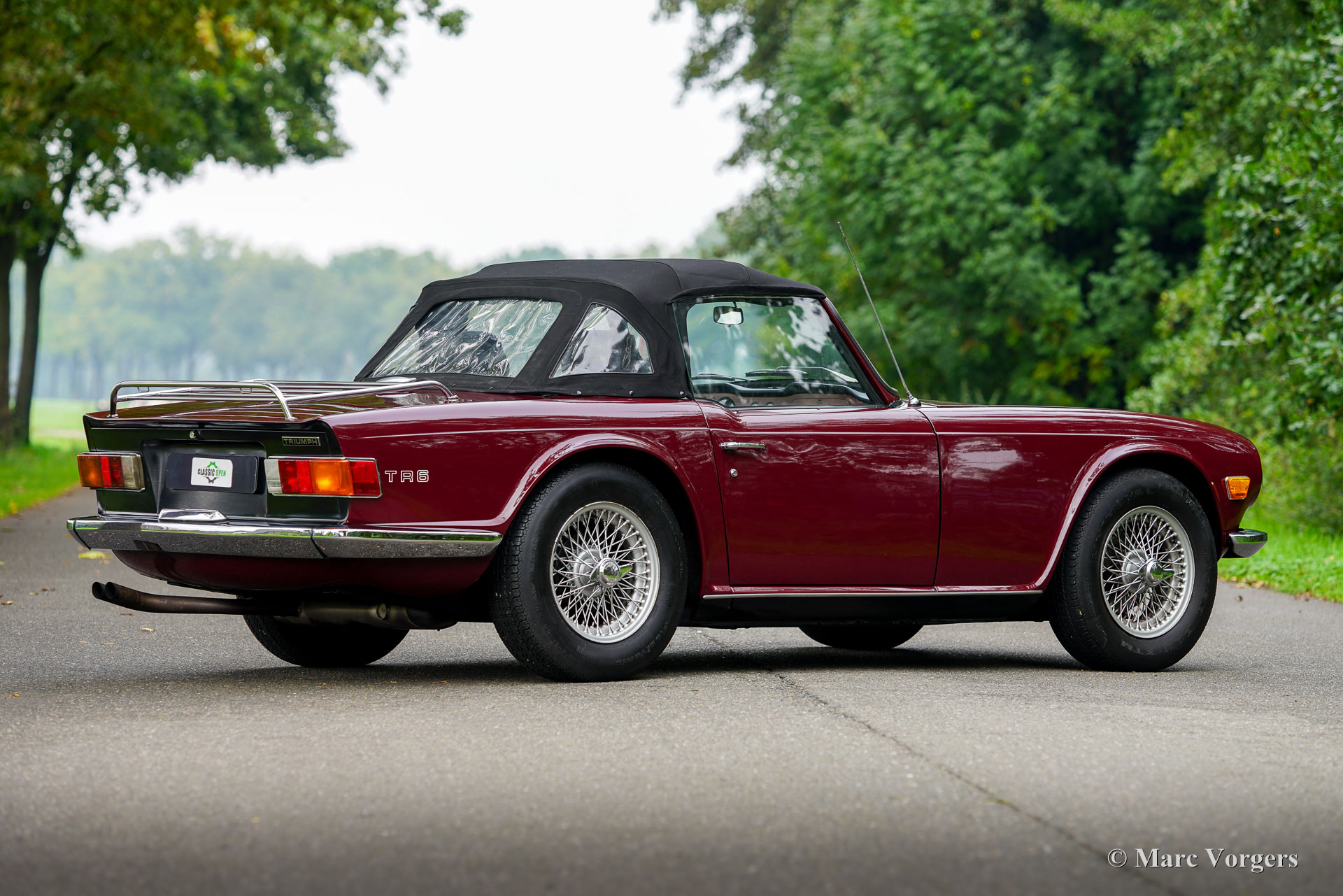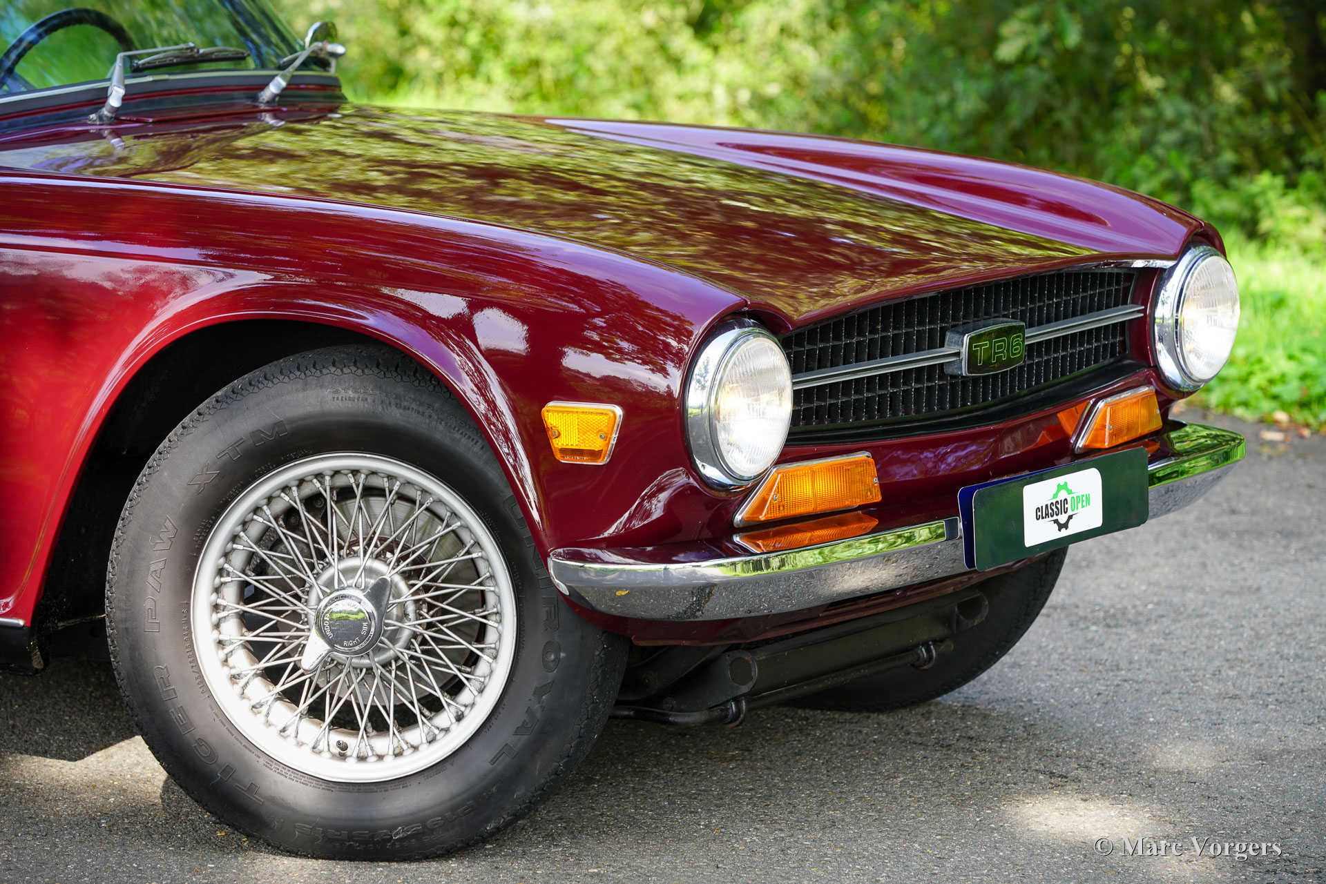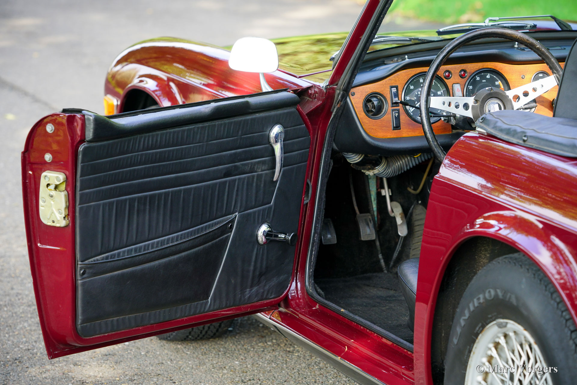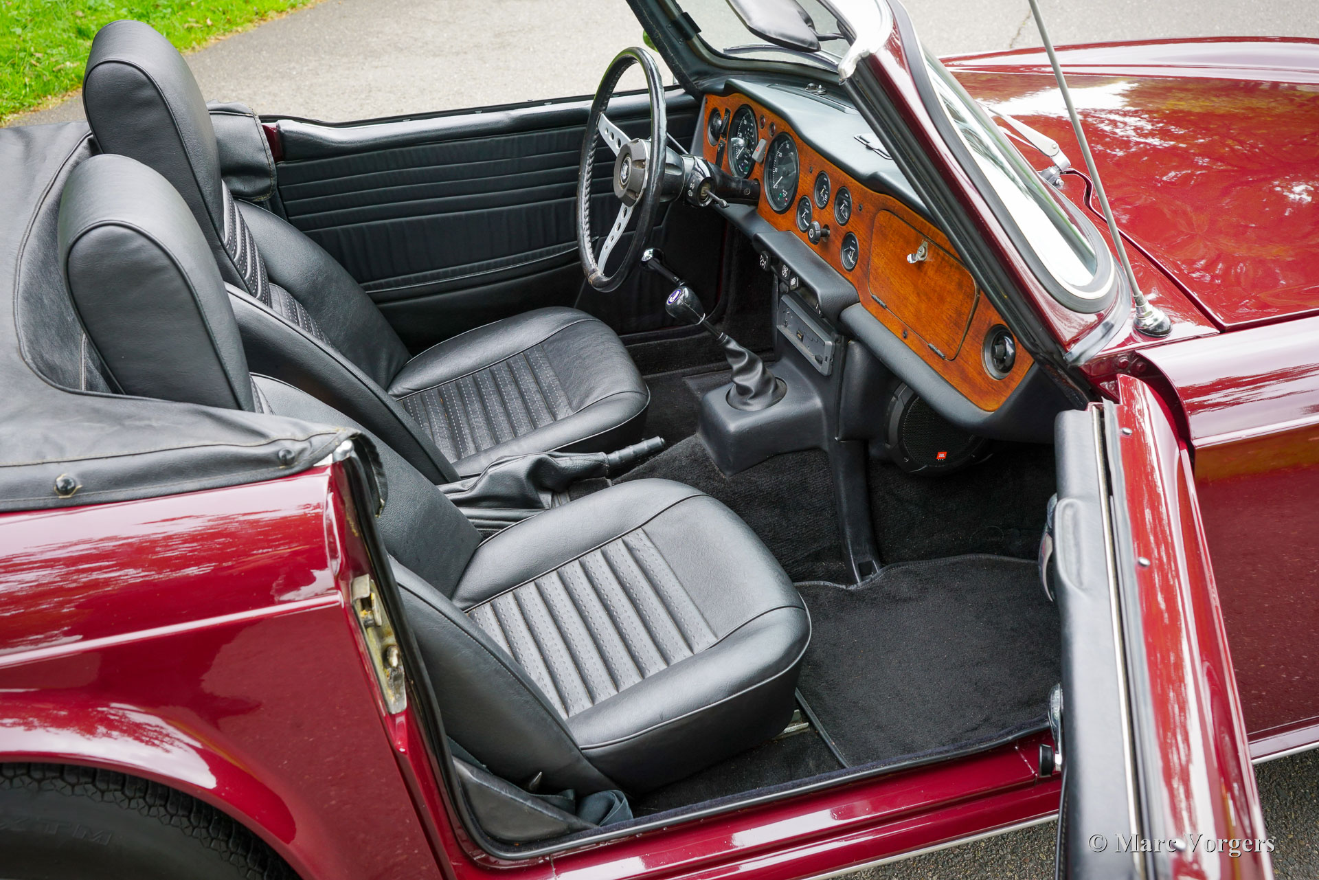 Triumph TR6, jaar 1969. Carrosserie uitgevoerd in donkerrood (Damson) gecombineerd met een zwart kunstlederen interieur, zwart tapijt, een zwarte mohair soft-top, en een zwarte vinyl kapafdekking. Deze fantastische Triumph TR6 werd nieuw verkocht in de VS en in 1999 naar Nederland geïmporteerd. De auto heeft sindsdien slechts één zorgzame eigenaar gekend. Deze Triumph TR6 is een zelden geziene vroege versie die unieke details heeft, zoals de veiligheidsstoelen met hoge hoofdsteunen, binnenverlichting op de tunnel, en het unieke originele 3-spaaks stuurwiel met gaten in de spaken. De hoofdsteunen zijn neerklapbaar om een tonneaucover te kunnen plaatsen. De auto is in het verleden volledig opnieuw gespoten en voorzien van nieuwe bekleding en tapijt. Er zijn SU-carburateurs, elektronische ontsteking en sportluchtfilters gemonteerd. De ophanging is voorzien van ‘road-spec’ polyurethaan bussen. Deze magnifieke vroege TR6 toont alle originele details, rijdt en klinkt heerlijk en verkeert in een zeer goede staat! Auto's die afkomstig zijn uit jarenlang zorgzaam en actief bezit zijn naar onze mening de beste rijdersauto's die je kunt kopen. Dit prachtige exemplaar is voorzien van de felbegeerde overdrive-optie en zilver metallic gespoten spaakwielen met chromen ‘knock-on’ wielmoeren en een chromen bagagerek. Een British Motor Heritage-certificaat is eveneens aanwezig. De Triumph TR6 is de Britse sportwagen die het meeste rijplezier biedt voor zijn geld, en hij is praktisch en comfortabel genoeg om van te genieten tijdens weekendtrips en vakantieritten door heel Europa!