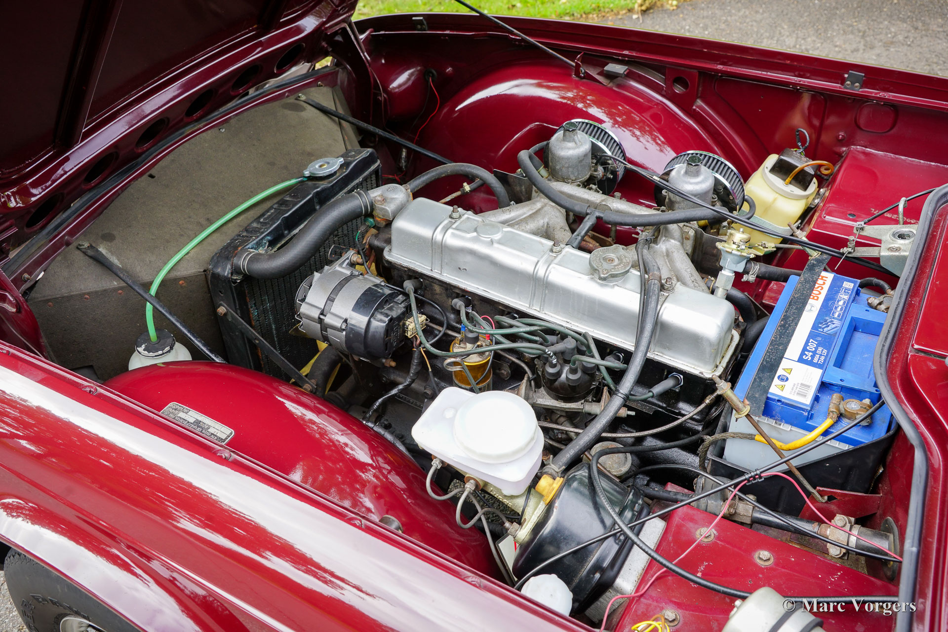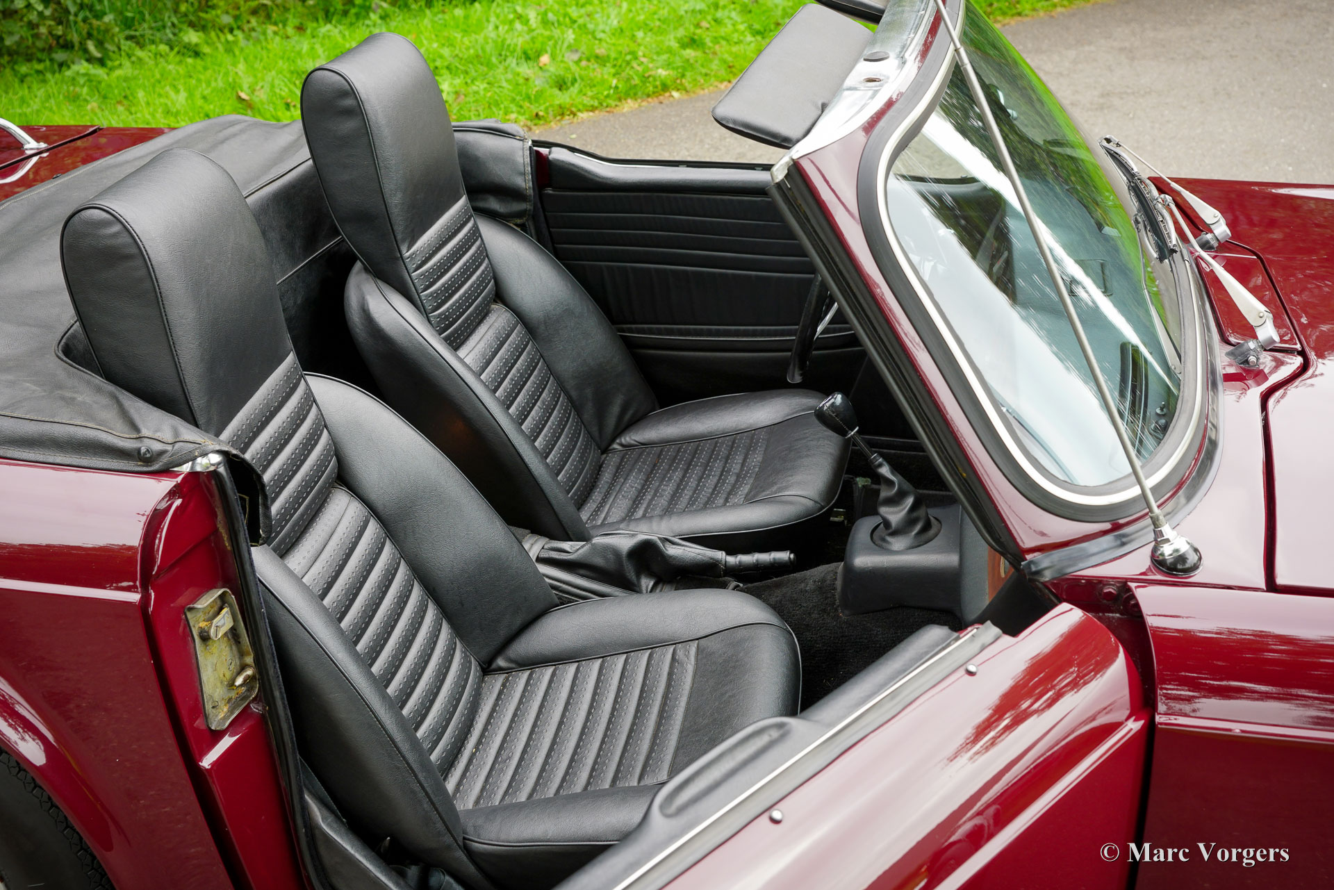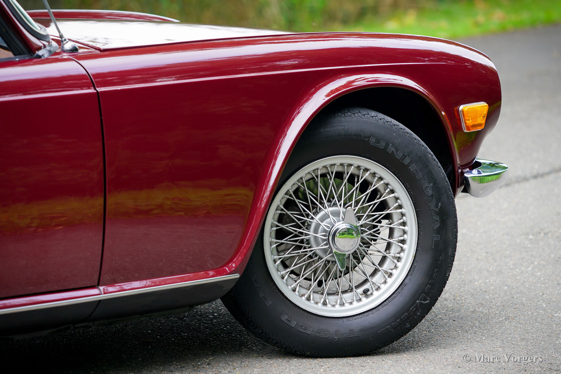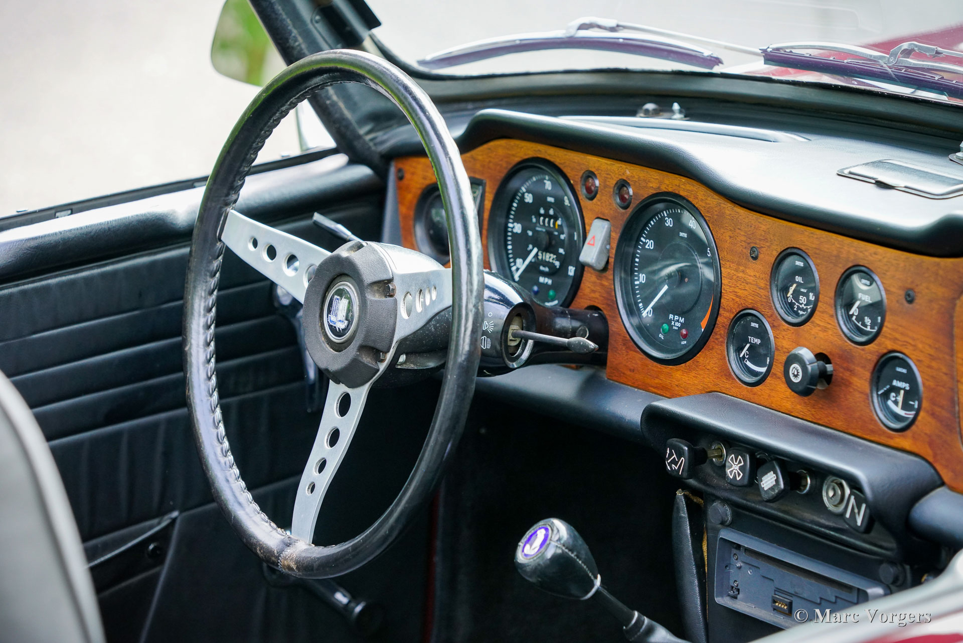 Triumph TR6, jaar 1969. Carrosserie uitgevoerd in donkerrood (Damson) gecombineerd met een zwart kunstlederen interieur, zwart tapijt, een zwarte mohair soft-top, en een zwarte vinyl kapafdekking. Deze fantastische Triumph TR6 werd nieuw verkocht in de VS en in 1999 naar Nederland geïmporteerd. De auto heeft sindsdien slechts één zorgzame eigenaar gekend. Deze Triumph TR6 is een zelden geziene vroege versie die unieke details heeft, zoals de veiligheidsstoelen met hoge hoofdsteunen, binnenverlichting op de tunnel, en het unieke originele 3-spaaks stuurwiel met gaten in de spaken. De hoofdsteunen zijn neerklapbaar om een tonneaucover te kunnen plaatsen. De auto is in het verleden volledig opnieuw gespoten en voorzien van nieuwe bekleding en tapijt. Er zijn SU-carburateurs, elektronische ontsteking en sportluchtfilters gemonteerd. De ophanging is voorzien van ‘road-spec’ polyurethaan bussen. Deze magnifieke vroege TR6 toont alle originele details, rijdt en klinkt heerlijk en verkeert in een zeer goede staat! Auto's die afkomstig zijn uit jarenlang zorgzaam en actief bezit zijn naar onze mening de beste rijdersauto's die je kunt kopen. Dit prachtige exemplaar is voorzien van de felbegeerde overdrive-optie en zilver metallic gespoten spaakwielen met chromen ‘knock-on’ wielmoeren en een chromen bagagerek. Een British Motor Heritage-certificaat is eveneens aanwezig. De Triumph TR6 is de Britse sportwagen die het meeste rijplezier biedt voor zijn geld, en hij is praktisch en comfortabel genoeg om van te genieten tijdens weekendtrips en vakantieritten door heel Europa!