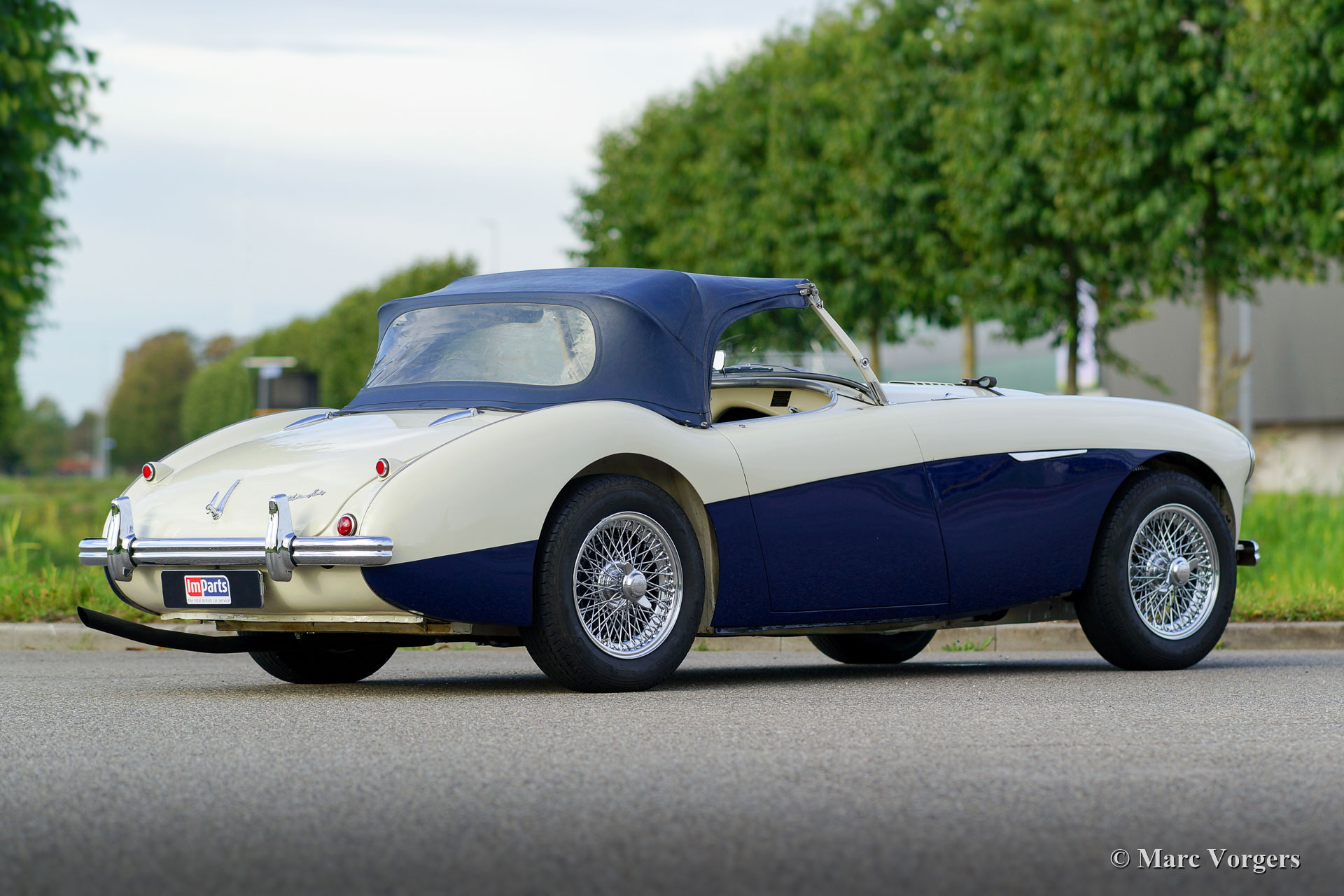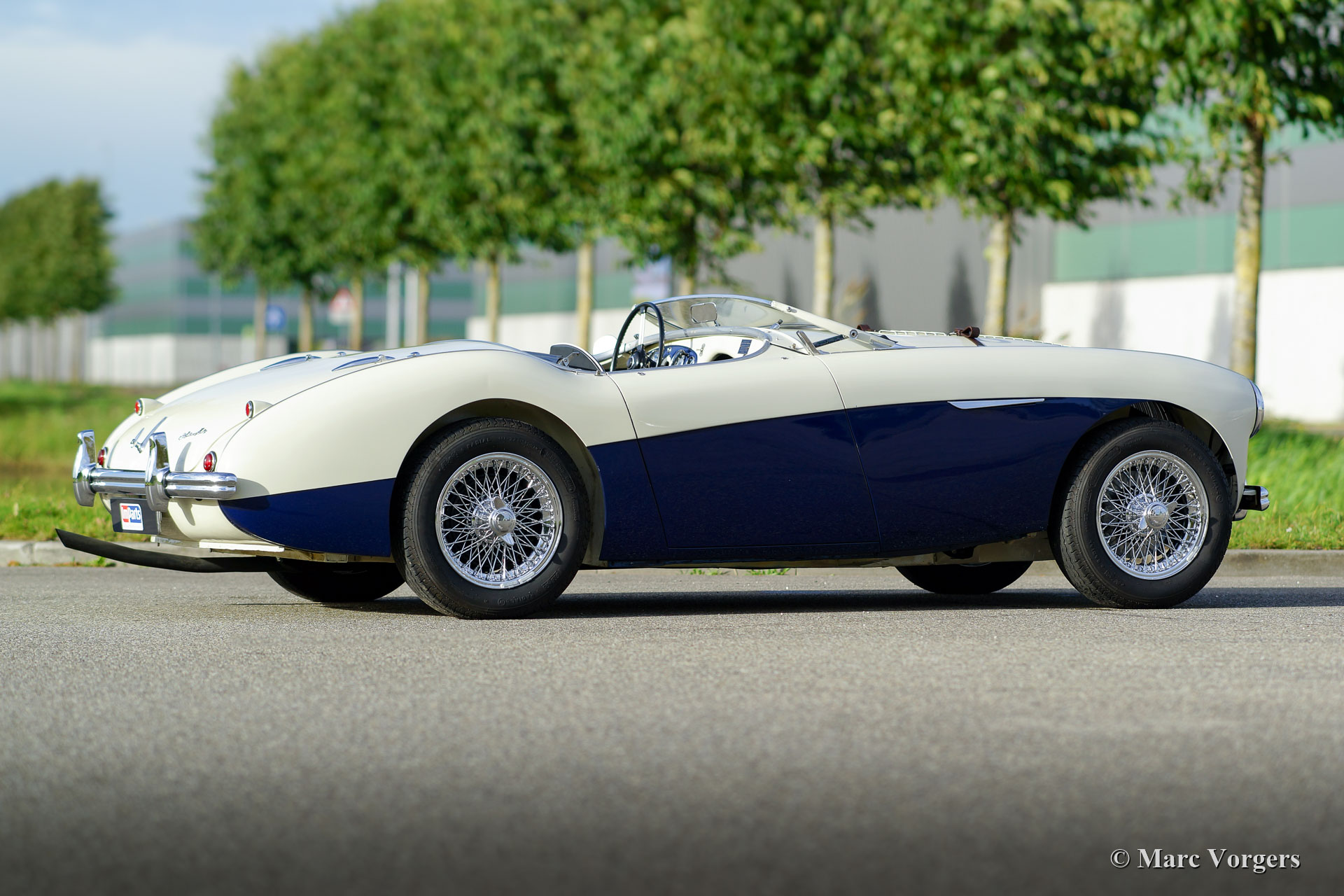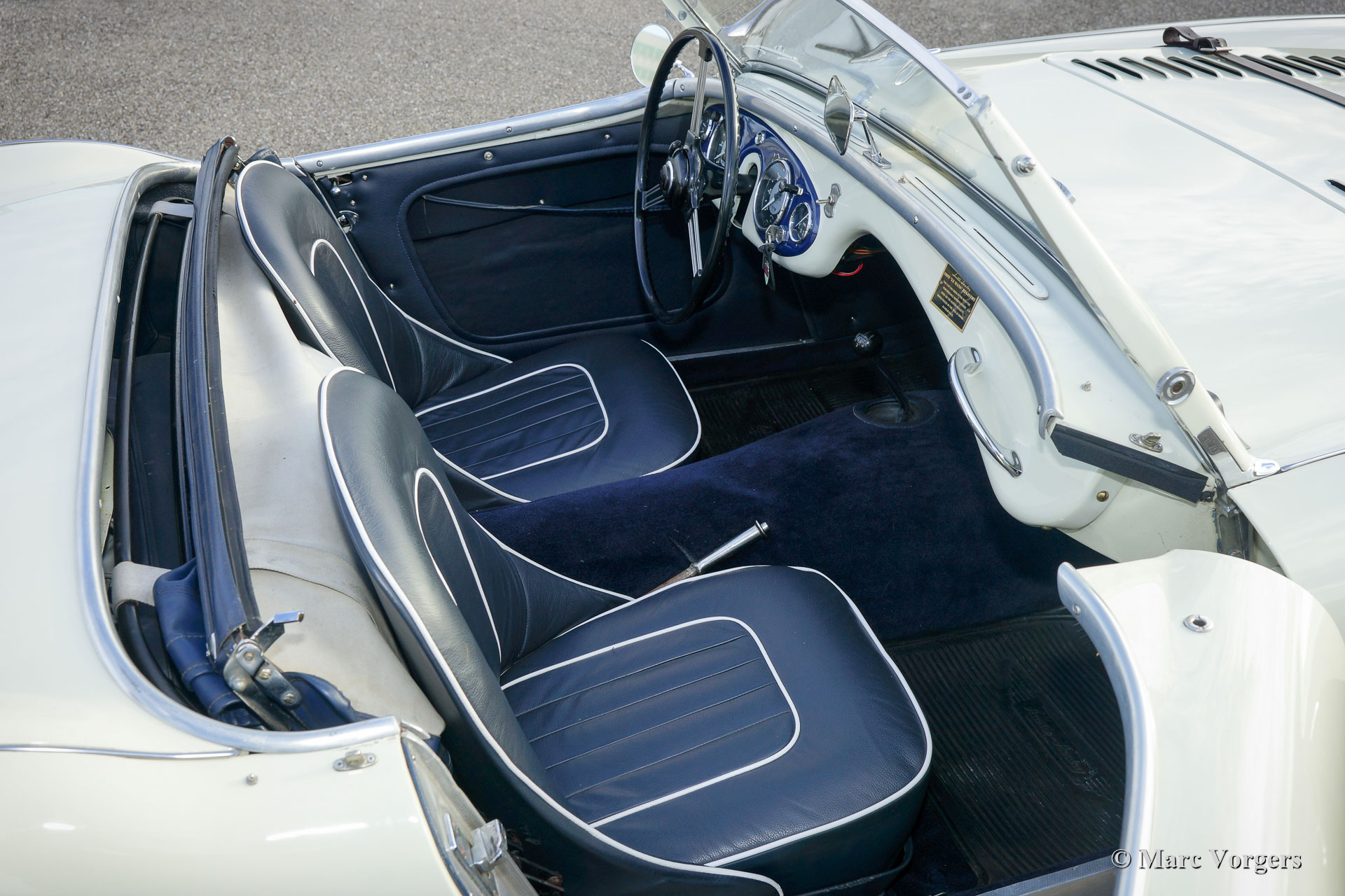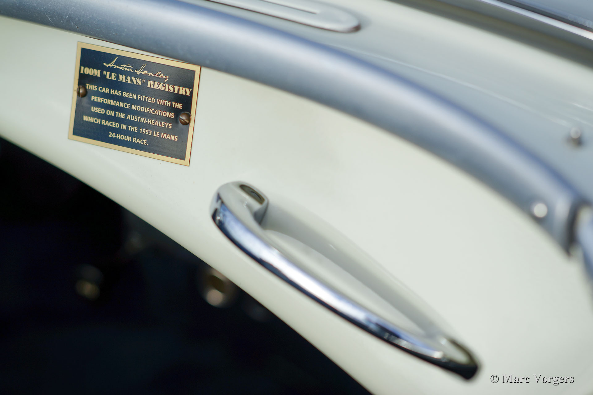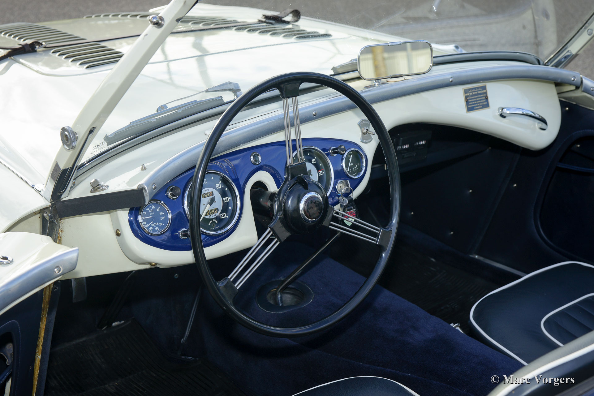 Austin Healey 100-Four (BN1) 'Le Mans', jaar 1955. Kleur Old English White boven donkerblauw gecombineerd met een donkerblauw interieur, donkerblauwe soft-top, zijschermen en tonneau cover. Deze magnifieke Austin Healey 100 'Le Mans' werd in 1997 geïmporteerd vanuit de VS. De auto is in het verleden uitvoerig gerestaureerd en gereviseerd. Tijdens de restauratie en revisie werden de volgende verbeteringen/ aanpassingen doorgevoerd: De motor werd opgebouwd naar 'Le Mans' specificaties met grotere S.U. carburateurs en een ‘snelle’ nokkenas. Er werd een 'cold-air-box' bij de carburateurs aangebracht, er werden ‘Le Mans’ louvres in de motorkap gemaakt en er werd een leren riem over de motorkap gemonteerd. Verder werd een speciaal uitlaatsysteem aangebracht en kreeg de Healey schijfremmen op de voorwielen. Het remsysteem heeft nu gescheiden circuits voor en achter. De BN1 drieversnellingsbak en de achteras werden vervangen door een BN2-versnellingsbak met vier versnellingen en een BN2-achteras. Een volledige fotoreportage van de restauratie en de revisie is aanwezig, evenals een Heritage-certificaat en een fotoboek met de Nederlandse geschiedenis van de auto vanaf 1997. Dit is een geweldige rijdersauto en een zeer begeerlijke Austin Healey 100 ‘Le Mans’!