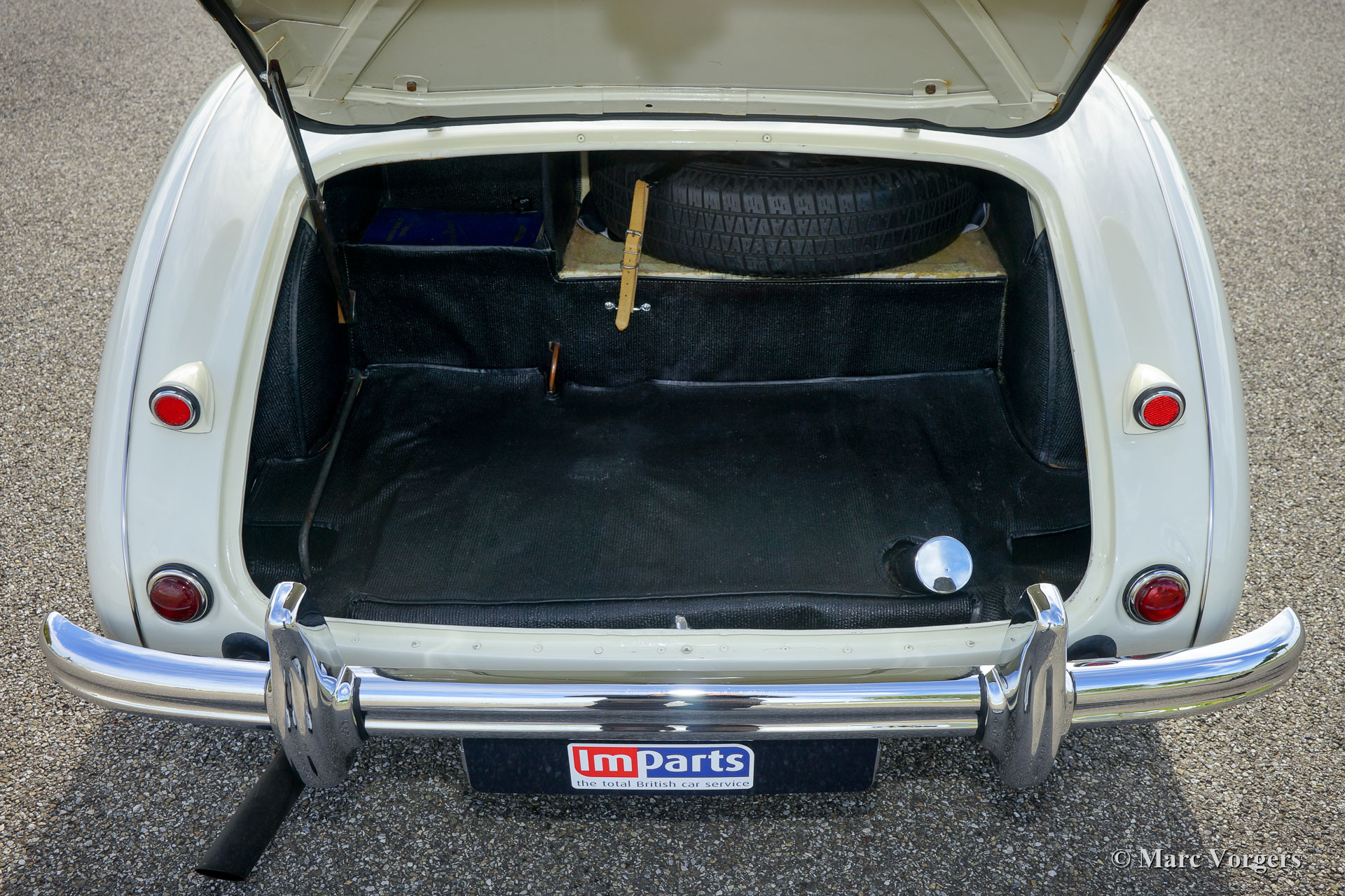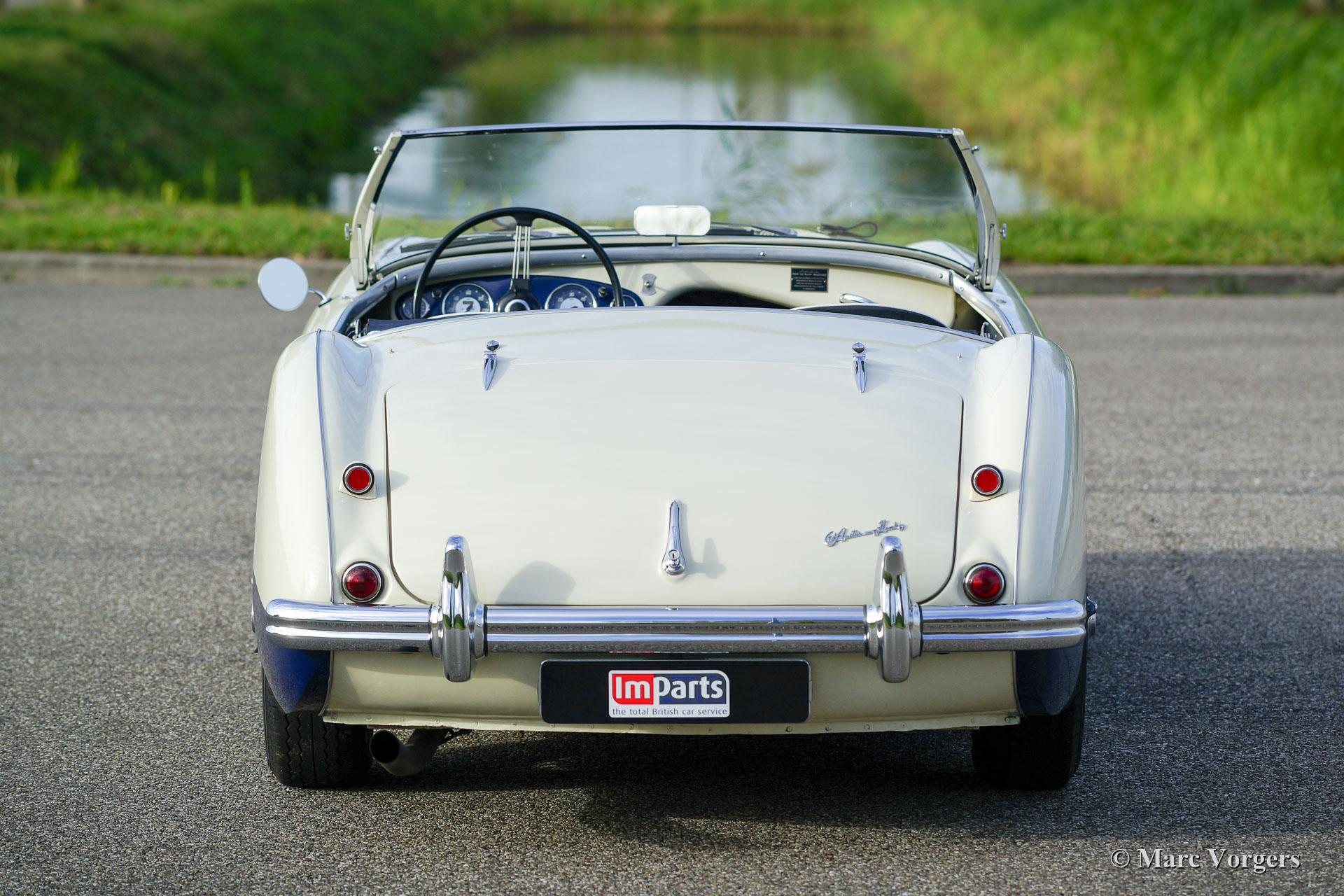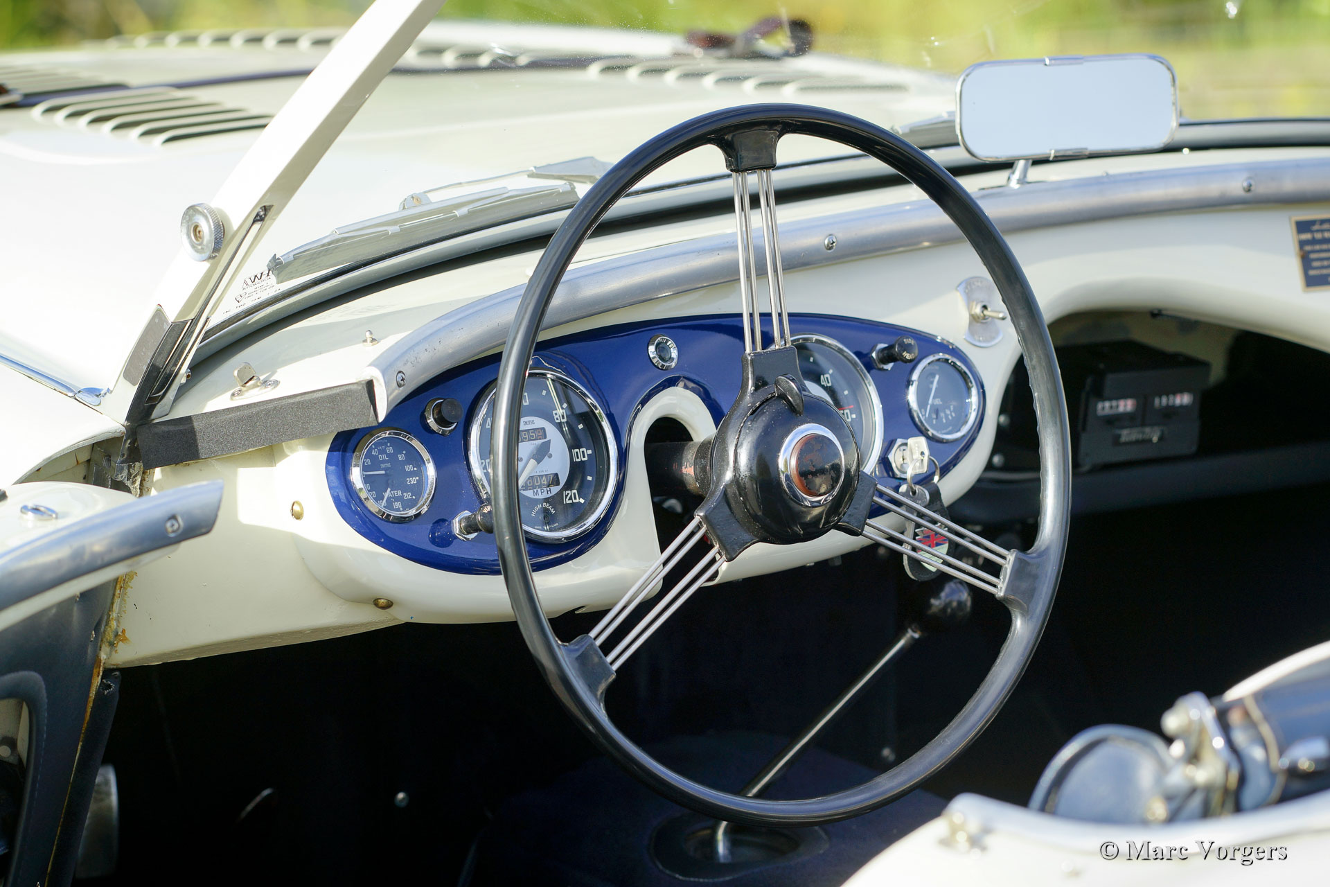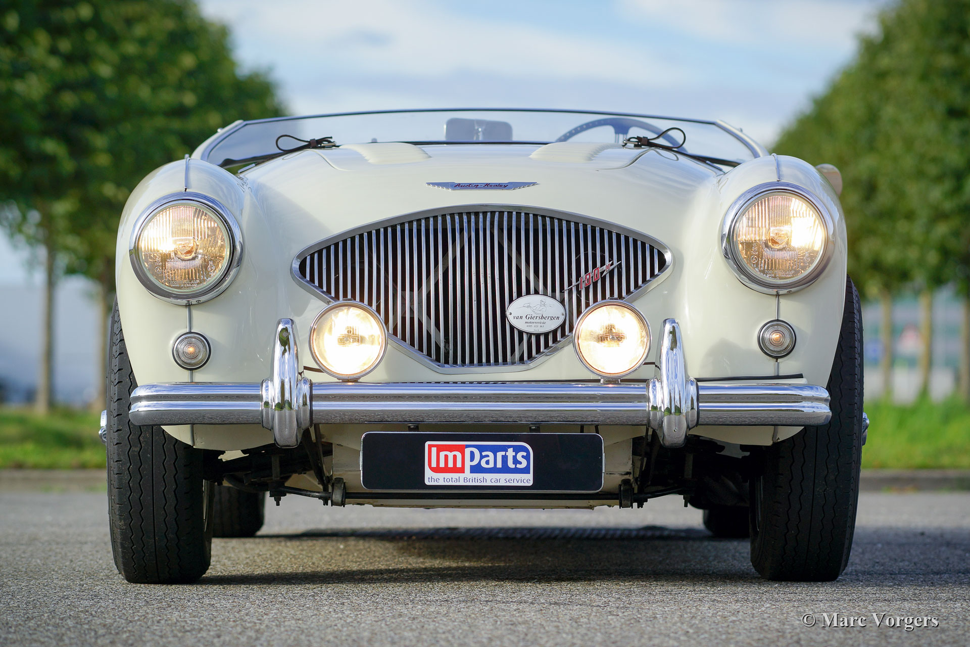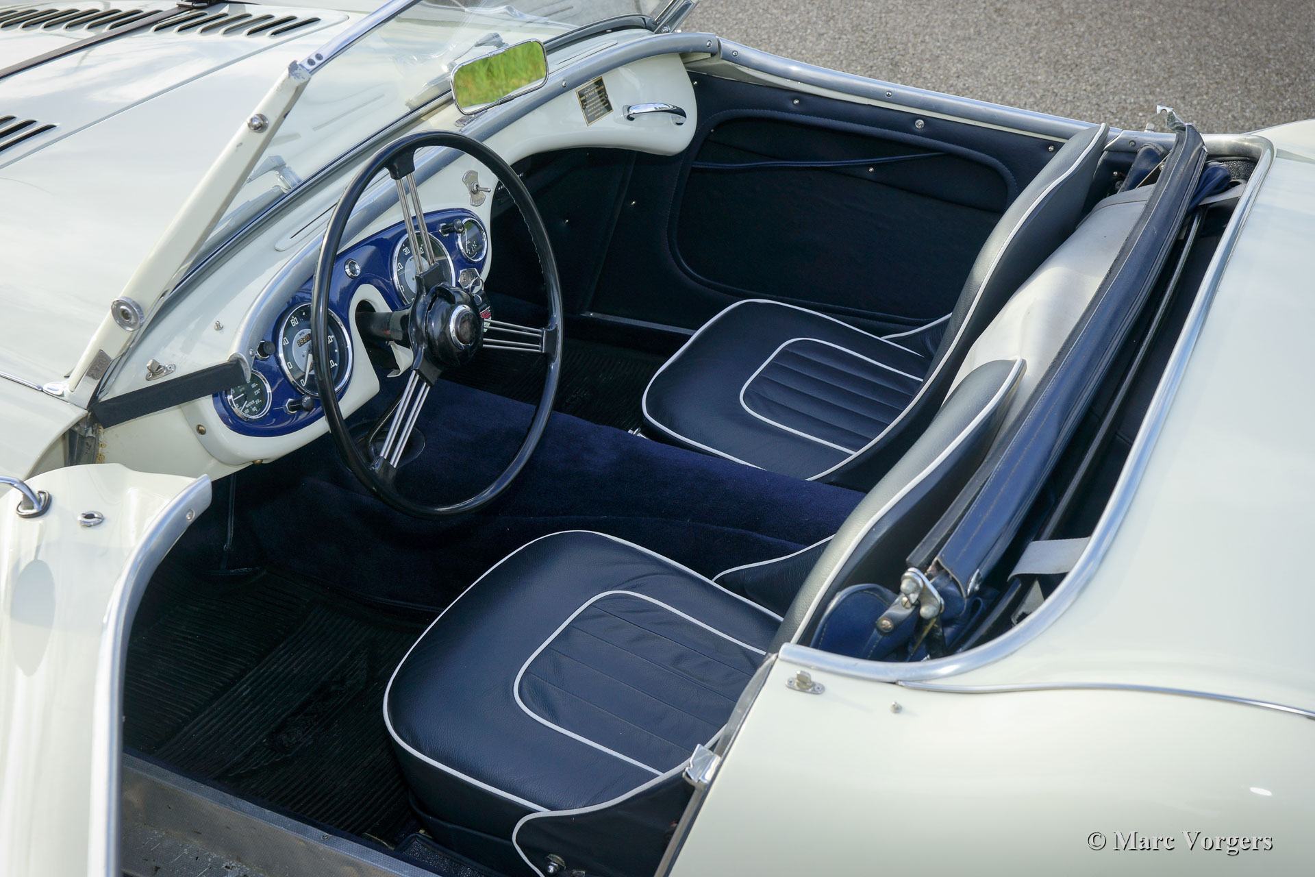 Austin Healey 100-Four (BN1) 'Le Mans', jaar 1955. Kleur Old English White boven donkerblauw gecombineerd met een donkerblauw interieur, donkerblauwe soft-top, zijschermen en tonneau cover. Deze magnifieke Austin Healey 100 'Le Mans' werd in 1997 geïmporteerd vanuit de VS. De auto is in het verleden uitvoerig gerestaureerd en gereviseerd. Tijdens de restauratie en revisie werden de volgende verbeteringen/ aanpassingen doorgevoerd: De motor werd opgebouwd naar 'Le Mans' specificaties met grotere S.U. carburateurs en een ‘snelle’ nokkenas. Er werd een 'cold-air-box' bij de carburateurs aangebracht, er werden ‘Le Mans’ louvres in de motorkap gemaakt en er werd een leren riem over de motorkap gemonteerd. Verder werd een speciaal uitlaatsysteem aangebracht en kreeg de Healey schijfremmen op de voorwielen. Het remsysteem heeft nu gescheiden circuits voor en achter. De BN1 drieversnellingsbak en de achteras werden vervangen door een BN2-versnellingsbak met vier versnellingen en een BN2-achteras. Een volledige fotoreportage van de restauratie en de revisie is aanwezig, evenals een Heritage-certificaat en een fotoboek met de Nederlandse geschiedenis van de auto vanaf 1997. Dit is een geweldige rijdersauto en een zeer begeerlijke Austin Healey 100 ‘Le Mans’!