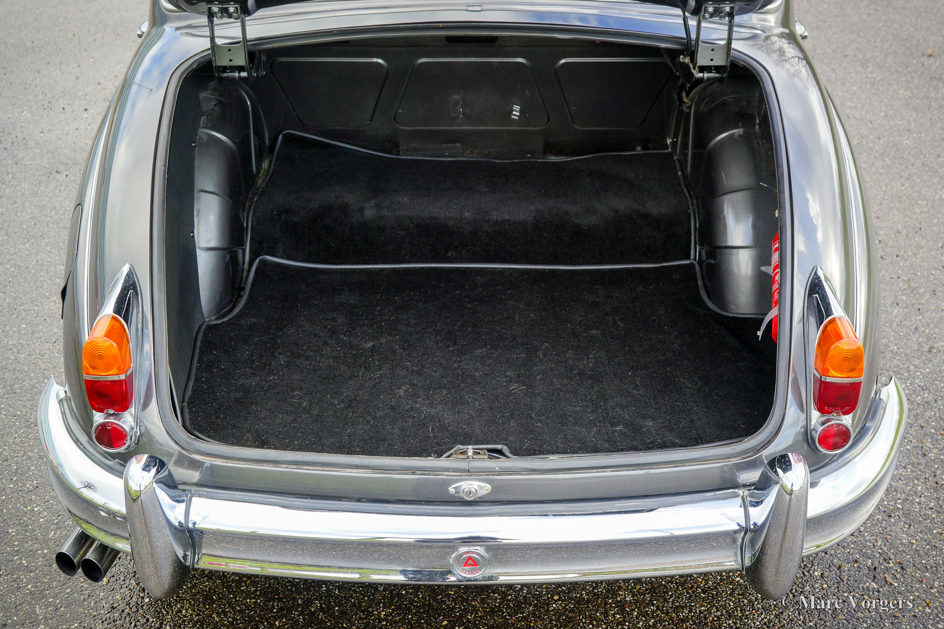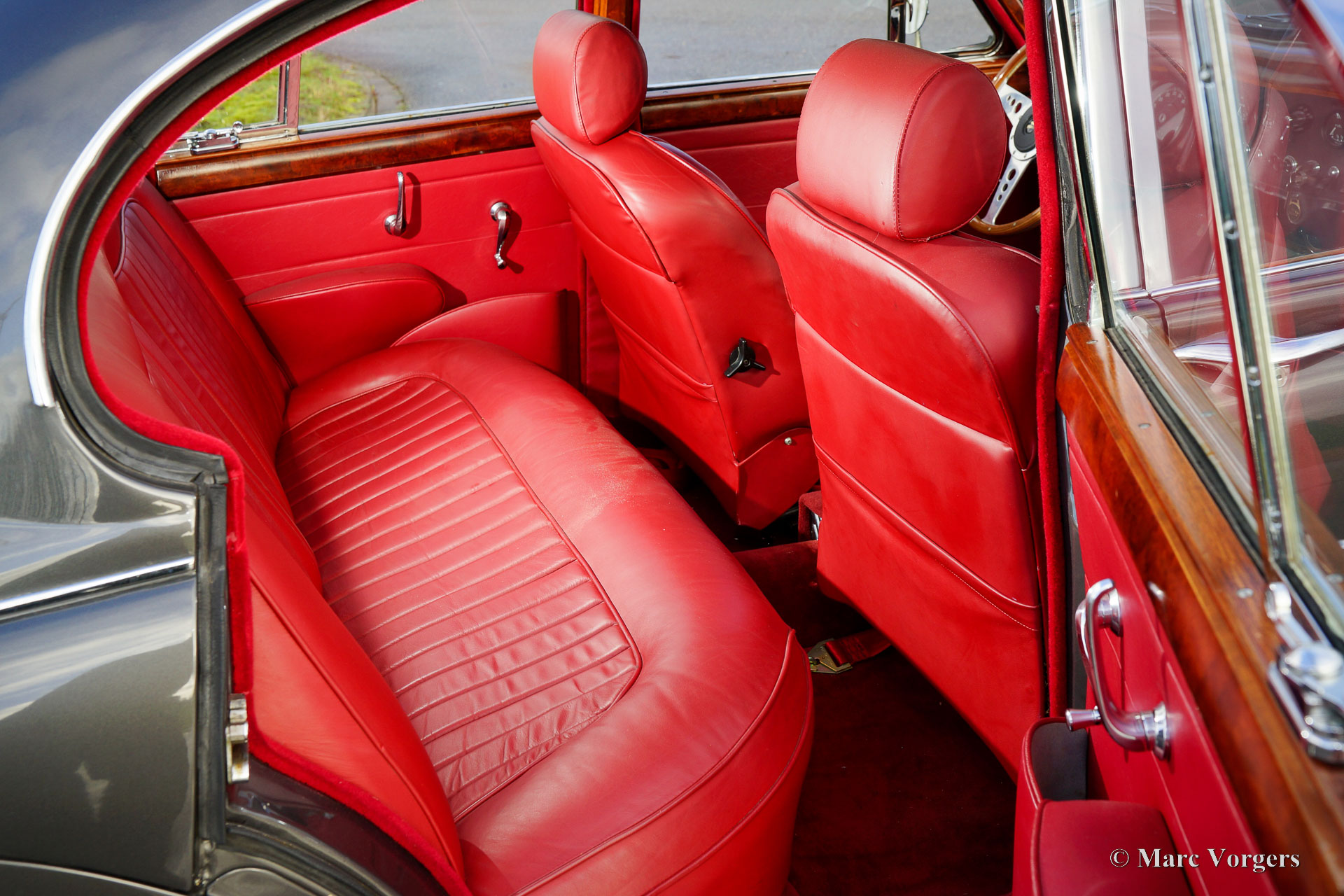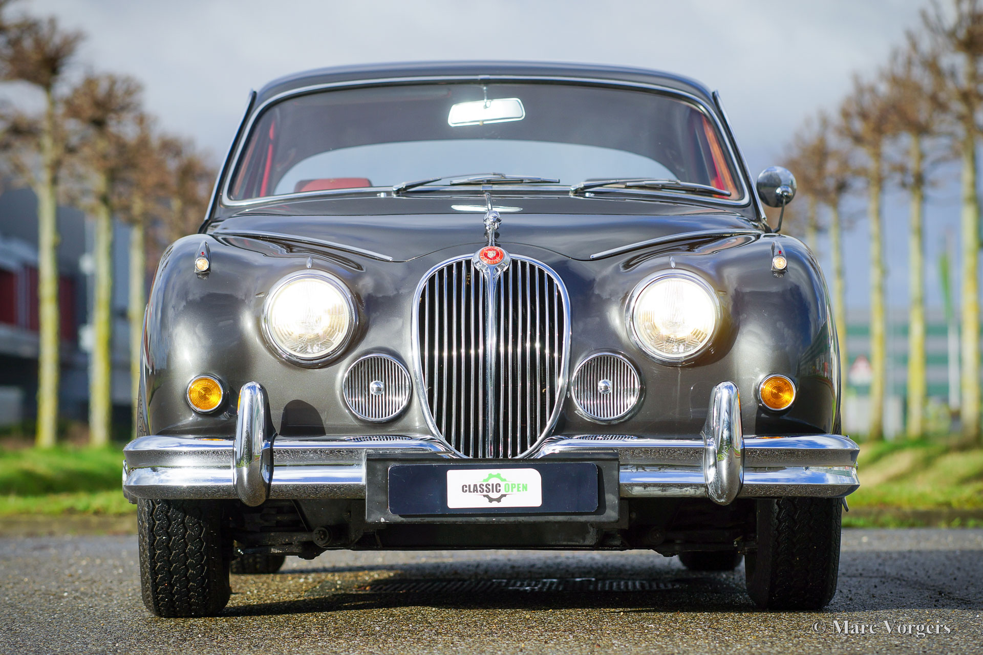 Jaguar Mk II 3.4 Liter Automatic, jaar 1963. Kleur donkergrijs (Gunmetal grey) metallic gecombineerd met een roodlederen interieur en een rood tapijt. Deze prachtige Jaguar Mk II is nieuw verkocht in de USA en in 1994 geïmporteerd naar Nederland. Vanaf 1994 heeft de Jaguar slechts één zorgzame eigenaar gekend! Na aankomst in Nederland is de automobiel uitgebreid gerestaureerd, enkele foto's van de restauratie zijn aanwezig. Deze Jaguar Mk II verkeert in een zeer goede staat met slechts lichte sporen van gebruik. De auto rijdt voortreffelijk, het is duidelijk dat de auto zeer goed is gerestaureerd en regelmatig is onderhouden. Deze MK II is voorzien van modernere voorstoelen met hoofdsteunen voor meer comfort en een betere zithouding. Deze Jaguar is af fabriek voorzien van stuurbekrachtiging en een automatische versnellingsbak die beide werken zoals het hoort. Overige opties: chromen spaakwielen, een stuur met houten rand, een rvs-uitlaatsysteem en elektronische ontsteking. Dit is een begeerlijke en iconische Jaguar sedan uit de jaren 60, een prachtig exemplaar voor de liefhebber!